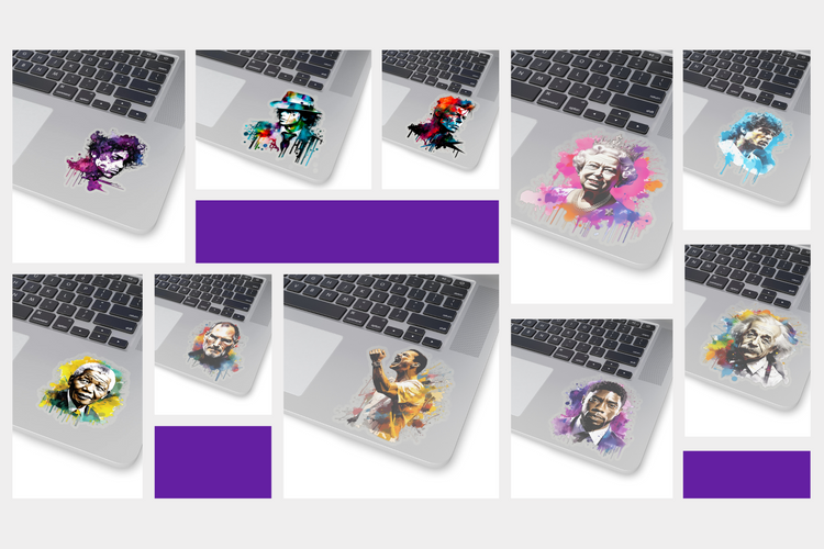 Adorn your personal items or home space with our 'Celebrities' sticker collection. Whether you're a fan of visionary entrepreneurs like Elon Musk or Steve Jobs, music legends like Prince, David Bowie Freddy Mercury, or inspirational figures like Nelson Mandela and Gandi, our range has you covered. Each sticker showcases a 100% original design, capturing the essence of these iconic personalities. Our 'Celebrities' sticker collection lets you add a touch of fame to your daily life, providing a fun, unique way to express your admiration for these renowned figures.
