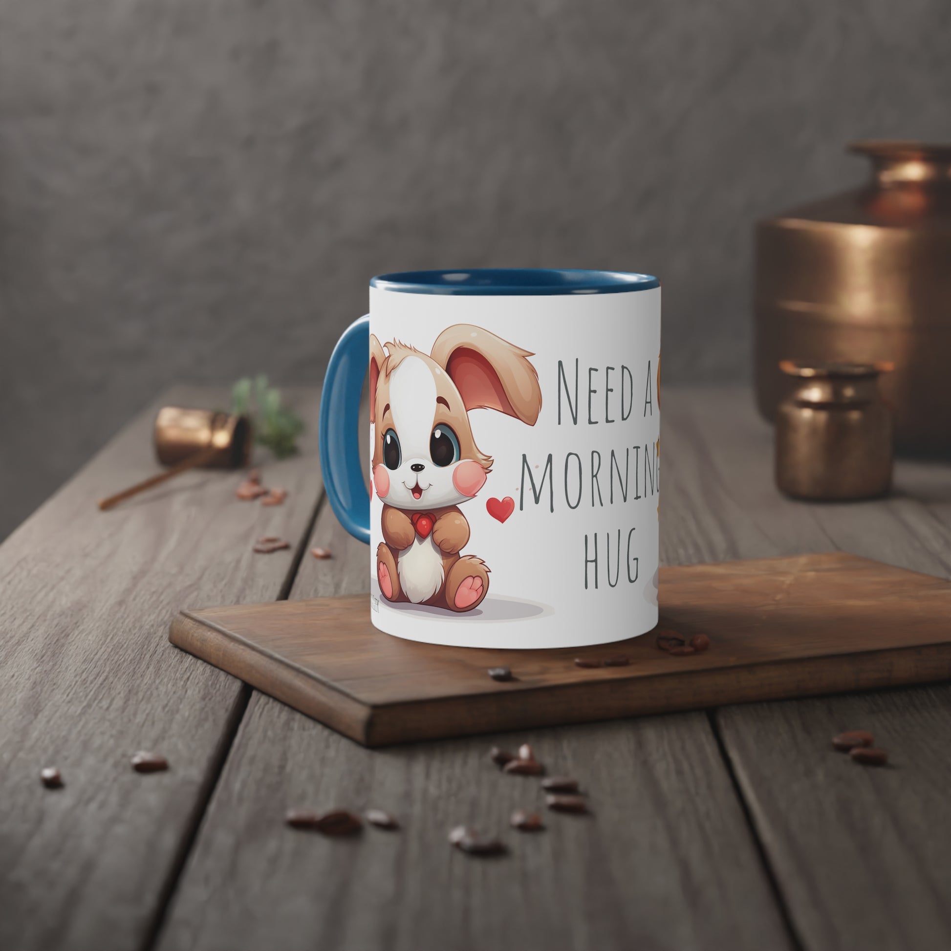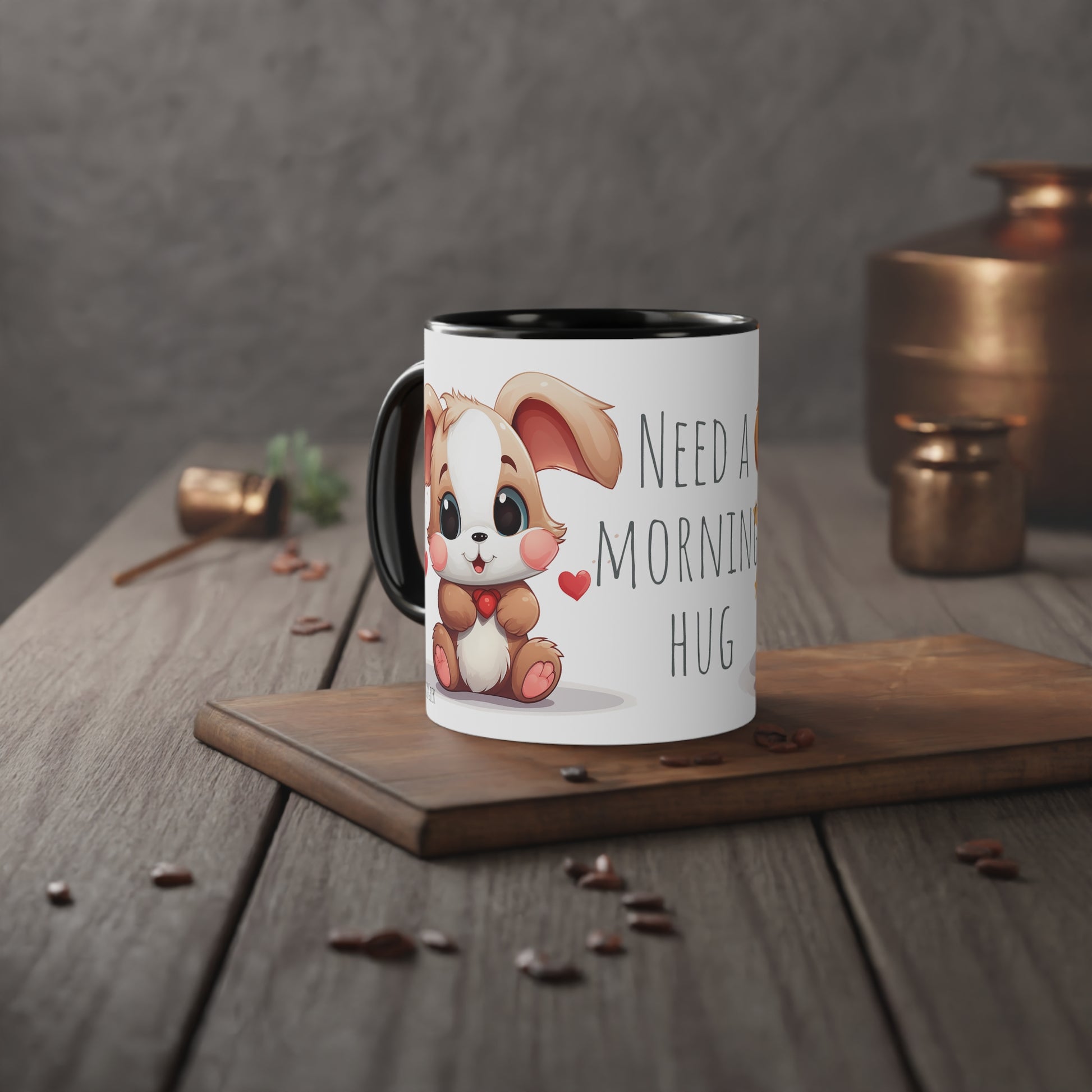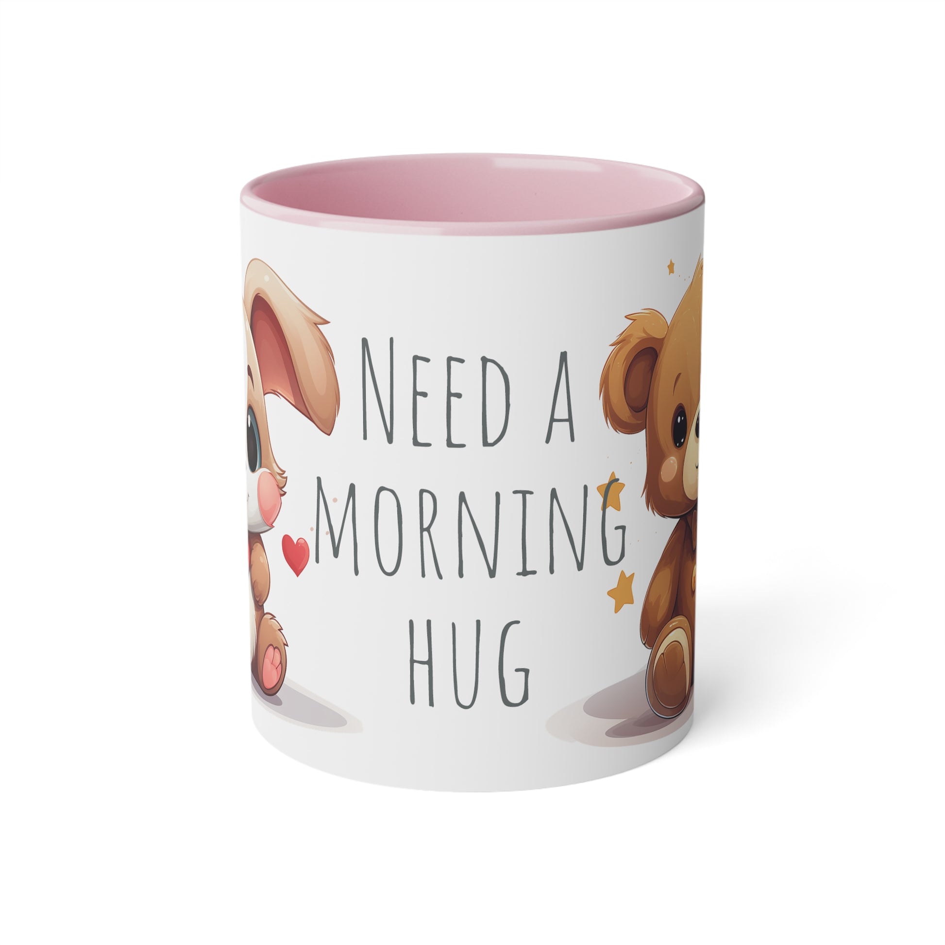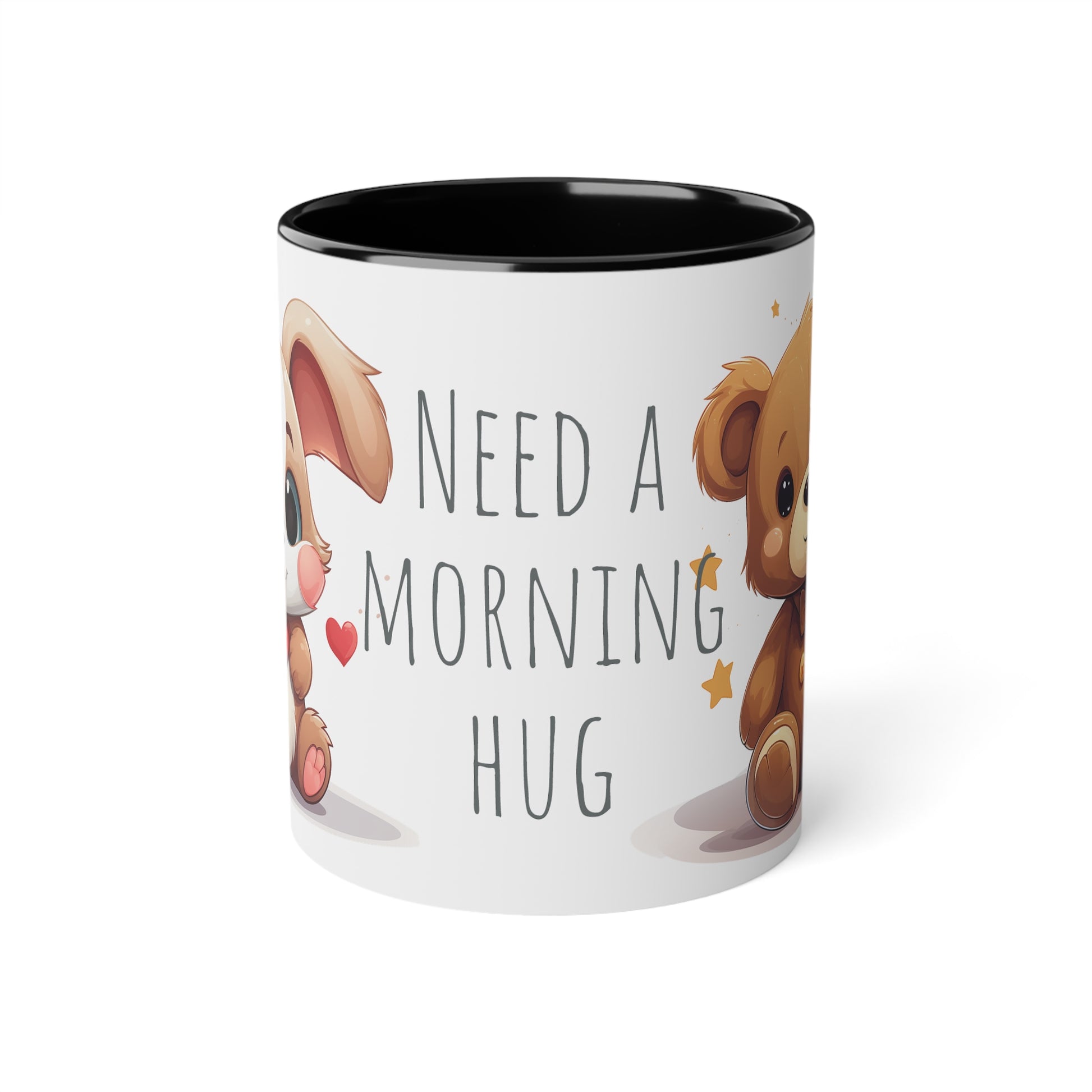 Begin your day with a warm embrace, courtesy of our 11oz bicolor mug, featuring an endearing teddy bear and teddy rabbit duo. Their charming design, combined with the inviting phrase "Need a morning hug", ensures a cheerful start to your morning routine. Ideal for that first cup of coffee or tea, this mug brings comfort and a dash of cuteness to every sip.