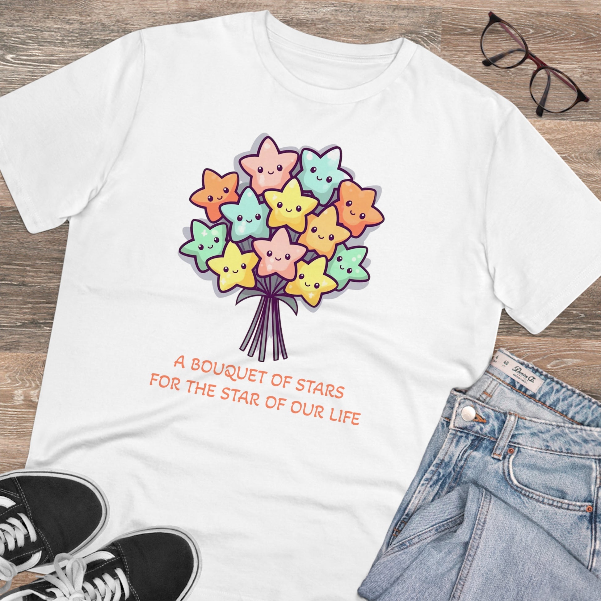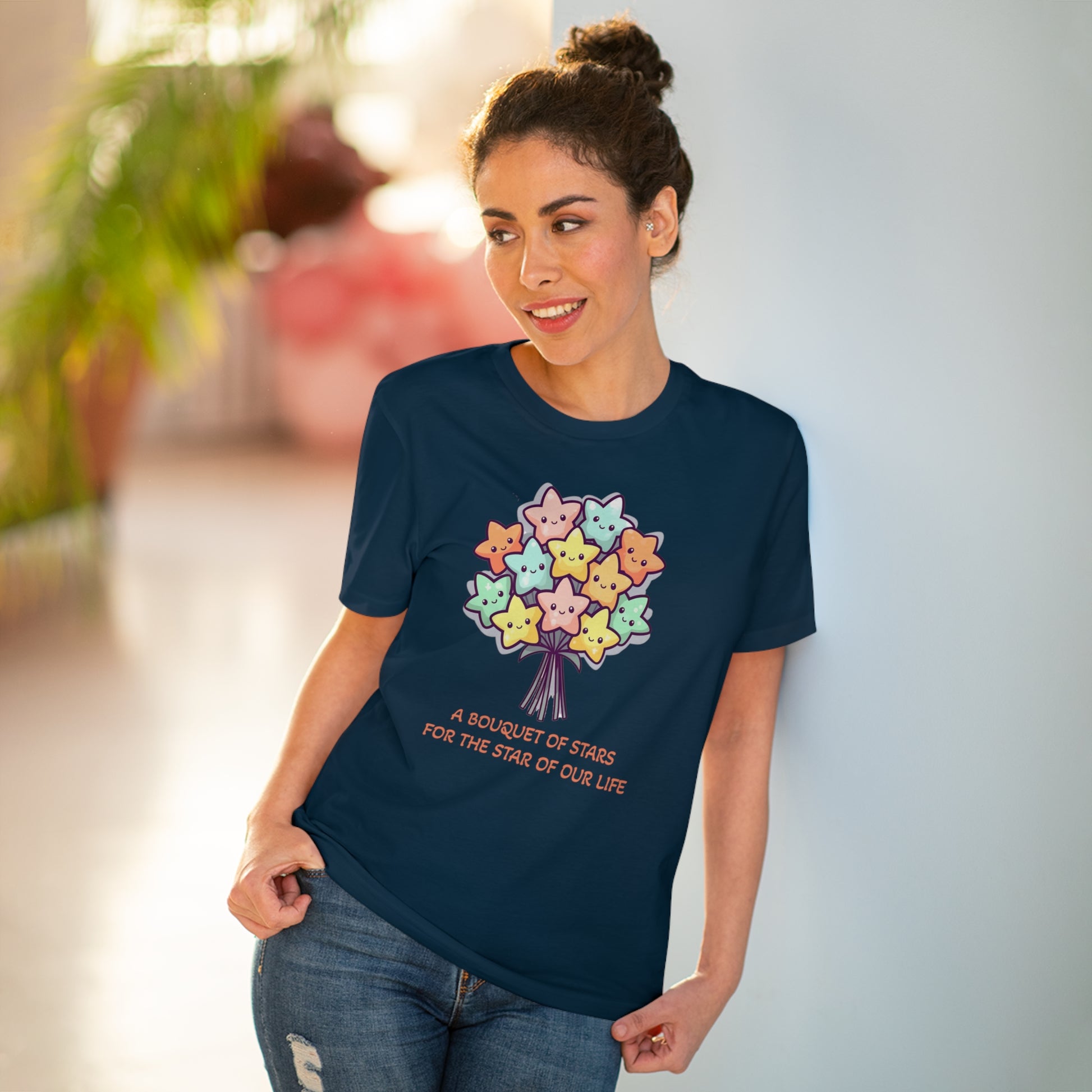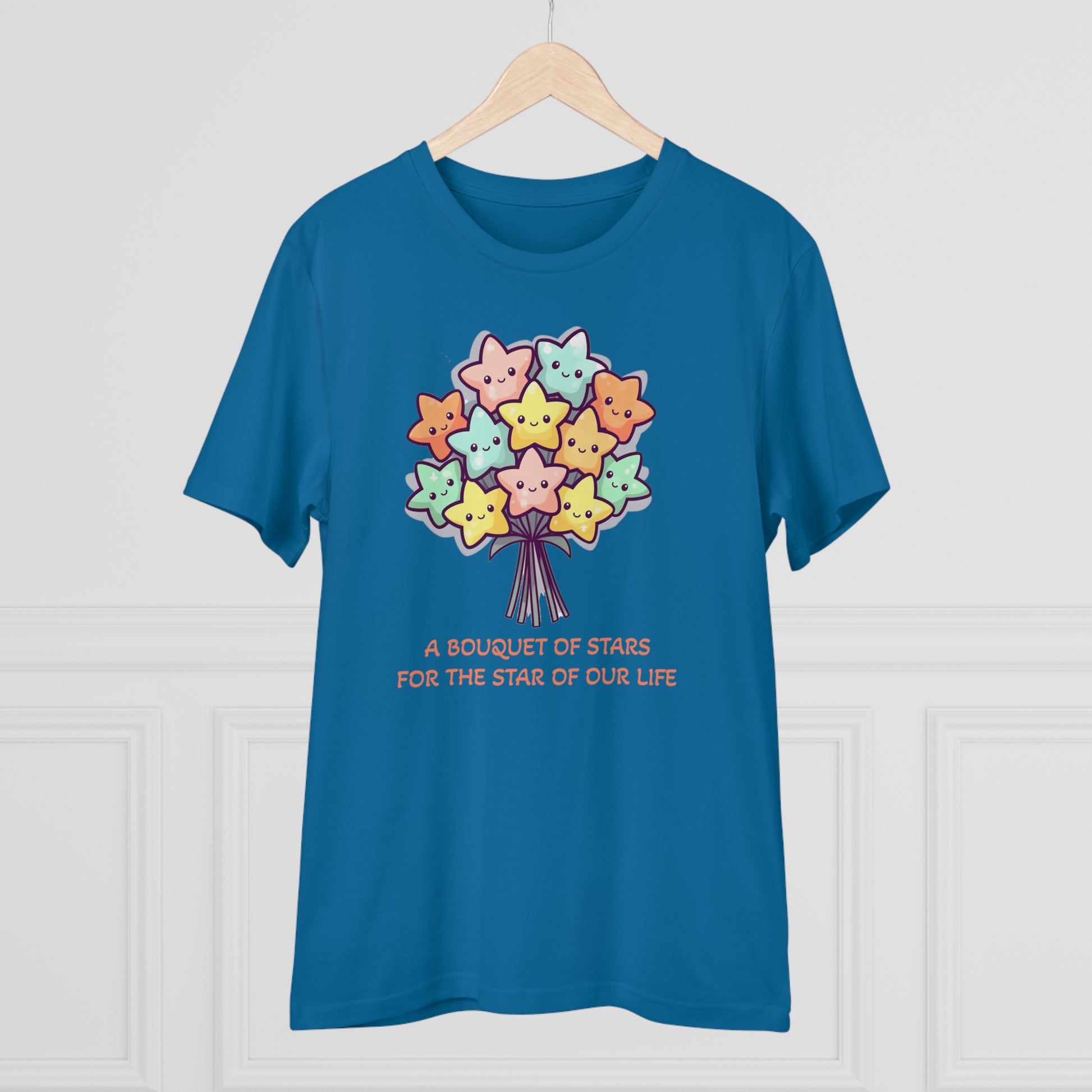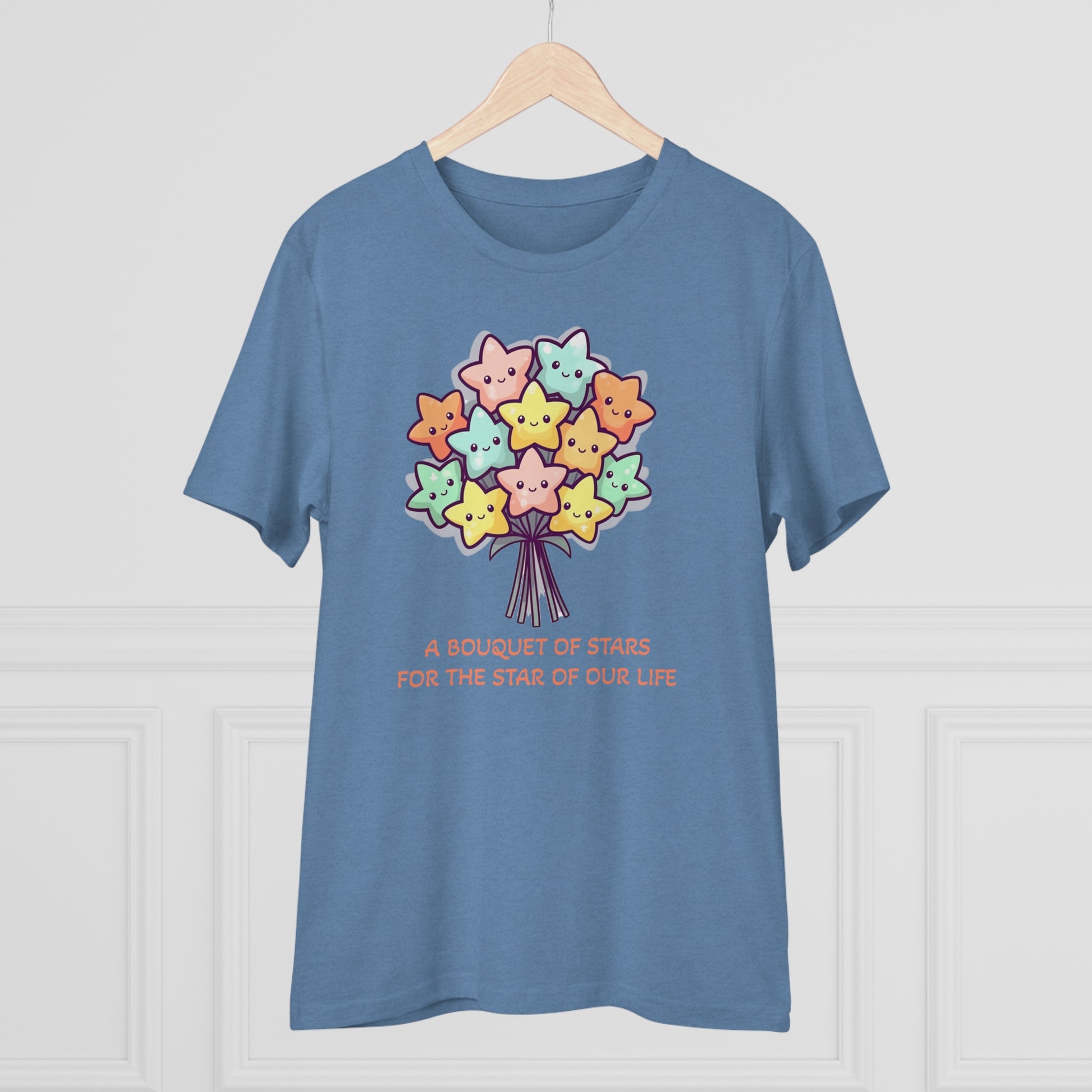 Honor the shining star in your life with this meaningful "Bouquet of Stars for the Star of Our Life" unisex eco-friendly t-shirt. Crafted from sustainable materials, this t-shirt not only showcases your love and appreciation but also demonstrates your commitment to the environment. The eye-catching design features a beautiful bouquet of stars, symbolizing the extraordinary presence of your loved ones. Express your admiration and celebrate their unique brilliance with this stylish and eco-conscious t-shirt, the perfect gift for any occasion.