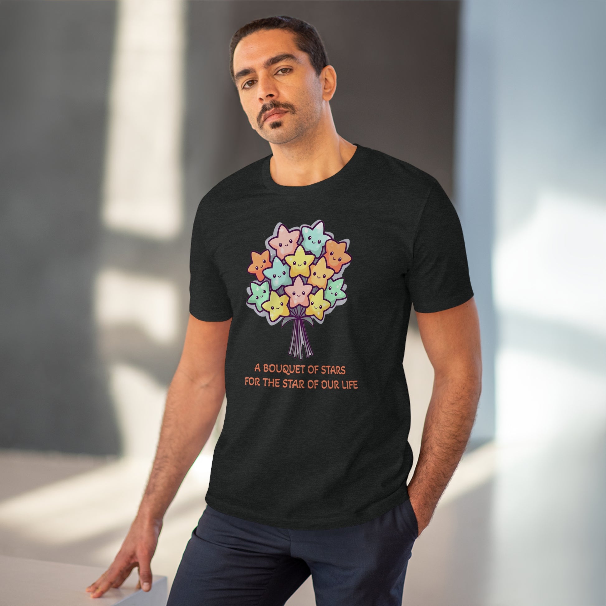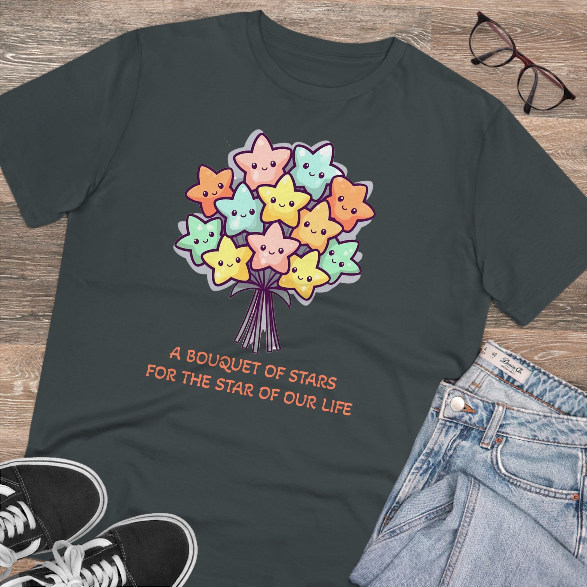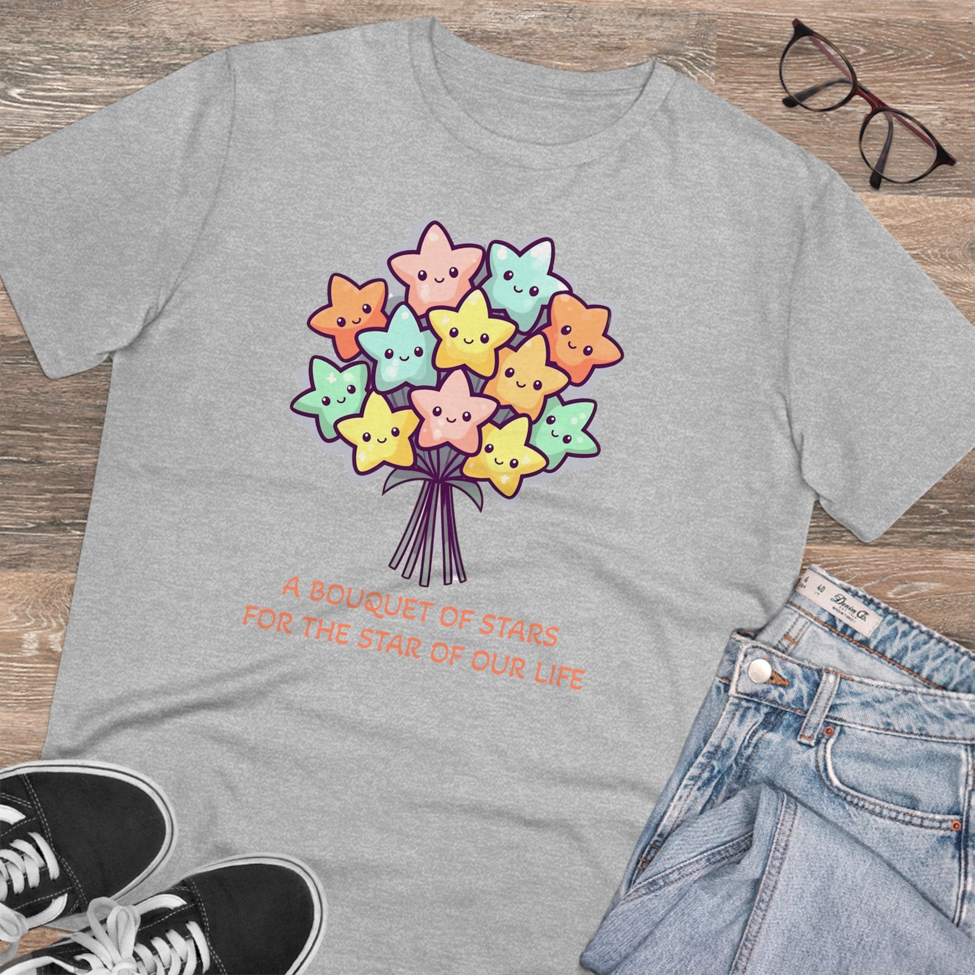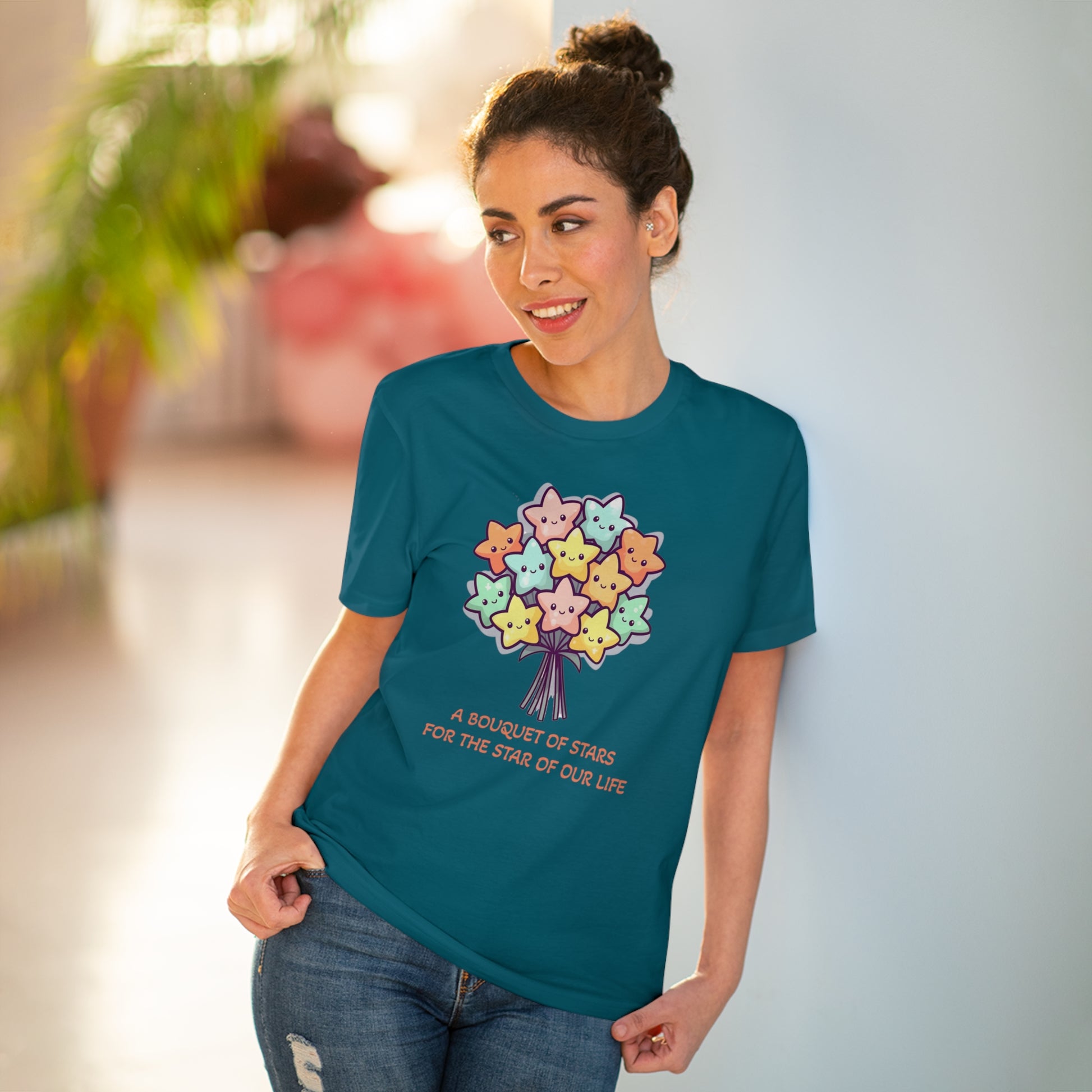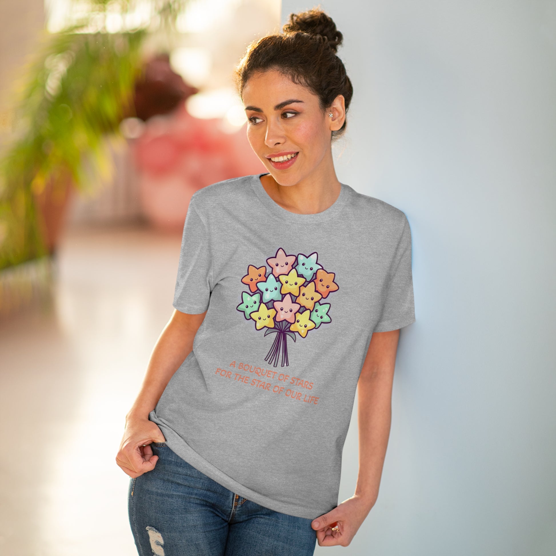 Honor the shining star in your life with this meaningful "Bouquet of Stars for the Star of Our Life" unisex eco-friendly t-shirt. Crafted from sustainable materials, this t-shirt not only showcases your love and appreciation but also demonstrates your commitment to the environment. The eye-catching design features a beautiful bouquet of stars, symbolizing the extraordinary presence of your loved ones. Express your admiration and celebrate their unique brilliance with this stylish and eco-conscious t-shirt, the perfect gift for any occasion.