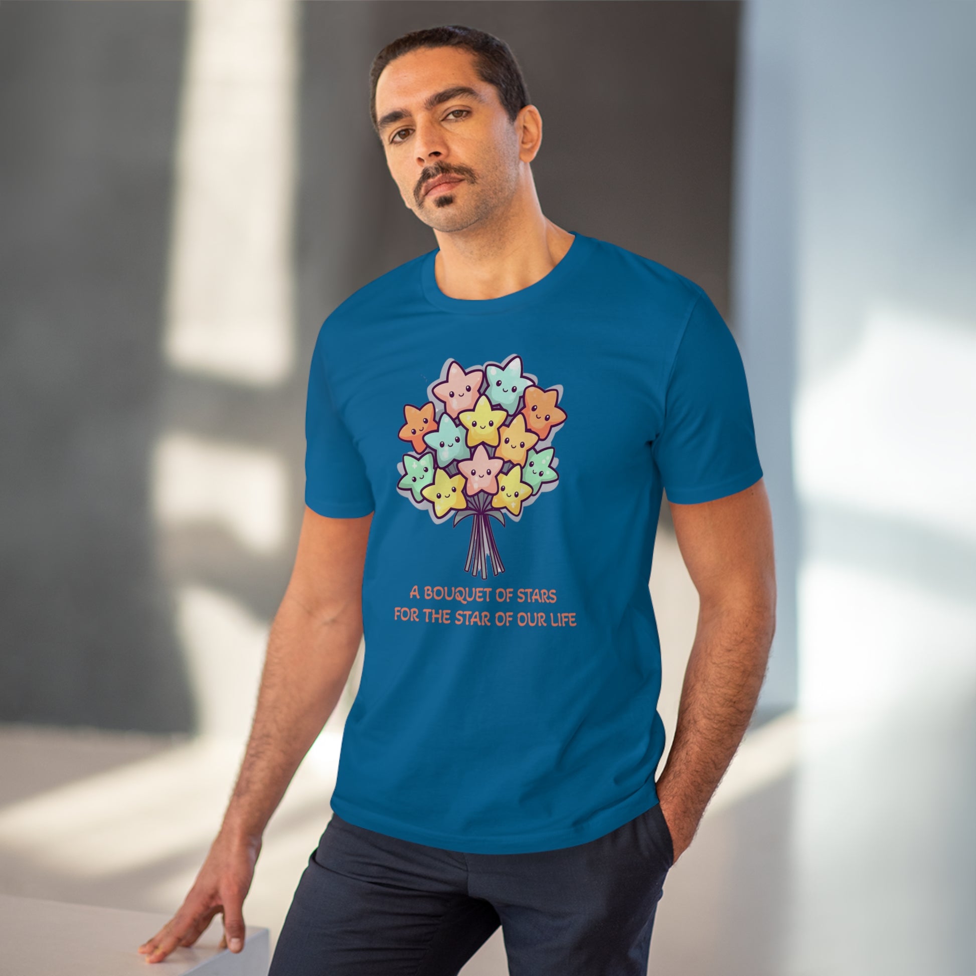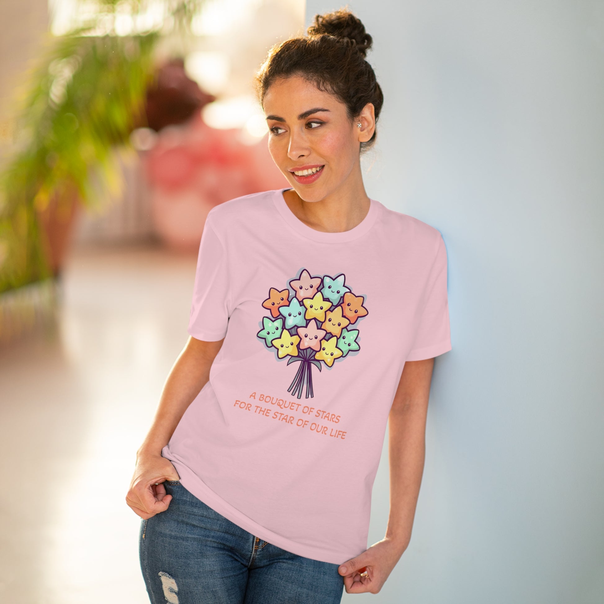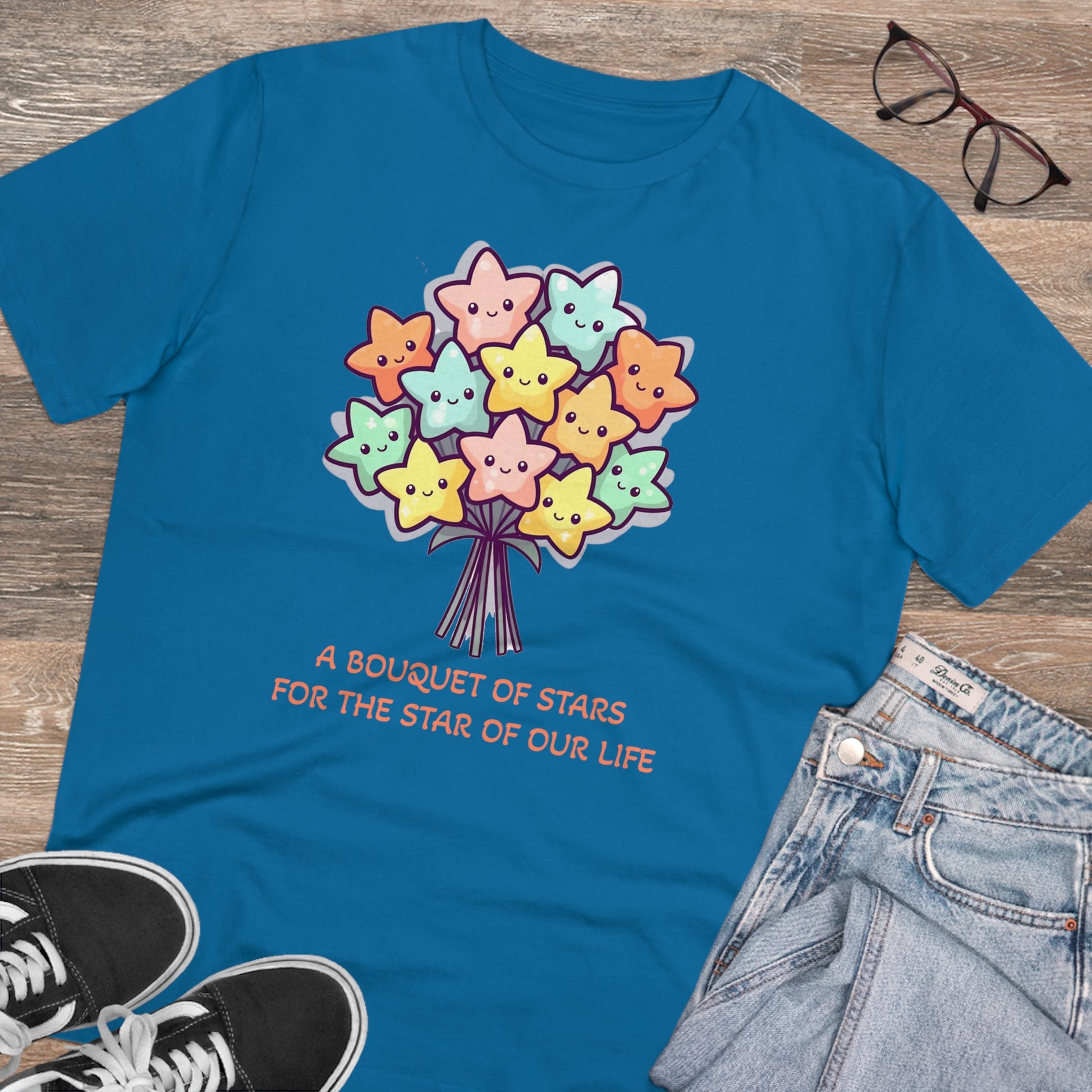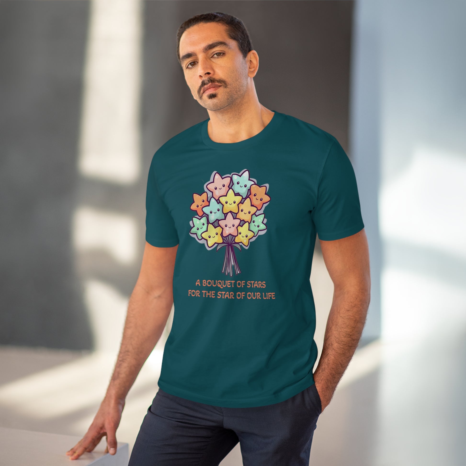 Honor the shining star in your life with this meaningful "Bouquet of Stars for the Star of Our Life" unisex eco-friendly t-shirt. Crafted from sustainable materials, this t-shirt not only showcases your love and appreciation but also demonstrates your commitment to the environment. The eye-catching design features a beautiful bouquet of stars, symbolizing the extraordinary presence of your loved ones. Express your admiration and celebrate their unique brilliance with this stylish and eco-conscious t-shirt, the perfect gift for any occasion.