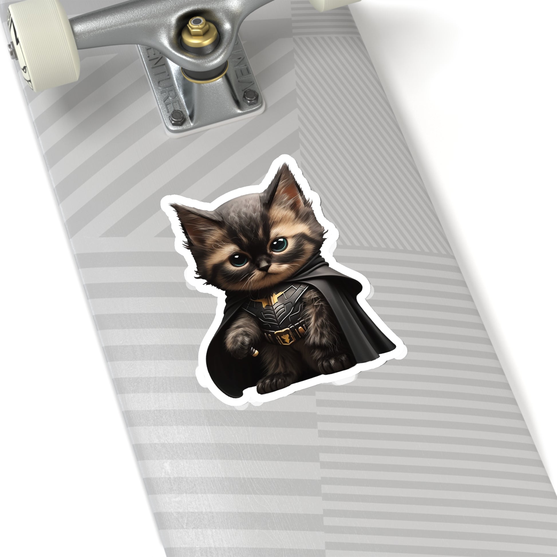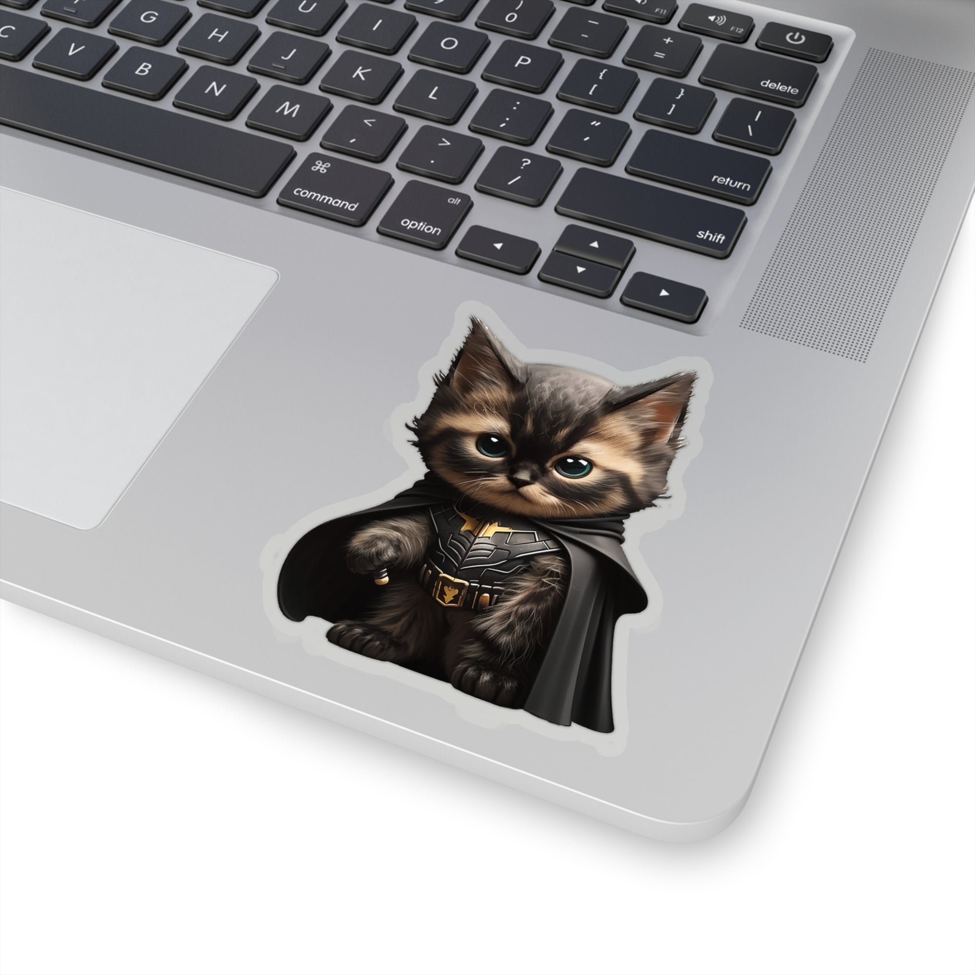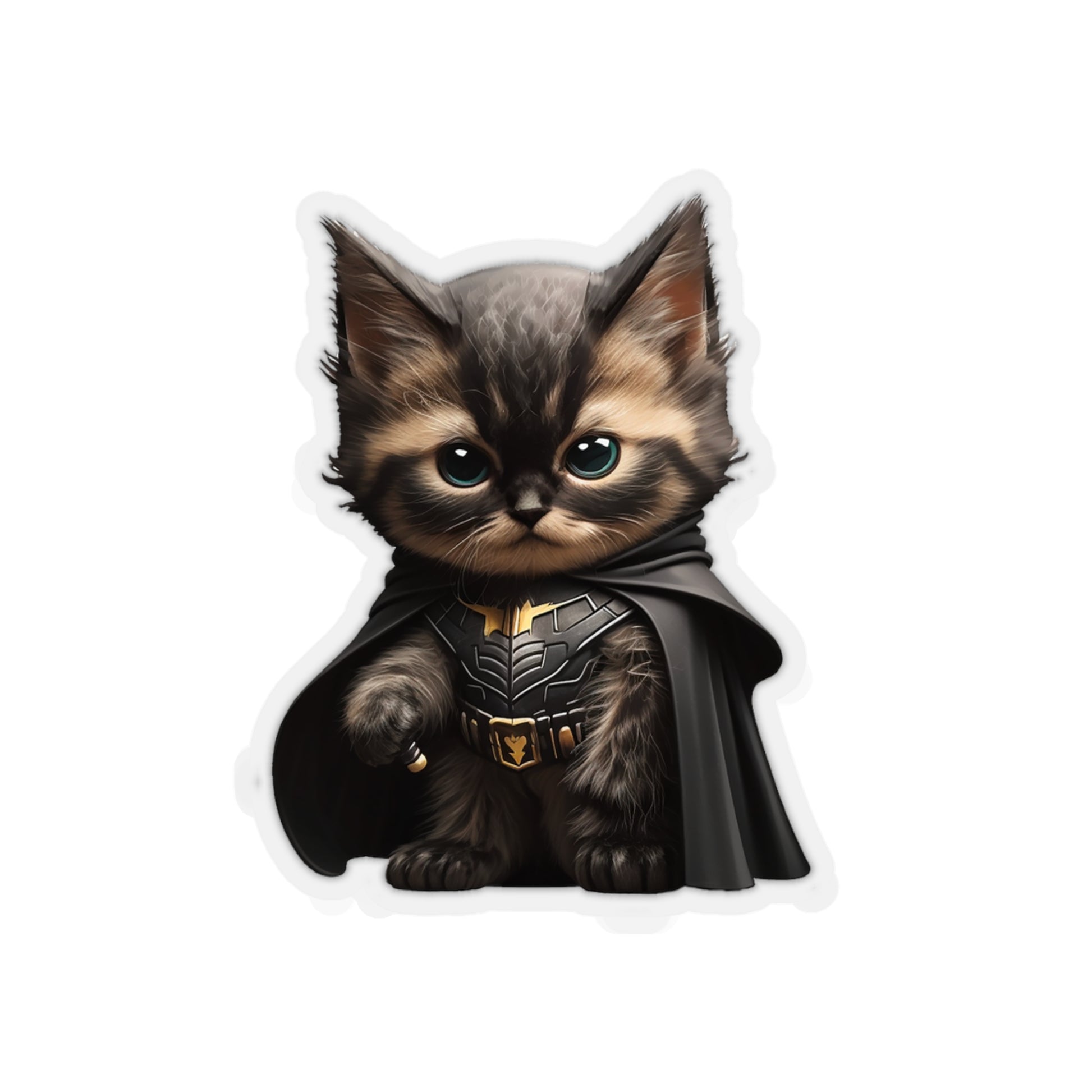 This adorable sticker features a cute and fluffy kitten dressed up as the Caped Crusader himself ! Complete with a black cape and a bat-shaped mask, this little kitten is ready to take on the bad guys and save the day. The sticker shows the kitten in an action pose, ready to pounce into action and defend its City.