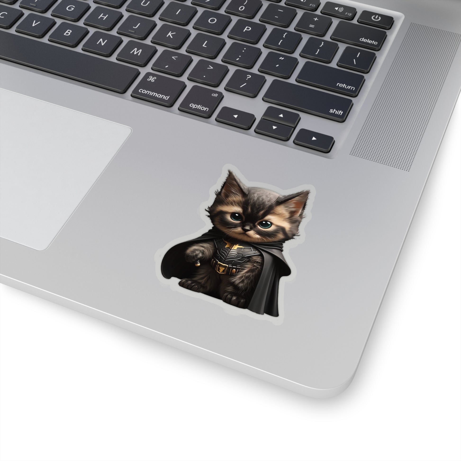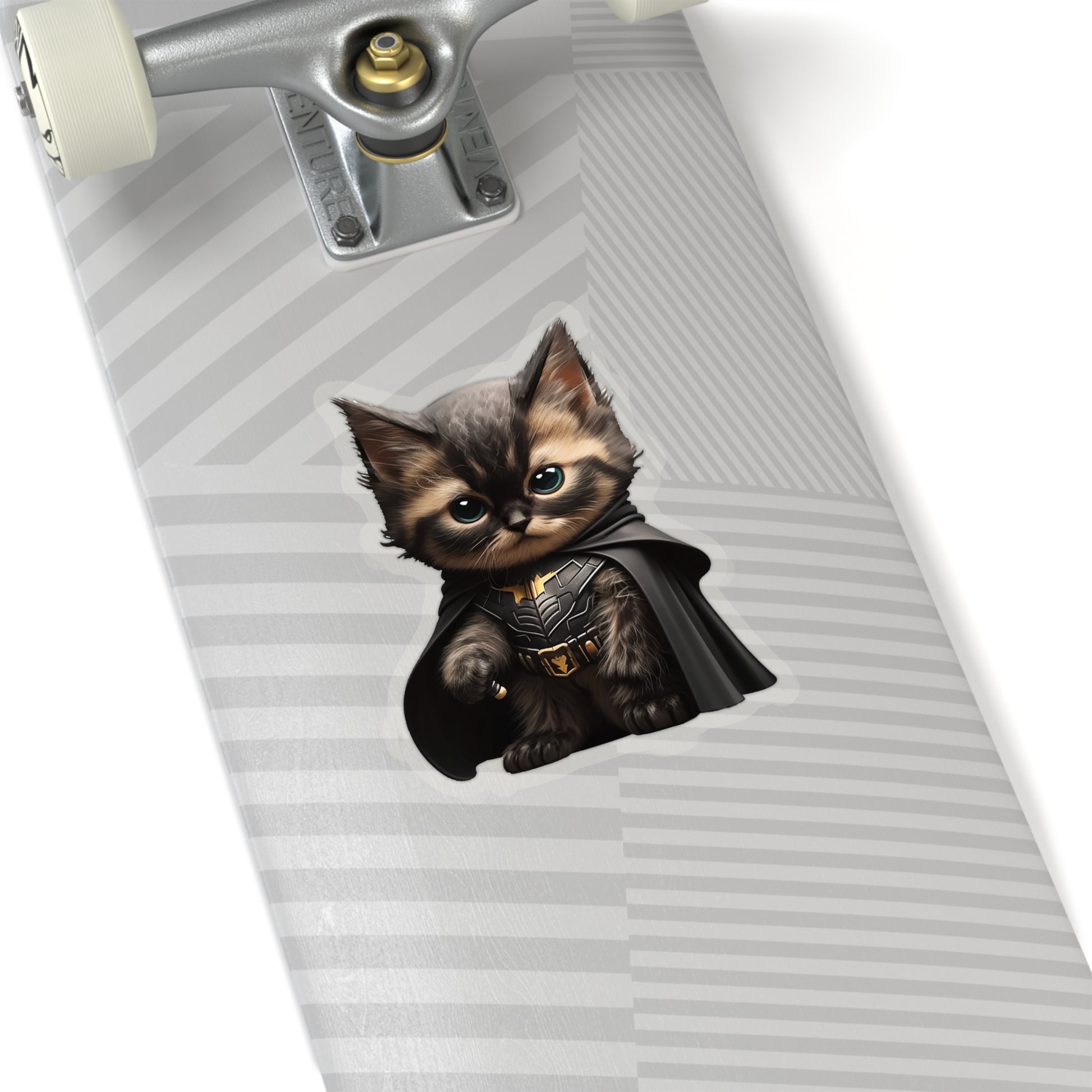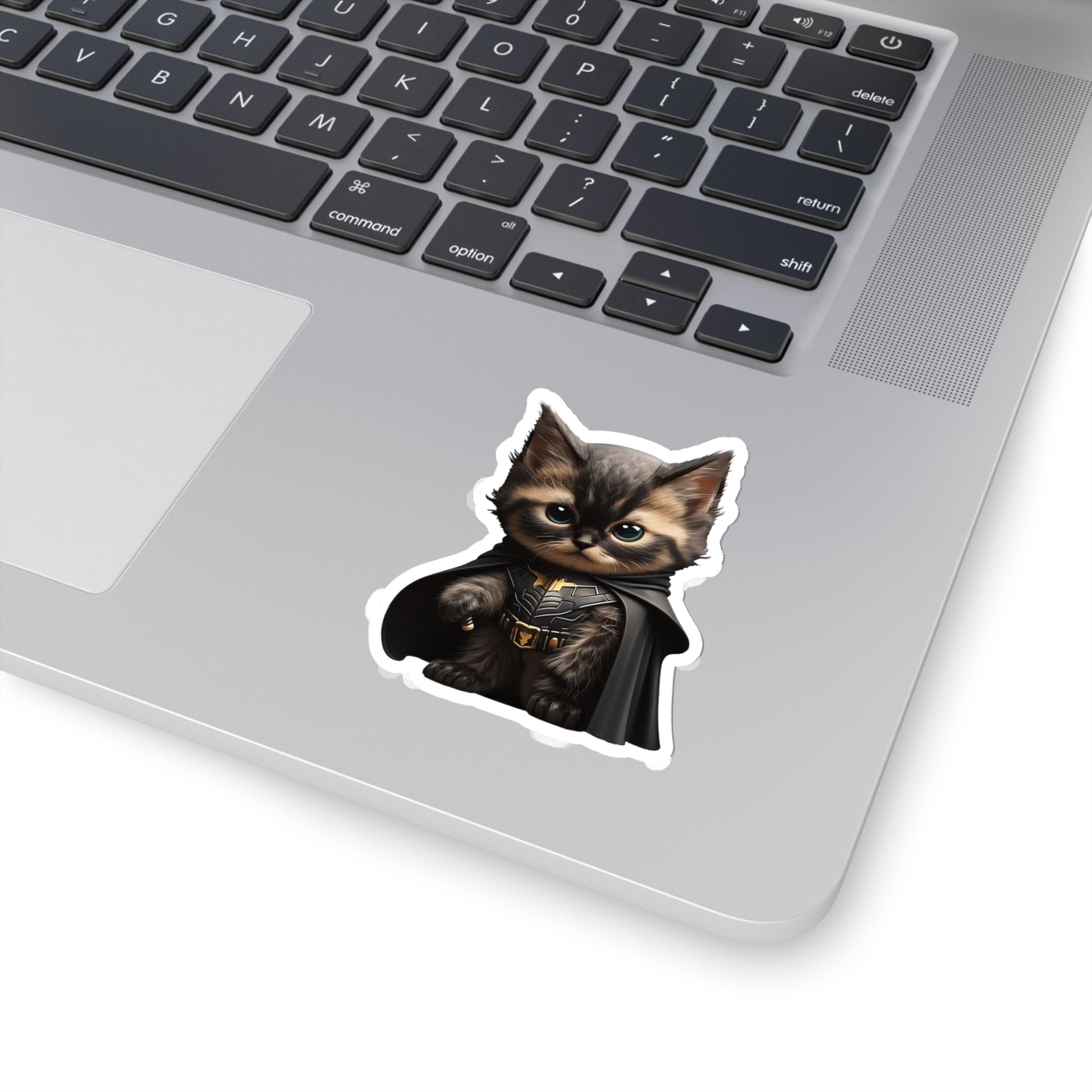 This adorable sticker features a cute and fluffy kitten dressed up as the Caped Crusader himself ! Complete with a black cape and a bat-shaped mask, this little kitten is ready to take on the bad guys and save the day. The sticker shows the kitten in an action pose, ready to pounce into action and defend its City.