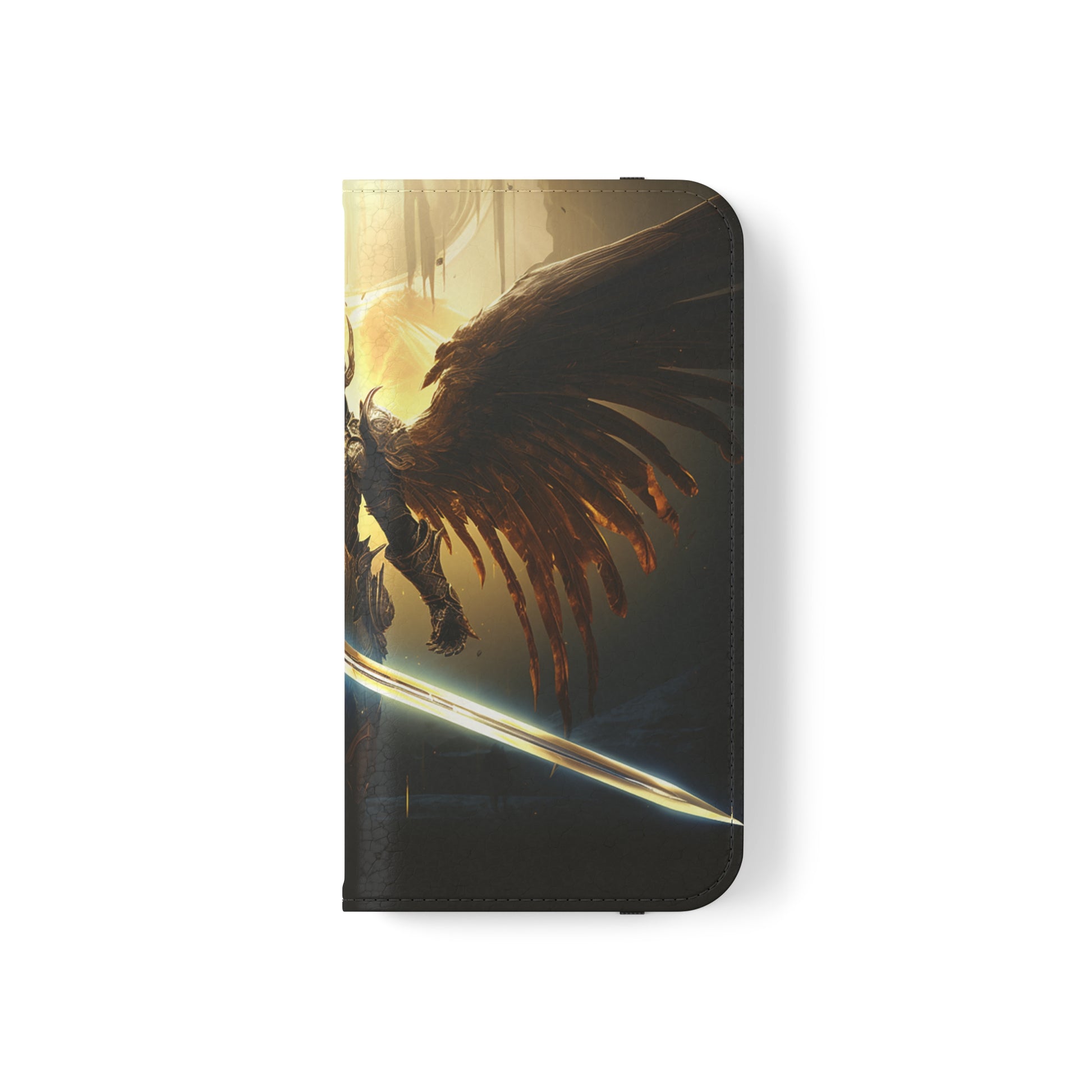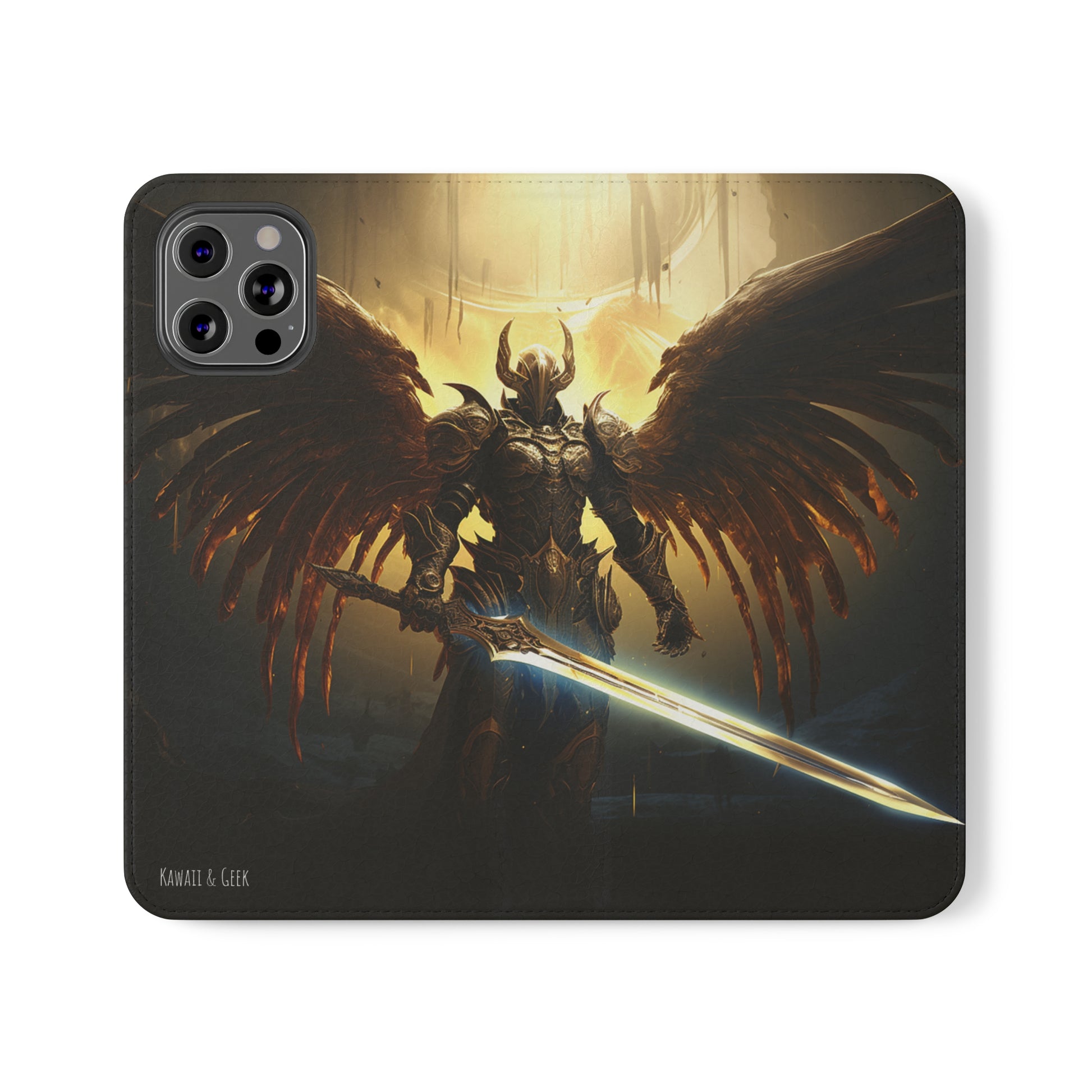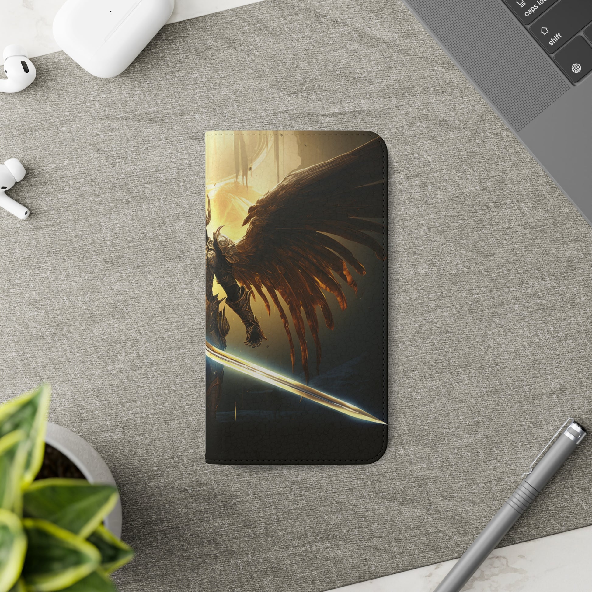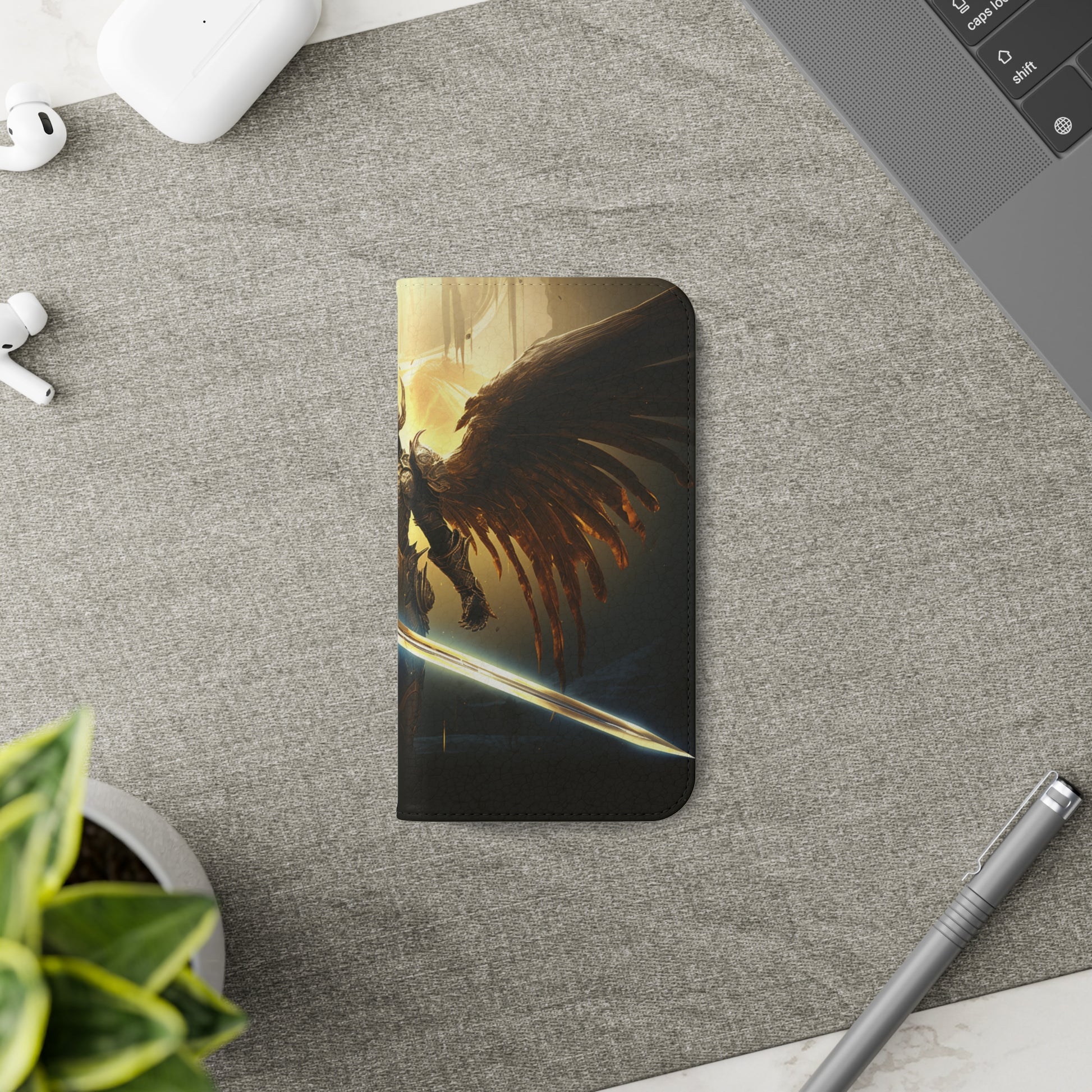 Keywords: Dark angel design, Angel wings case, Sword motif, Ethereal phone case, Gothic phone cover, Mystical design, Guardian angel, Fantasy flip case, Protective folio, Phone stand case, Unique design, Premium leather case, Winged warrior.rials.
