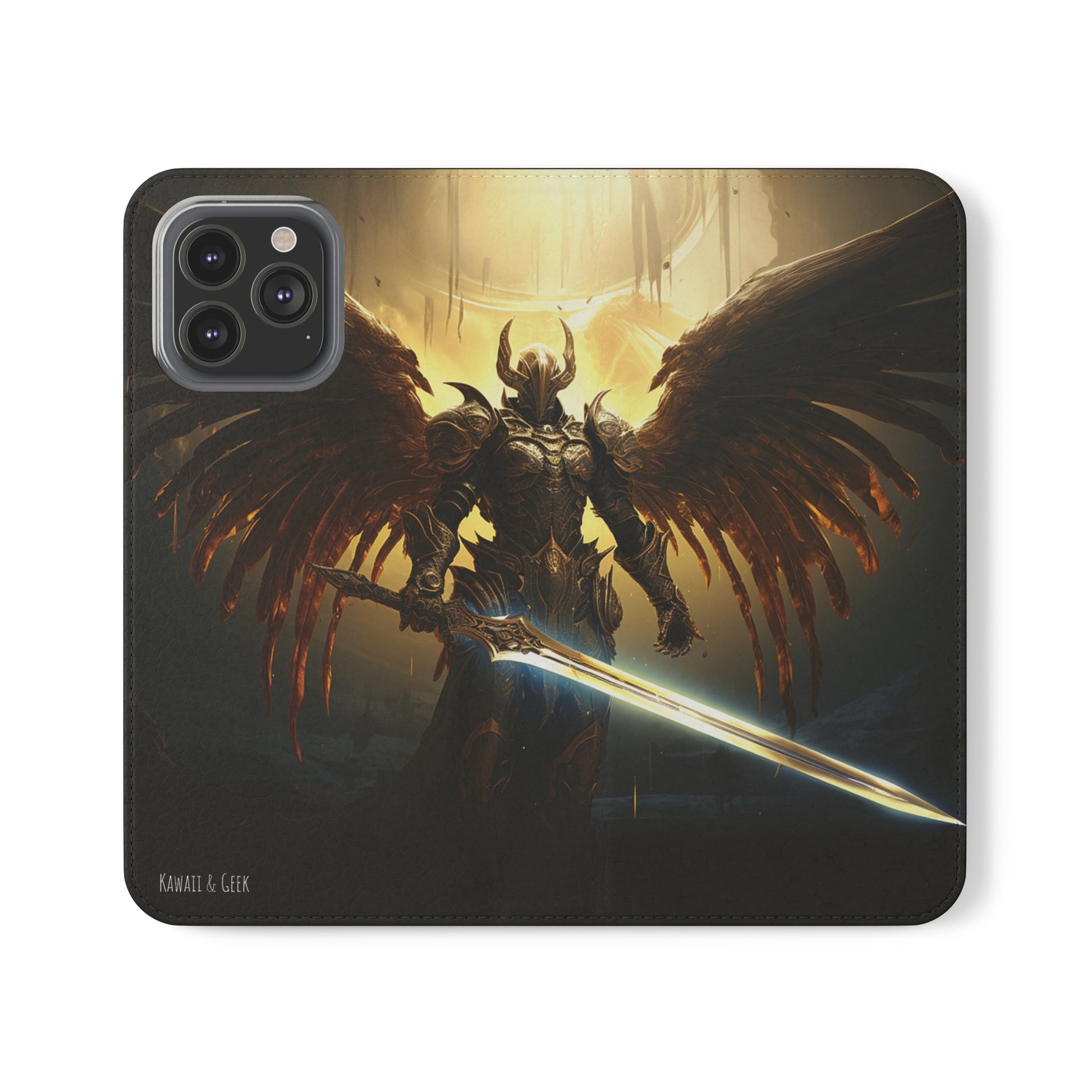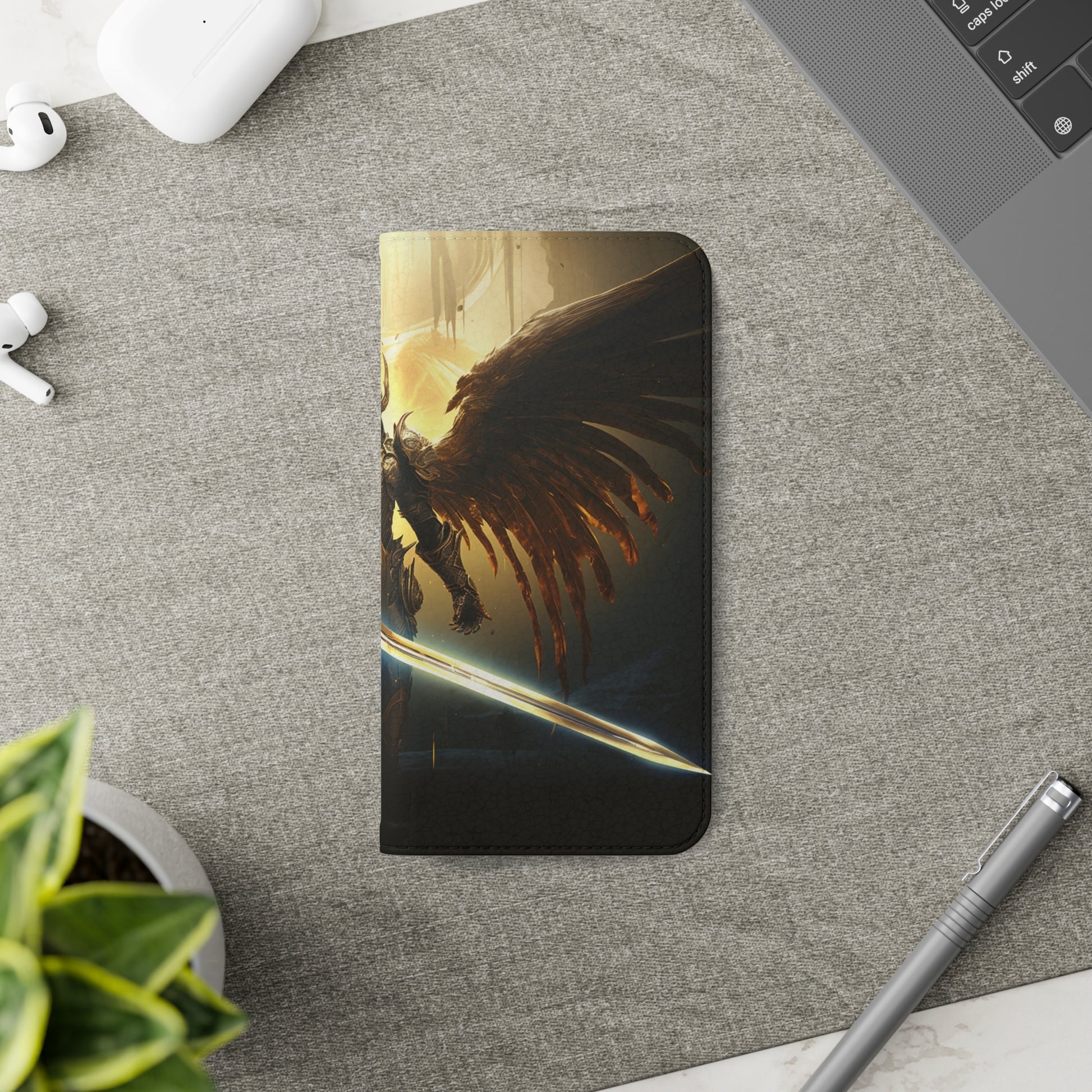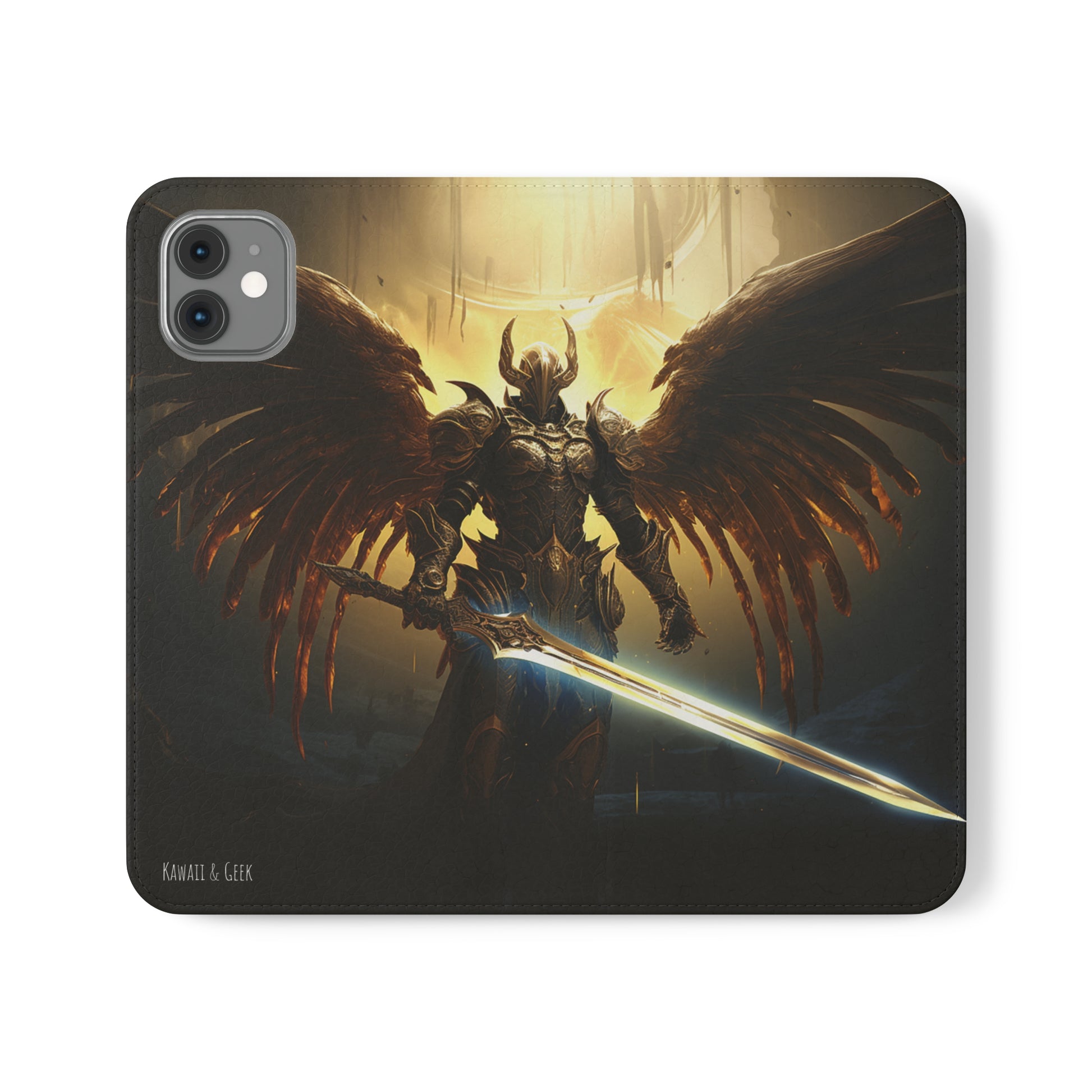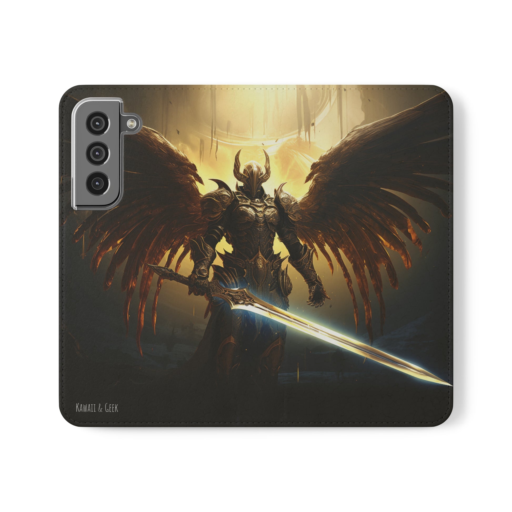 Keywords: Dark angel design, Angel wings case, Sword motif, Ethereal phone case, Gothic phone cover, Mystical design, Guardian angel, Fantasy flip case, Protective folio, Phone stand case, Unique design, Premium leather case, Winged warrior.rials.