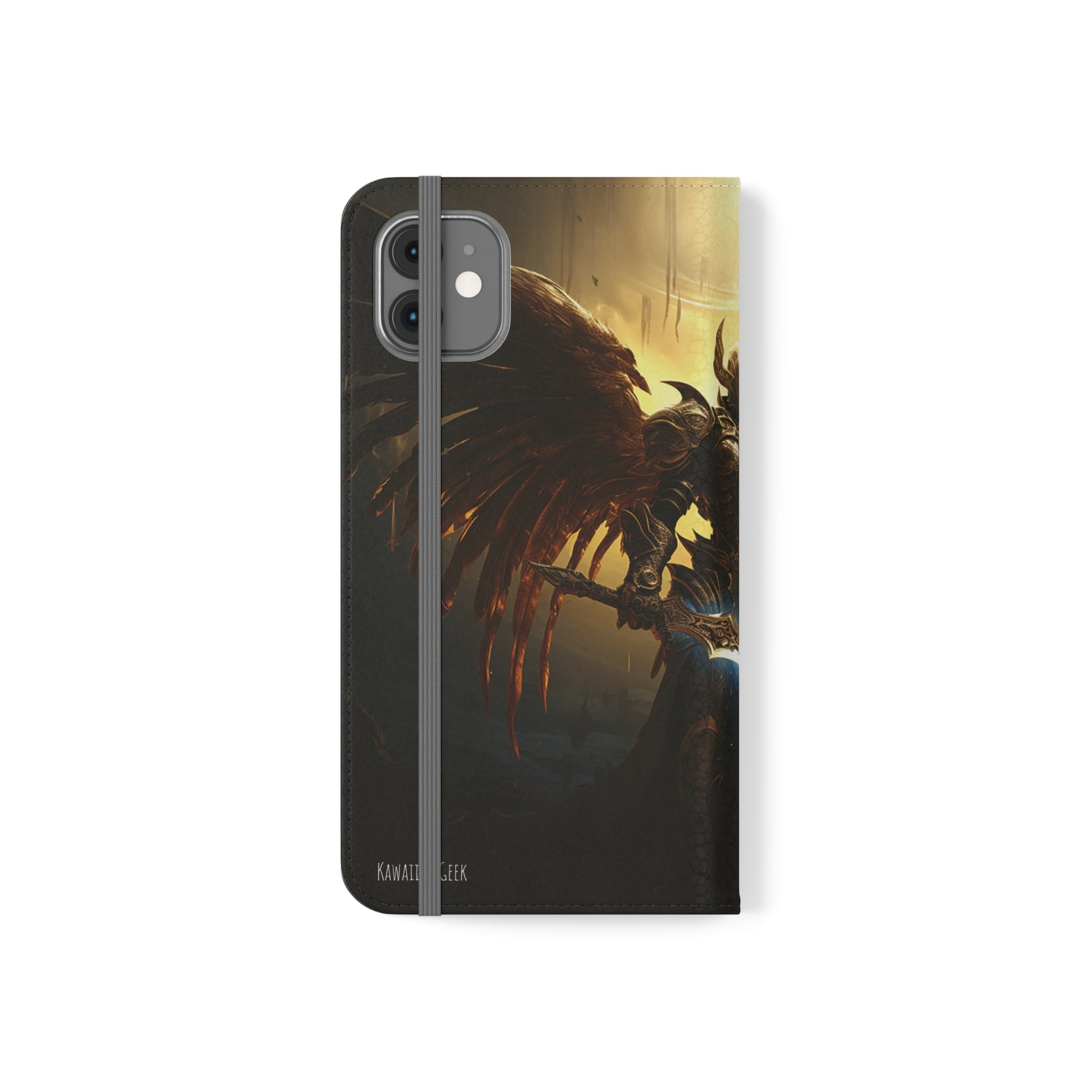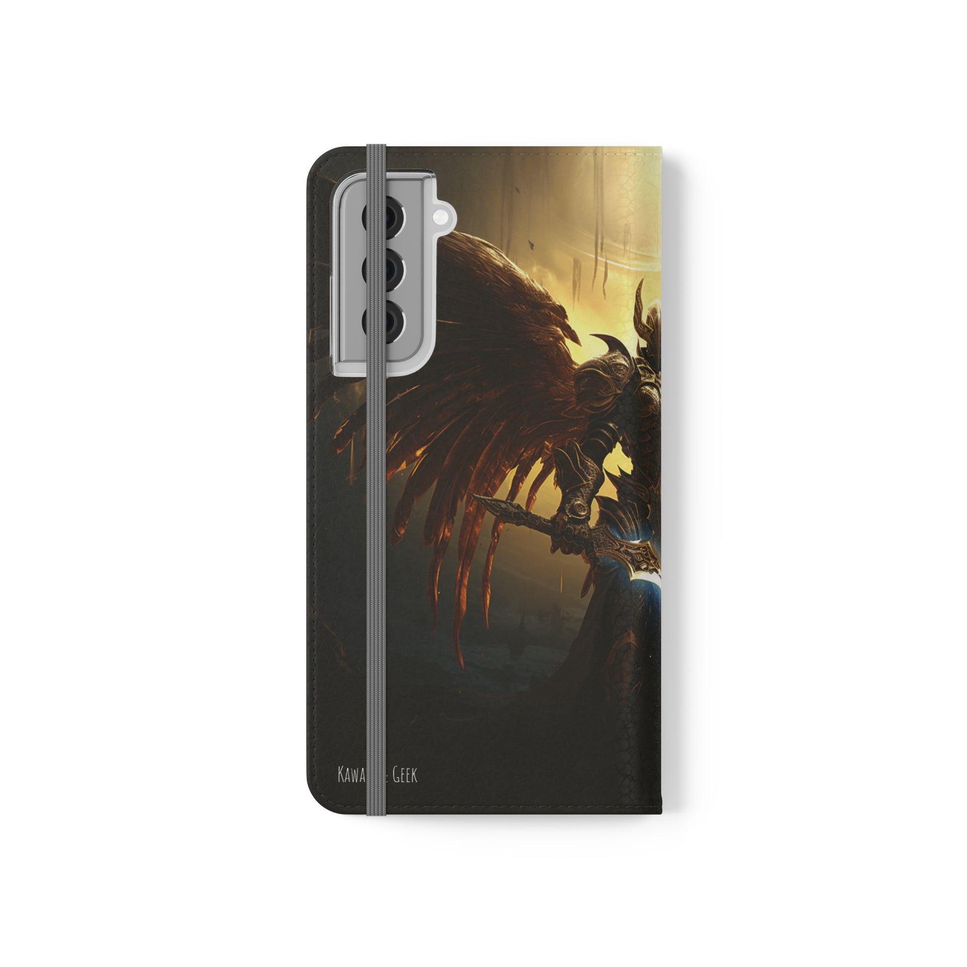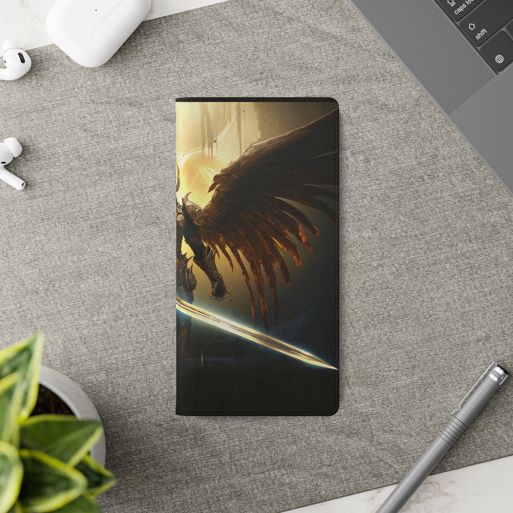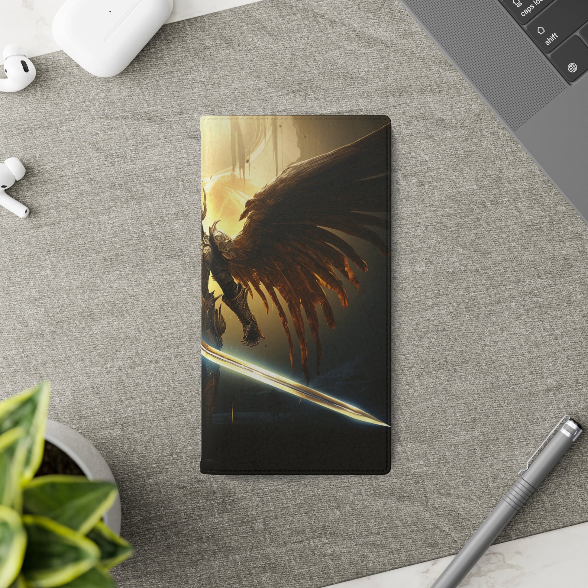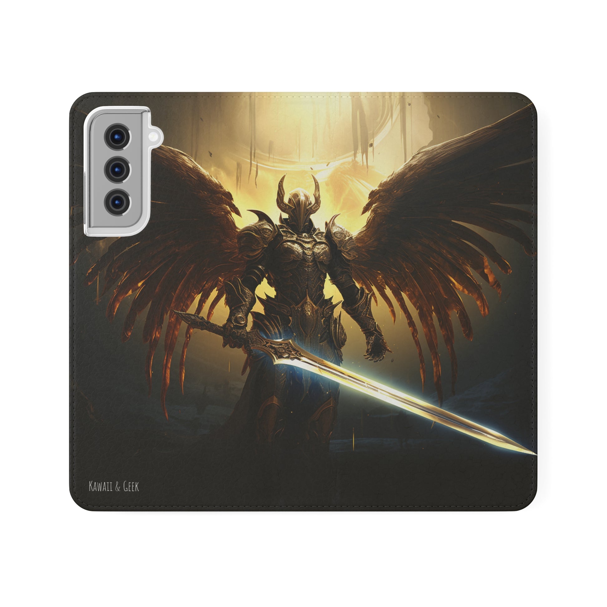 Keywords: Dark angel design, Angel wings case, Sword motif, Ethereal phone case, Gothic phone cover, Mystical design, Guardian angel, Fantasy flip case, Protective folio, Phone stand case, Unique design, Premium leather case, Winged warrior.rials.