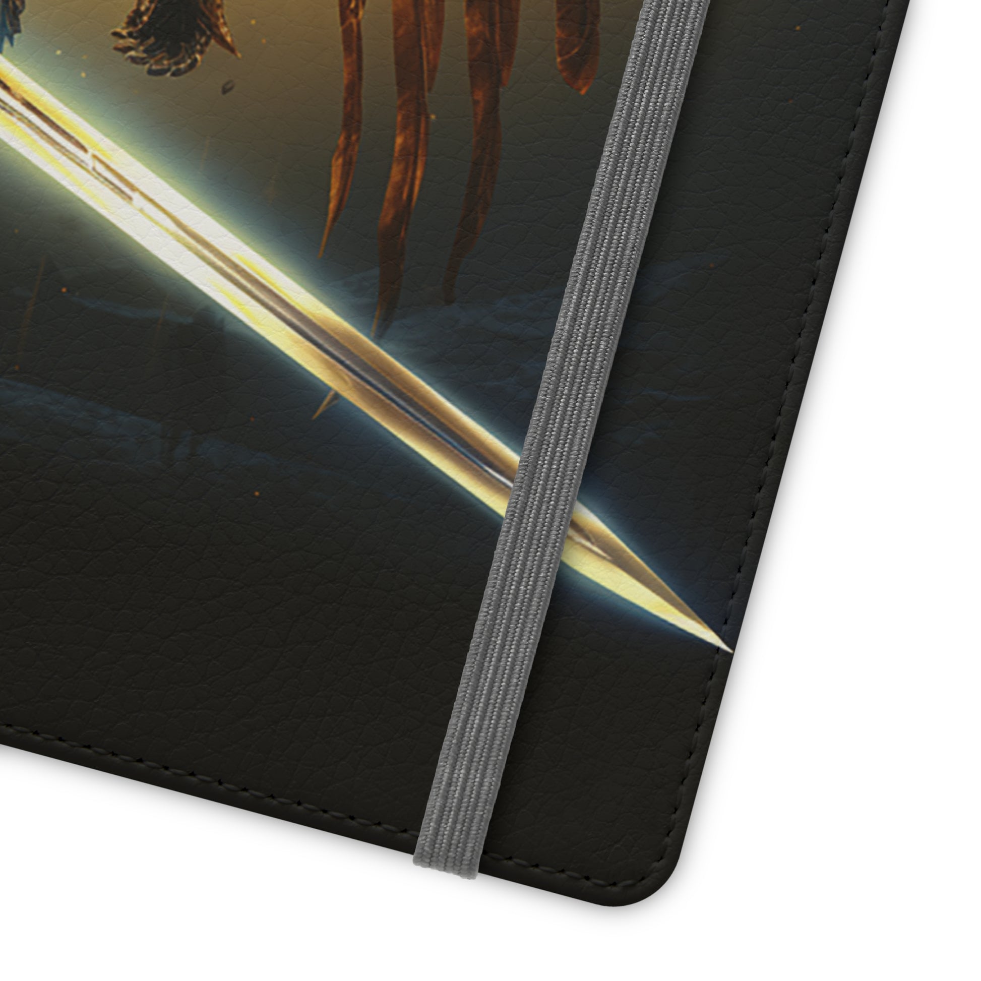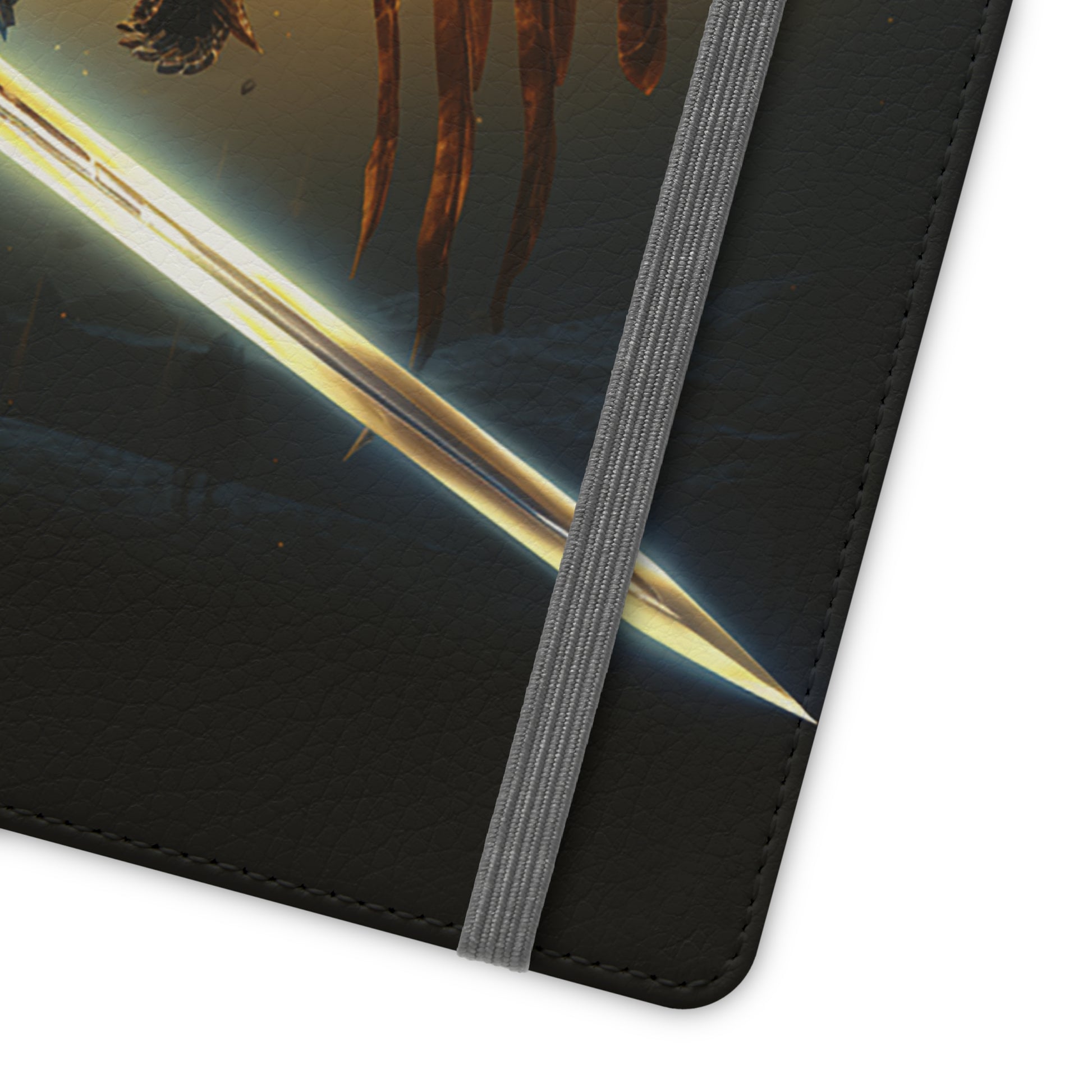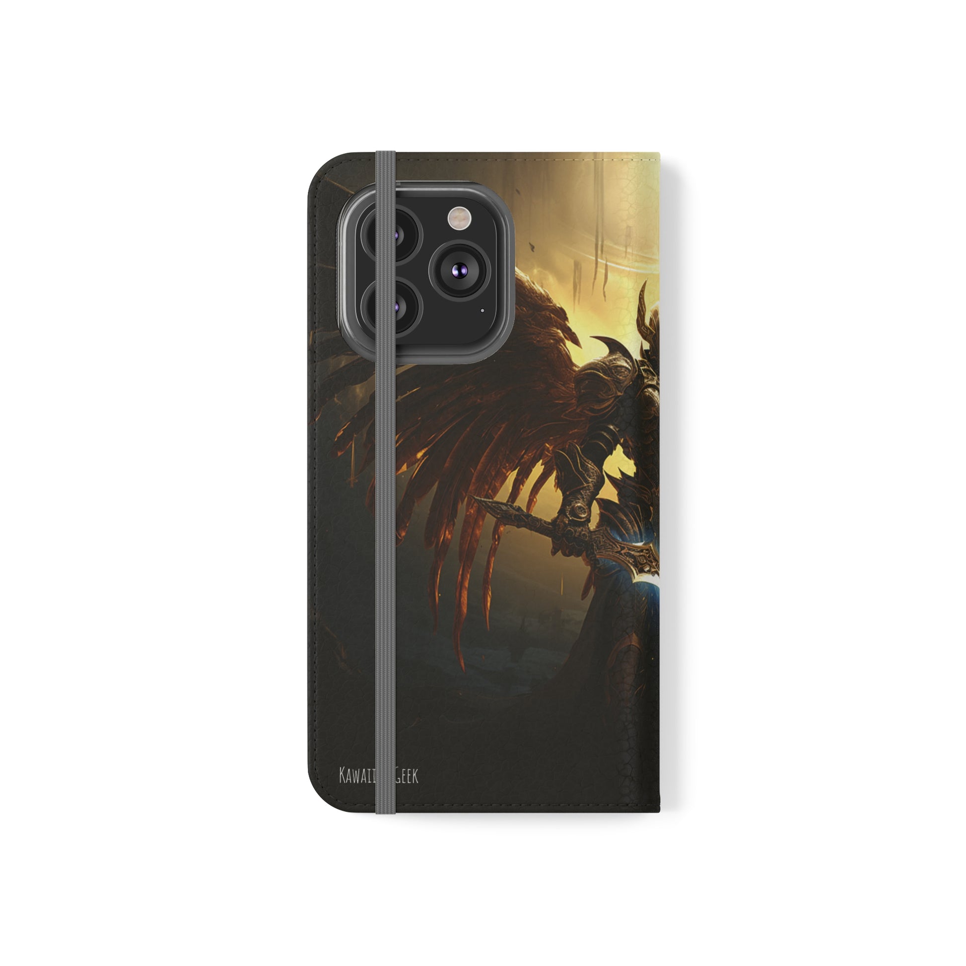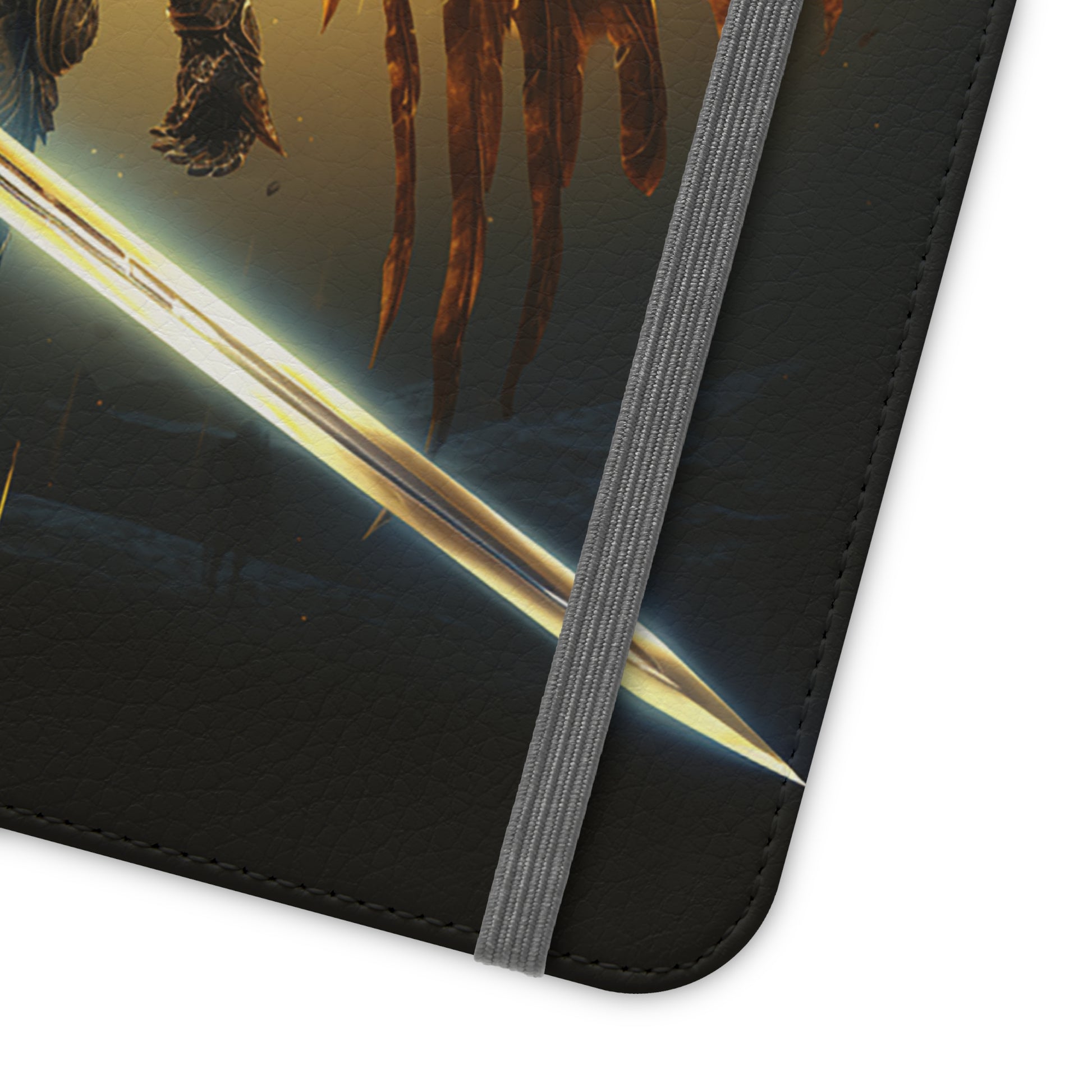 Keywords: Dark angel design, Angel wings case, Sword motif, Ethereal phone case, Gothic phone cover, Mystical design, Guardian angel, Fantasy flip case, Protective folio, Phone stand case, Unique design, Premium leather case, Winged warrior.rials.