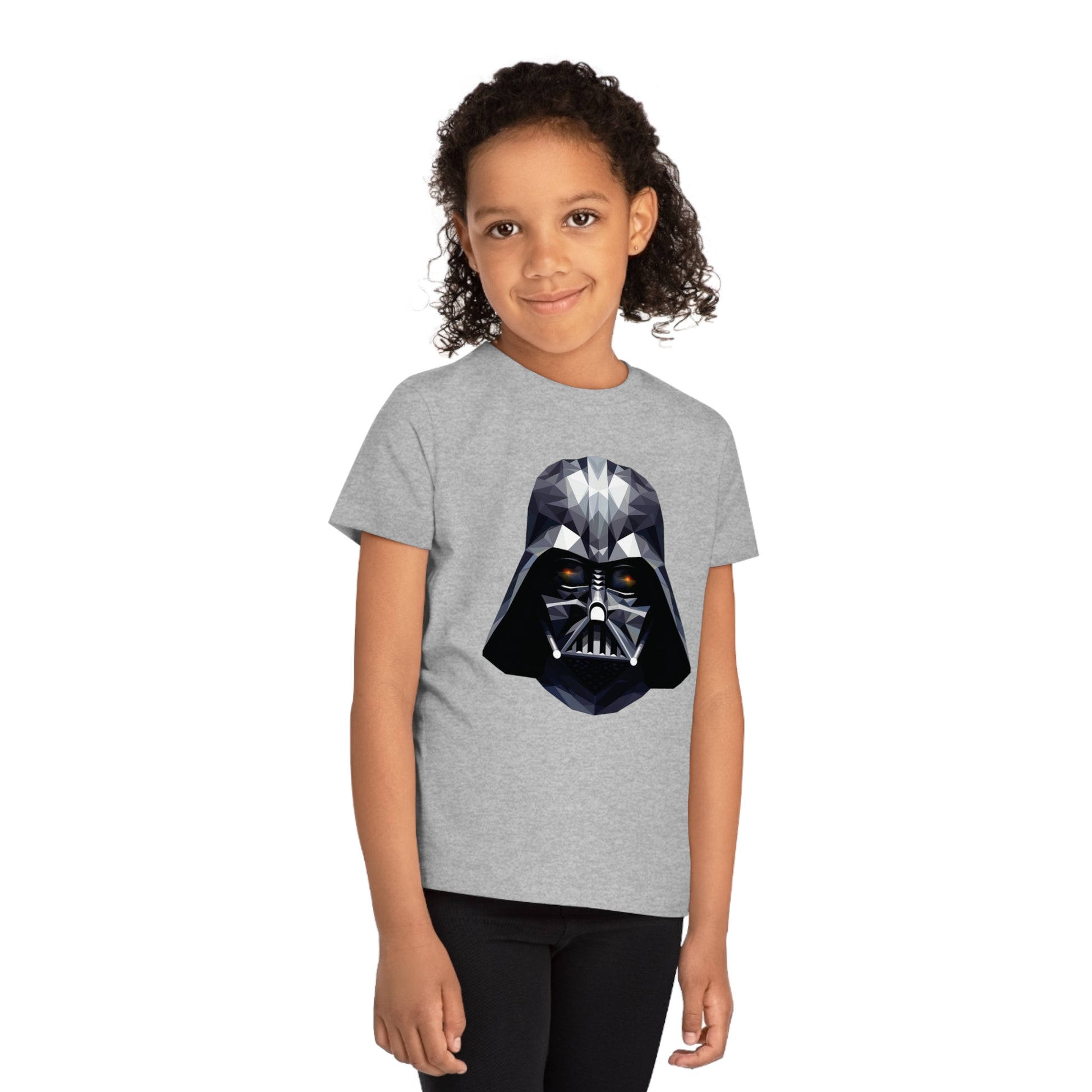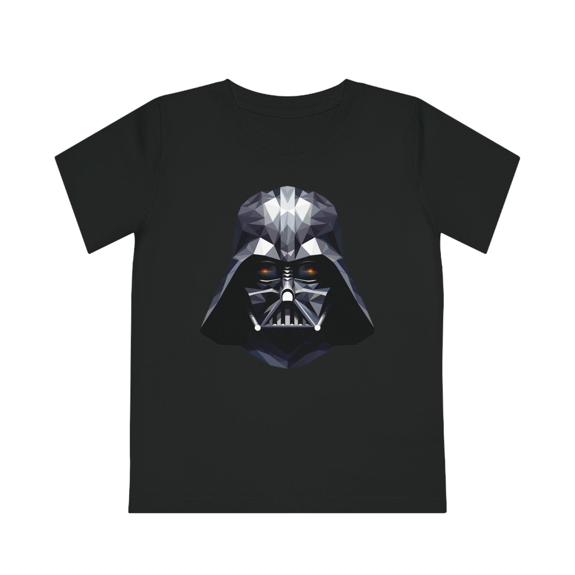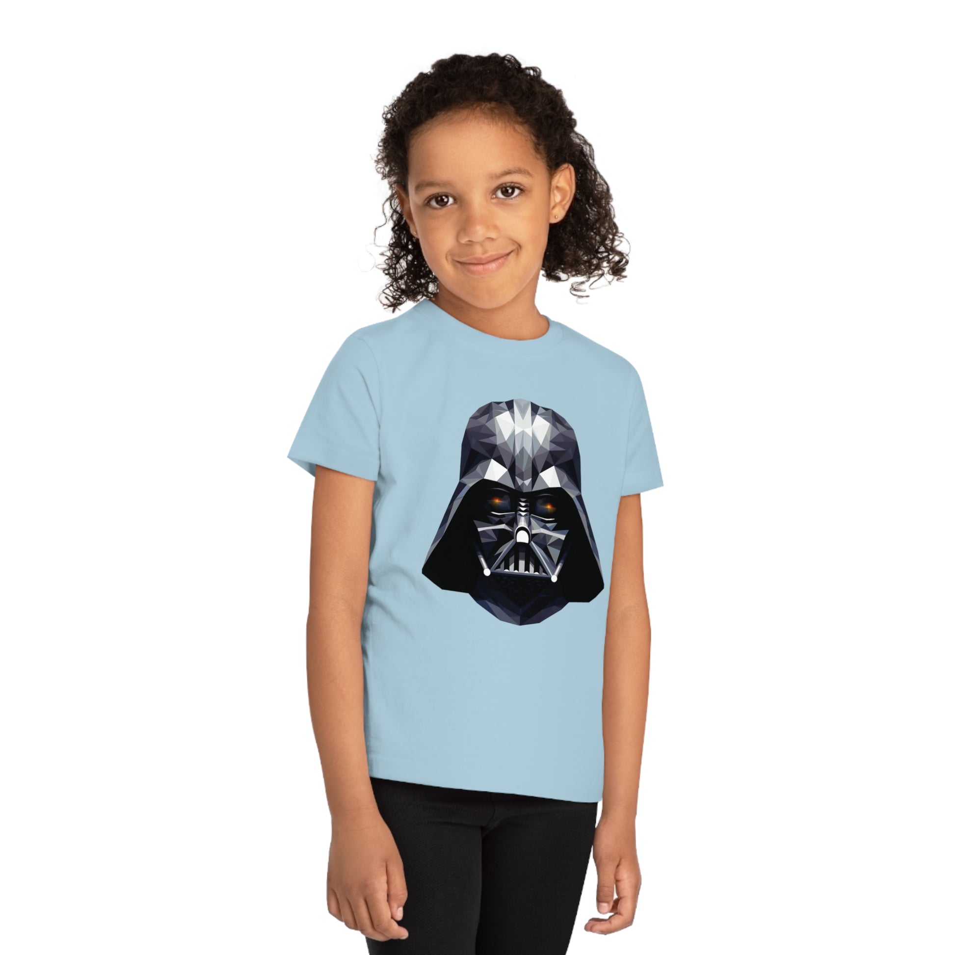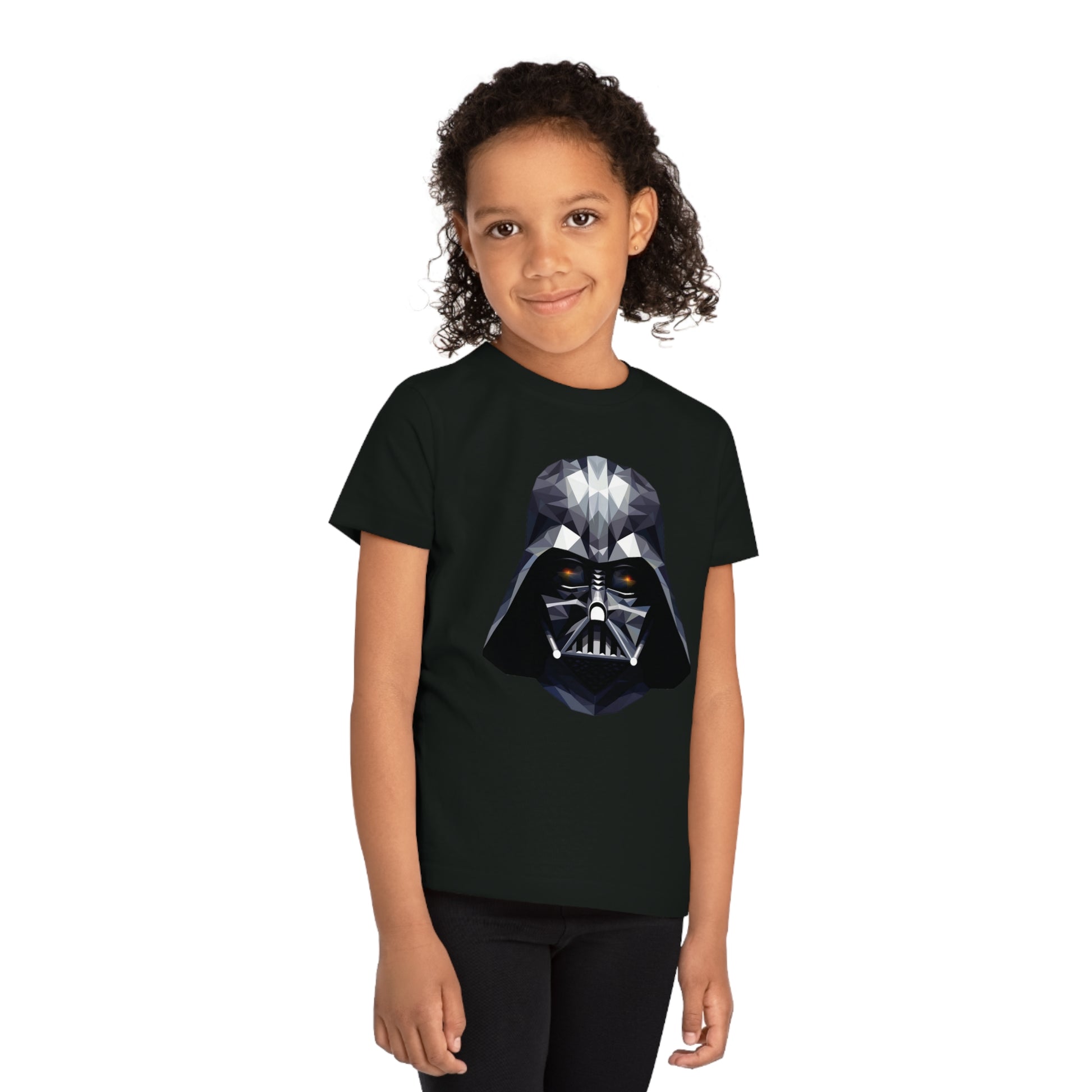 Keywords: Darth Vader kids t-shirt, polygonal geometric style, eco-friendly materials, dark side, iconic design, unique style, Star Wars fan, sustainable fashion.