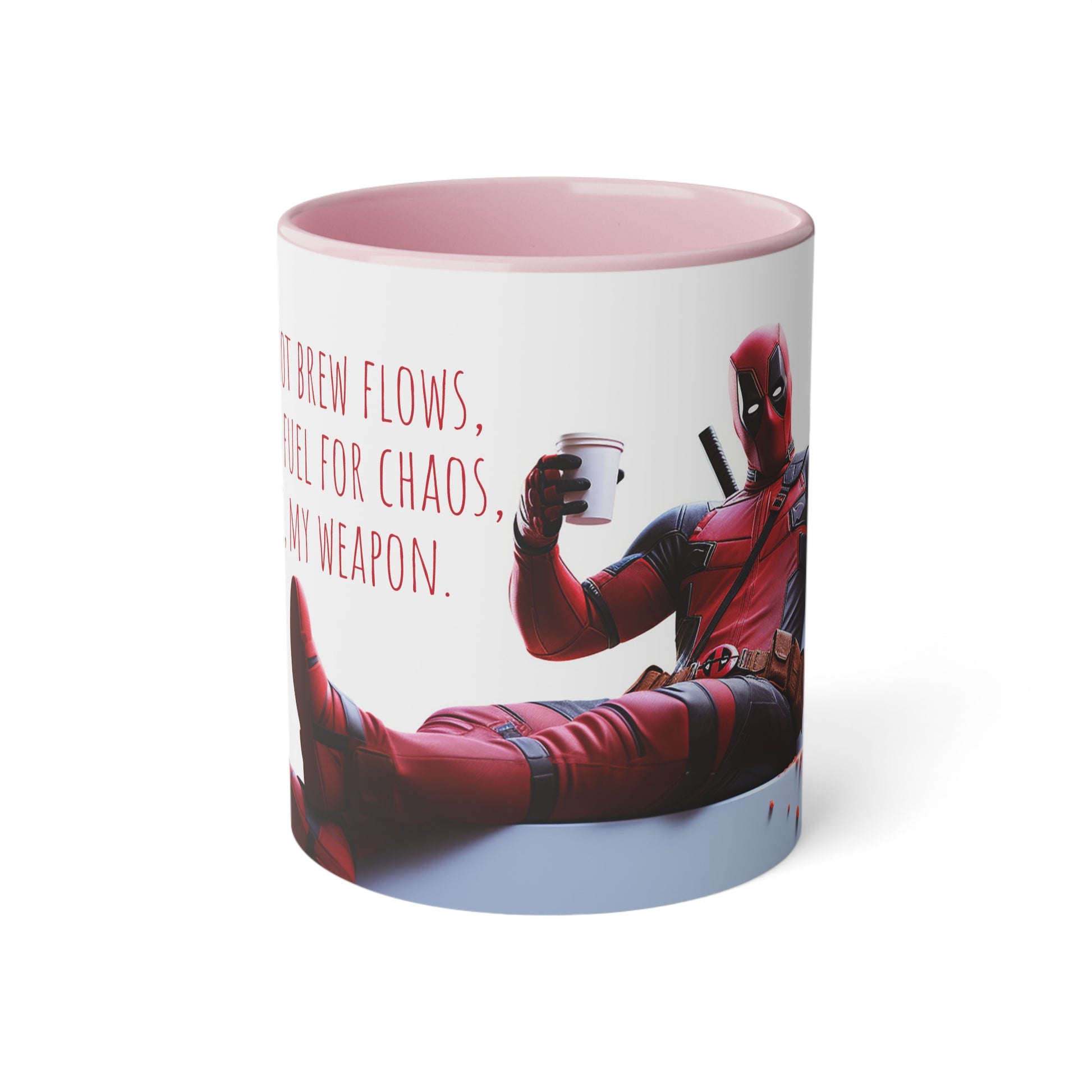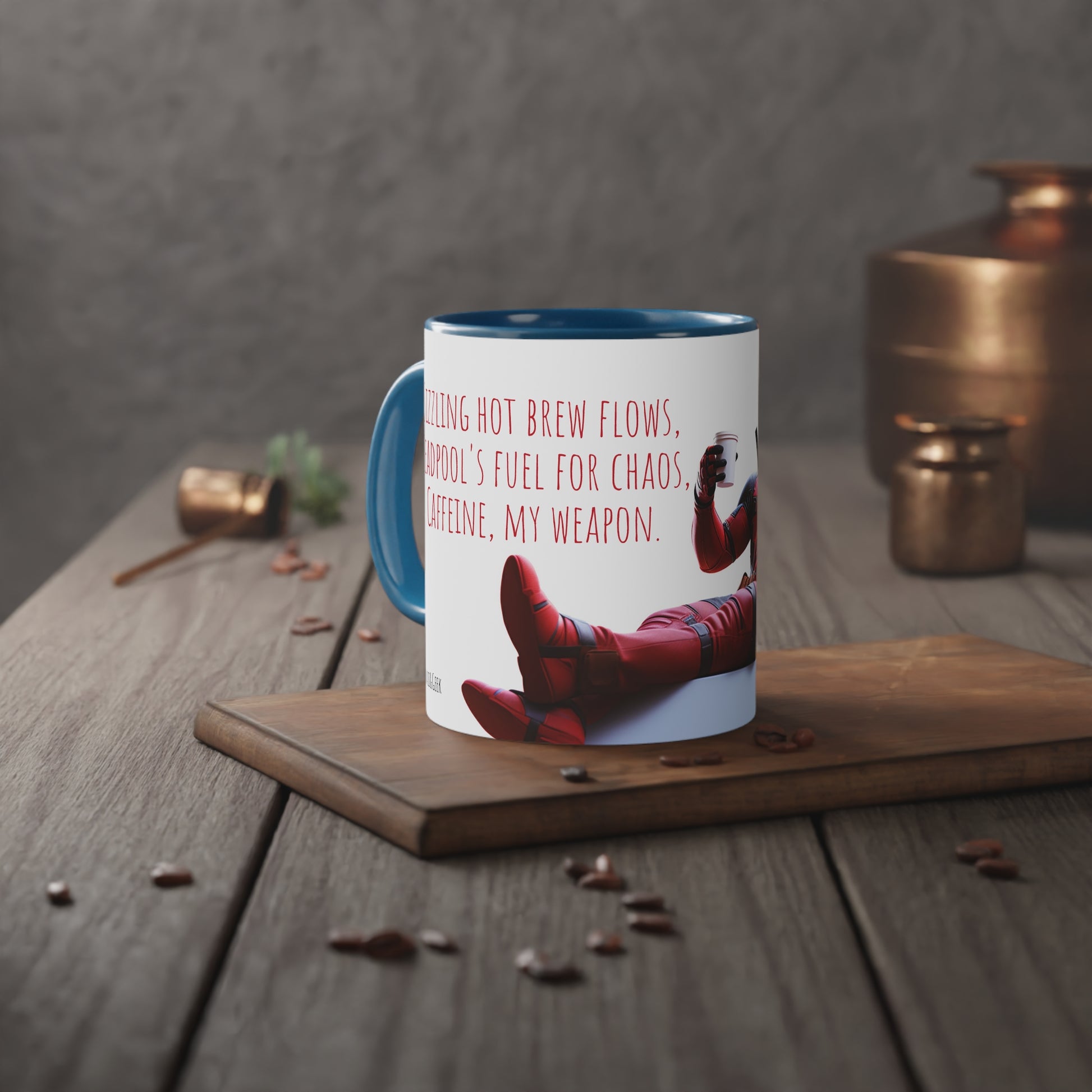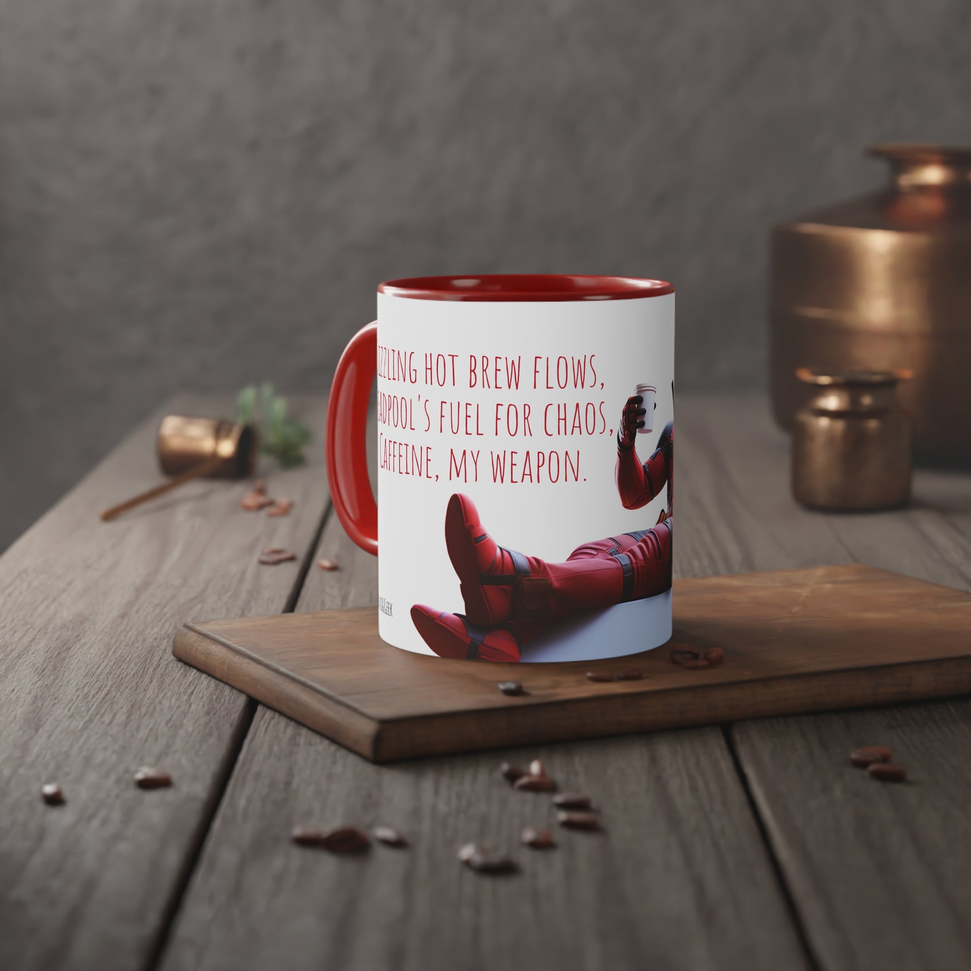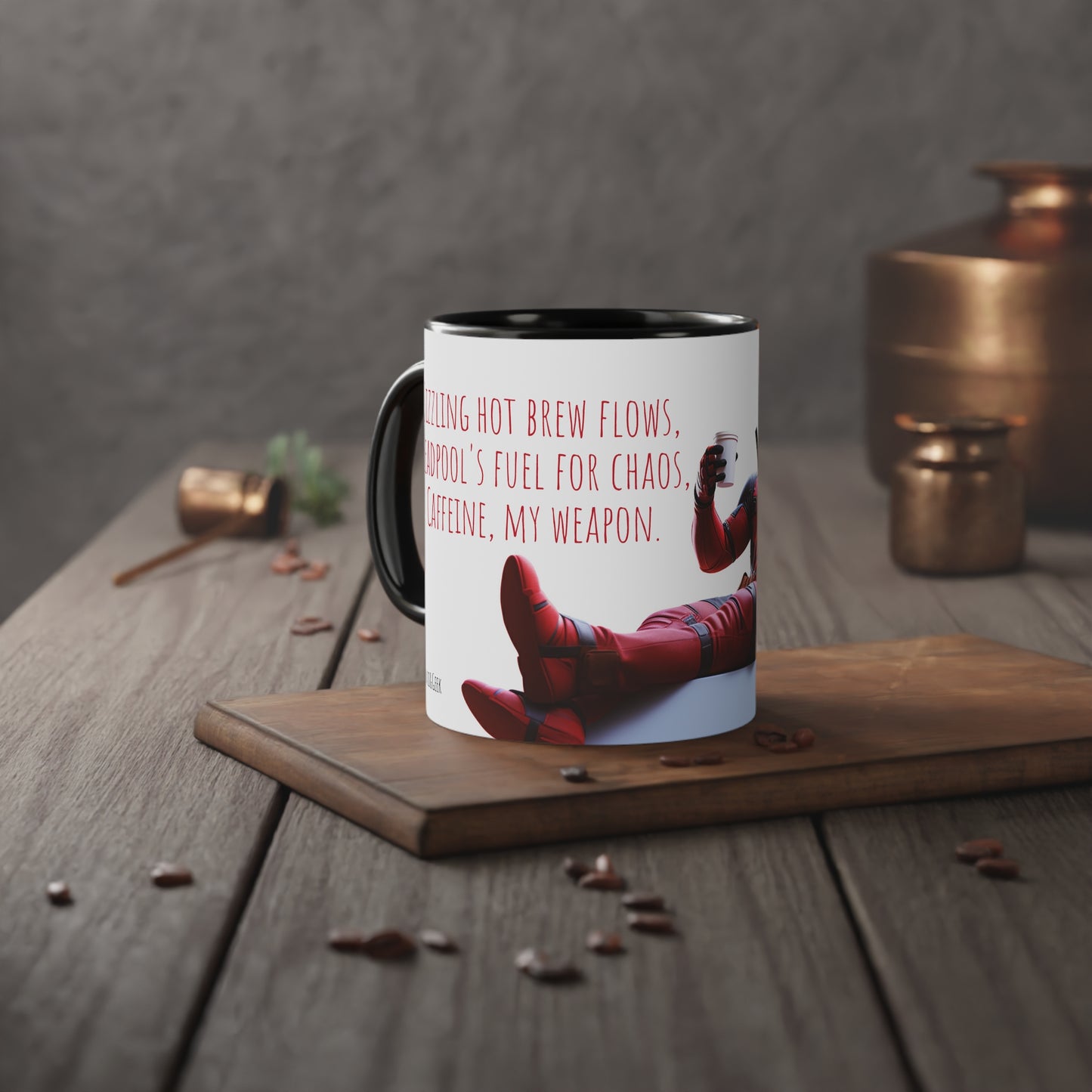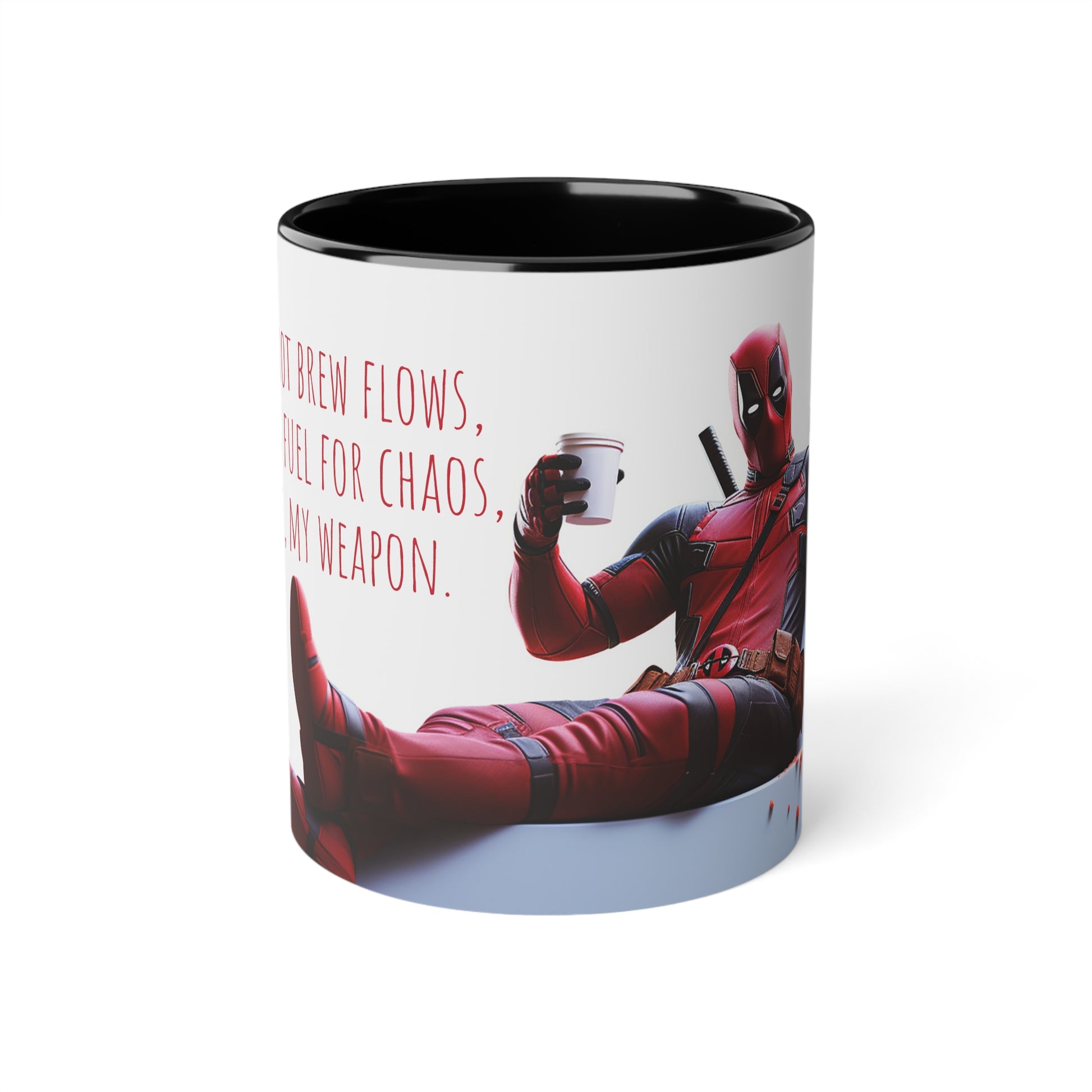 Keywords: Deadpool mug, coffee mug, chaotic days, fuel for chaos, caffeine, Merc with a Mouth, sizzling hot brew, Deadpool-inspired, coffee lovers, haiku, start your day, embrace the chaos, bring a smile.