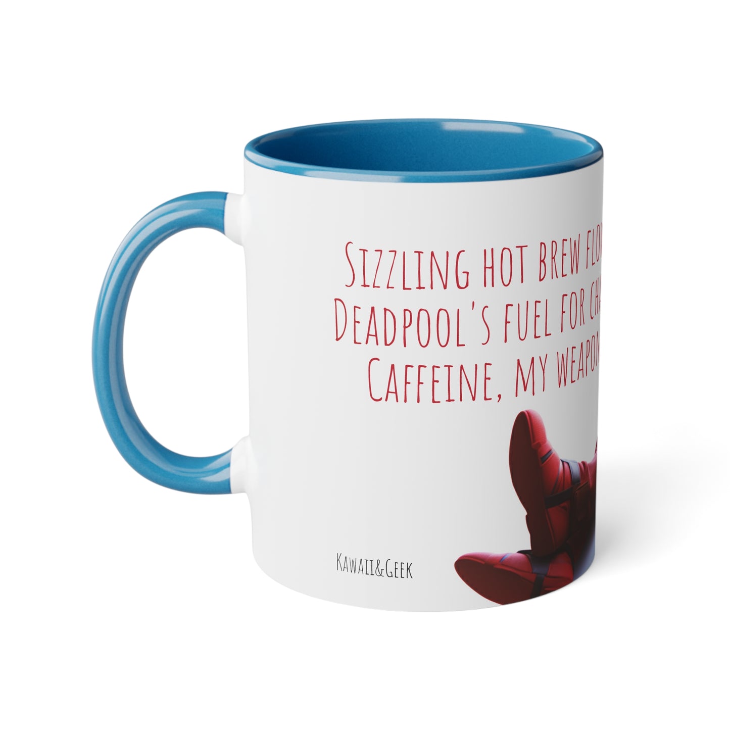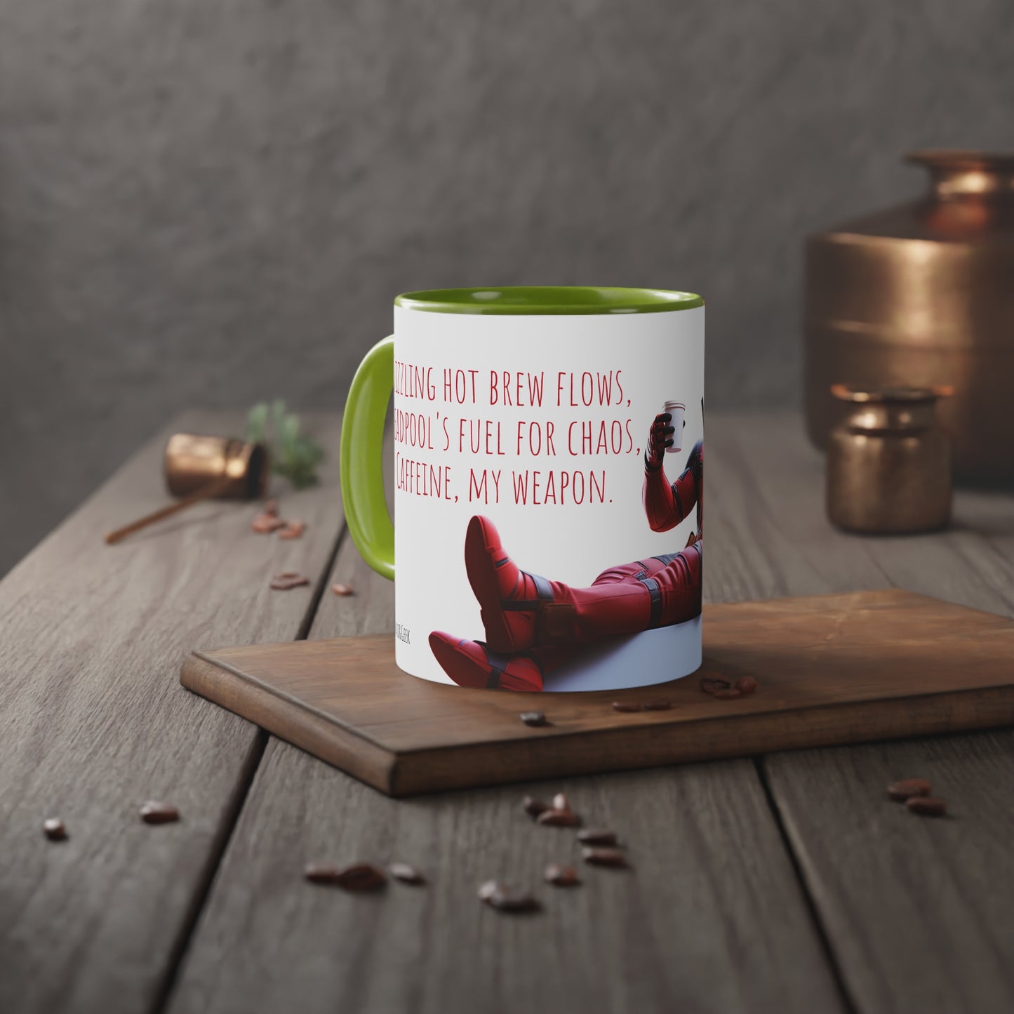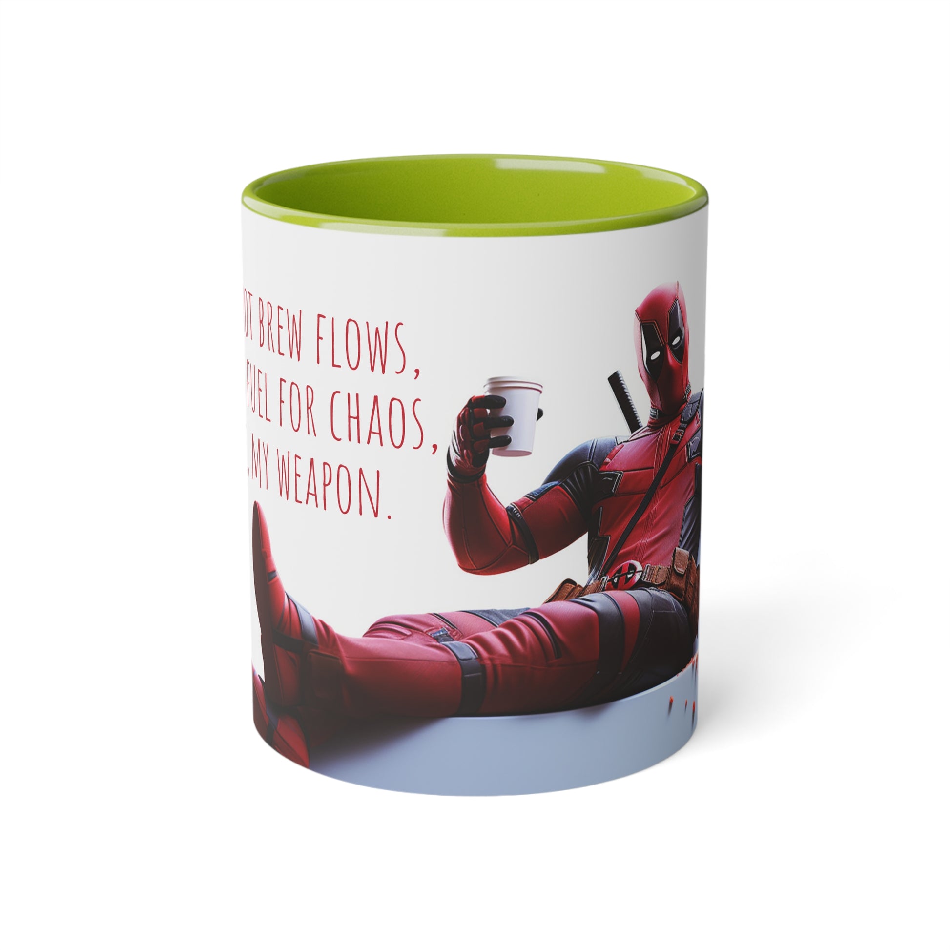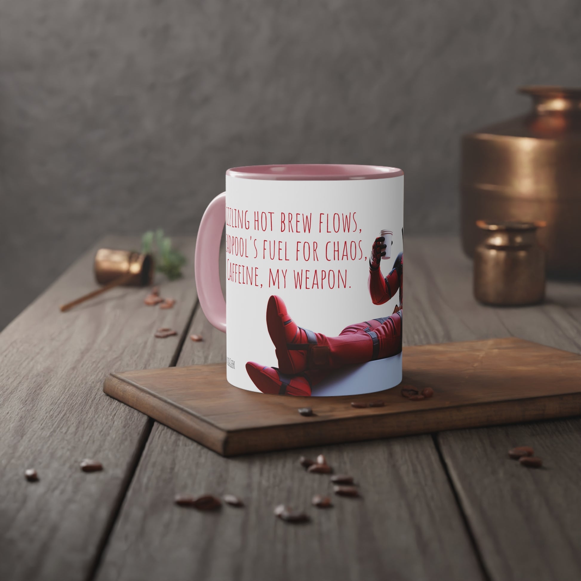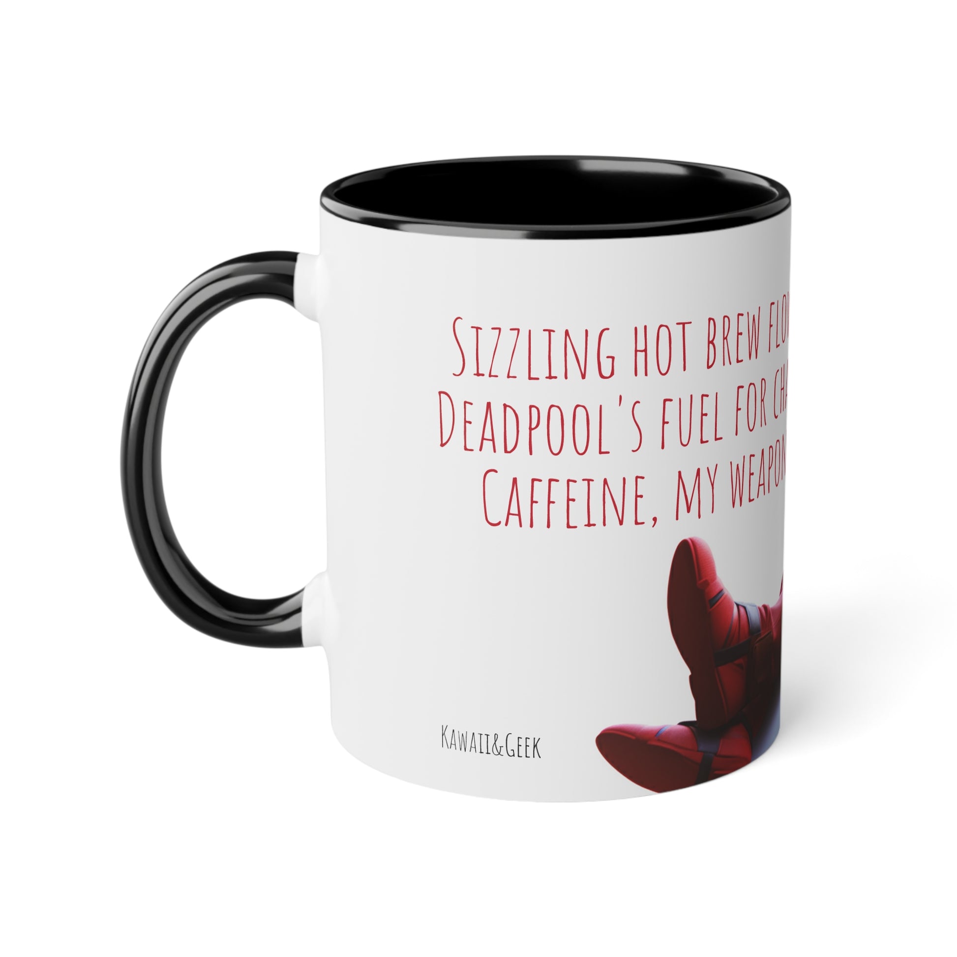 Keywords: Deadpool mug, coffee mug, chaotic days, fuel for chaos, caffeine, Merc with a Mouth, sizzling hot brew, Deadpool-inspired, coffee lovers, haiku, start your day, embrace the chaos, bring a smile.