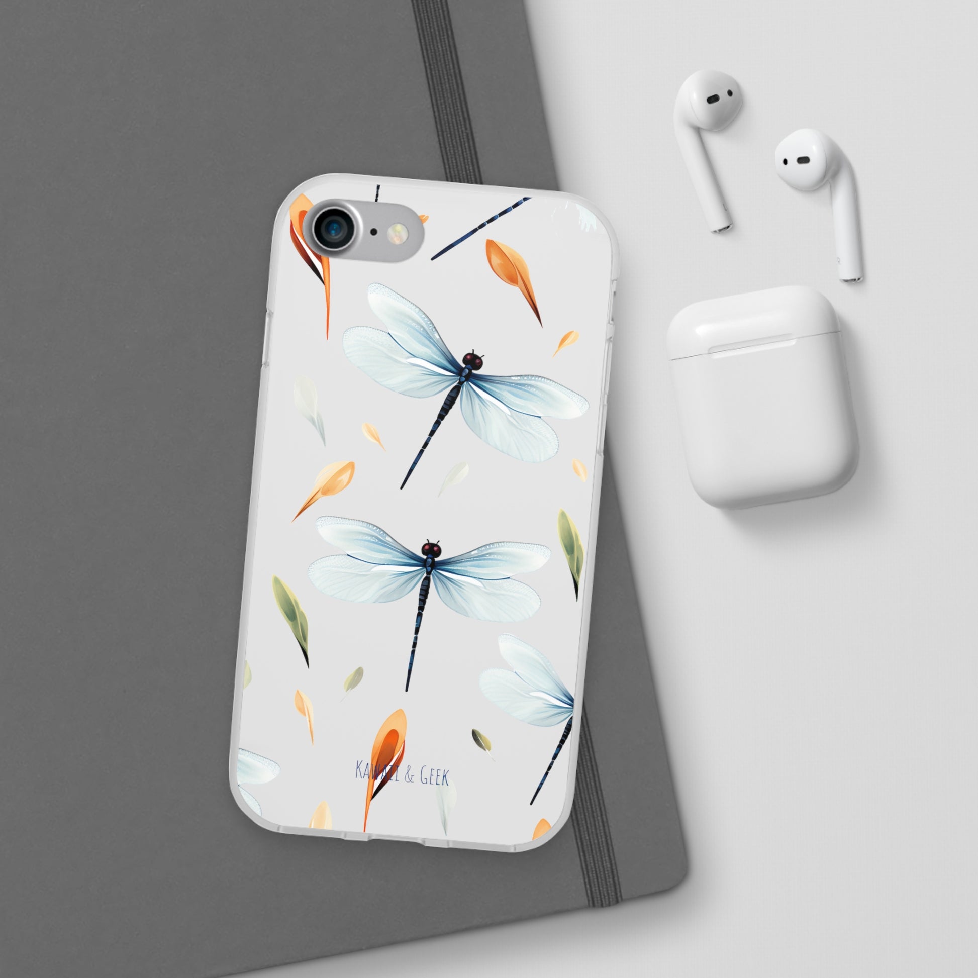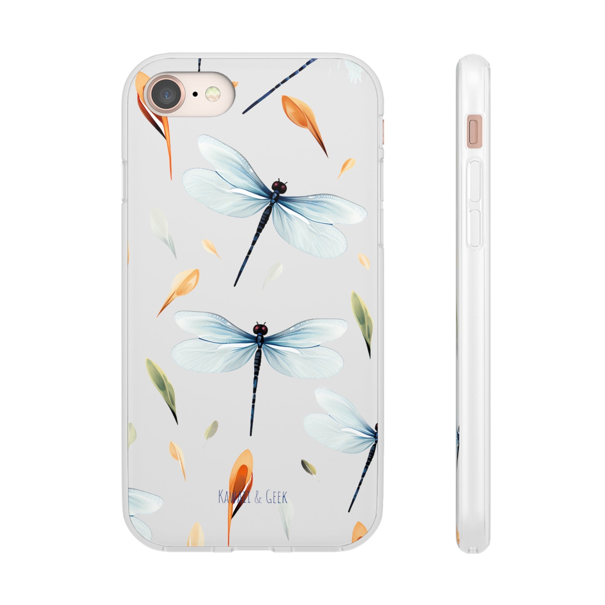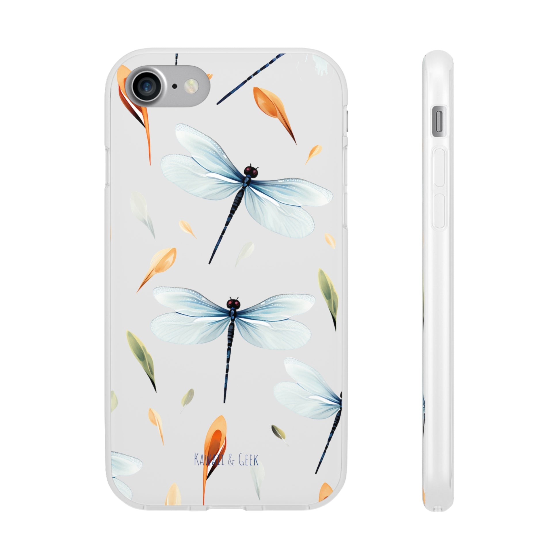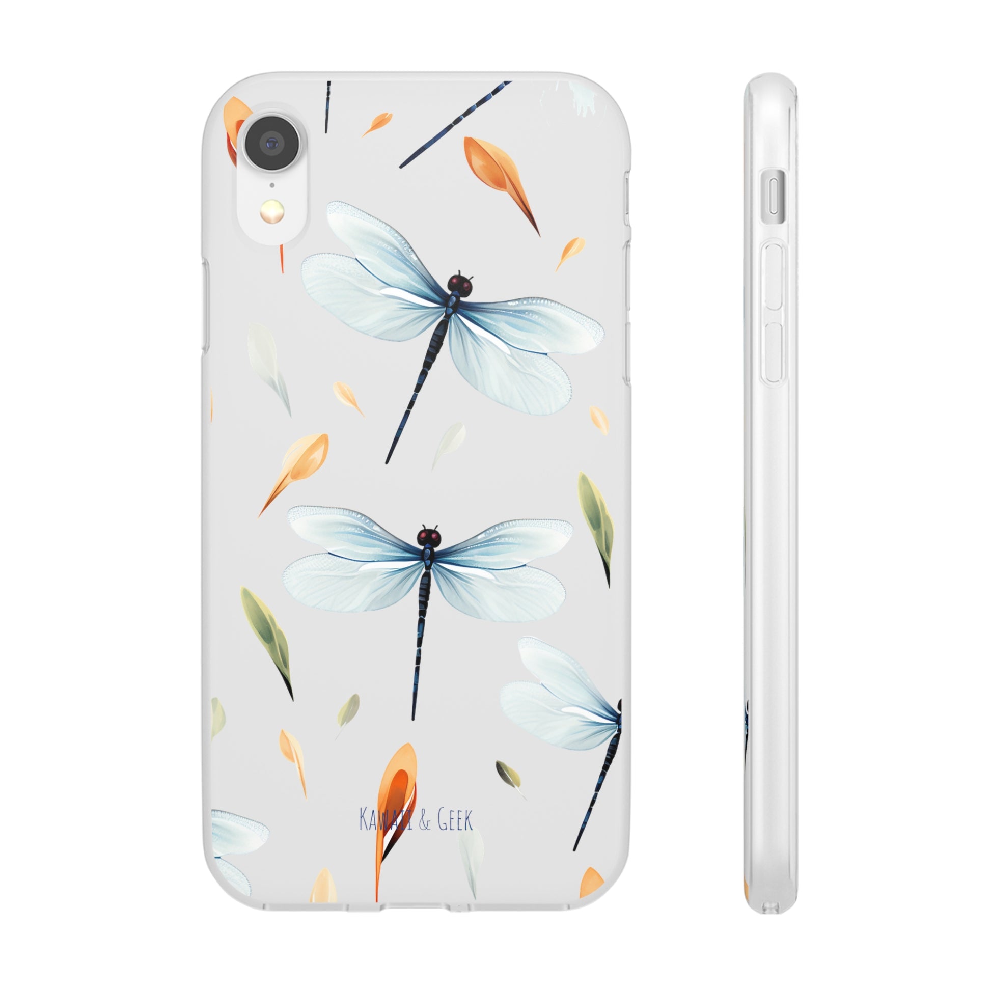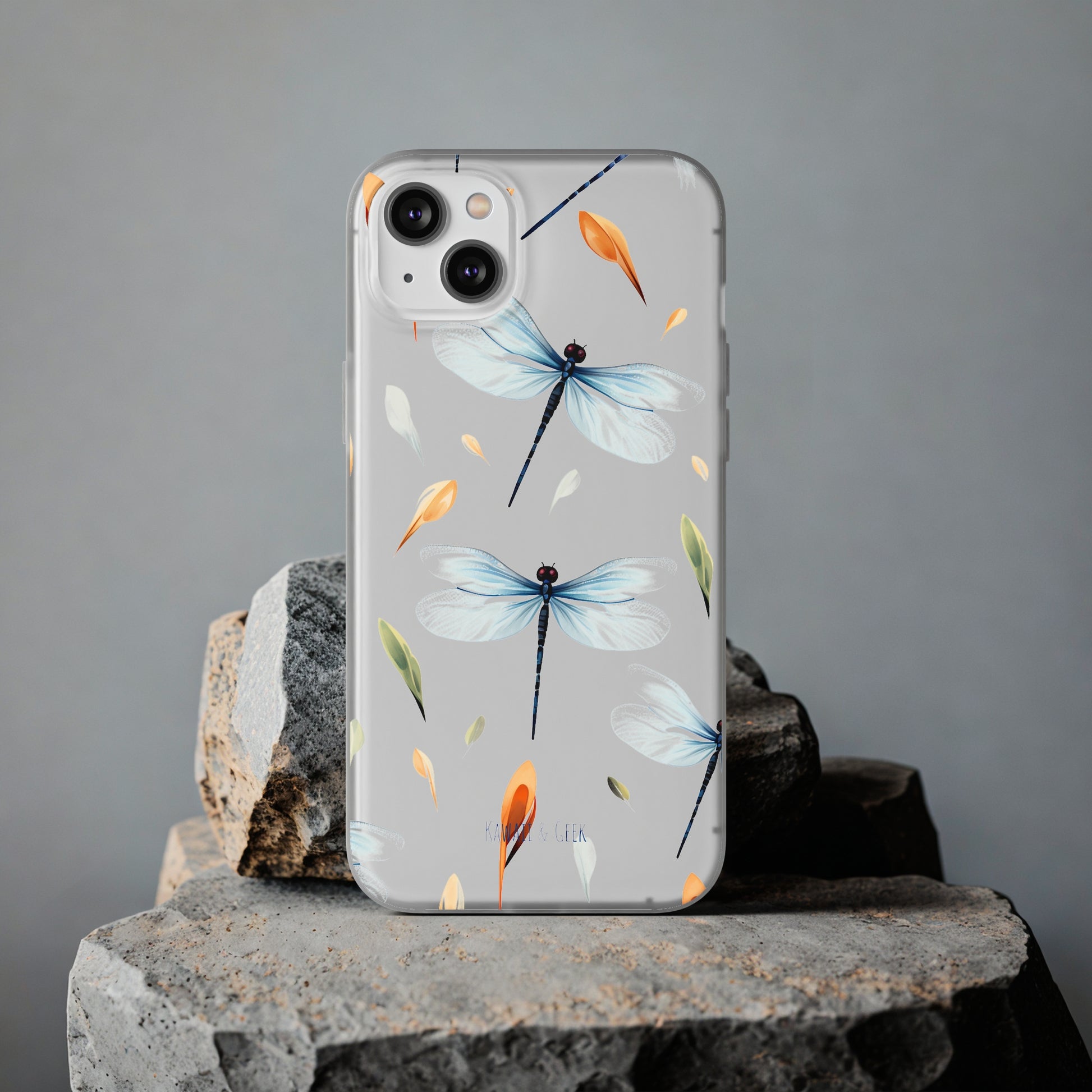 Keywords: Dragonfly design, Flexi case, Transparent cover, Ethereal style, Nature inspired, Lightweight case, Phone protection, Trendy design, Nature lover, Durable material, Minimalist style, Delicate print, Insect theme.