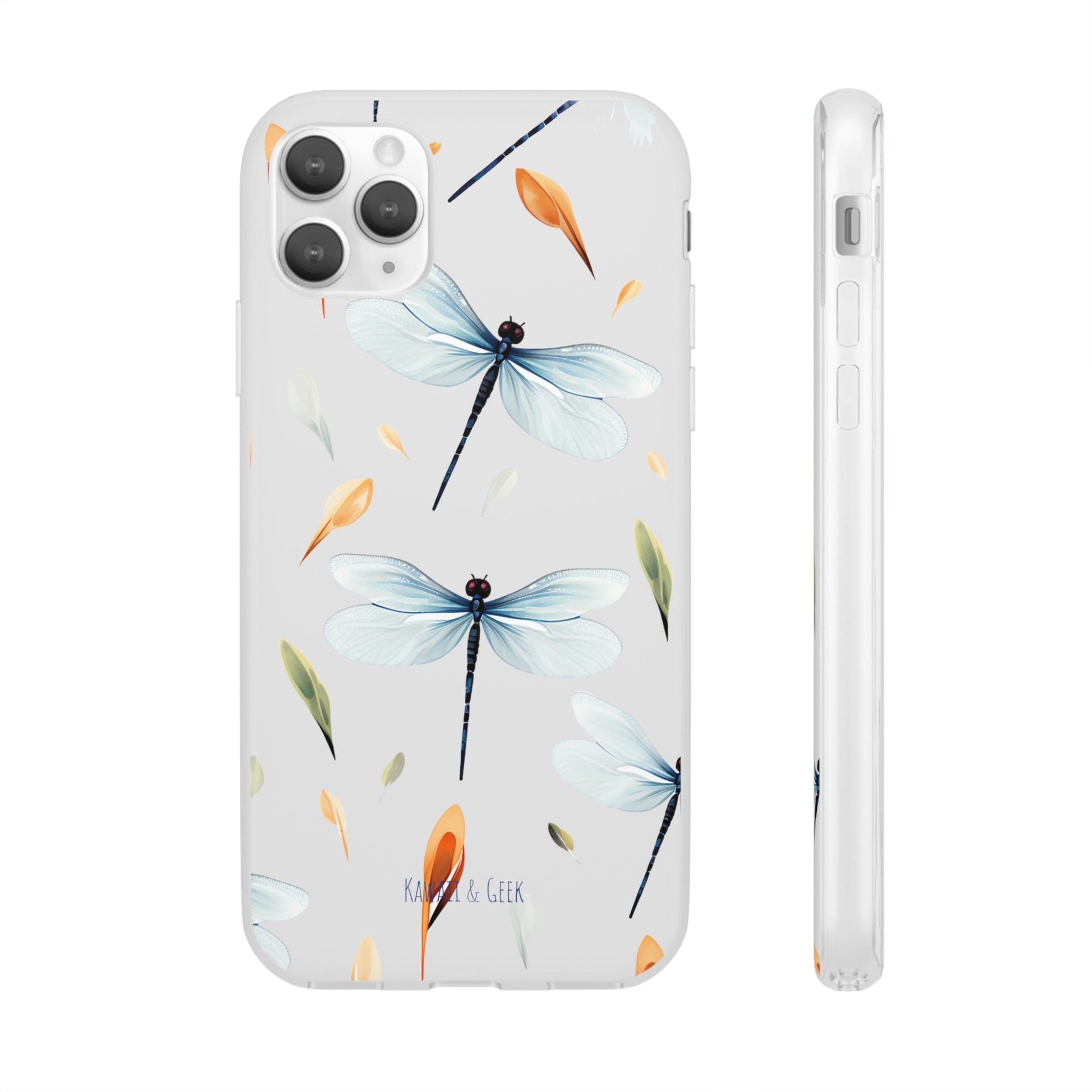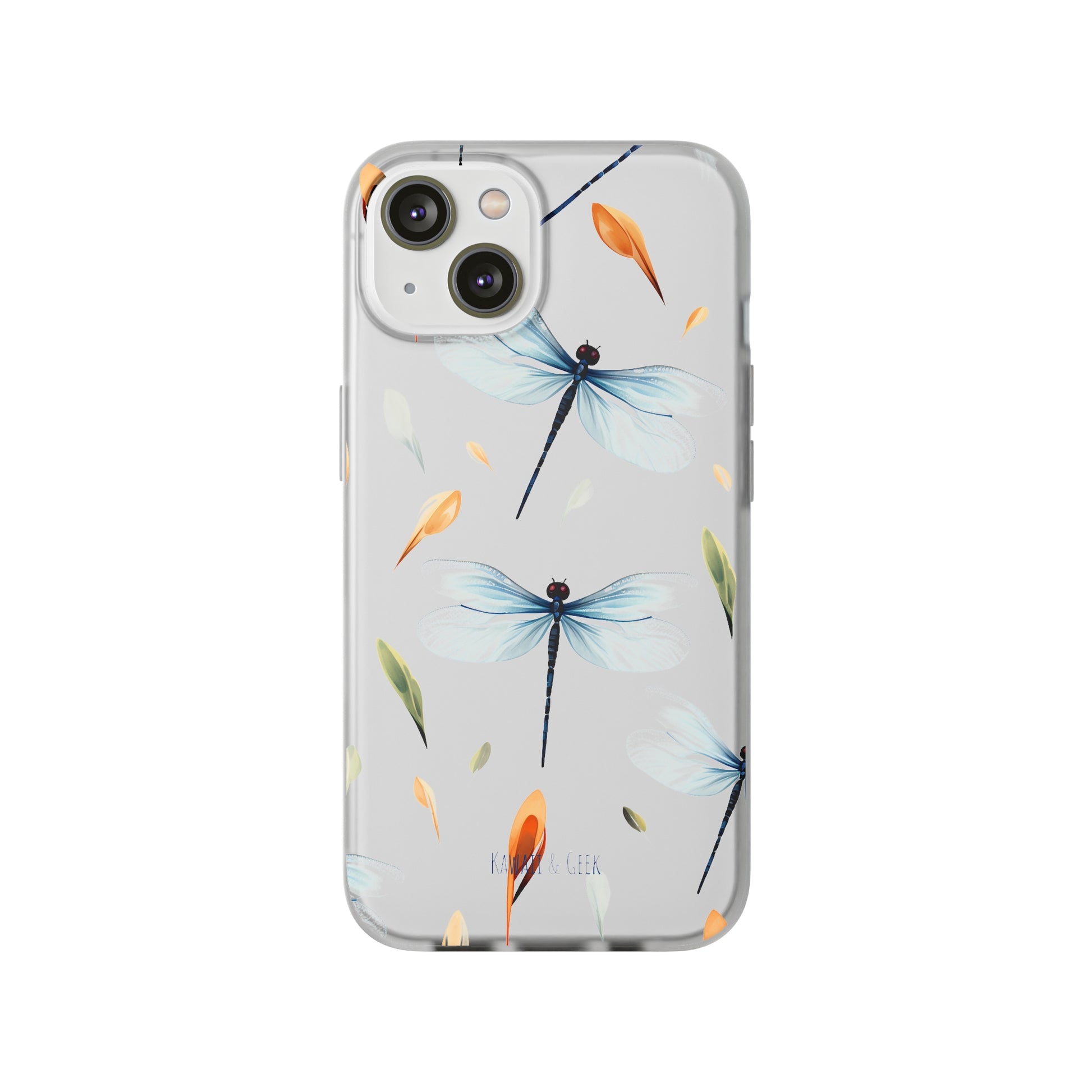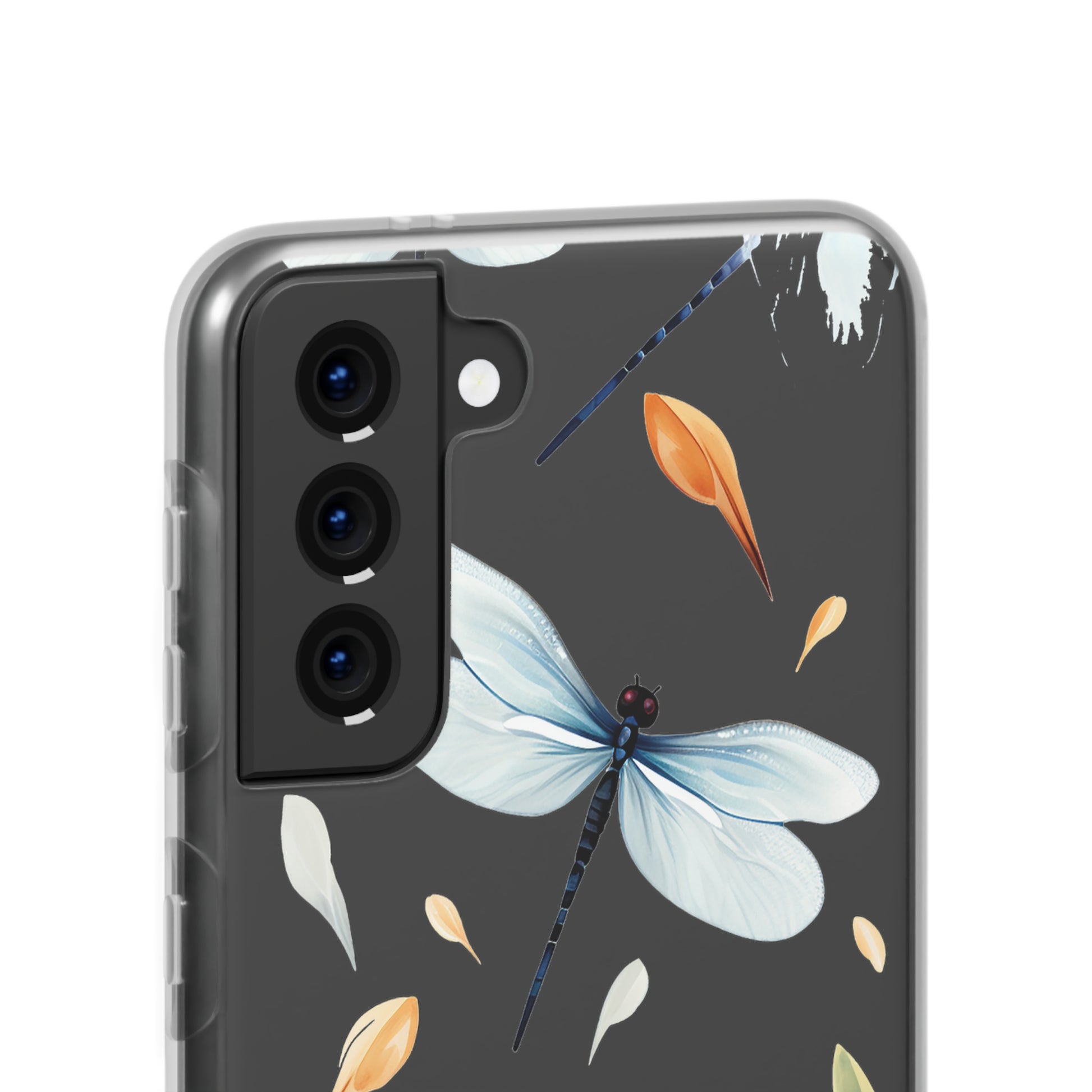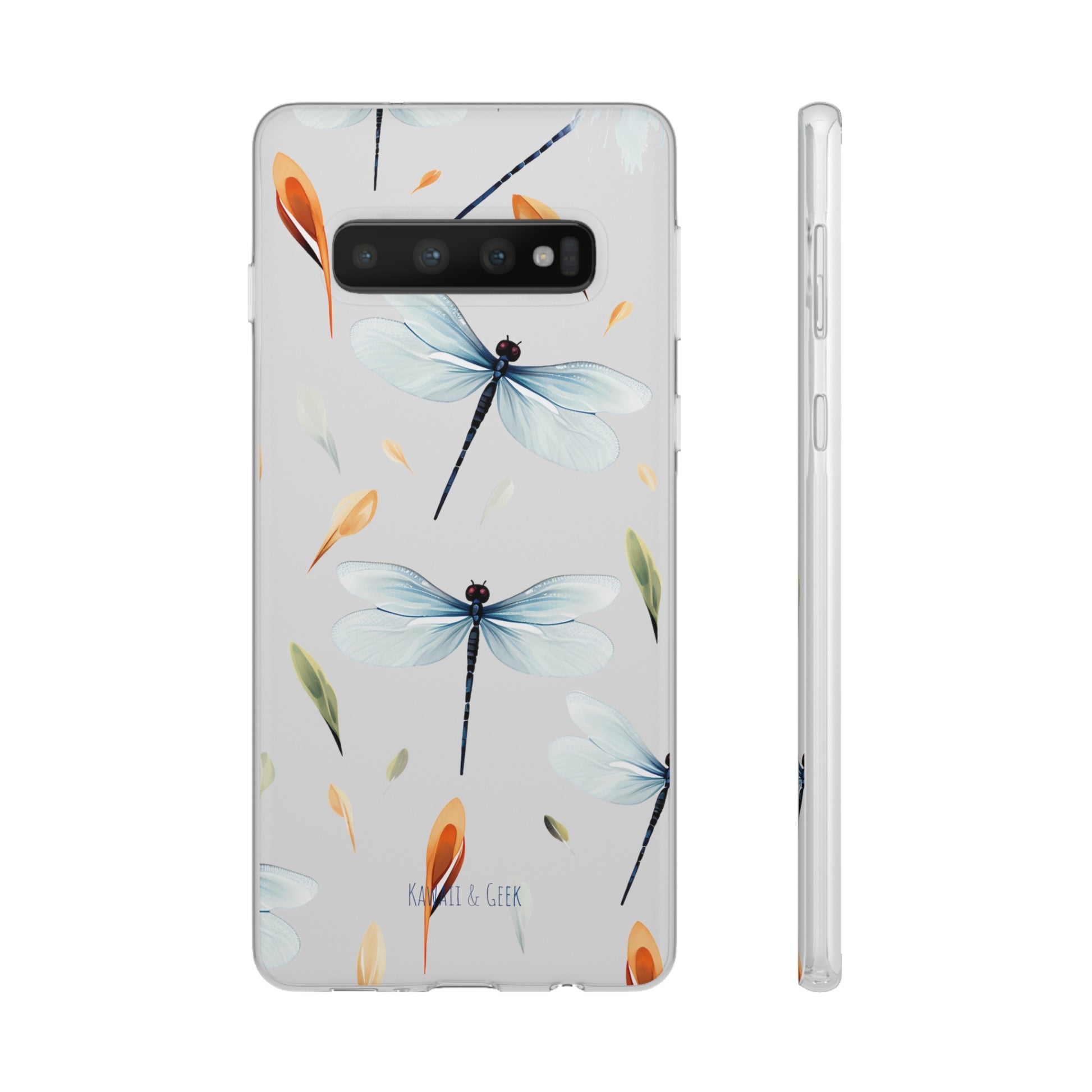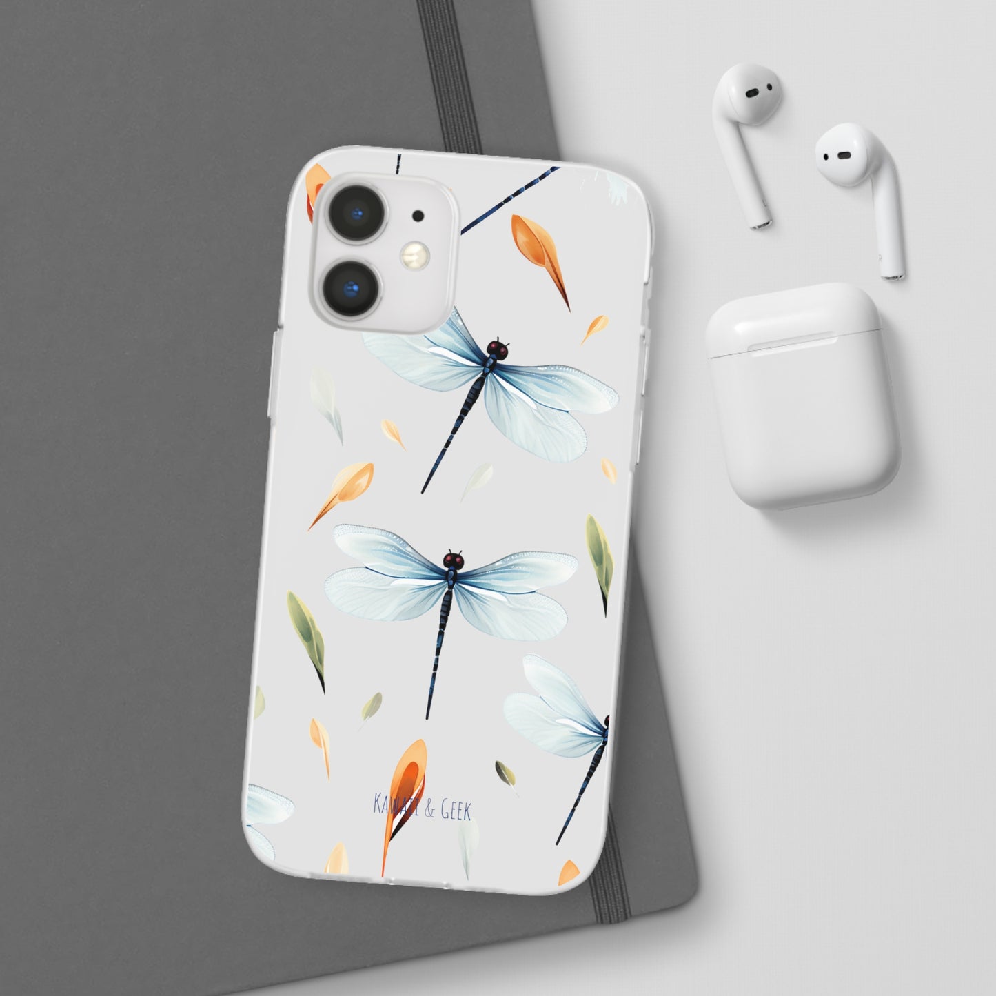 Keywords: Dragonfly design, Flexi case, Transparent cover, Ethereal style, Nature inspired, Lightweight case, Phone protection, Trendy design, Nature lover, Durable material, Minimalist style, Delicate print, Insect theme.