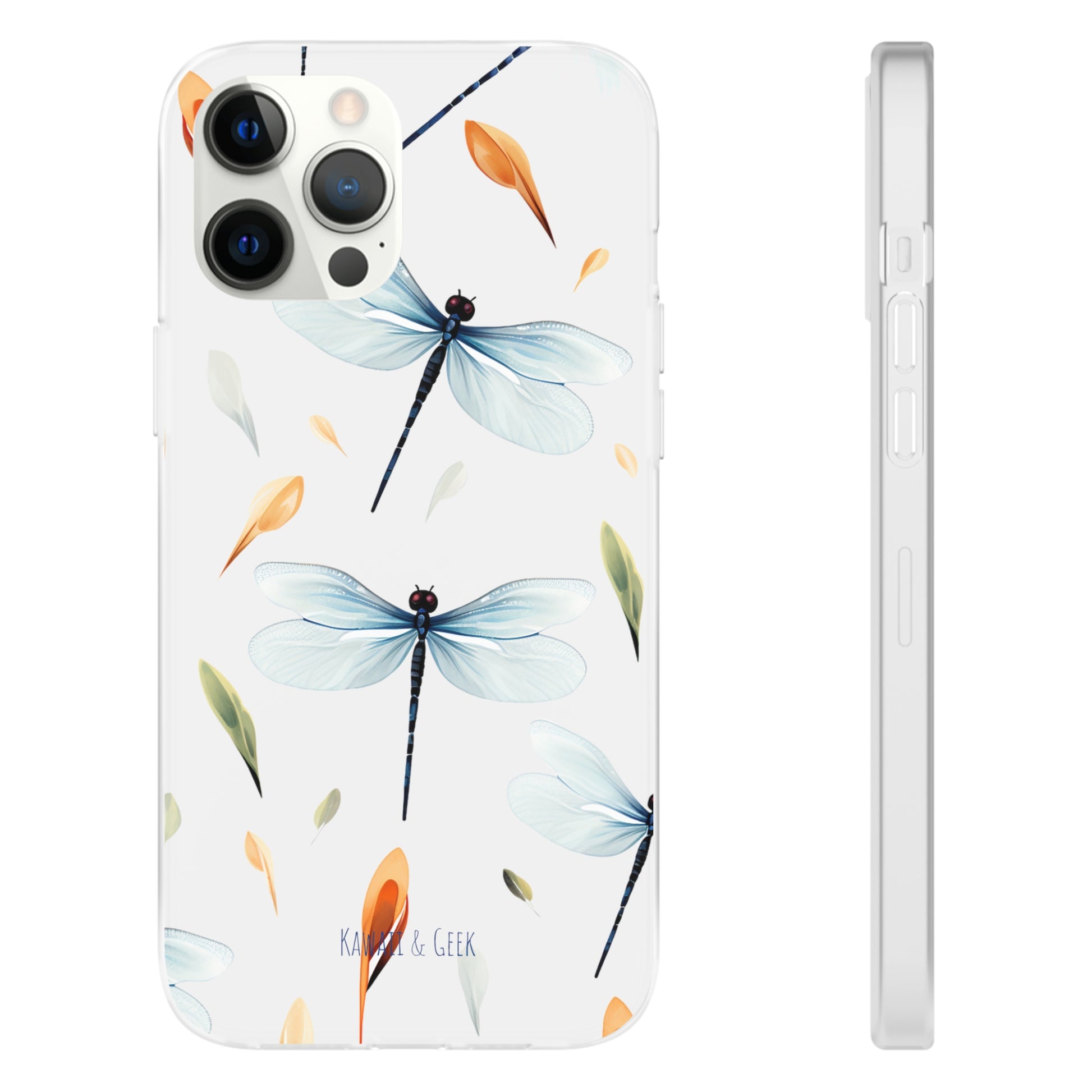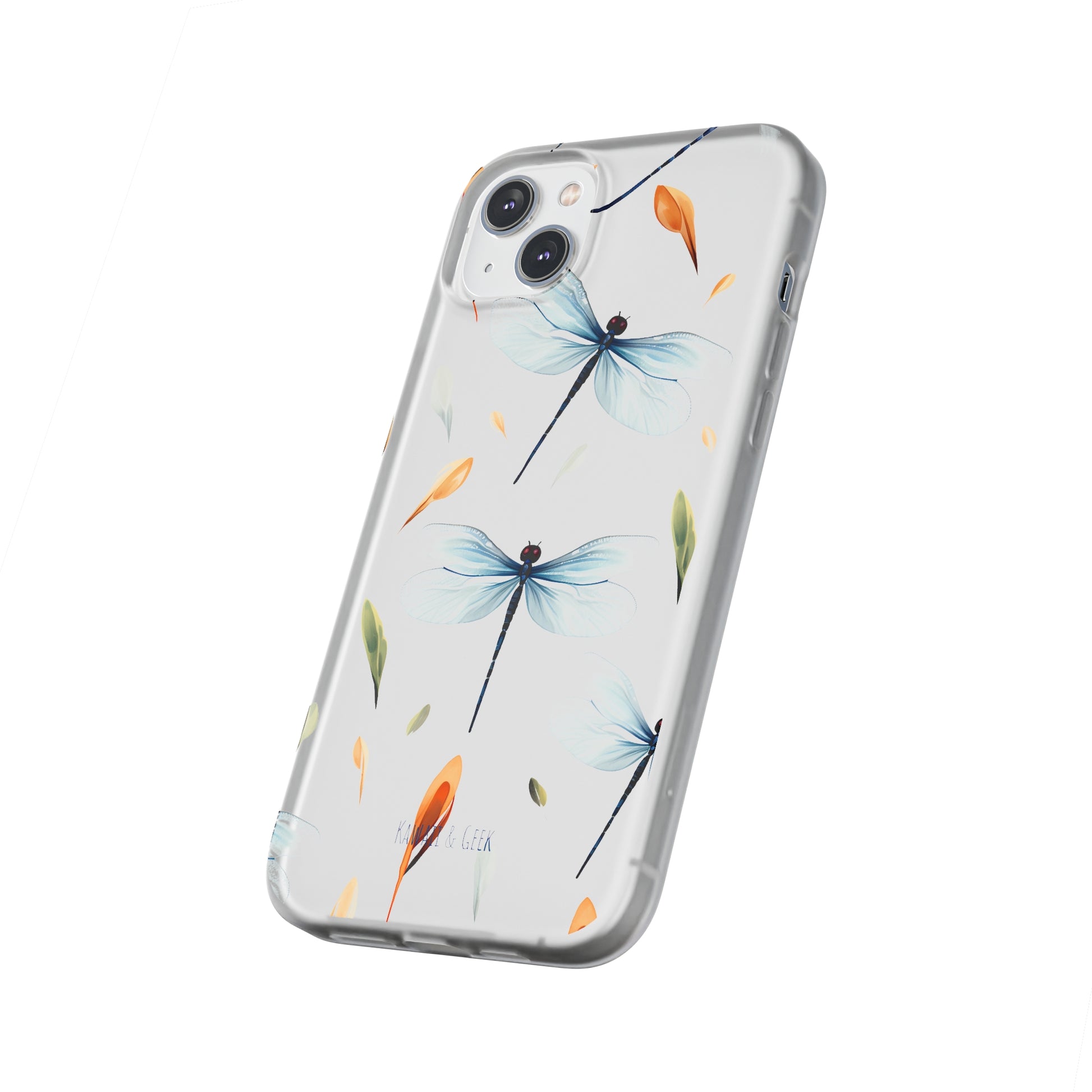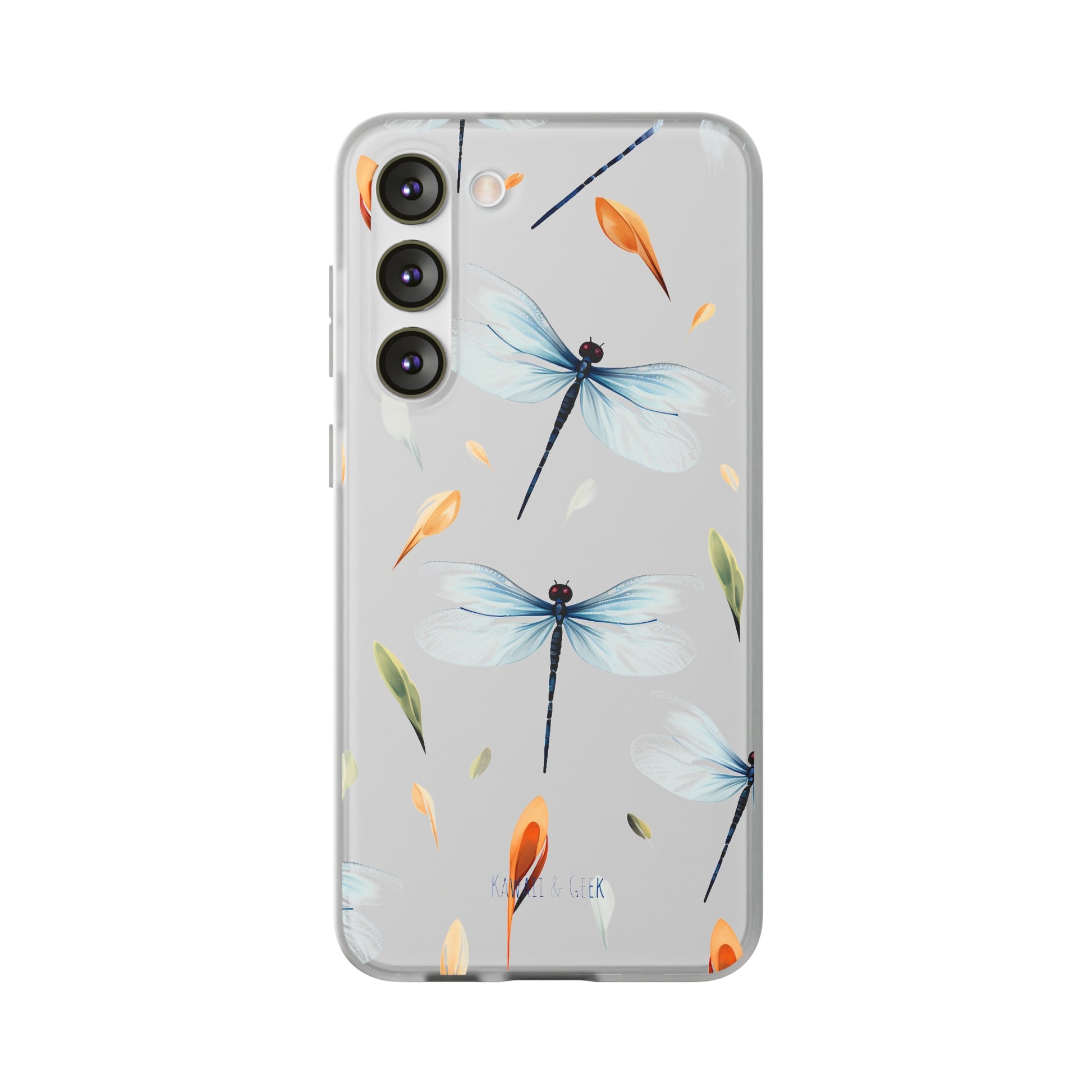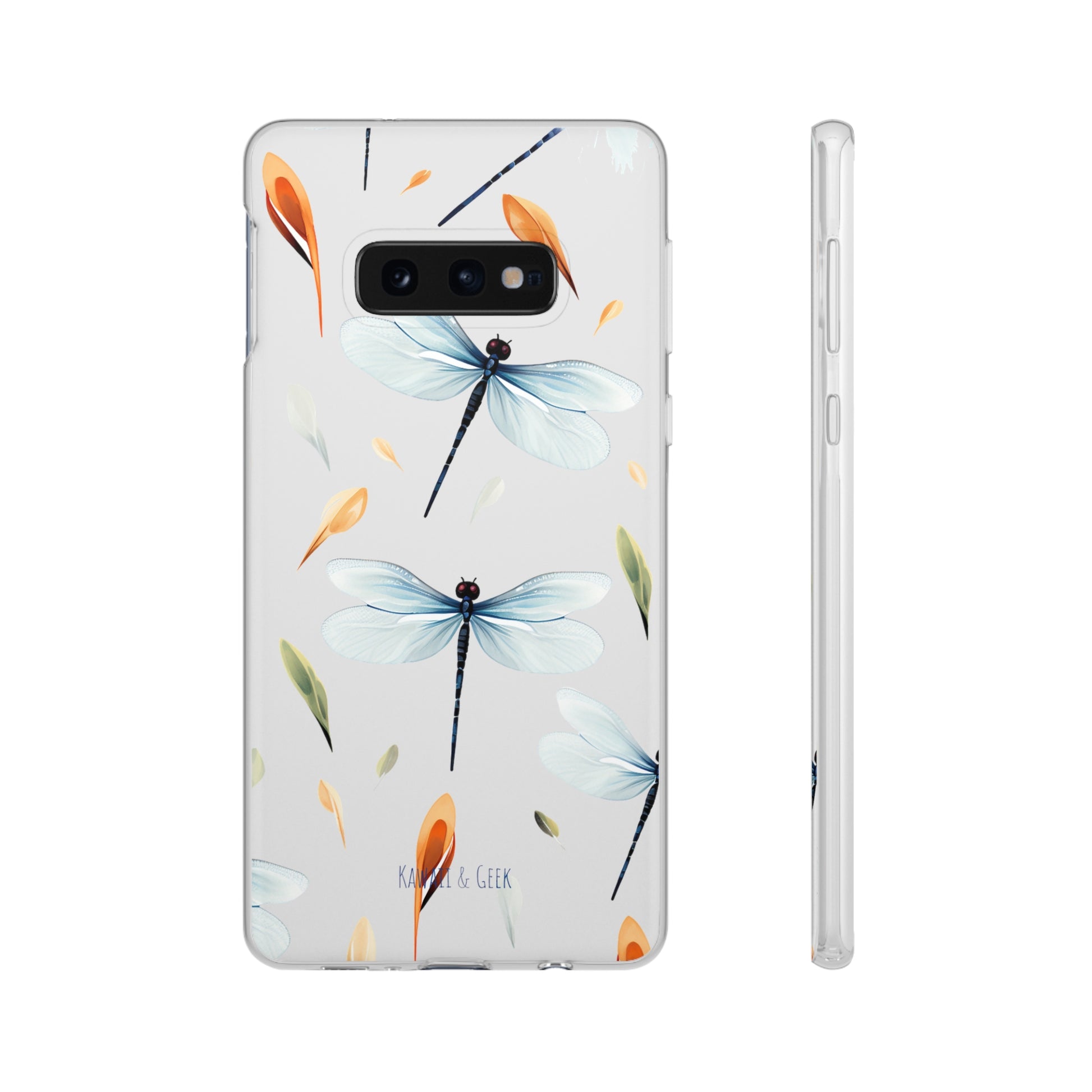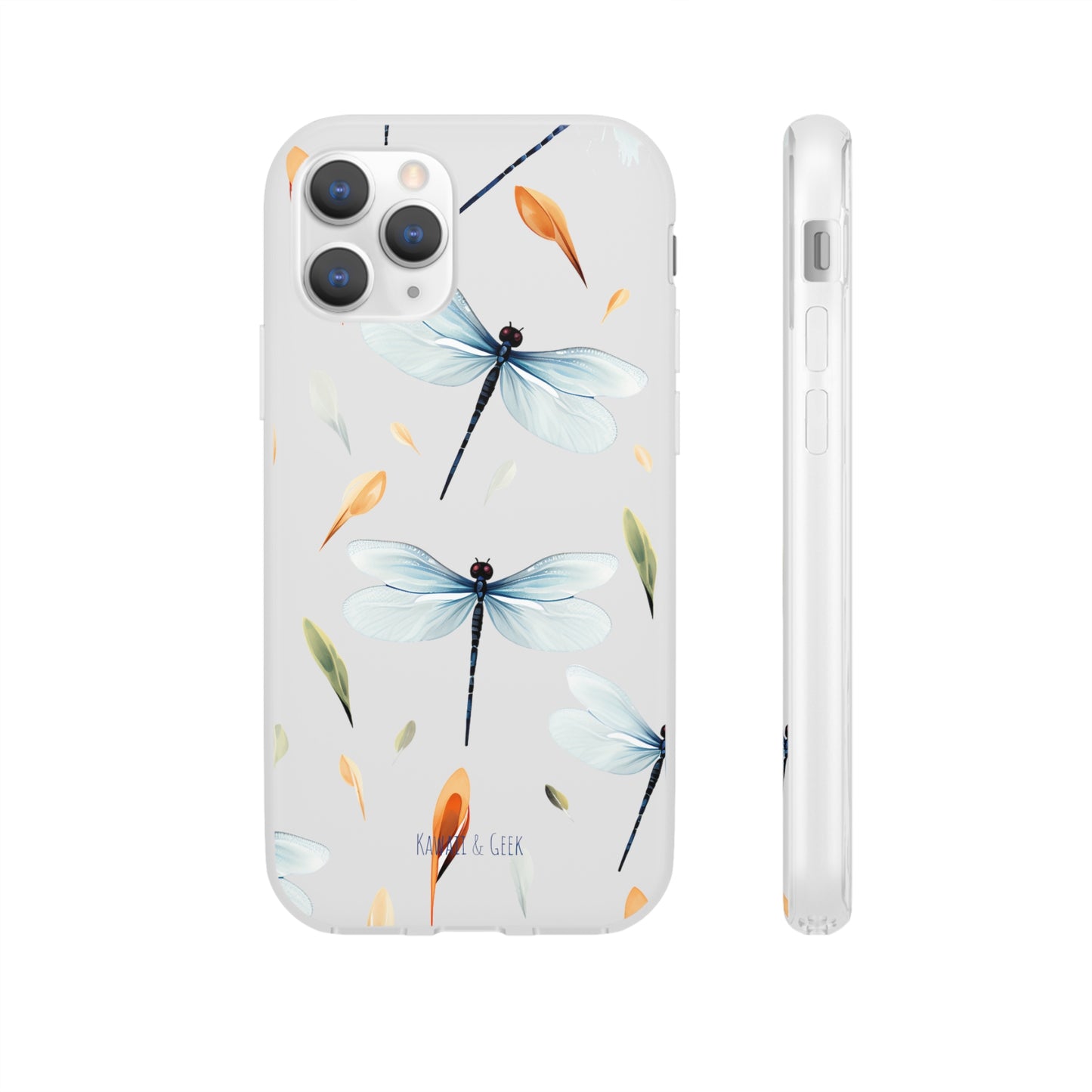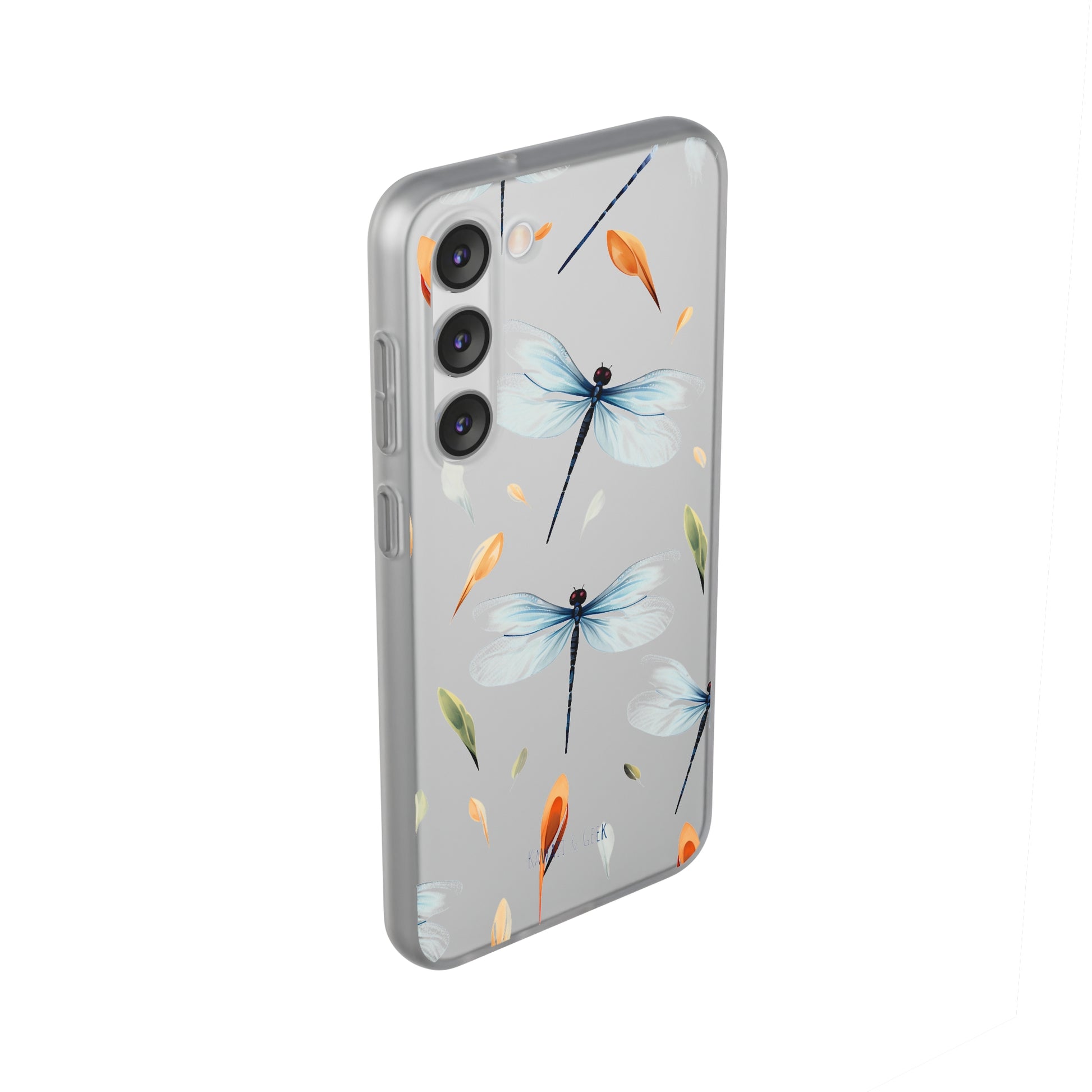 Keywords: Dragonfly design, Flexi case, Transparent cover, Ethereal style, Nature inspired, Lightweight case, Phone protection, Trendy design, Nature lover, Durable material, Minimalist style, Delicate print, Insect theme.