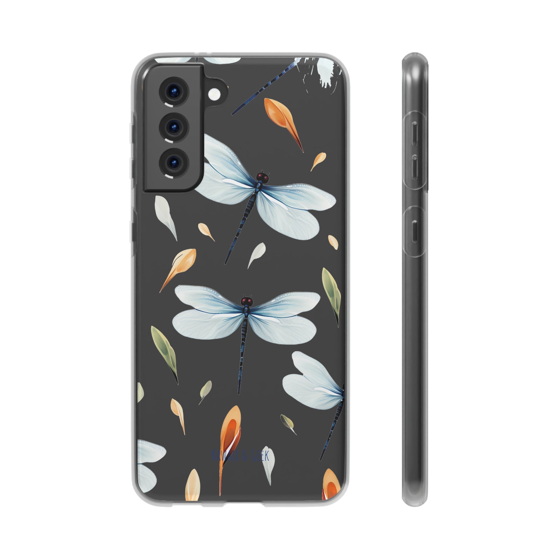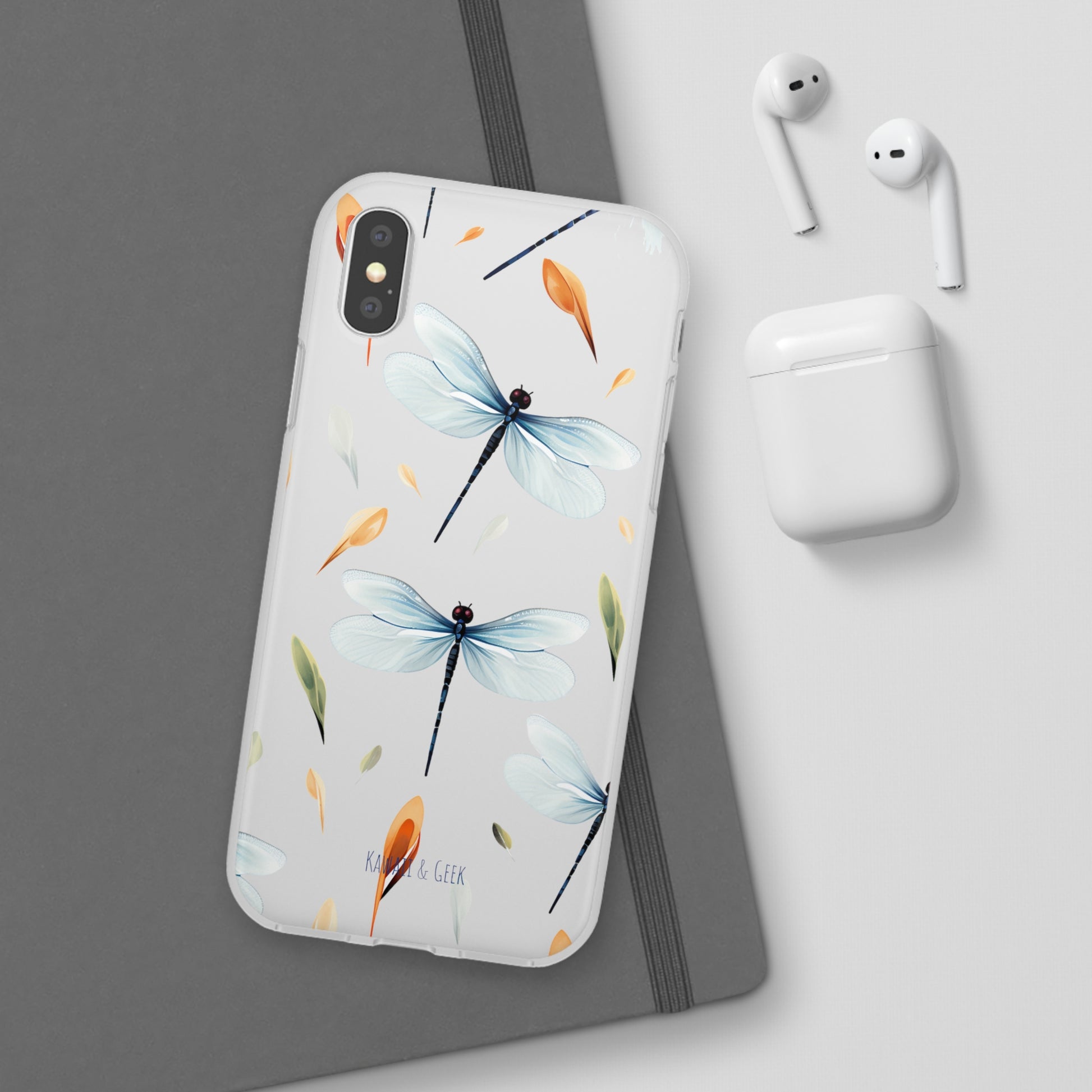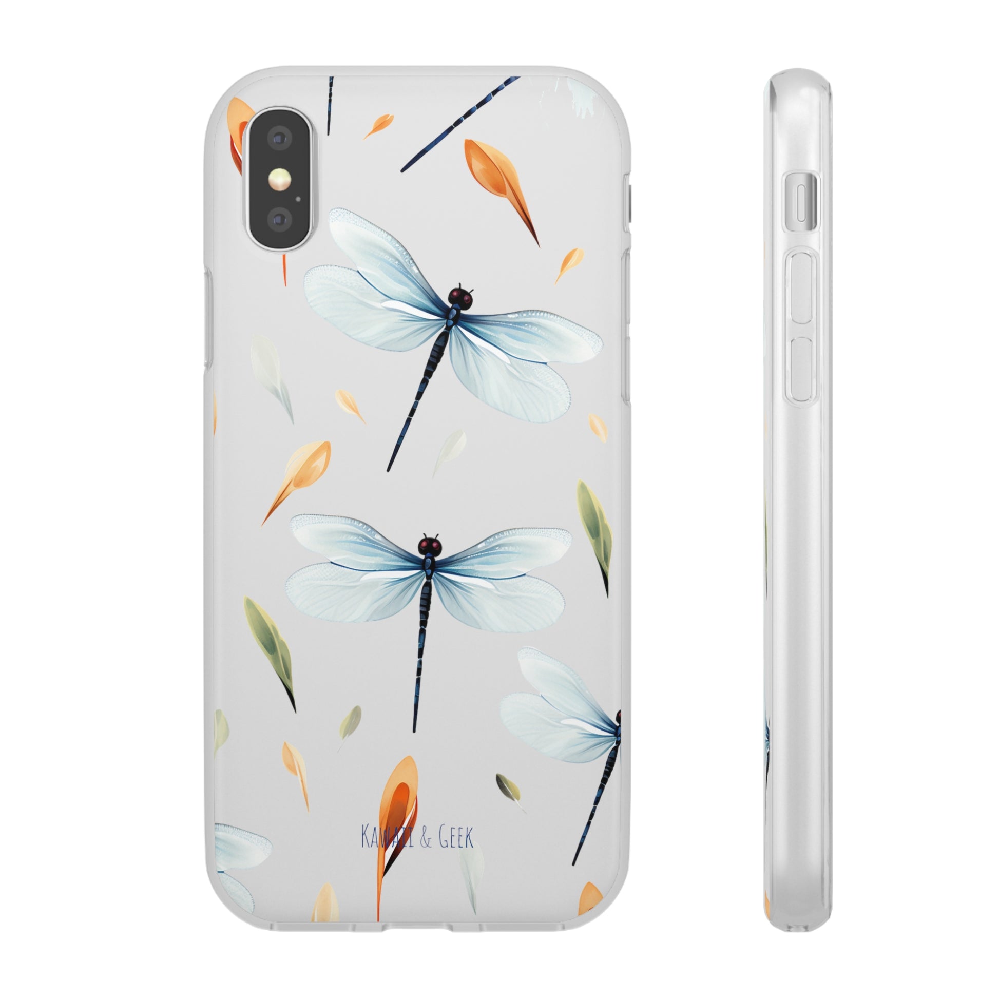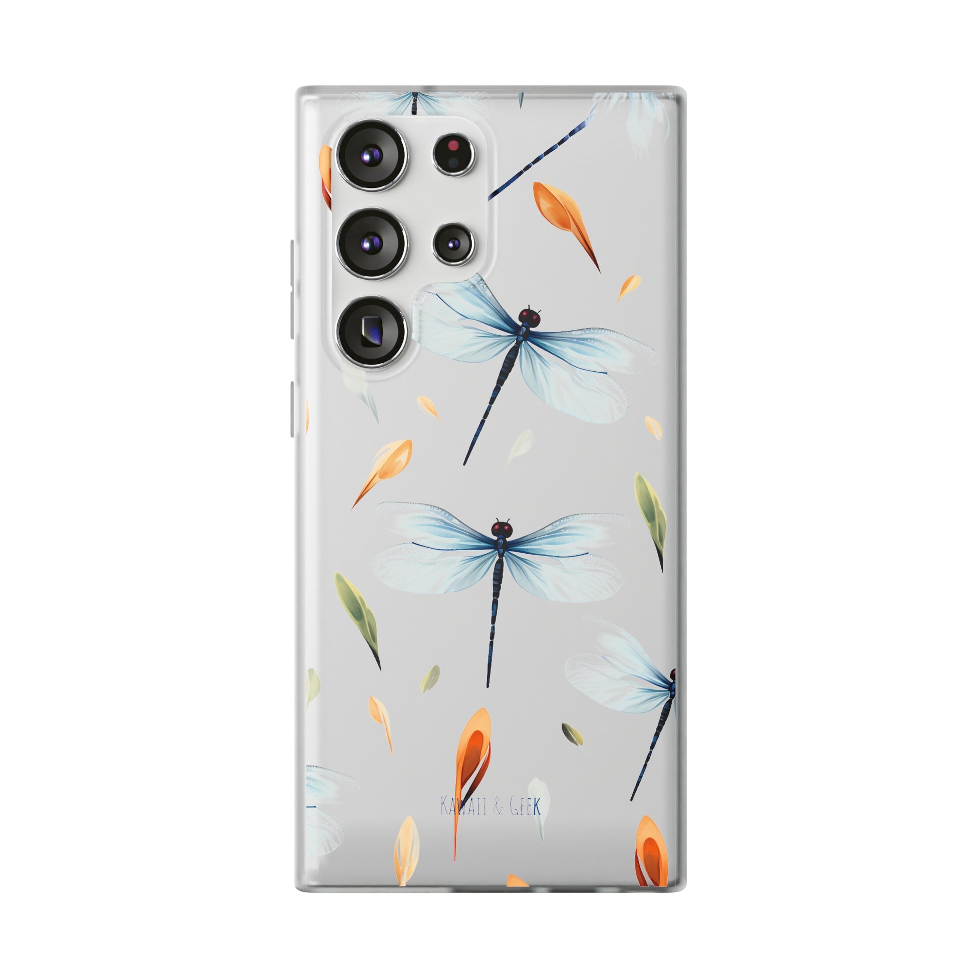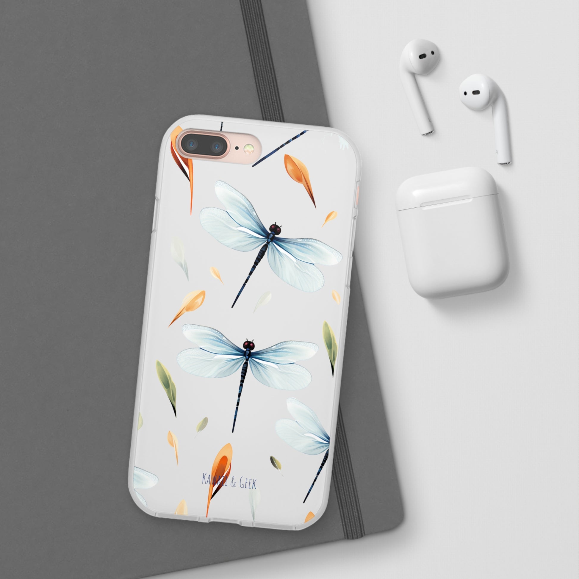 Keywords: Dragonfly design, Flexi case, Transparent cover, Ethereal style, Nature inspired, Lightweight case, Phone protection, Trendy design, Nature lover, Durable material, Minimalist style, Delicate print, Insect theme.