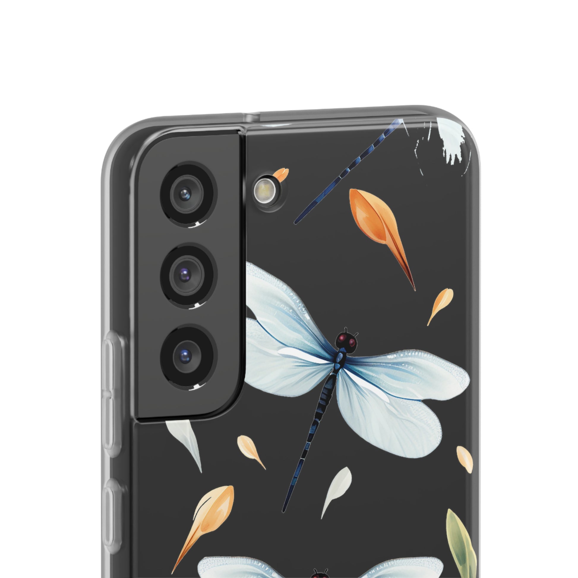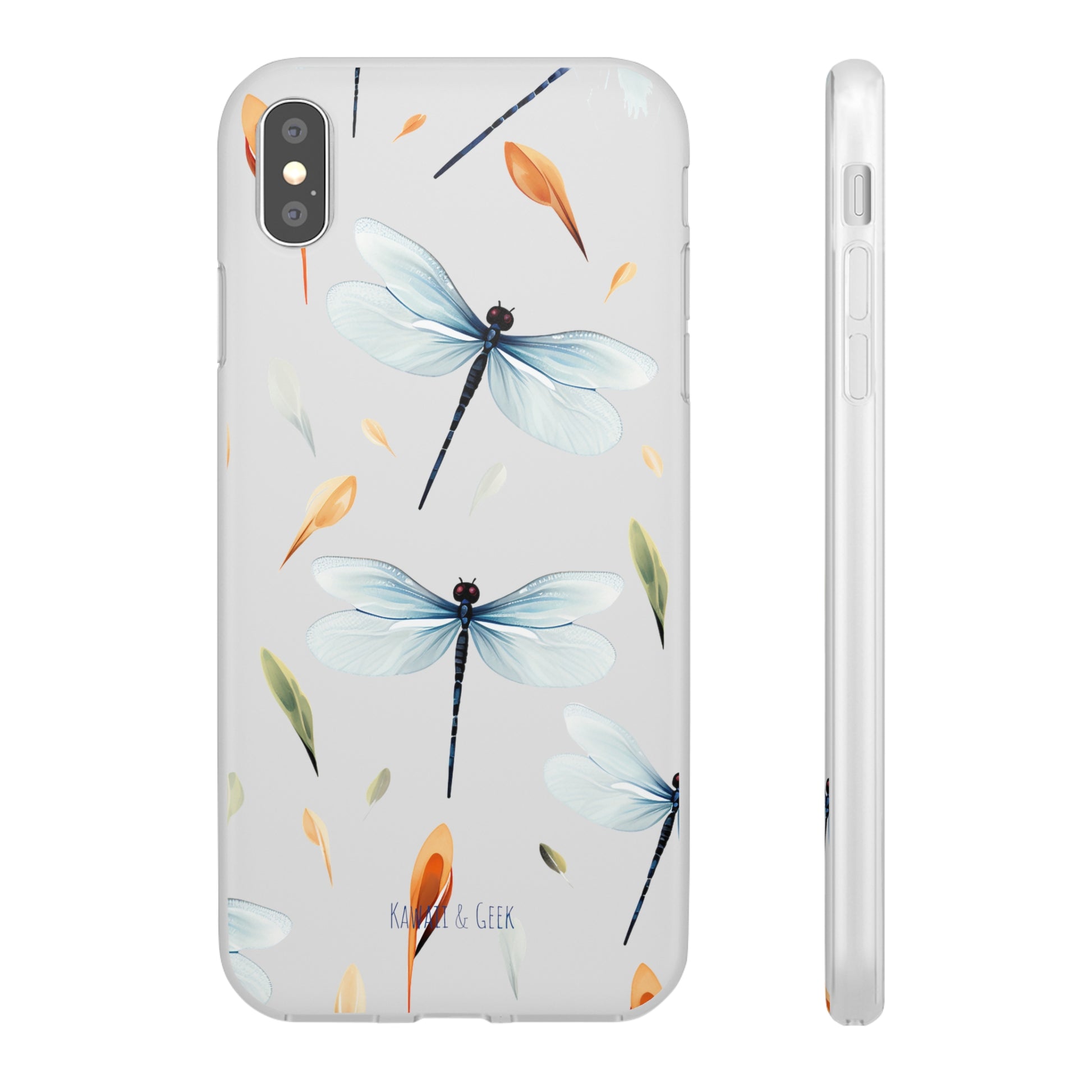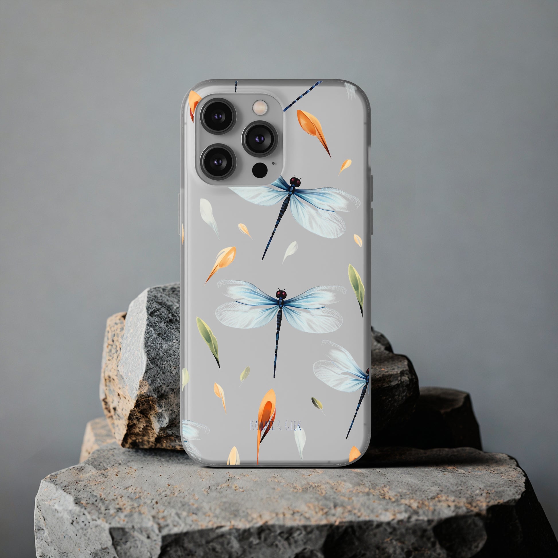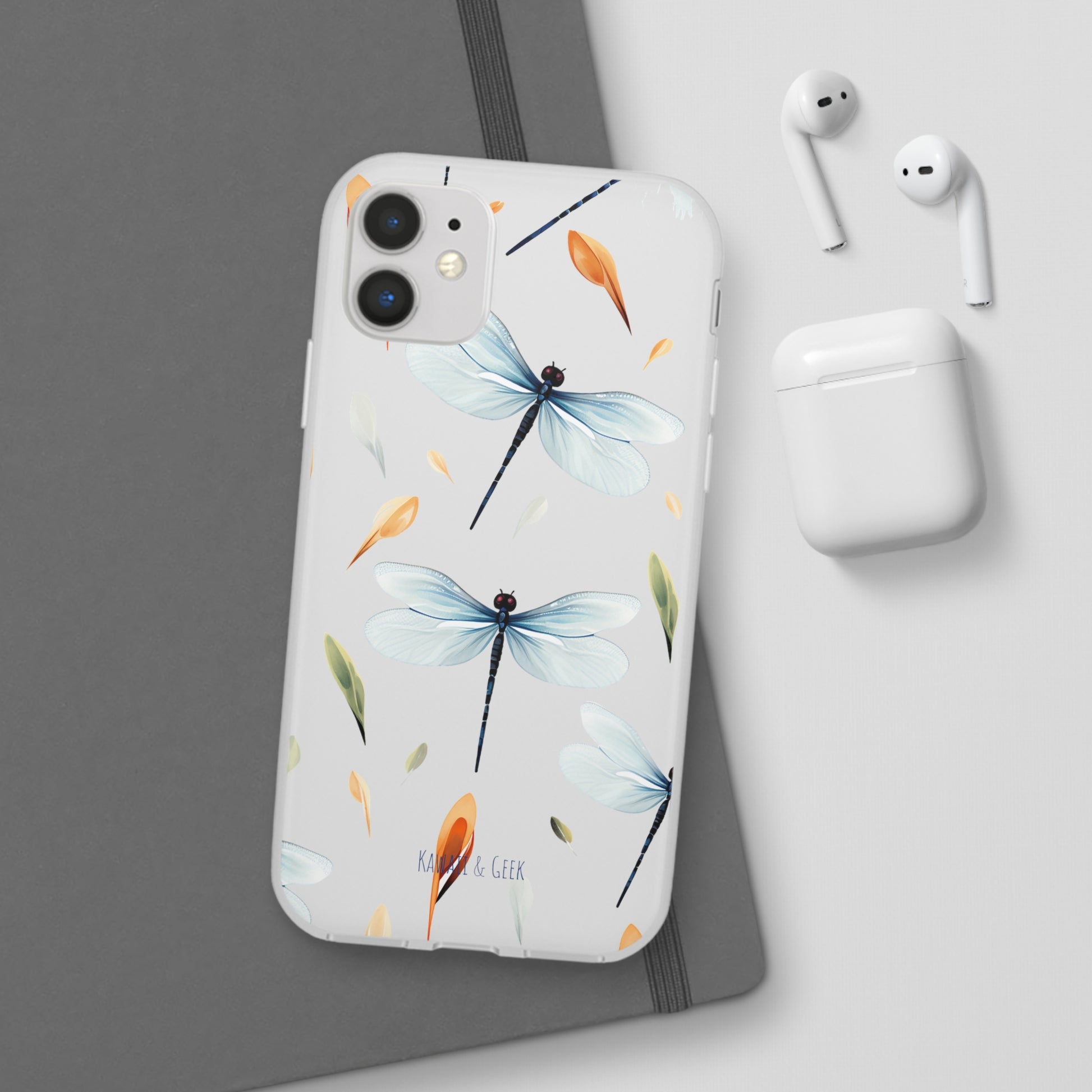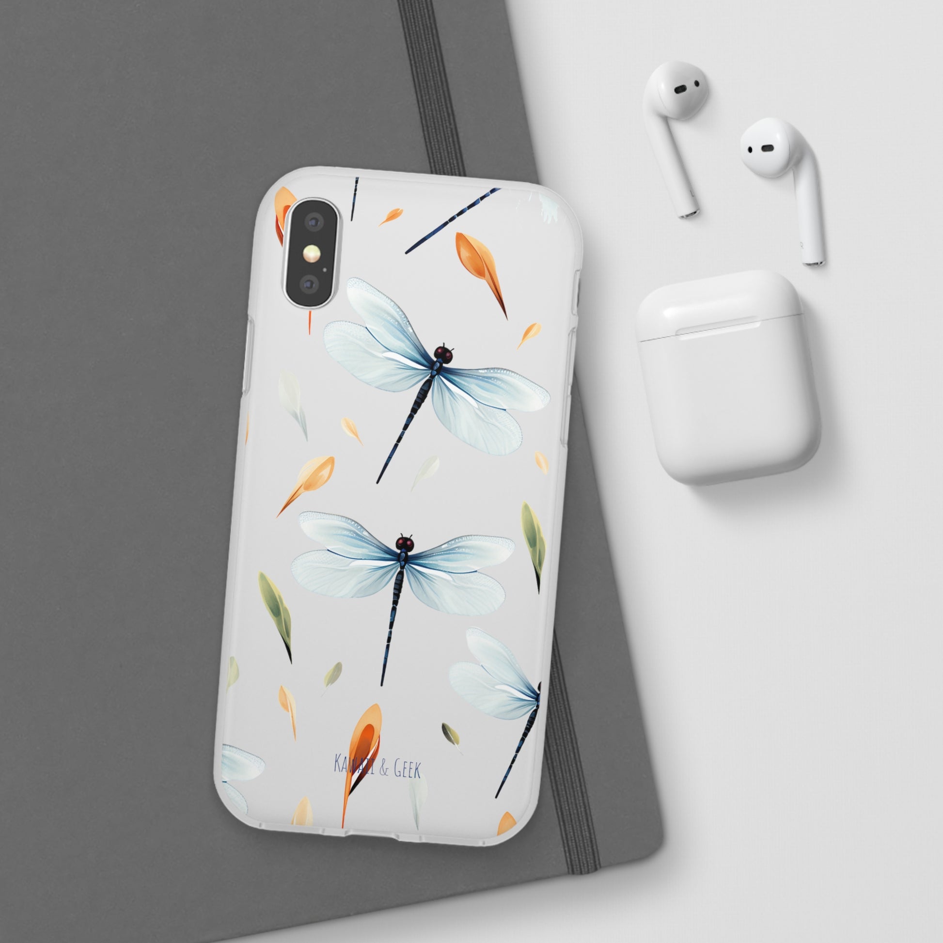Keywords: Dragonfly design, Flexi case, Transparent cover, Ethereal style, Nature inspired, Lightweight case, Phone protection, Trendy design, Nature lover, Durable material, Minimalist style, Delicate print, Insect theme.