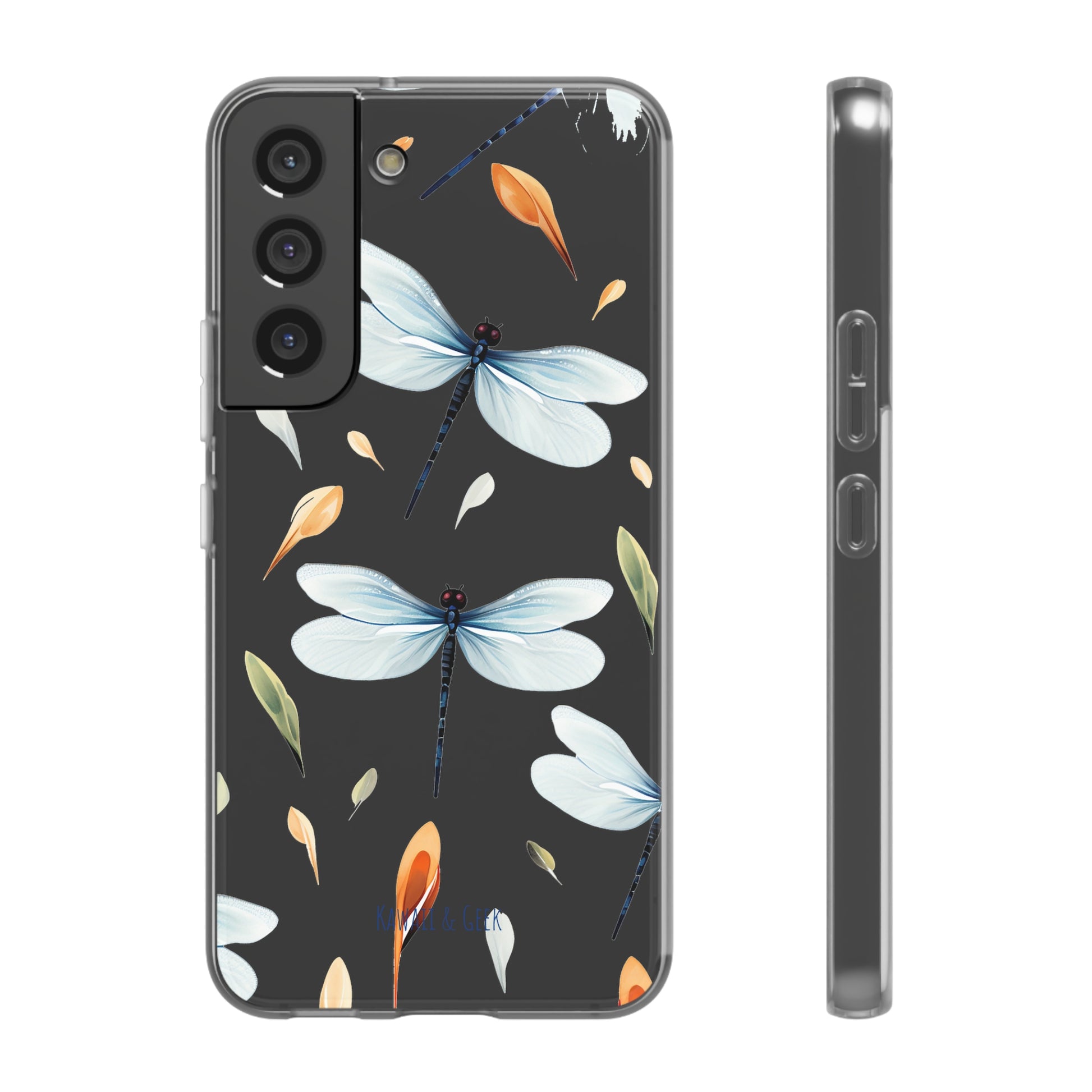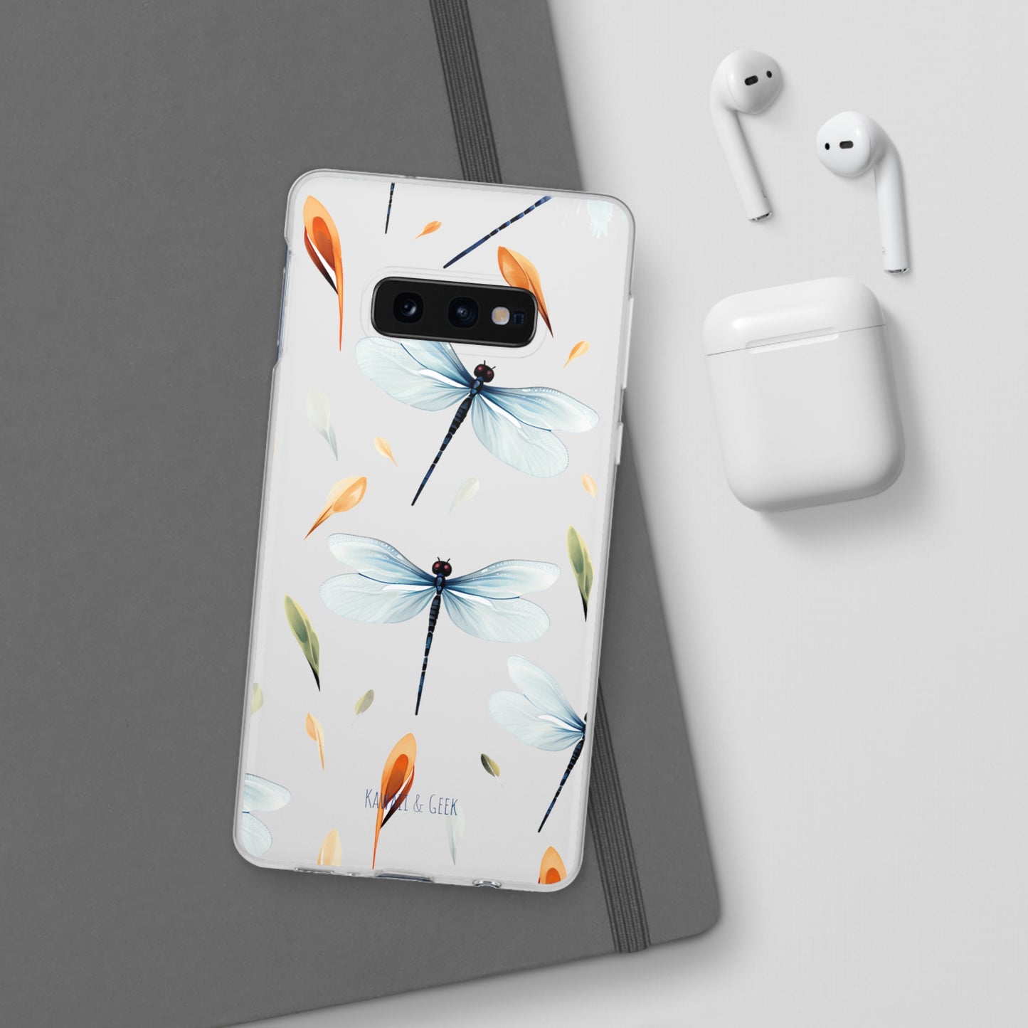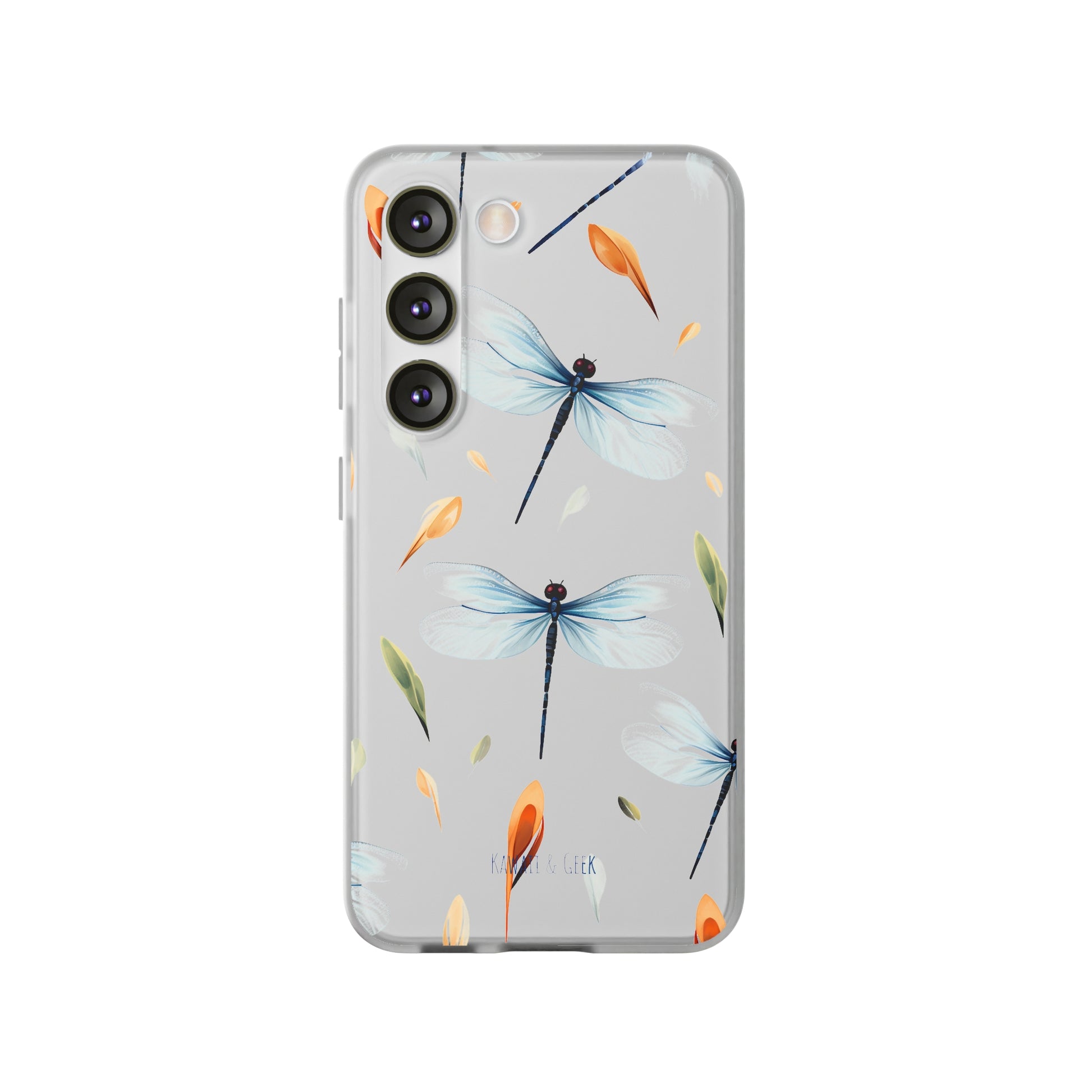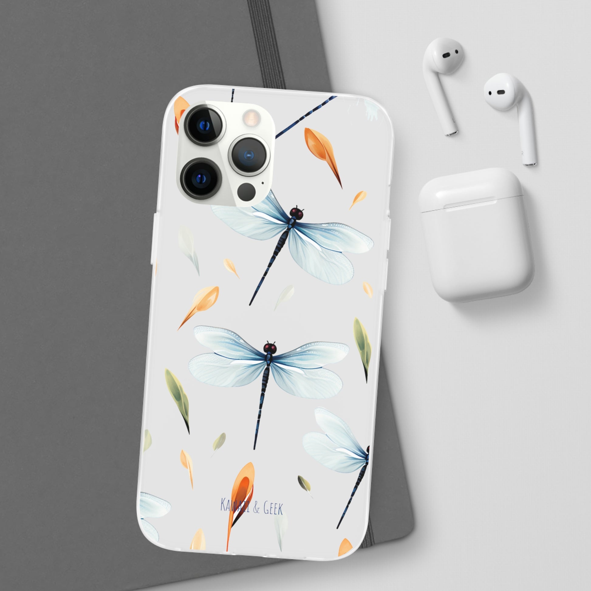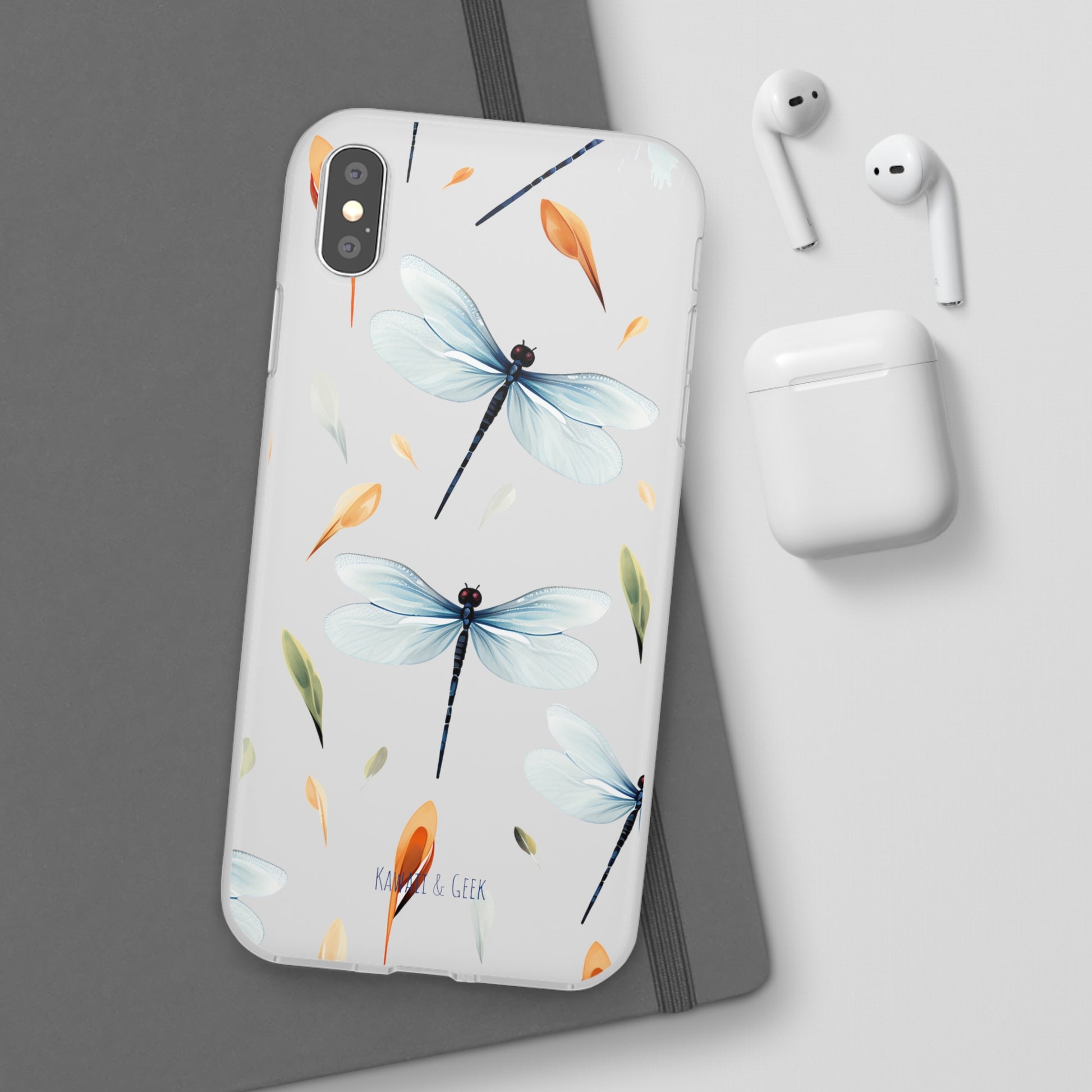Keywords: Dragonfly design, Flexi case, Transparent cover, Ethereal style, Nature inspired, Lightweight case, Phone protection, Trendy design, Nature lover, Durable material, Minimalist style, Delicate print, Insect theme.
