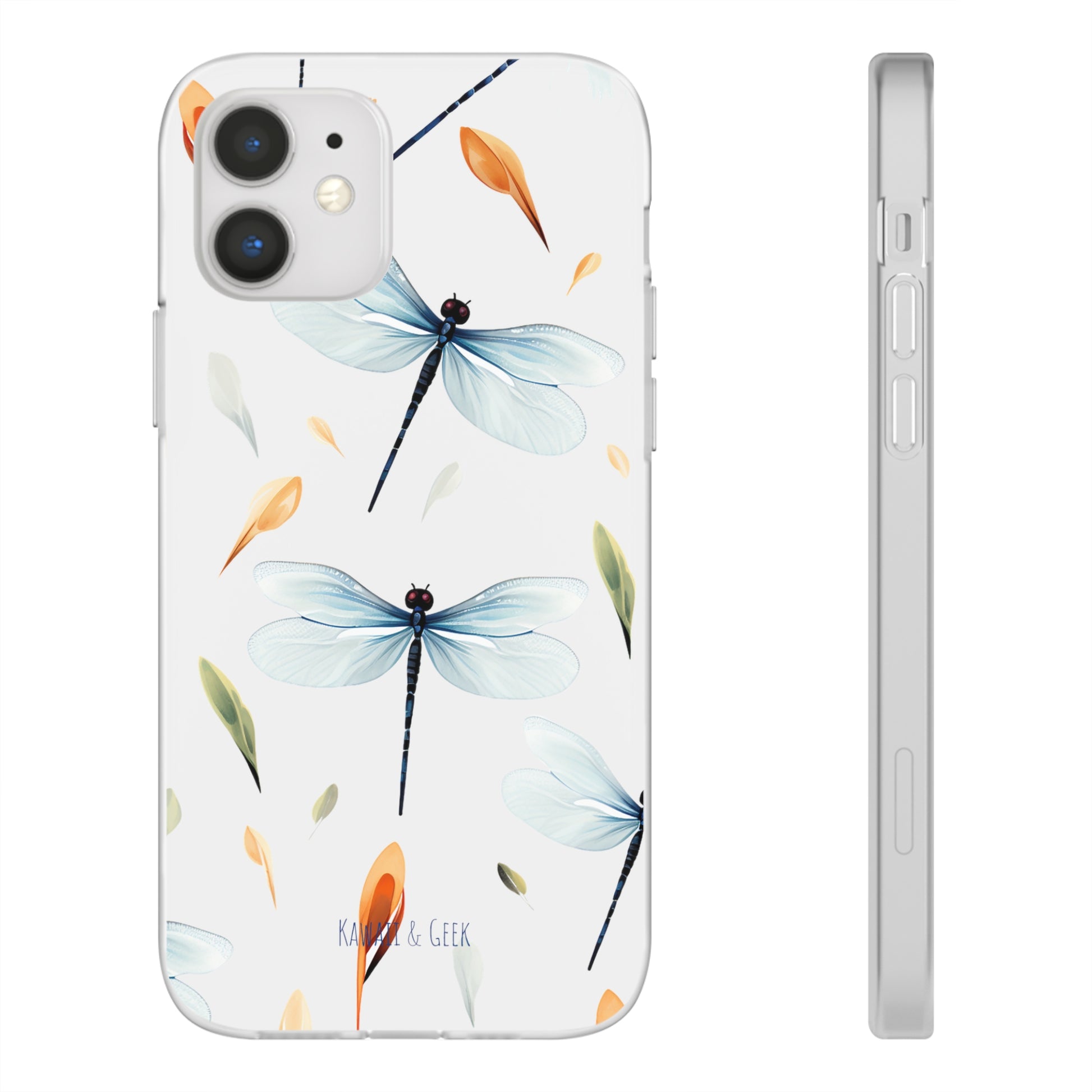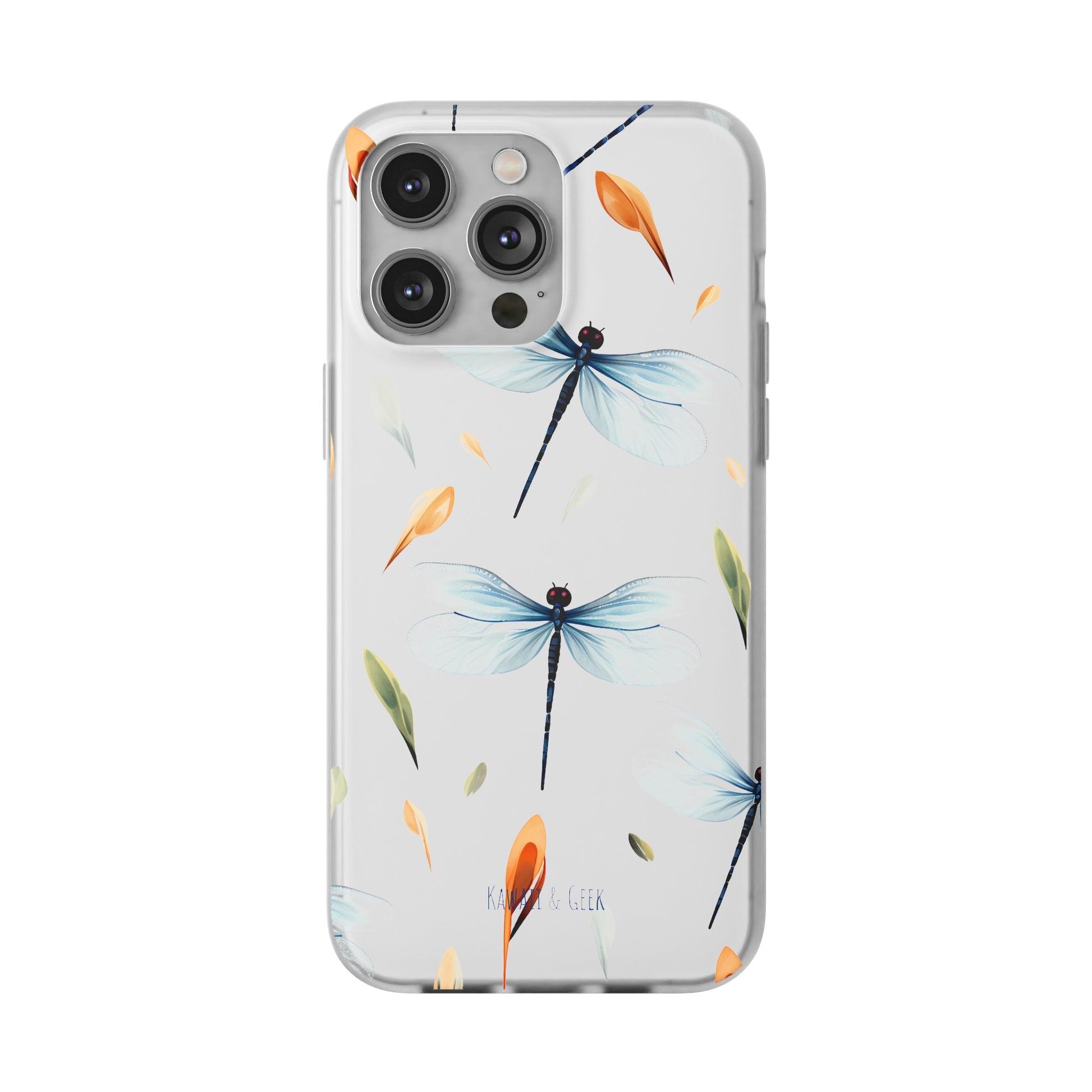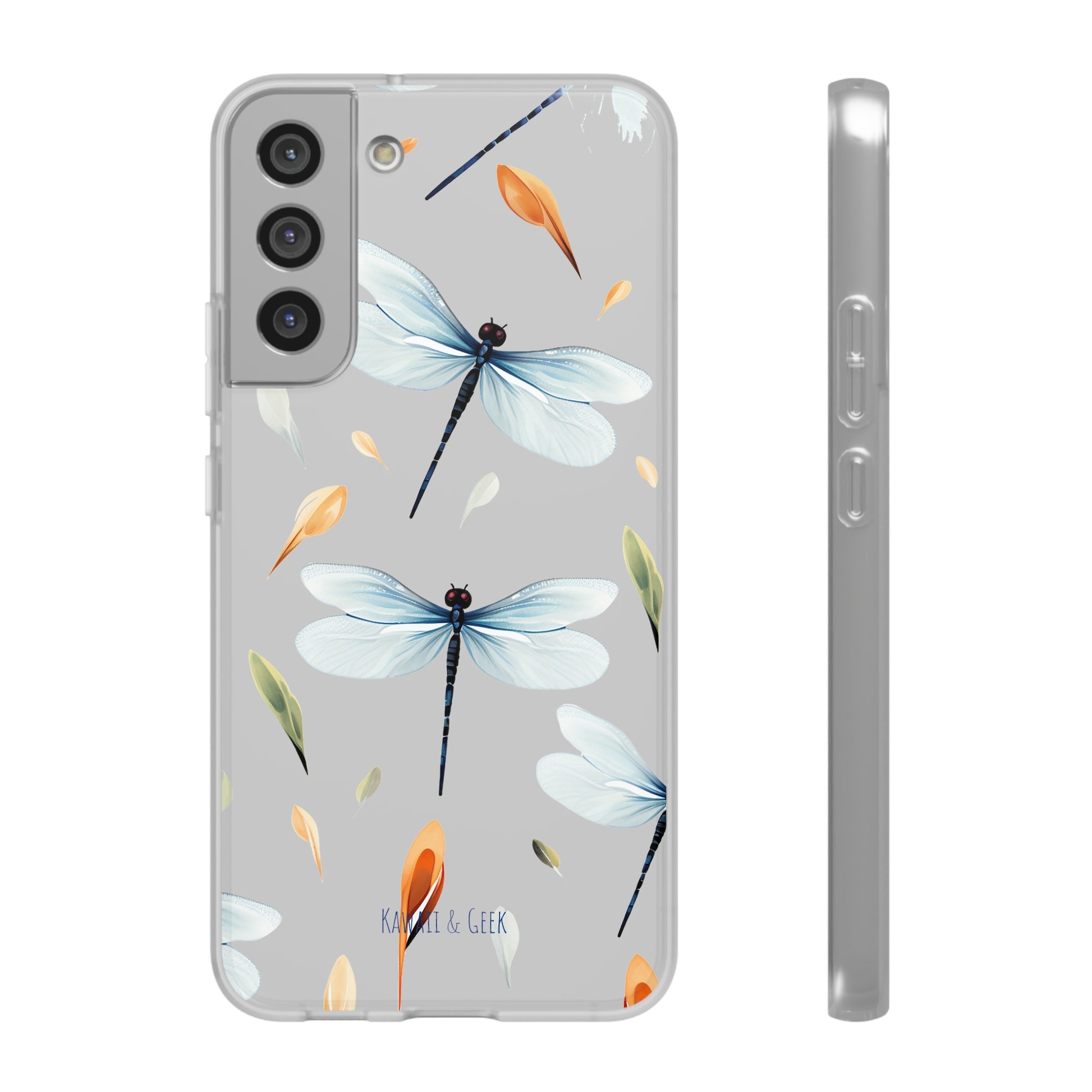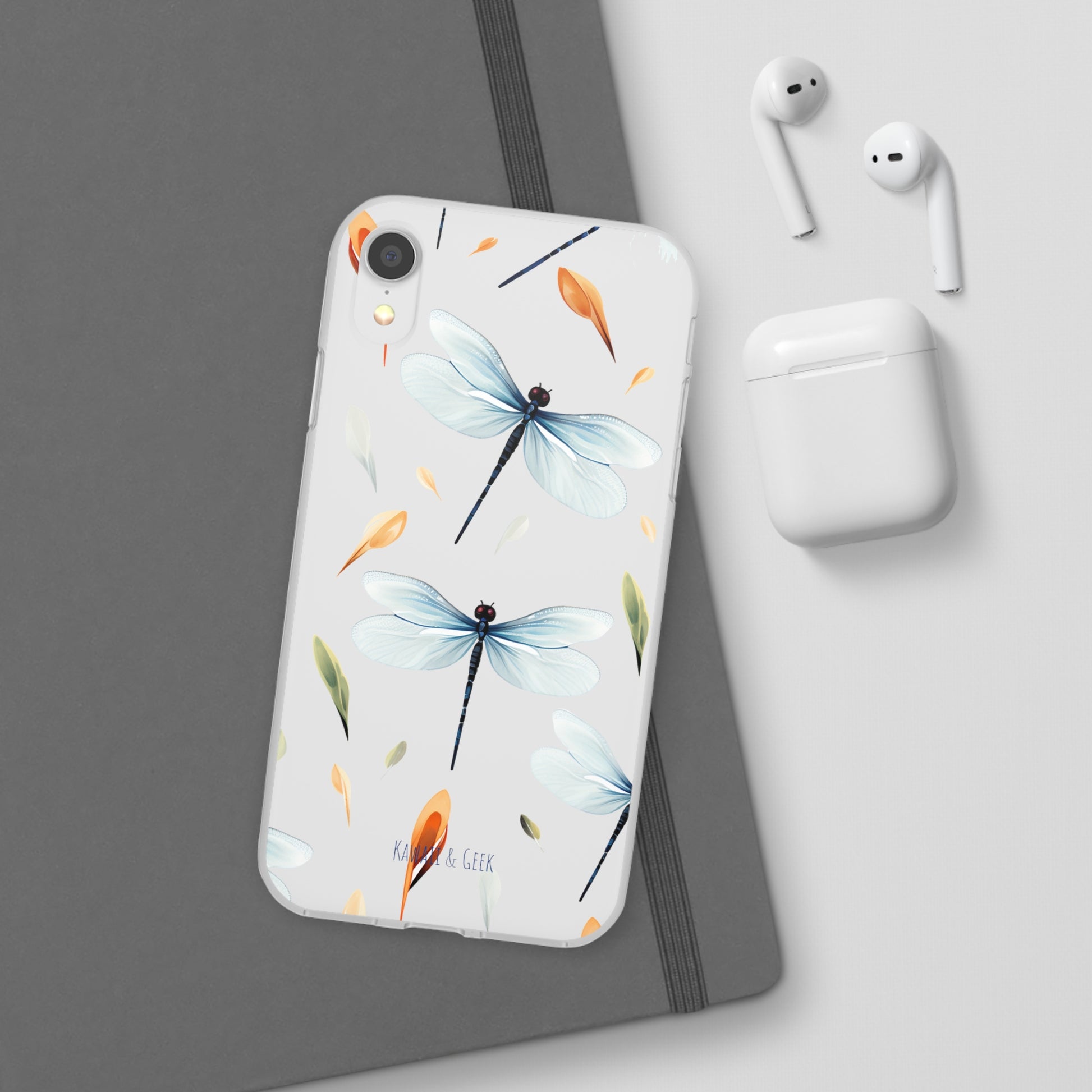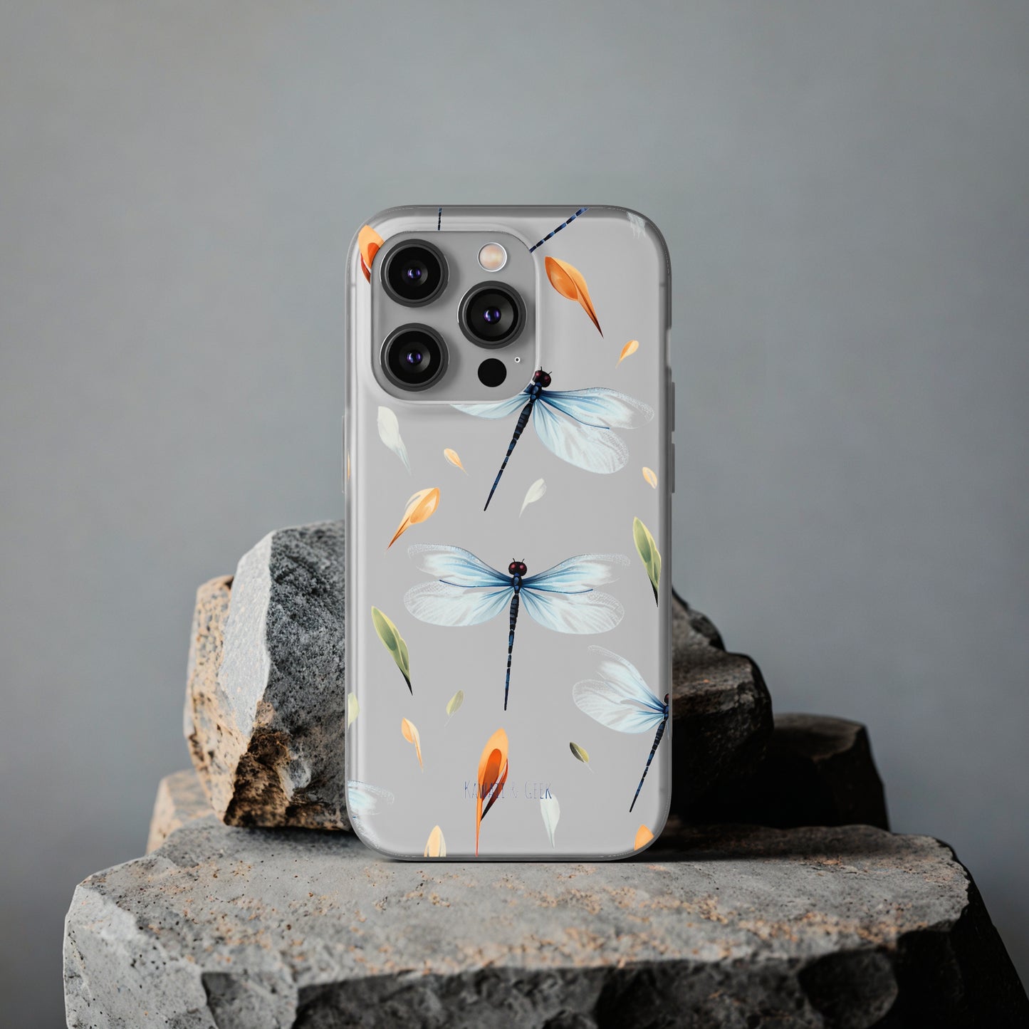 Keywords: Dragonfly design, Flexi case, Transparent cover, Ethereal style, Nature inspired, Lightweight case, Phone protection, Trendy design, Nature lover, Durable material, Minimalist style, Delicate print, Insect theme.