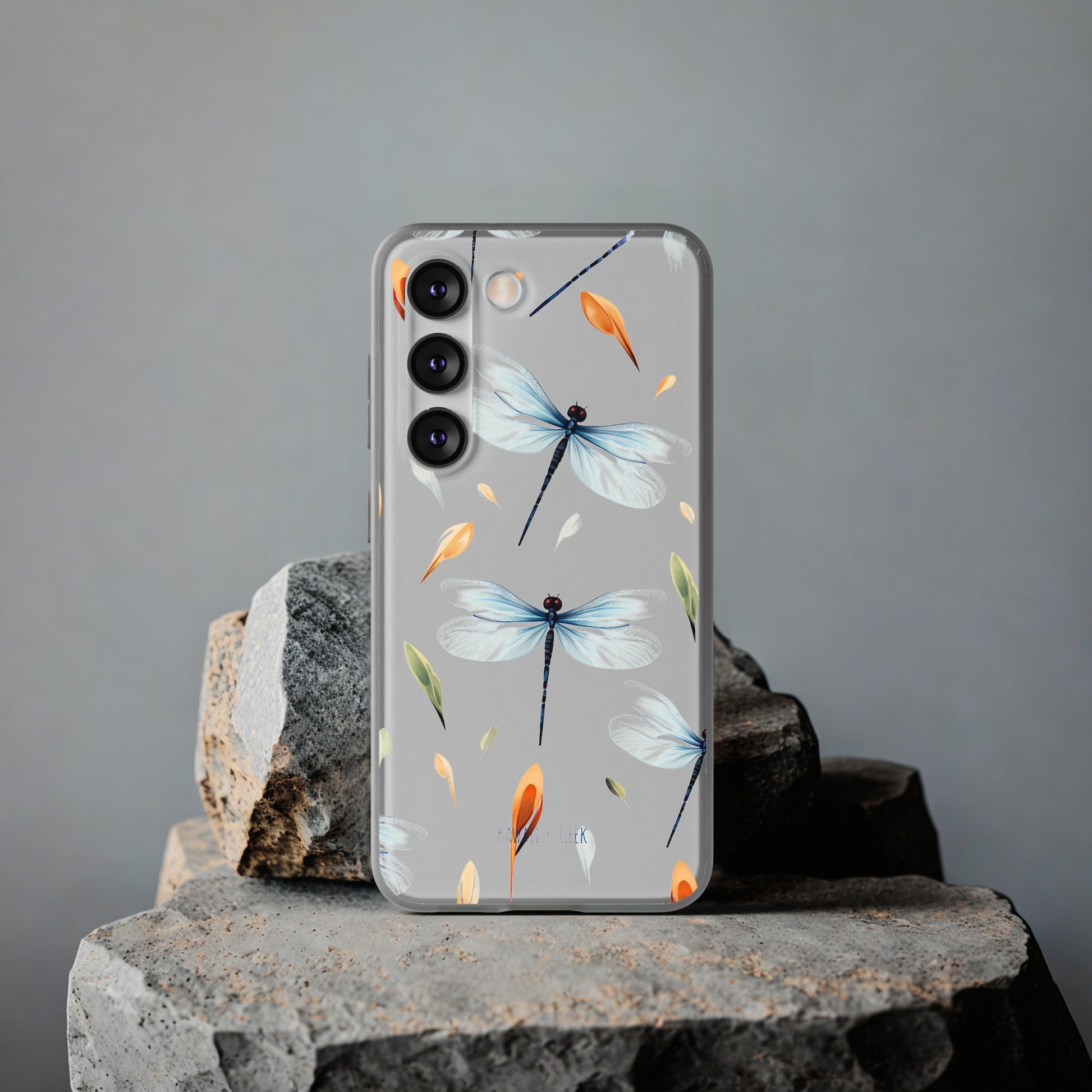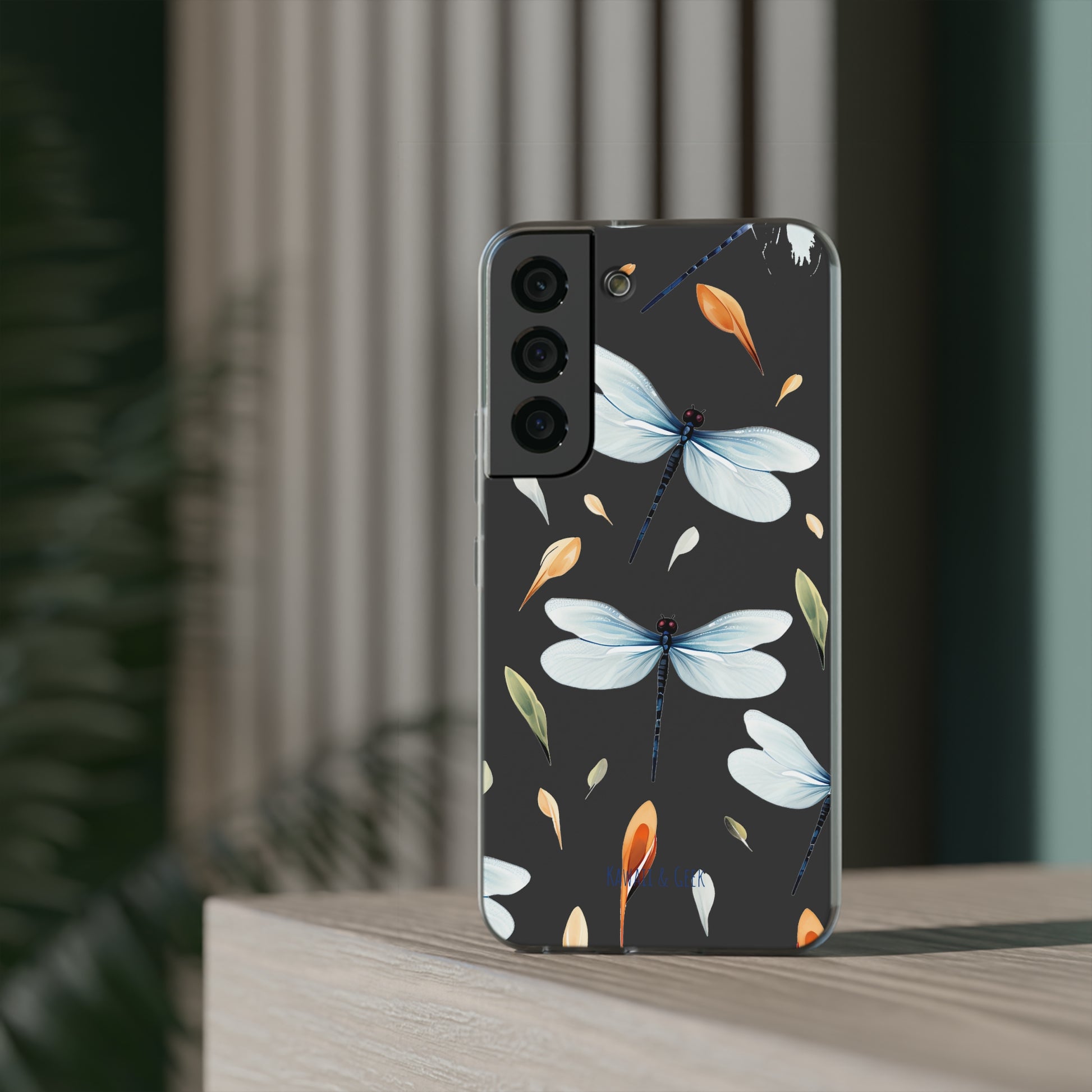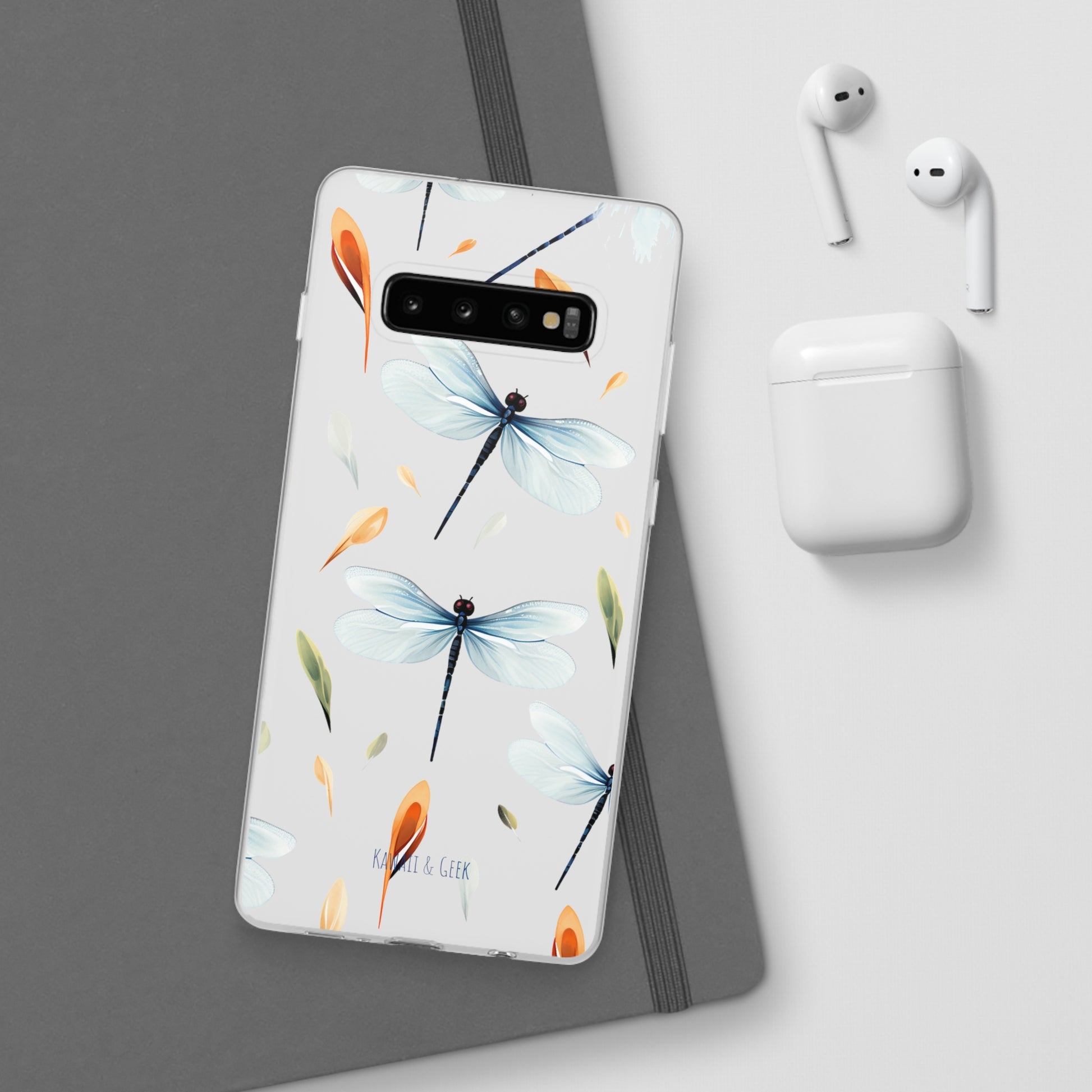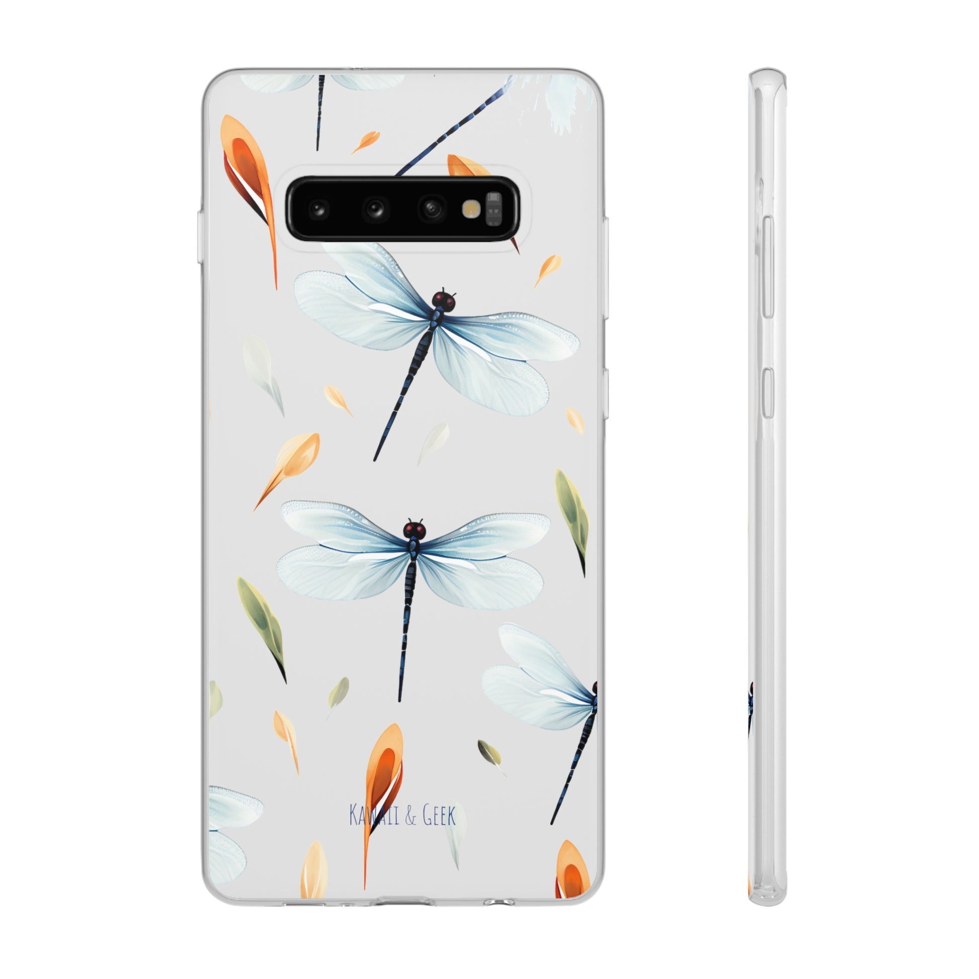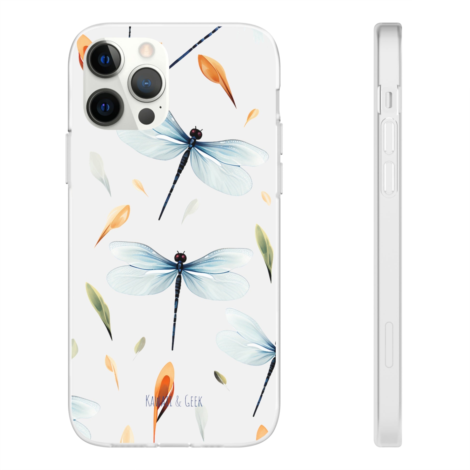 Keywords: Dragonfly design, Flexi case, Transparent cover, Ethereal style, Nature inspired, Lightweight case, Phone protection, Trendy design, Nature lover, Durable material, Minimalist style, Delicate print, Insect theme.