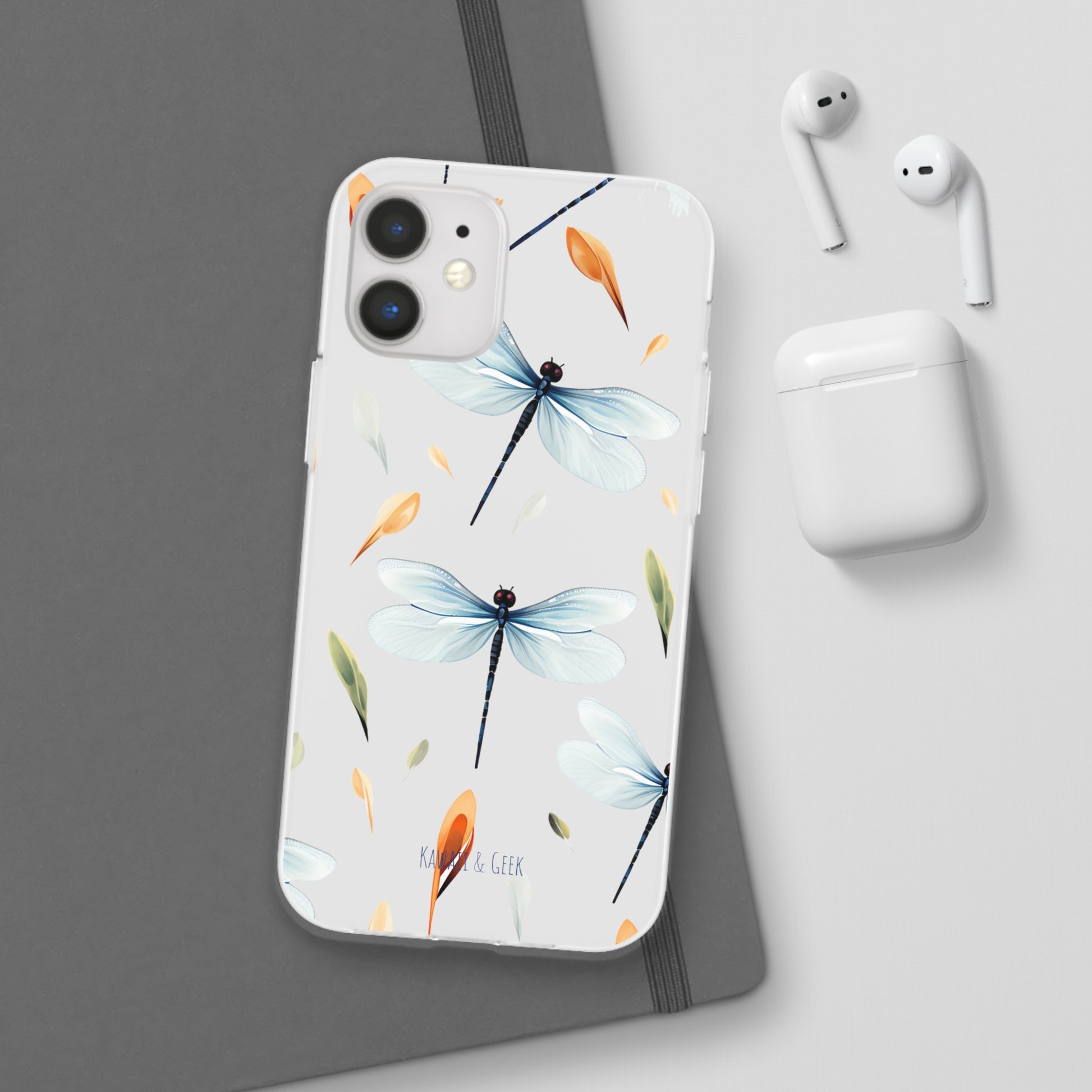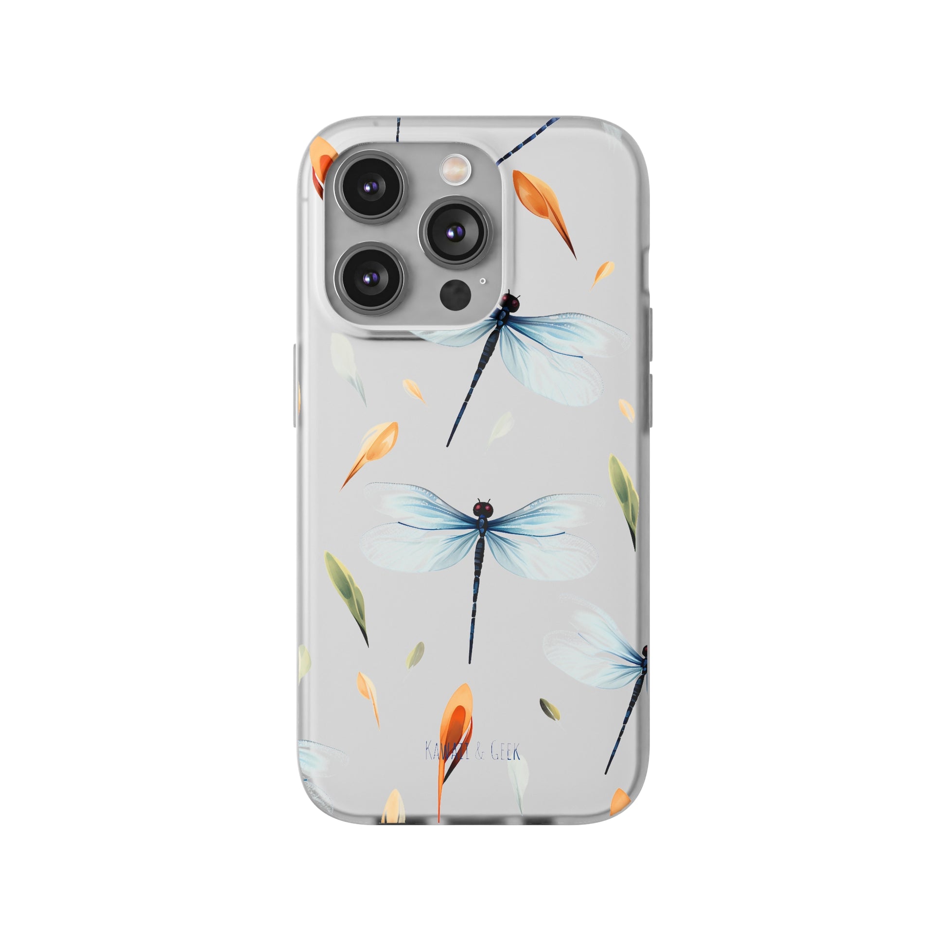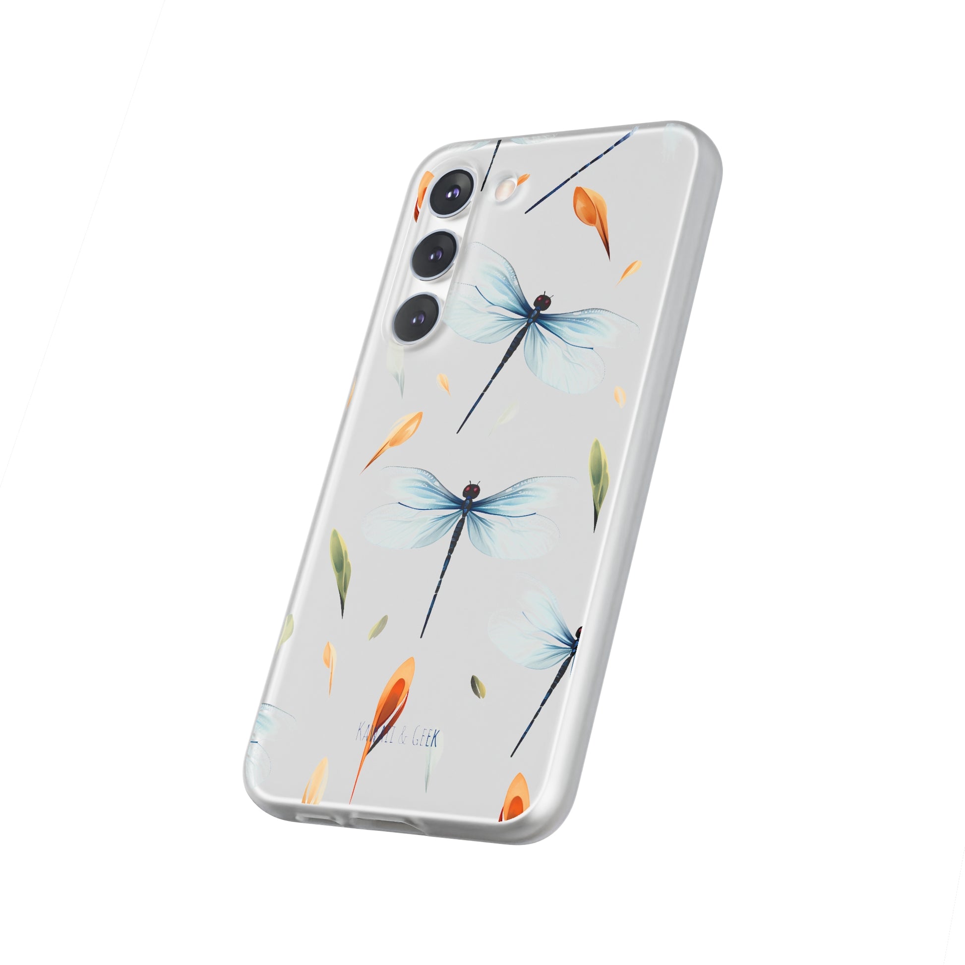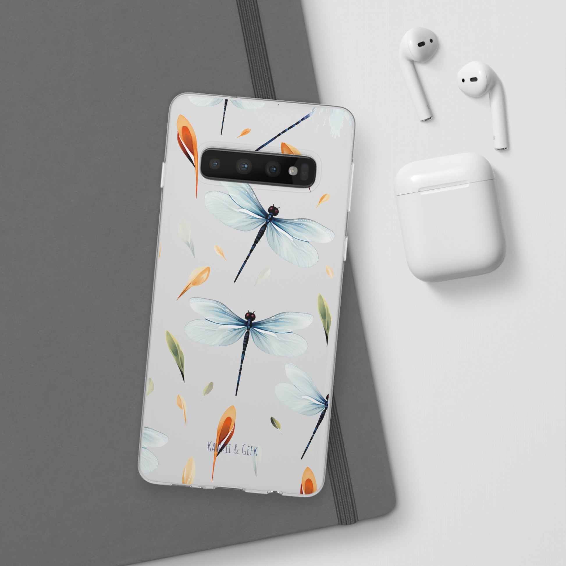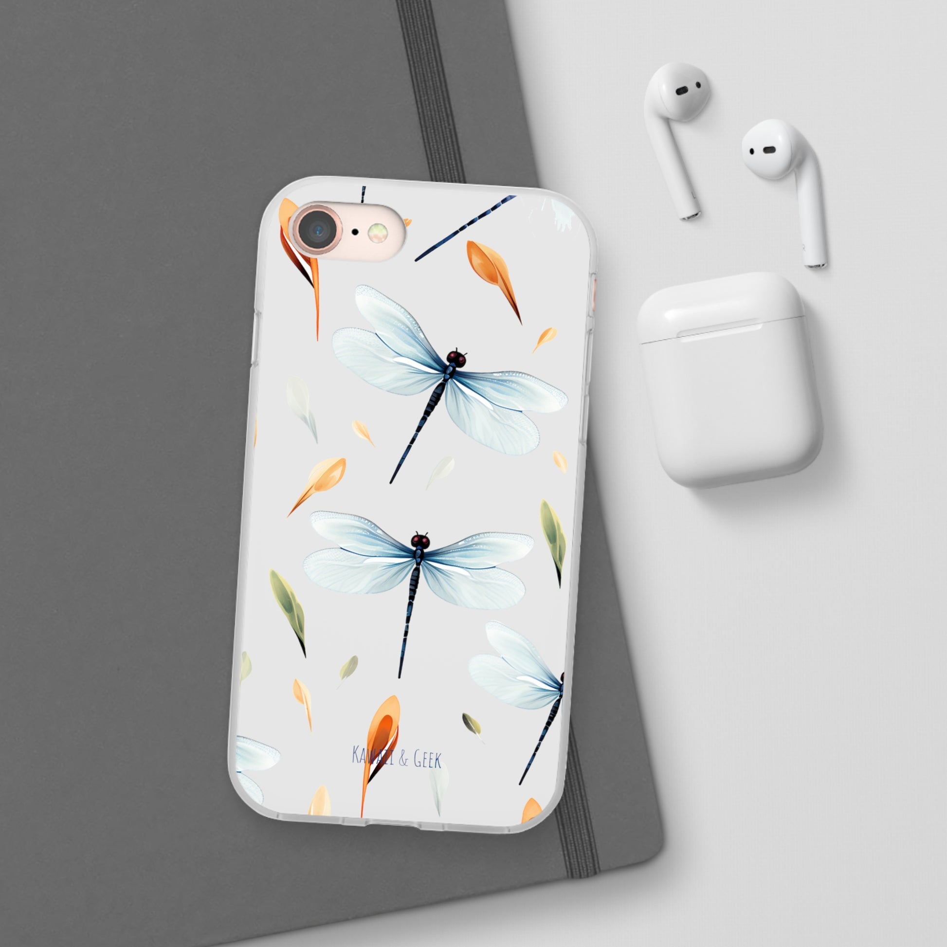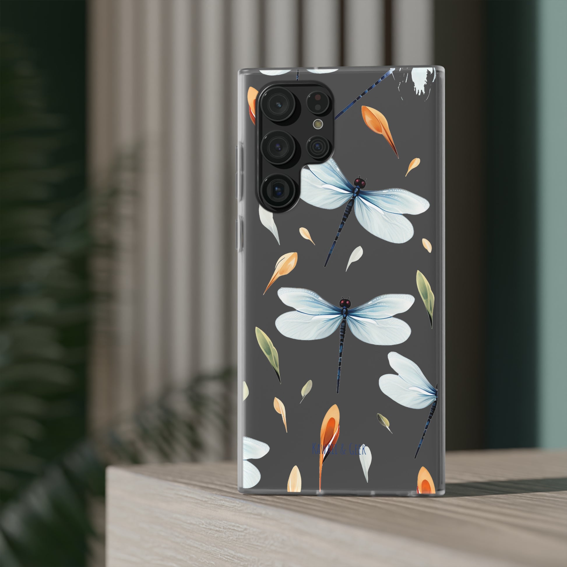 Keywords: Dragonfly design, Flexi case, Transparent cover, Ethereal style, Nature inspired, Lightweight case, Phone protection, Trendy design, Nature lover, Durable material, Minimalist style, Delicate print, Insect theme.