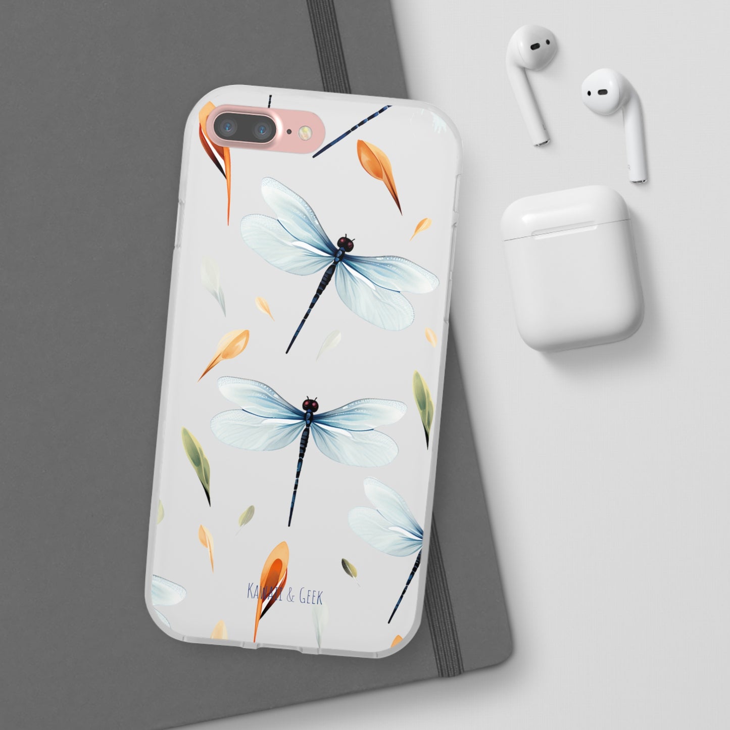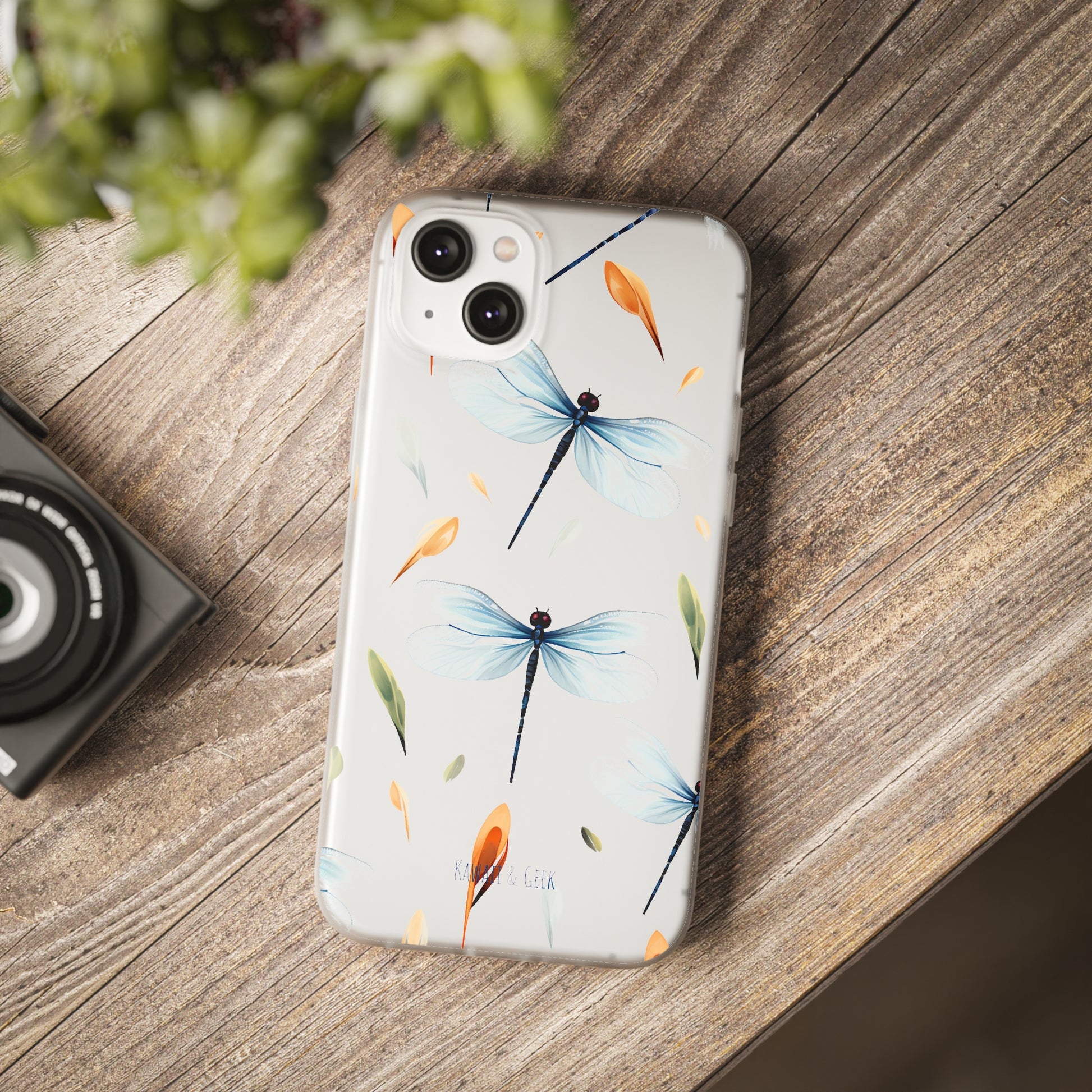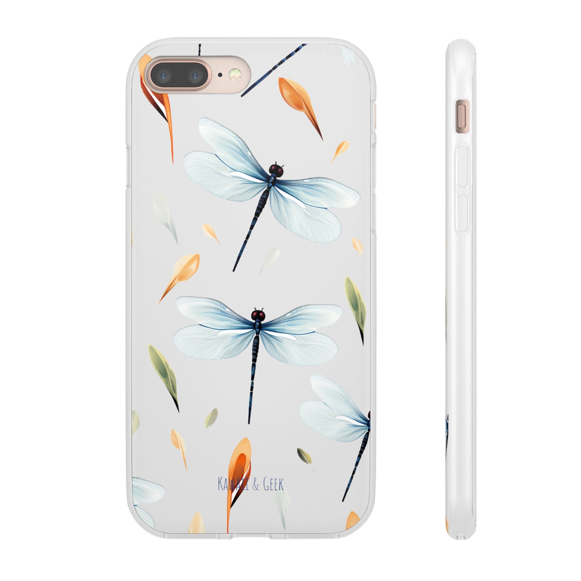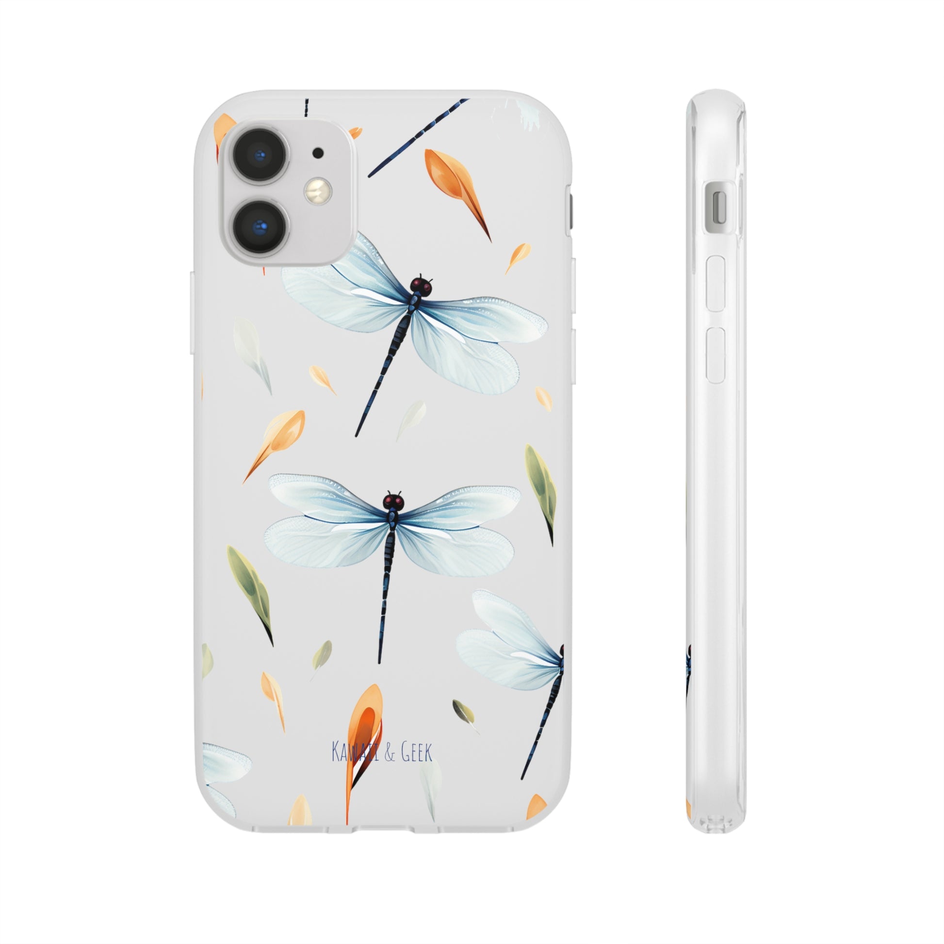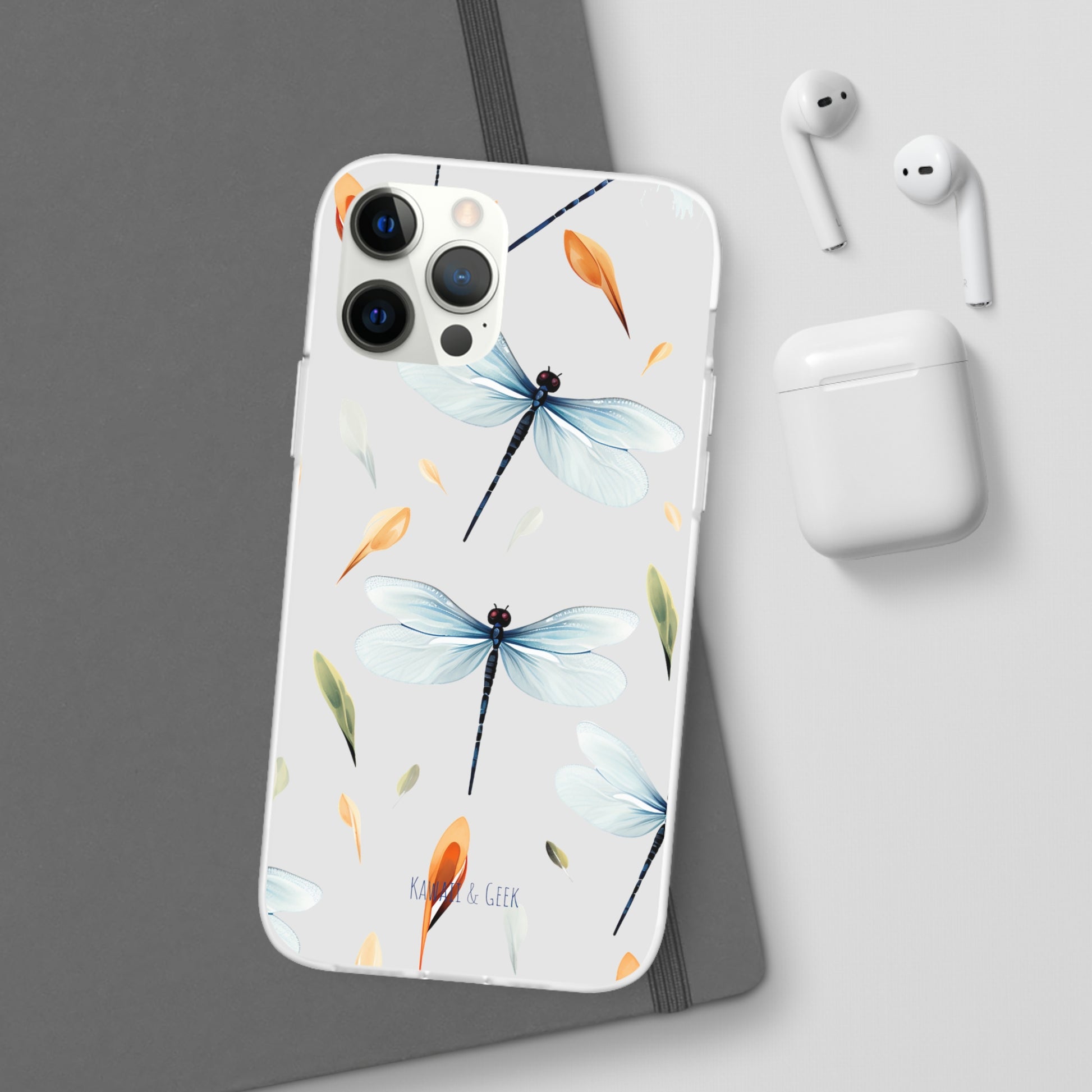 Keywords: Dragonfly design, Flexi case, Transparent cover, Ethereal style, Nature inspired, Lightweight case, Phone protection, Trendy design, Nature lover, Durable material, Minimalist style, Delicate print, Insect theme.