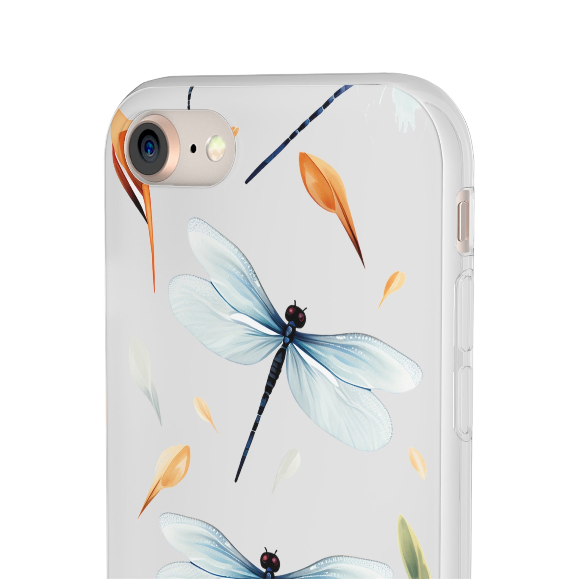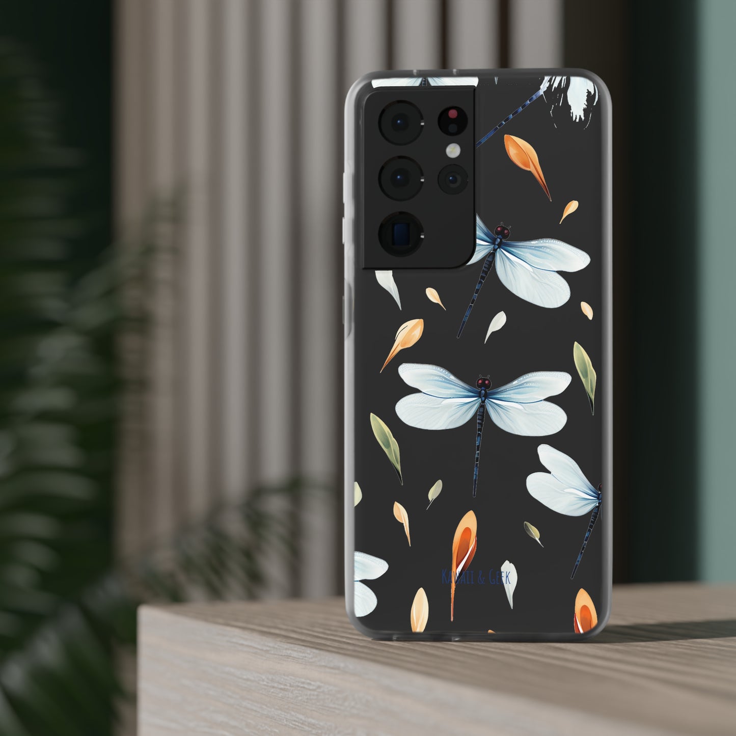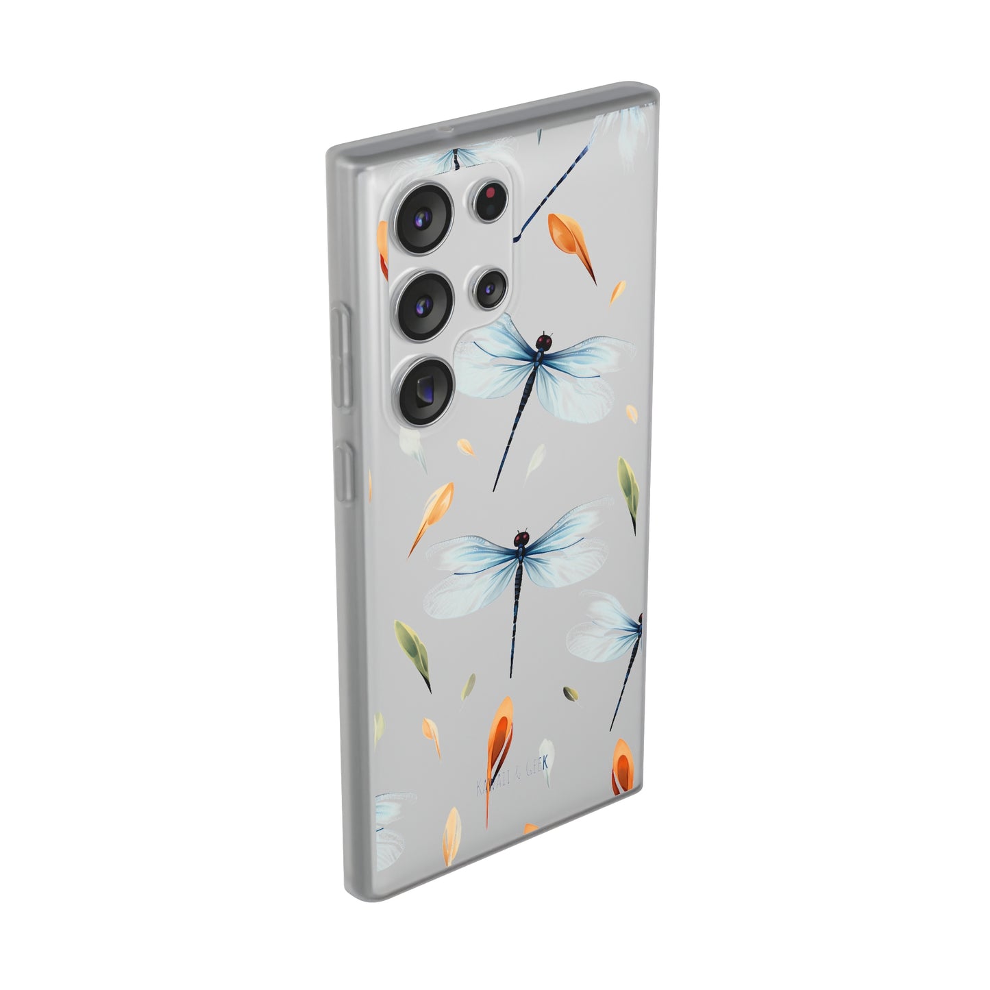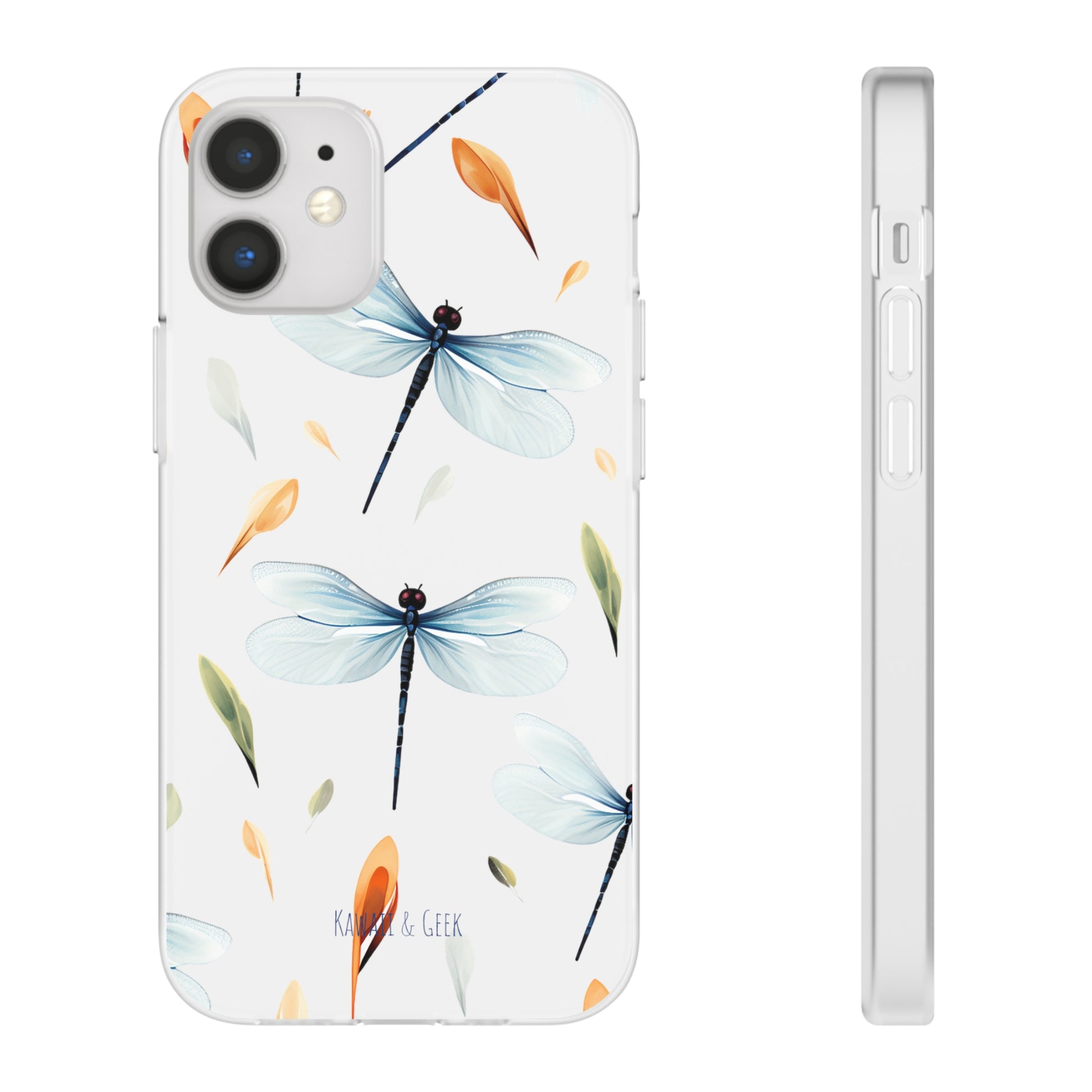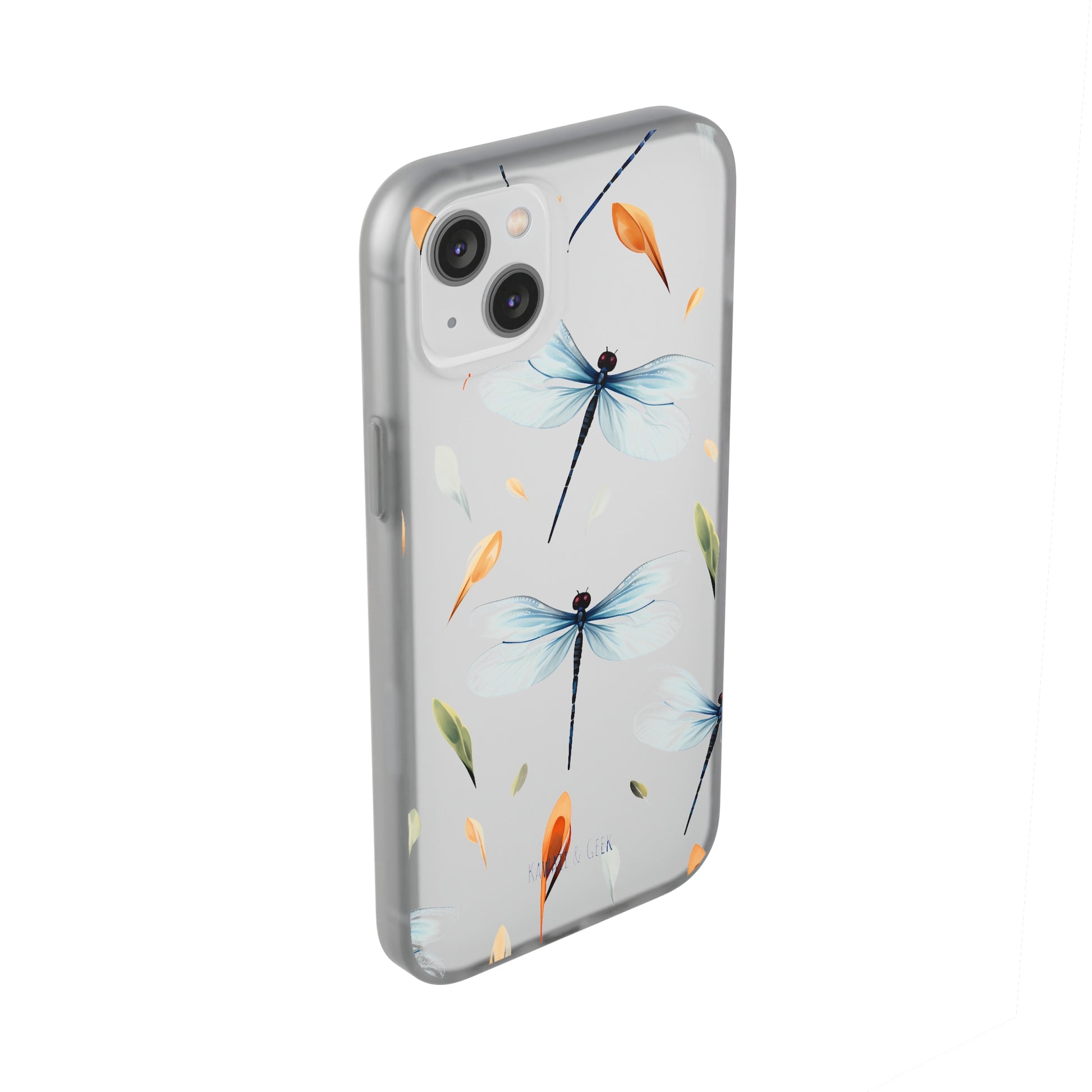Keywords: Dragonfly design, Flexi case, Transparent cover, Ethereal style, Nature inspired, Lightweight case, Phone protection, Trendy design, Nature lover, Durable material, Minimalist style, Delicate print, Insect theme.
