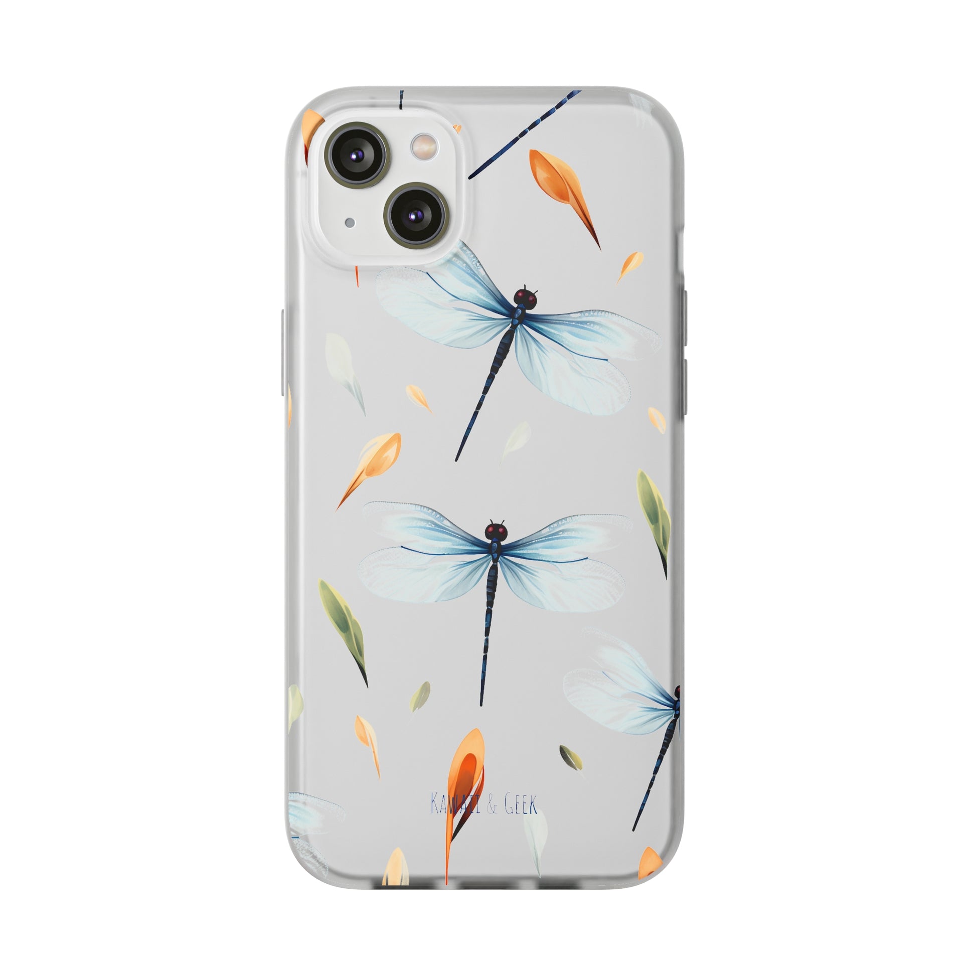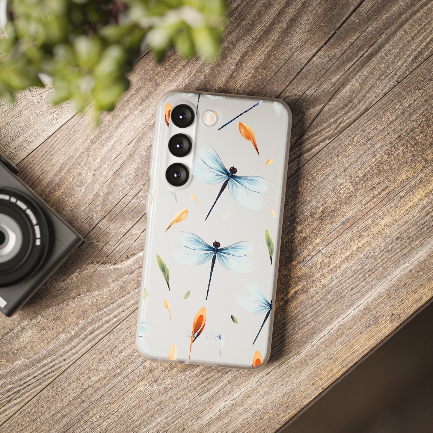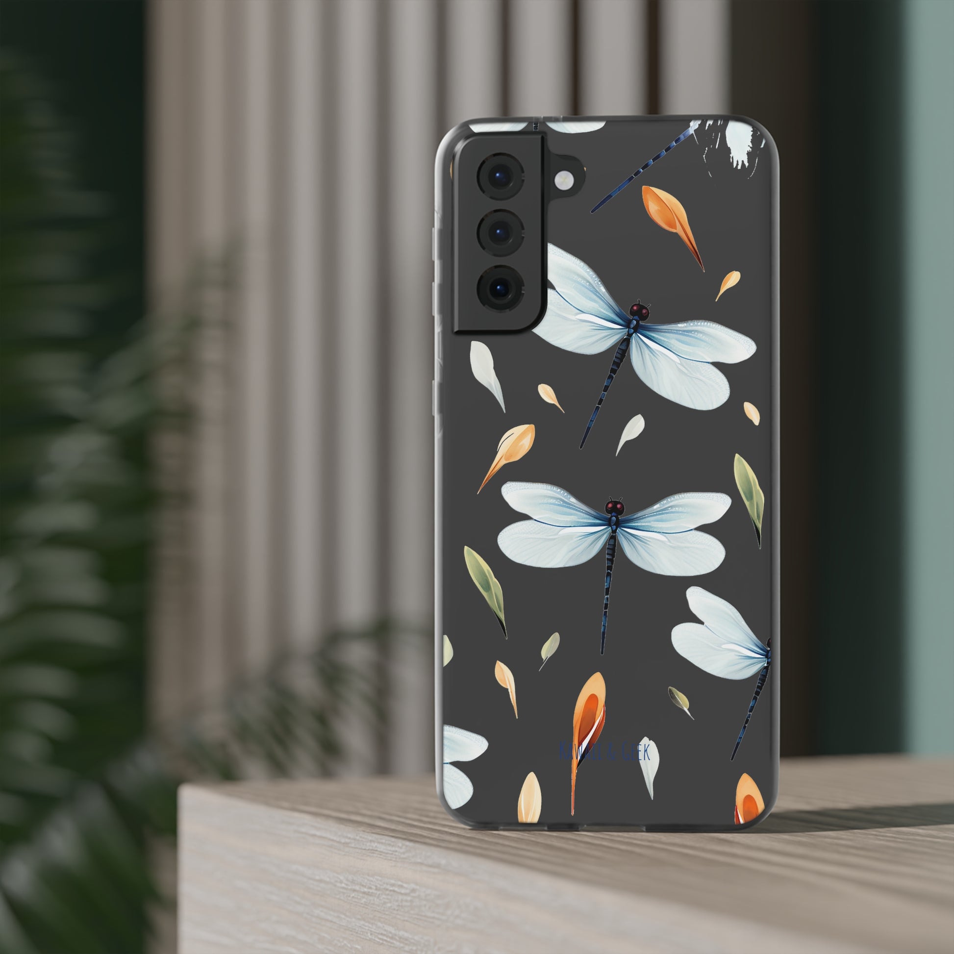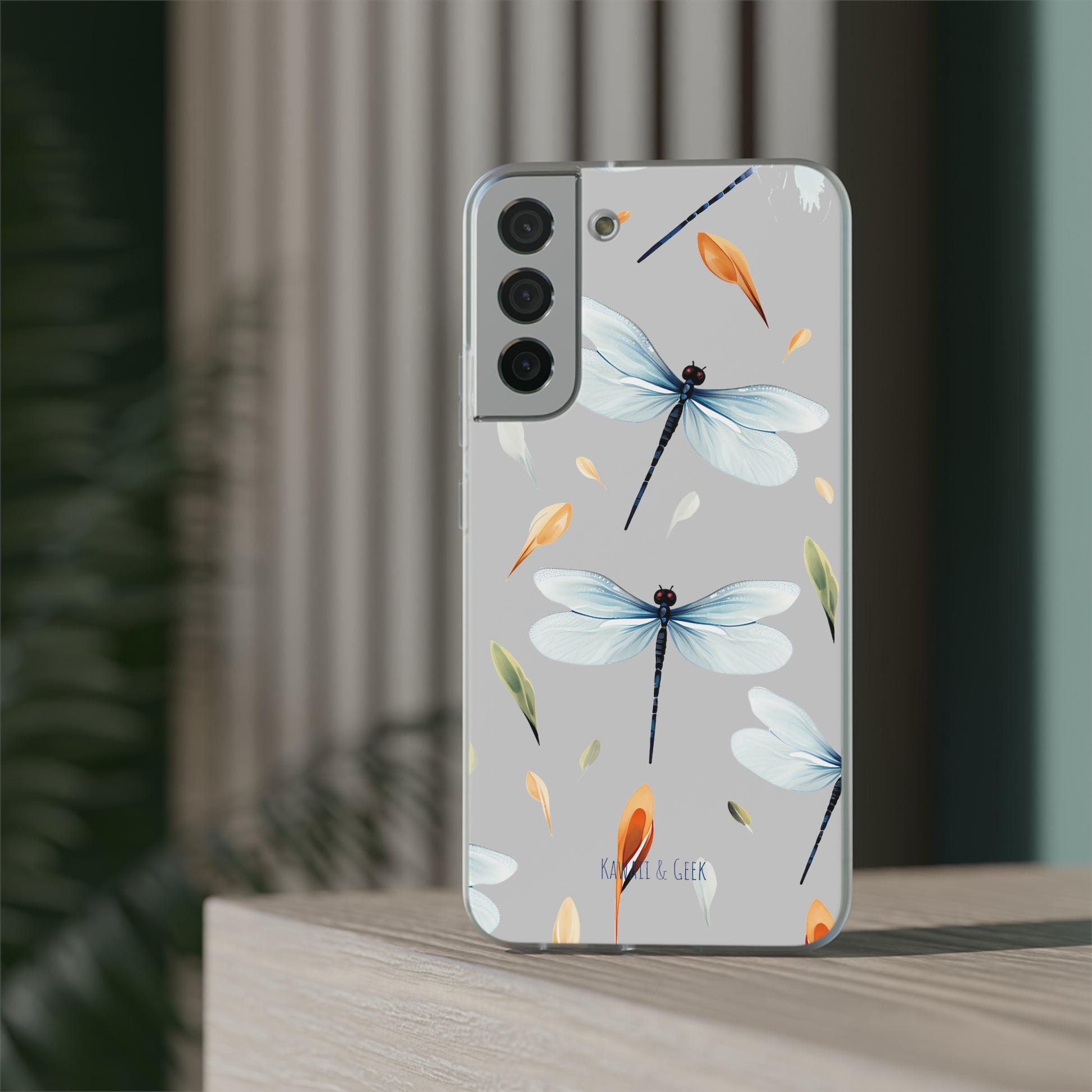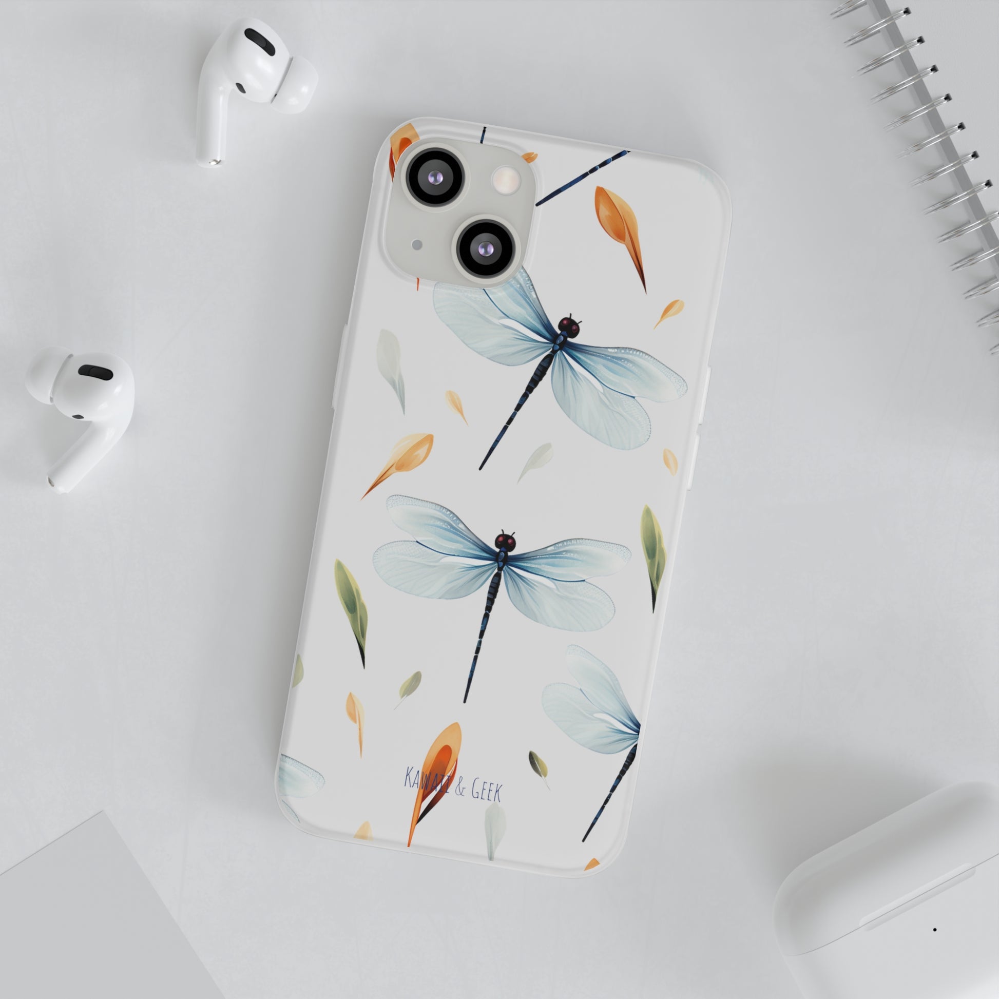 Keywords: Dragonfly design, Flexi case, Transparent cover, Ethereal style, Nature inspired, Lightweight case, Phone protection, Trendy design, Nature lover, Durable material, Minimalist style, Delicate print, Insect theme.