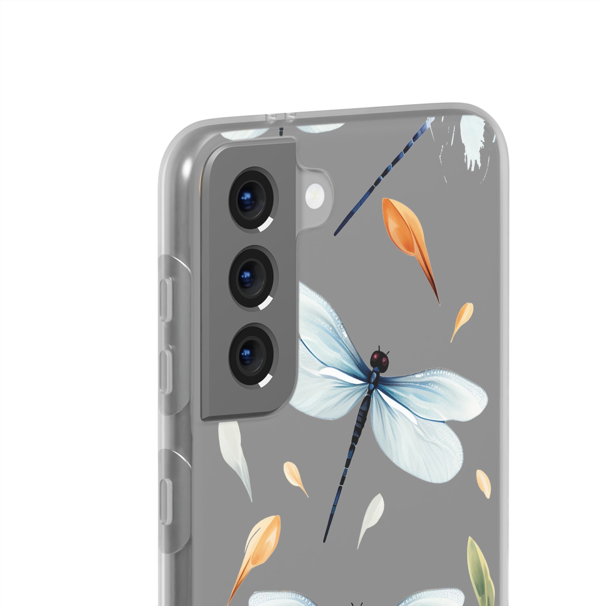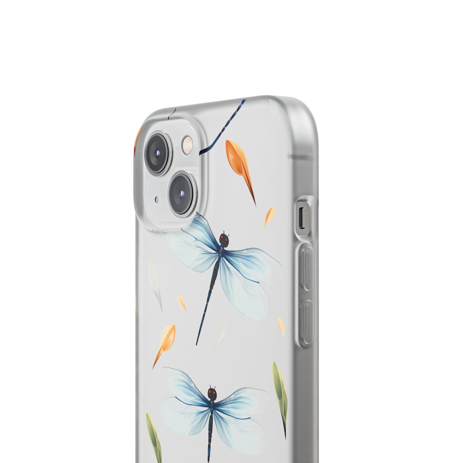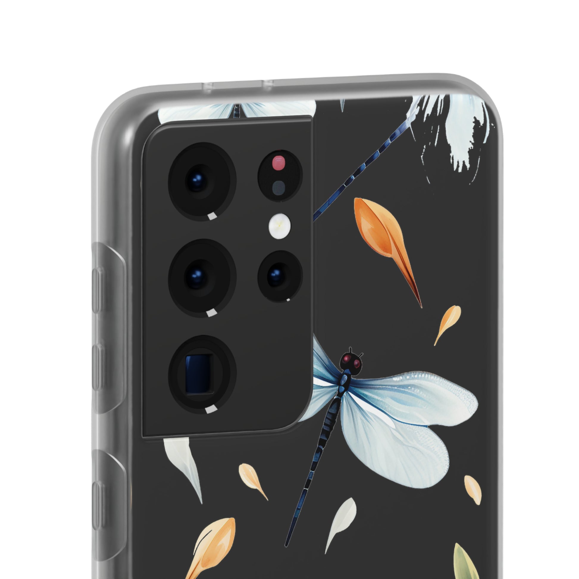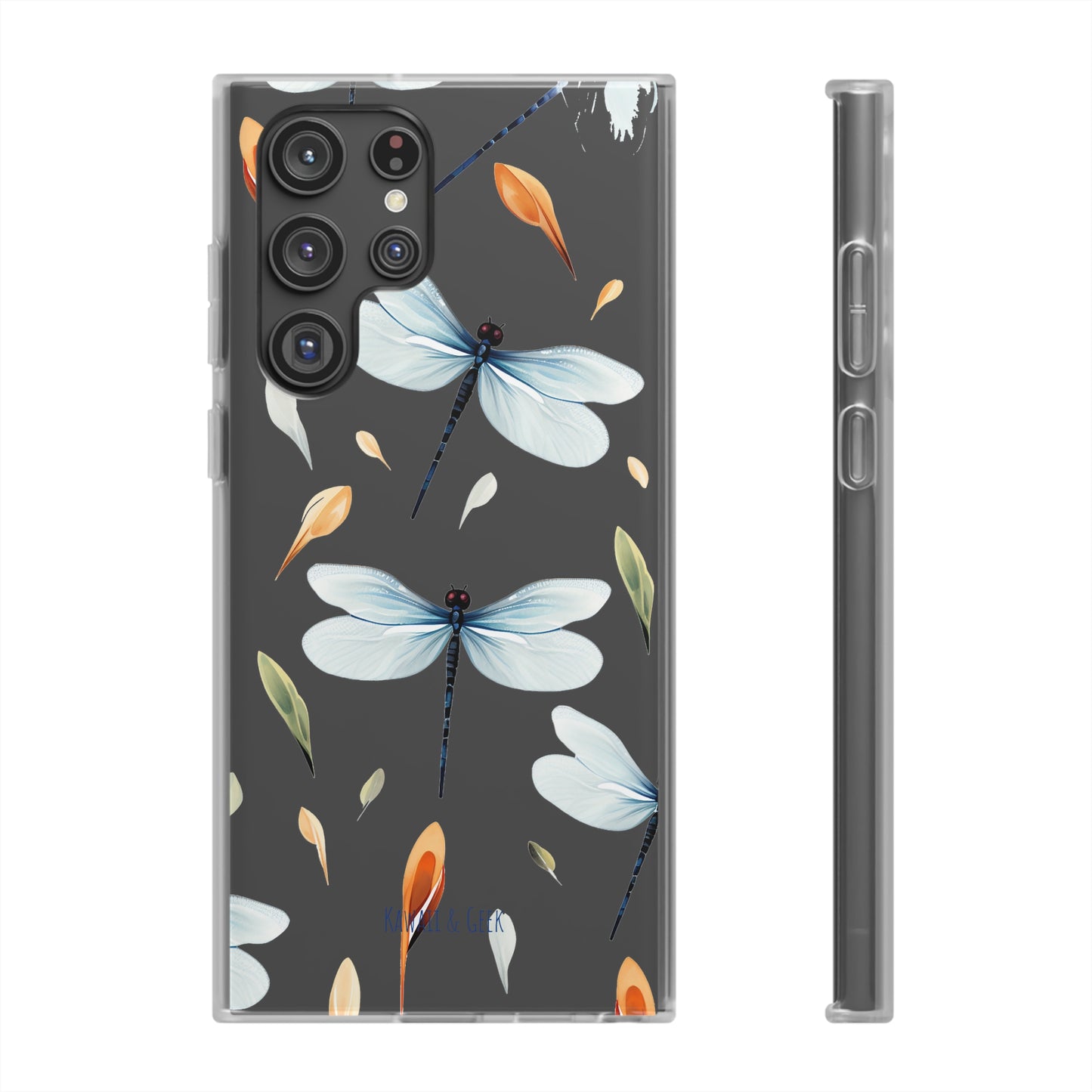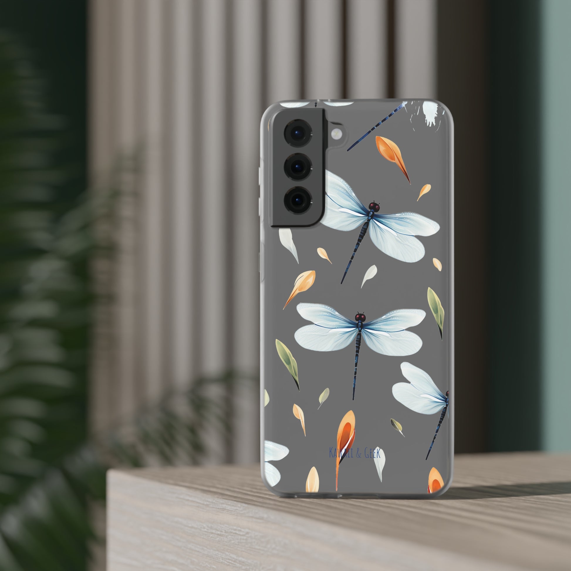 Keywords: Dragonfly design, Flexi case, Transparent cover, Ethereal style, Nature inspired, Lightweight case, Phone protection, Trendy design, Nature lover, Durable material, Minimalist style, Delicate print, Insect theme.