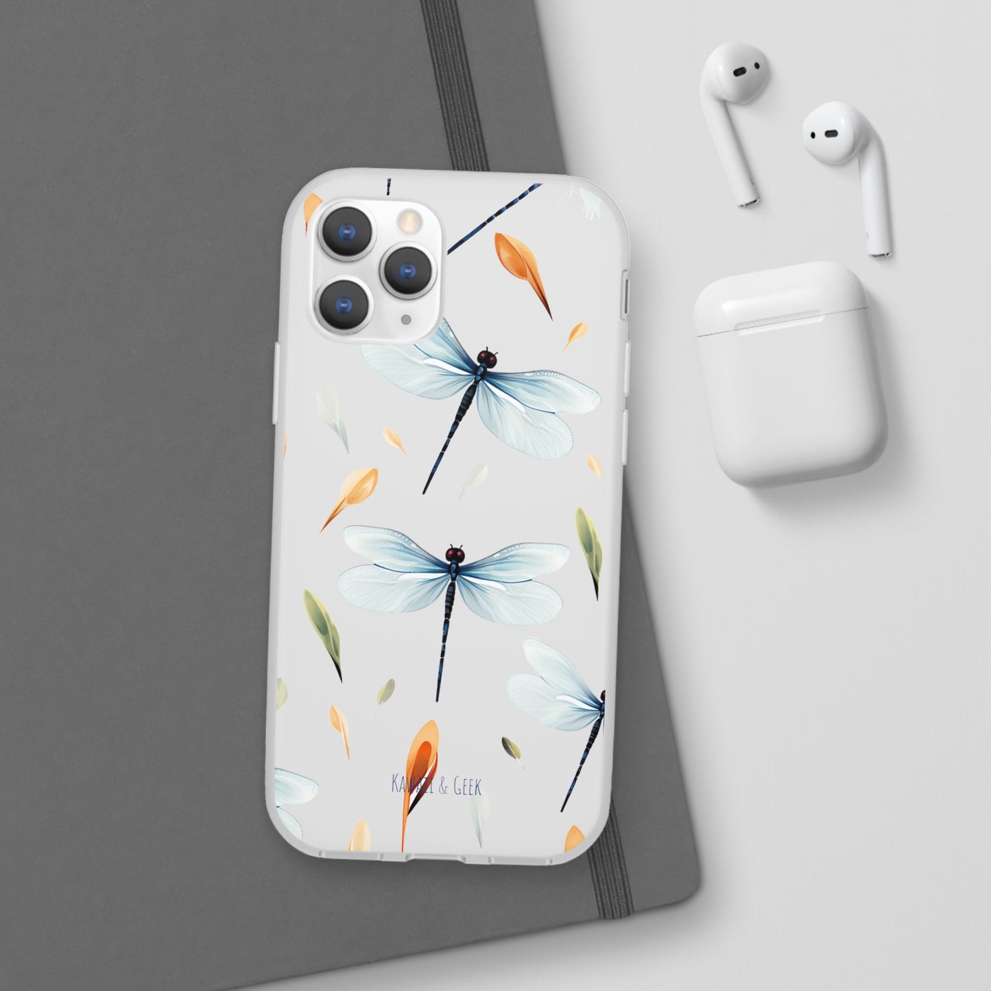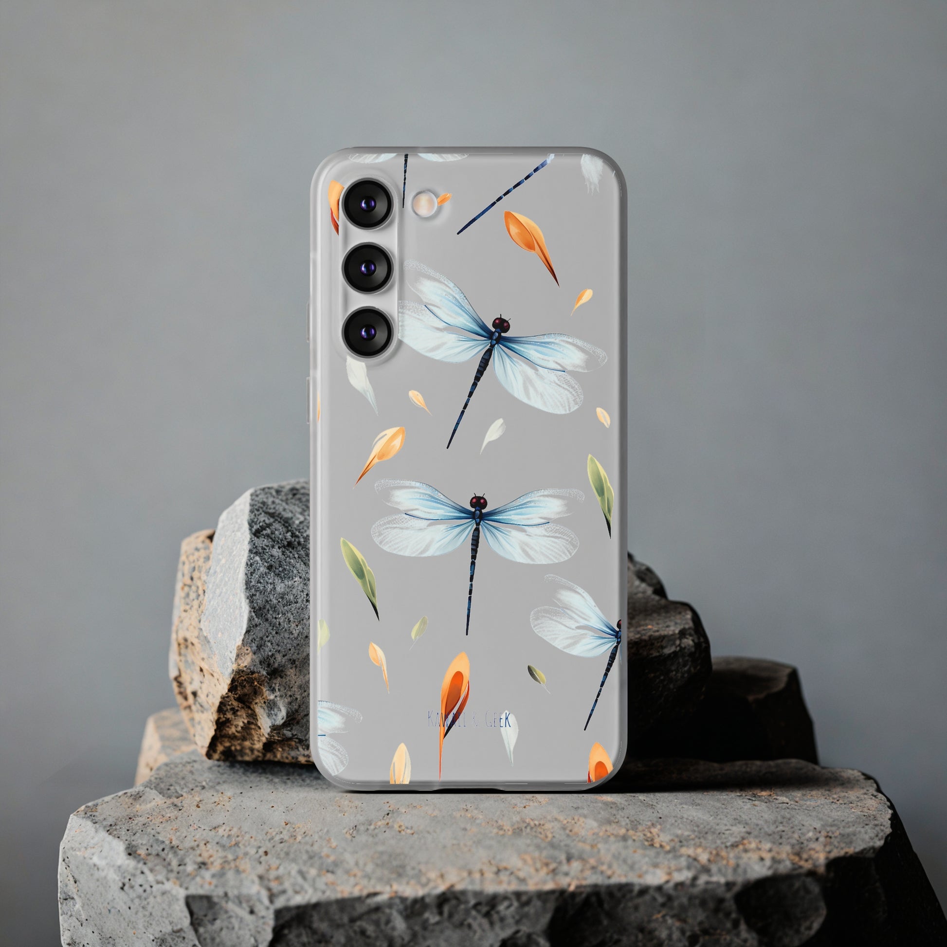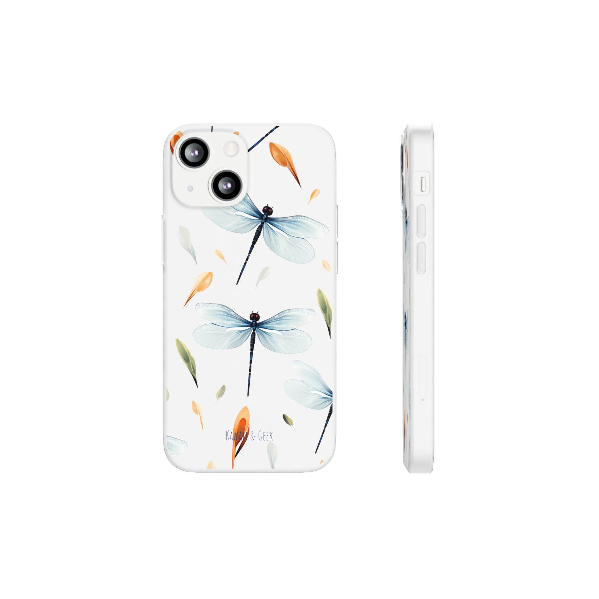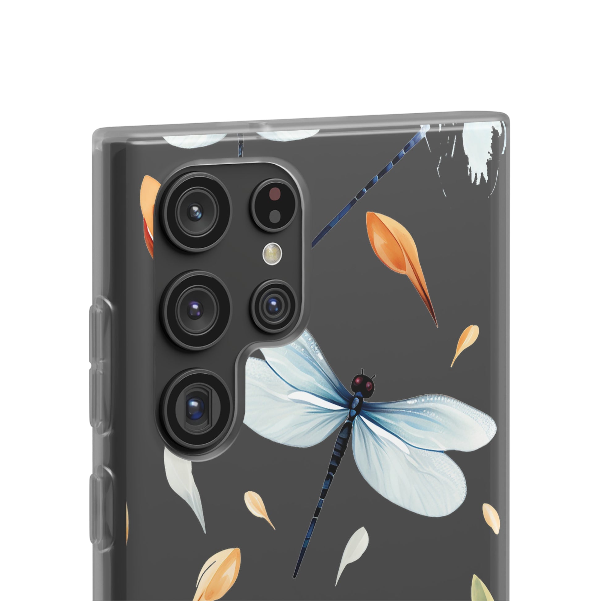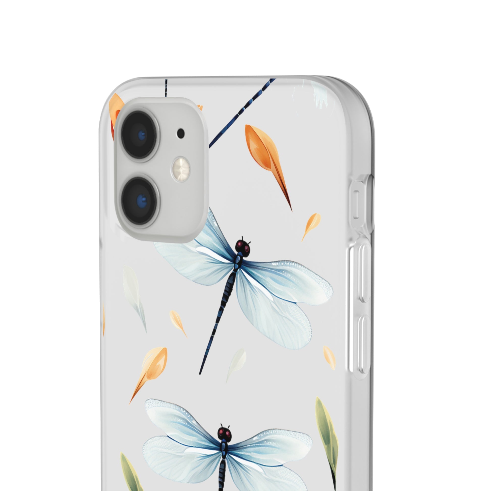 Keywords: Dragonfly design, Flexi case, Transparent cover, Ethereal style, Nature inspired, Lightweight case, Phone protection, Trendy design, Nature lover, Durable material, Minimalist style, Delicate print, Insect theme.
