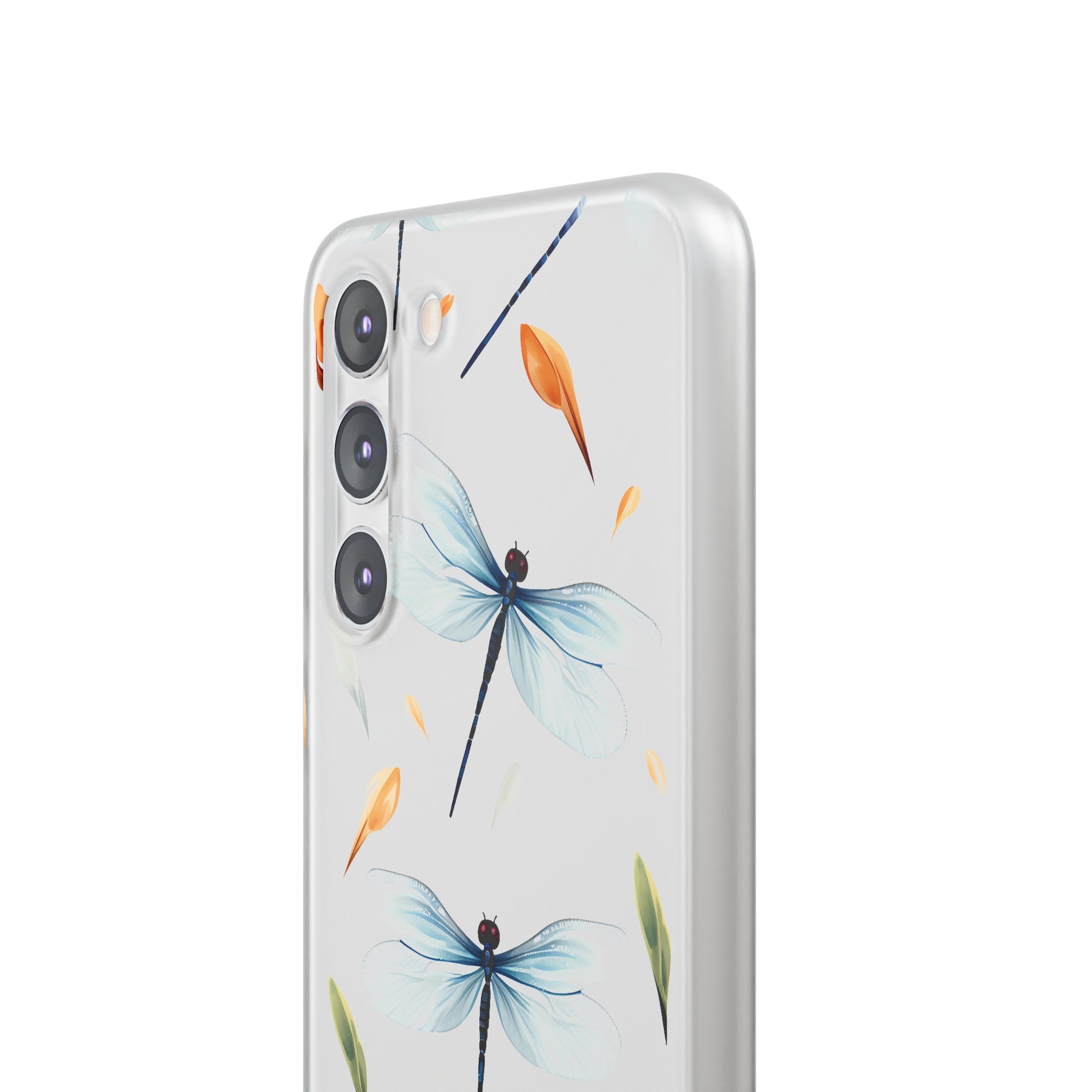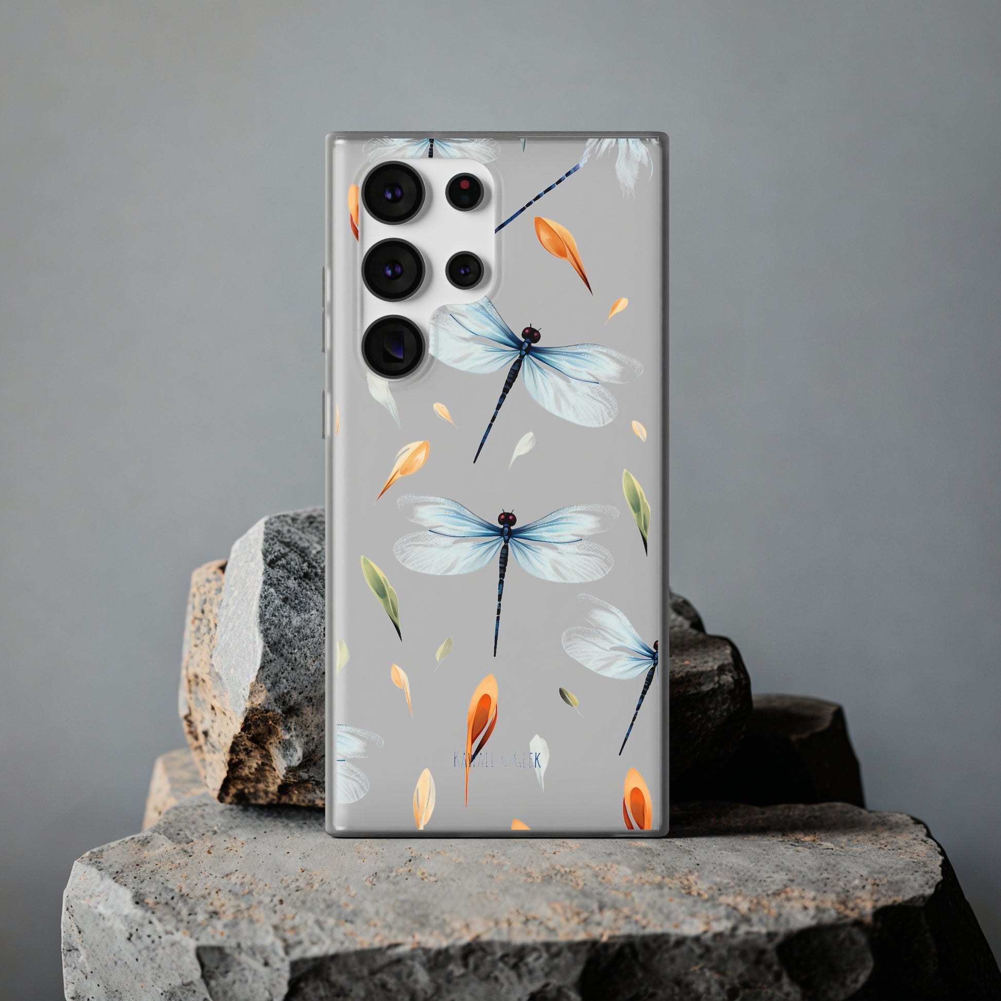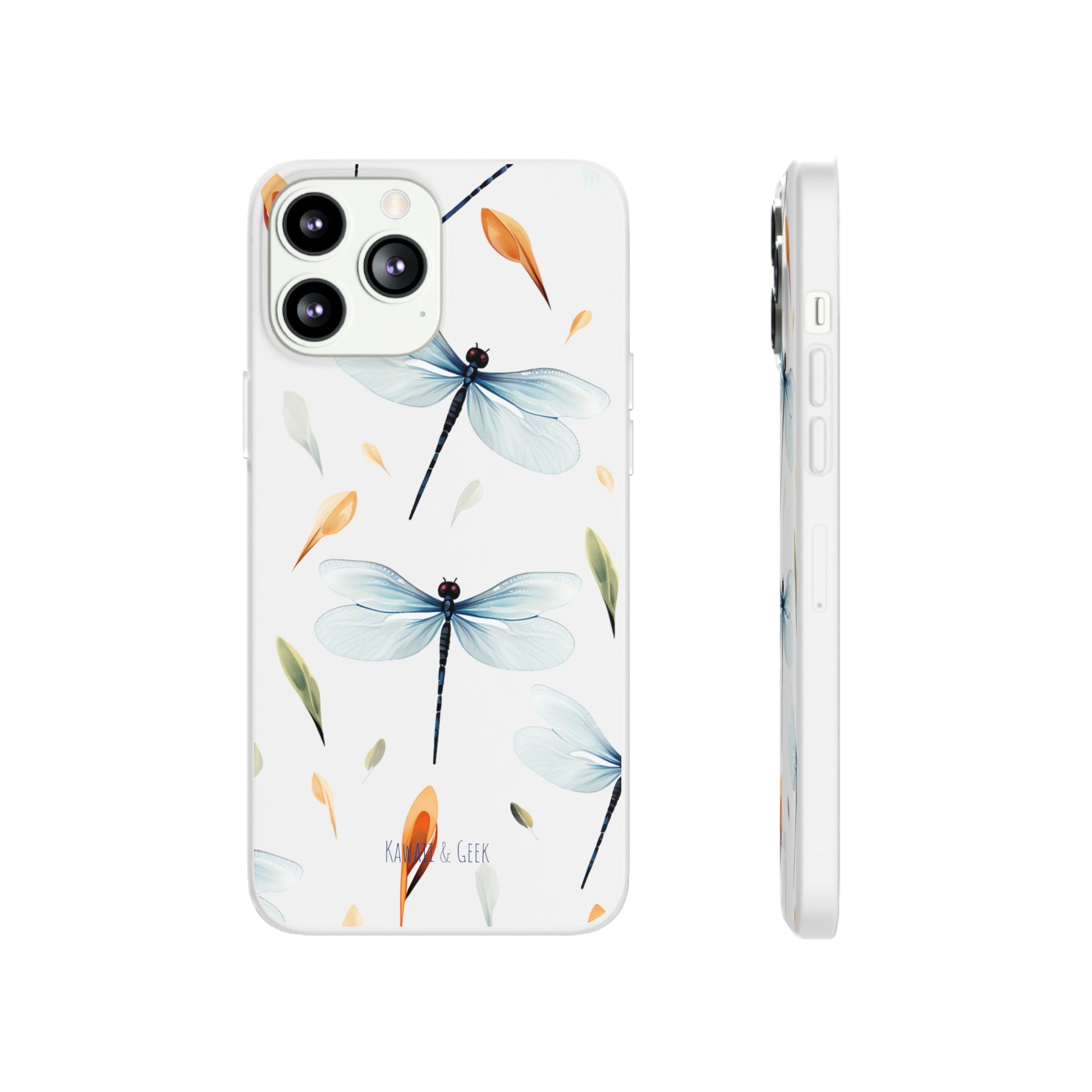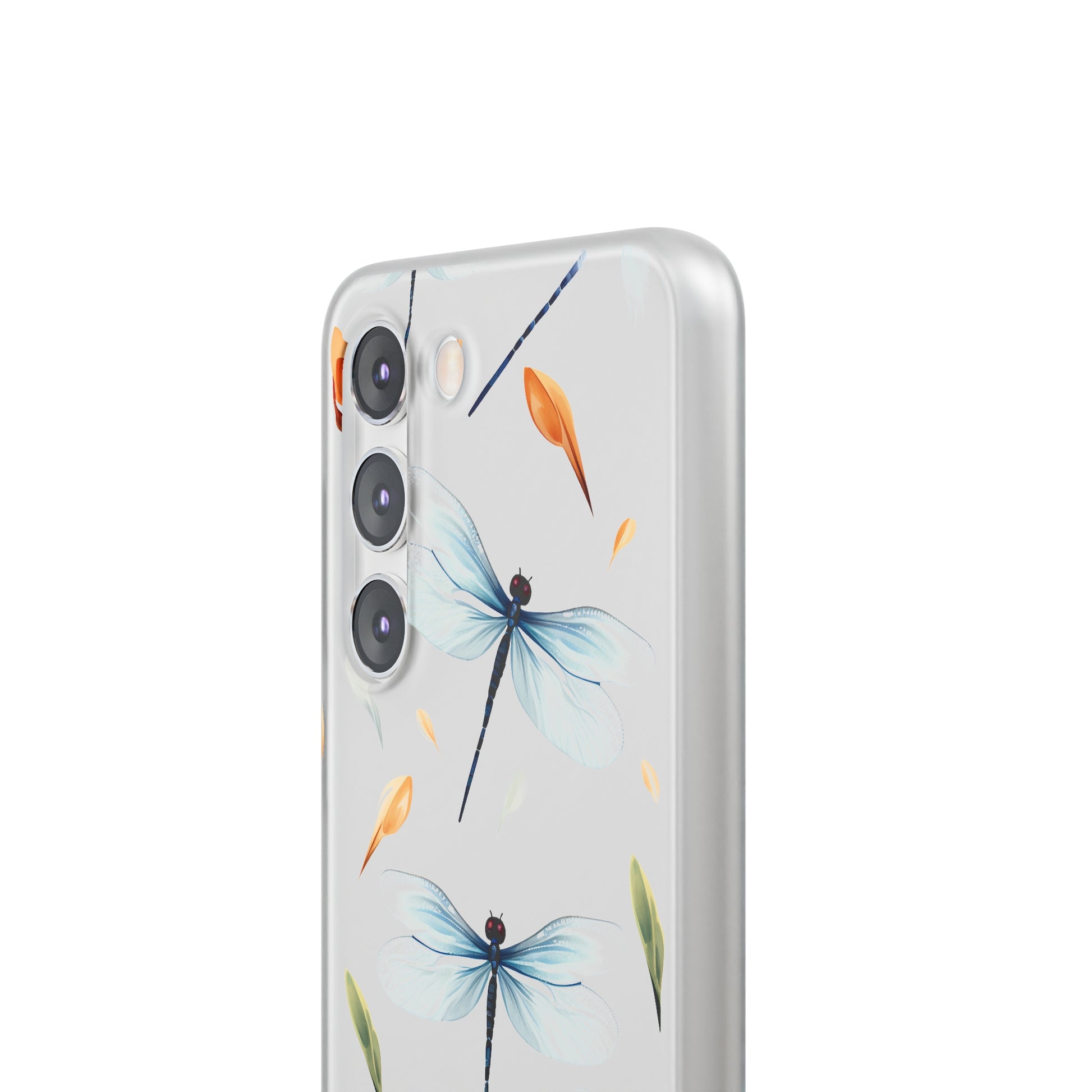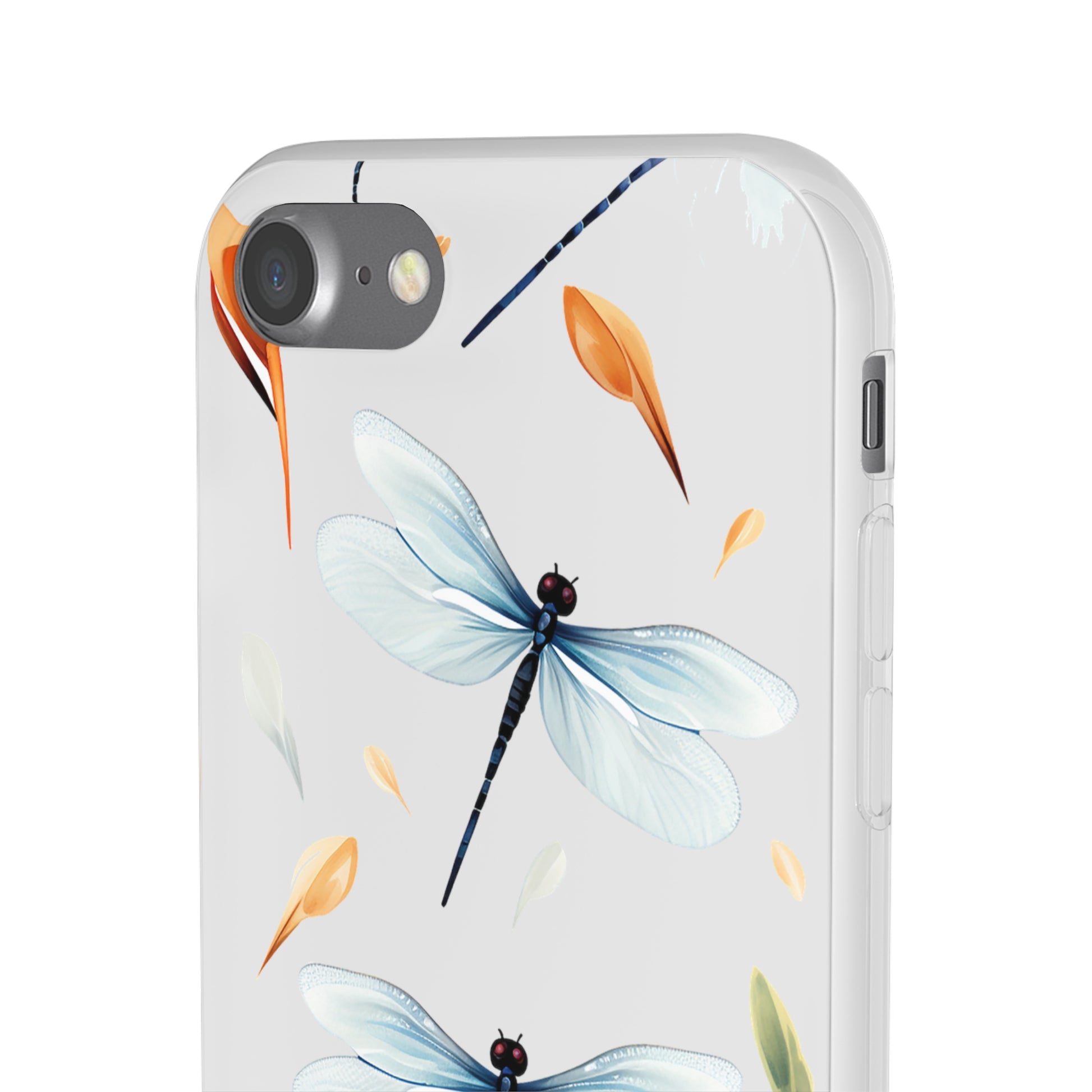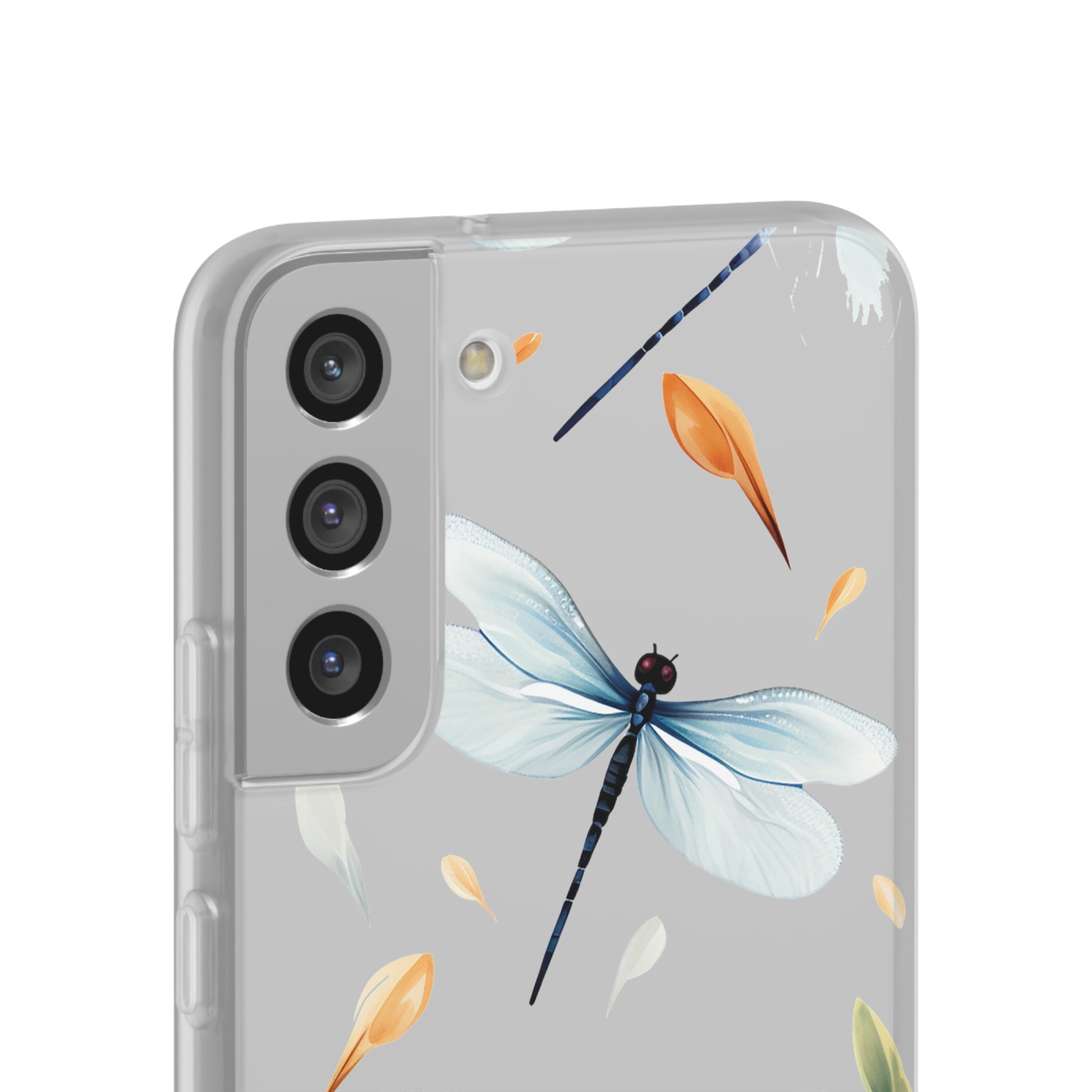 Keywords: Dragonfly design, Flexi case, Transparent cover, Ethereal style, Nature inspired, Lightweight case, Phone protection, Trendy design, Nature lover, Durable material, Minimalist style, Delicate print, Insect theme.