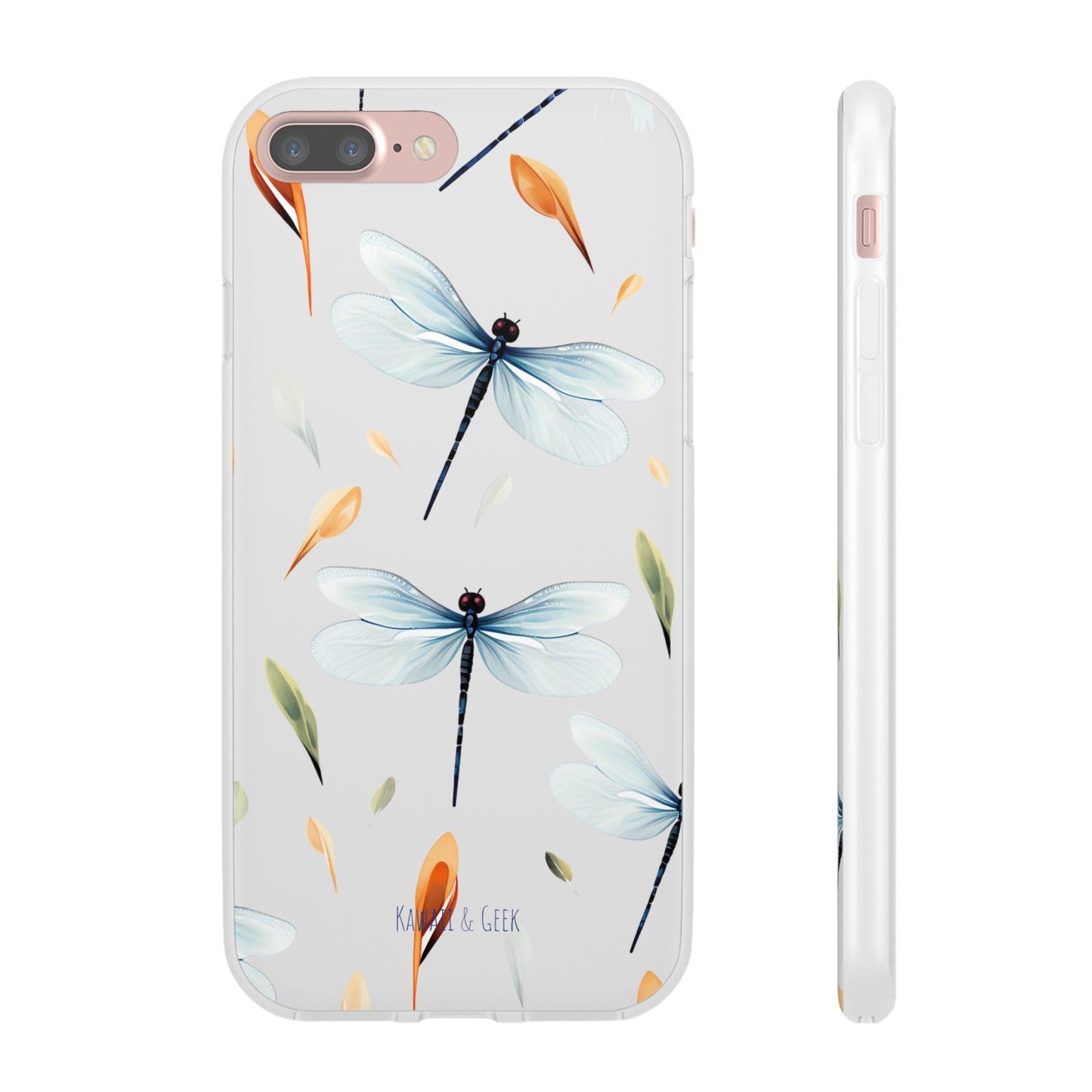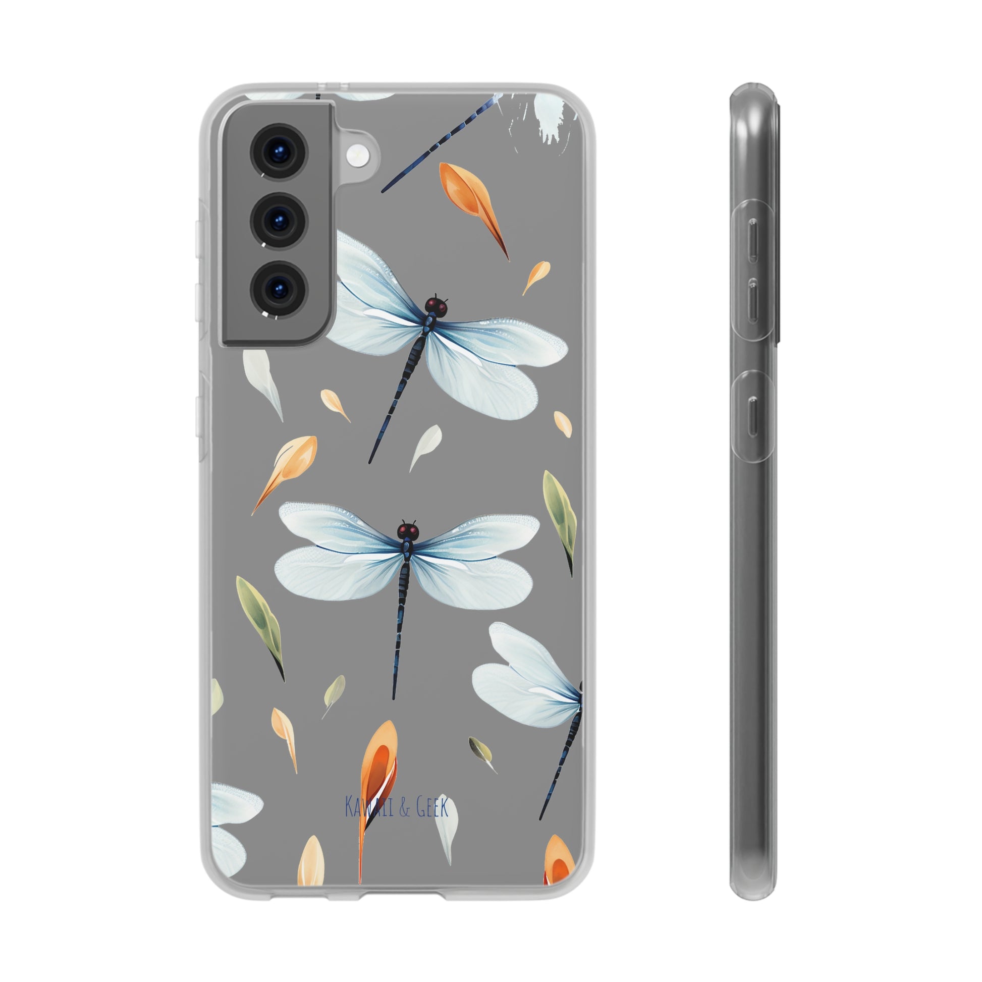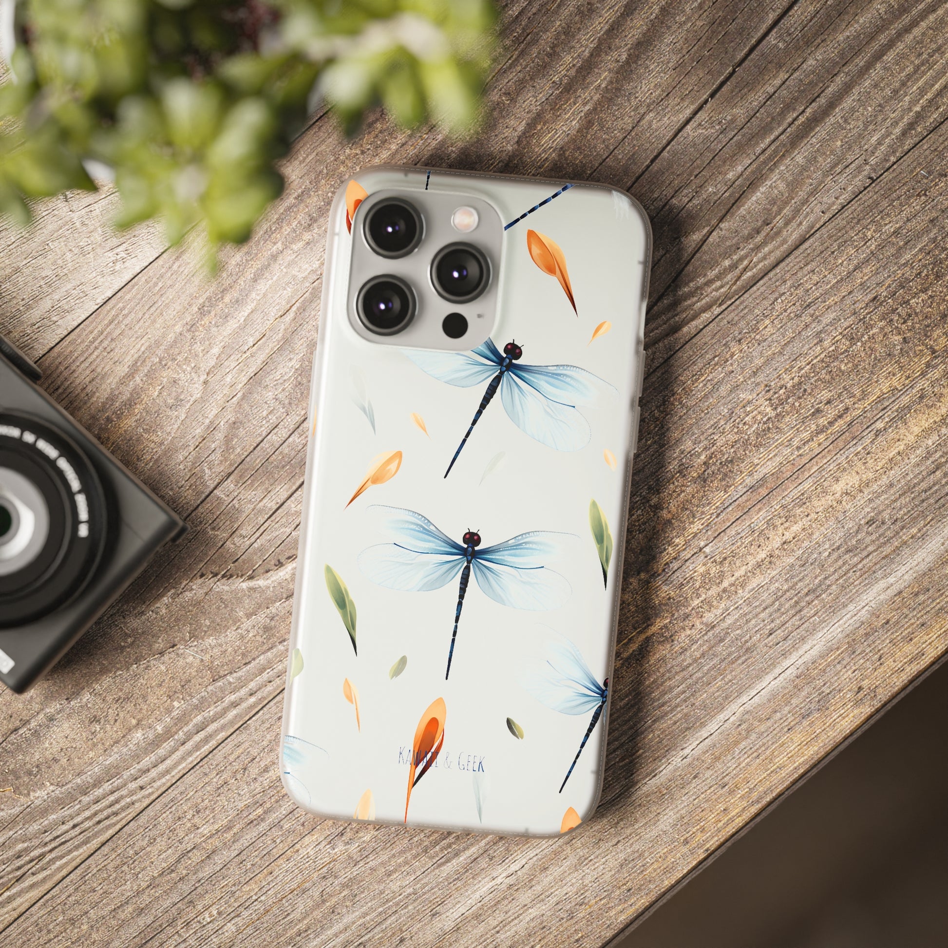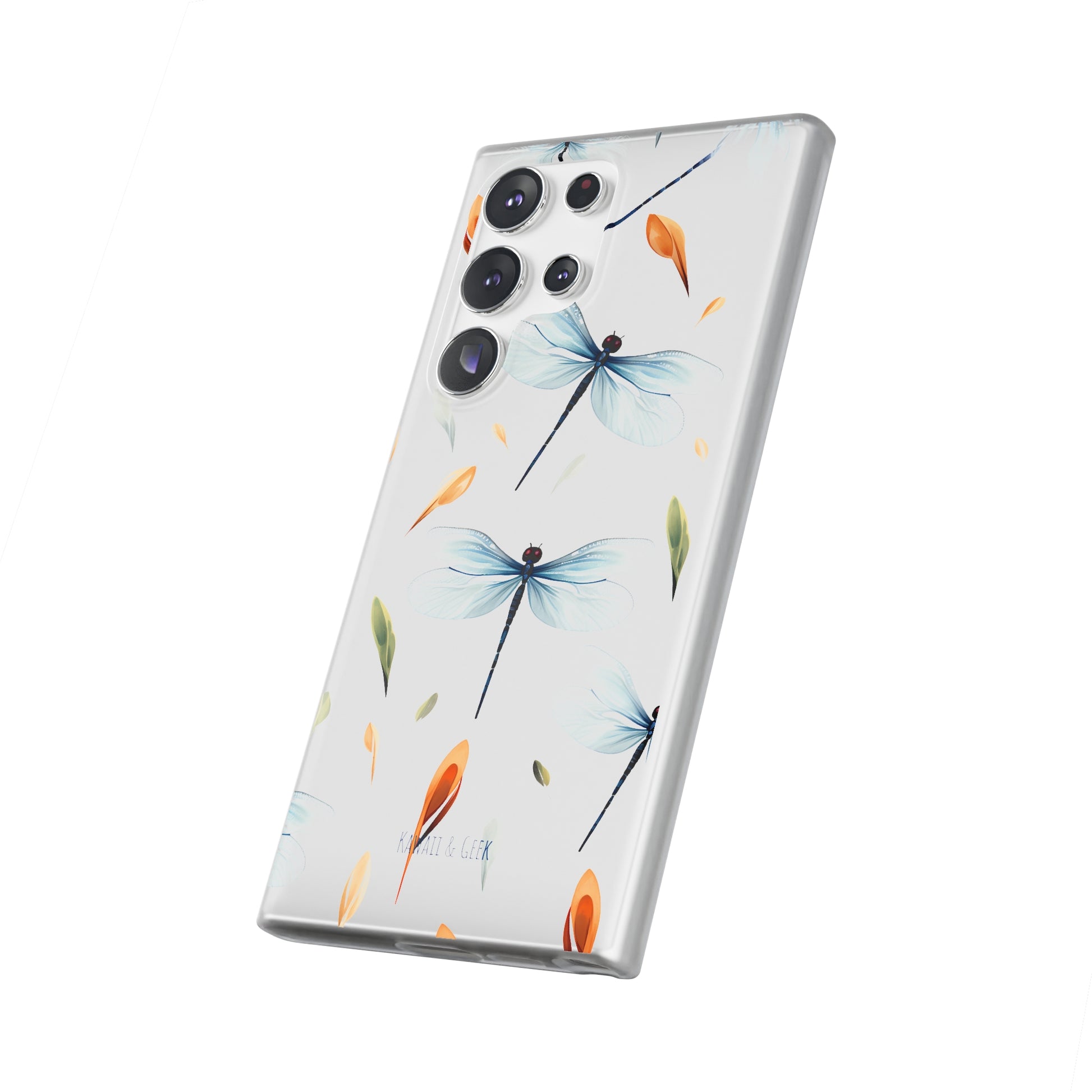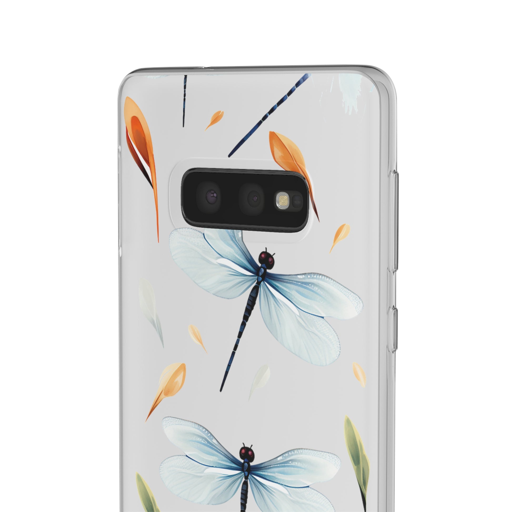 Keywords: Dragonfly design, Flexi case, Transparent cover, Ethereal style, Nature inspired, Lightweight case, Phone protection, Trendy design, Nature lover, Durable material, Minimalist style, Delicate print, Insect theme.