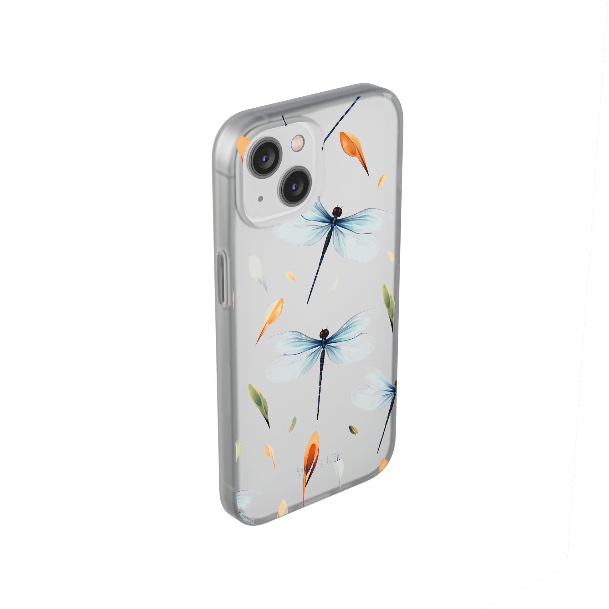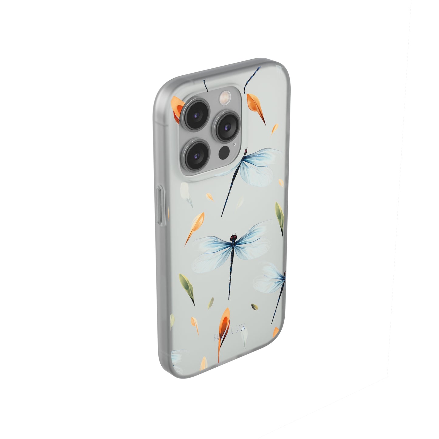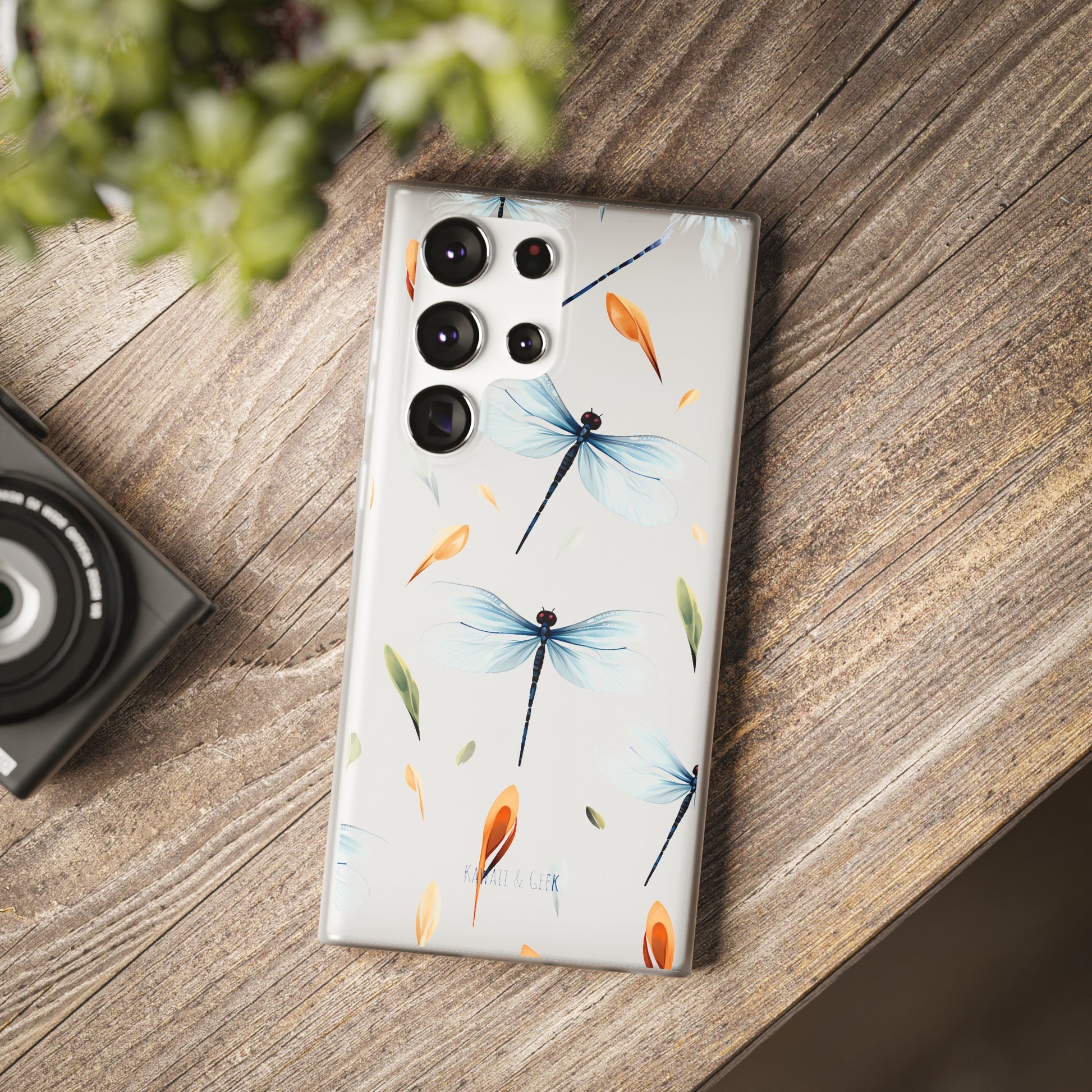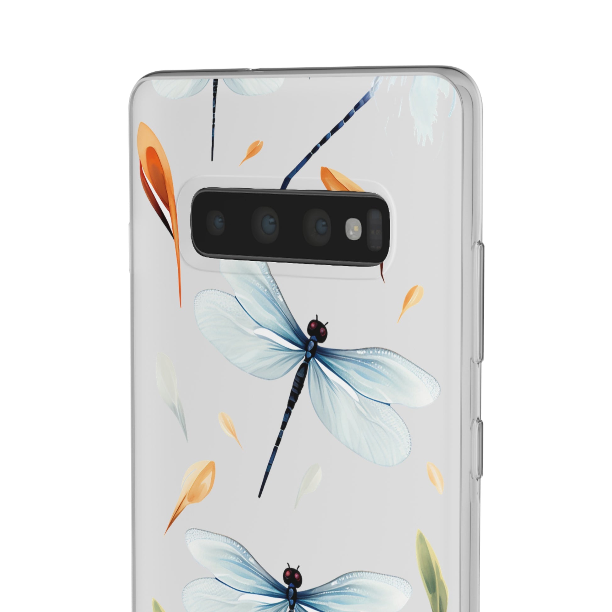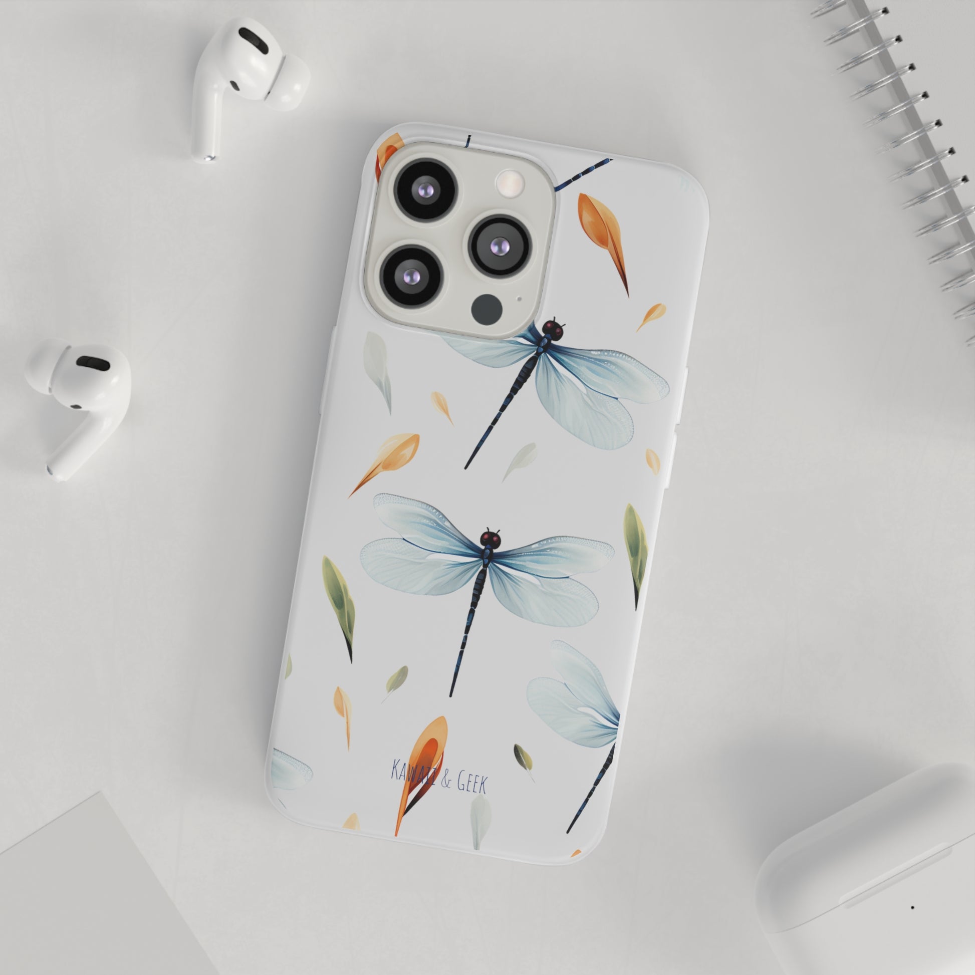 Keywords: Dragonfly design, Flexi case, Transparent cover, Ethereal style, Nature inspired, Lightweight case, Phone protection, Trendy design, Nature lover, Durable material, Minimalist style, Delicate print, Insect theme.