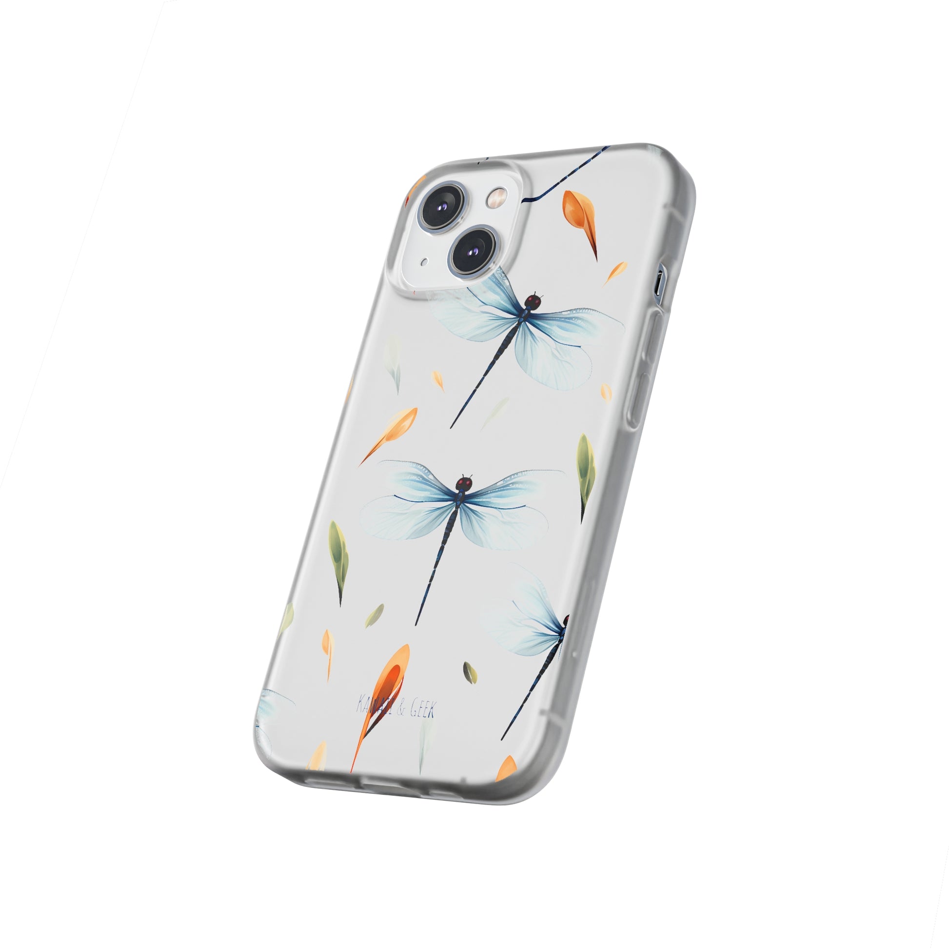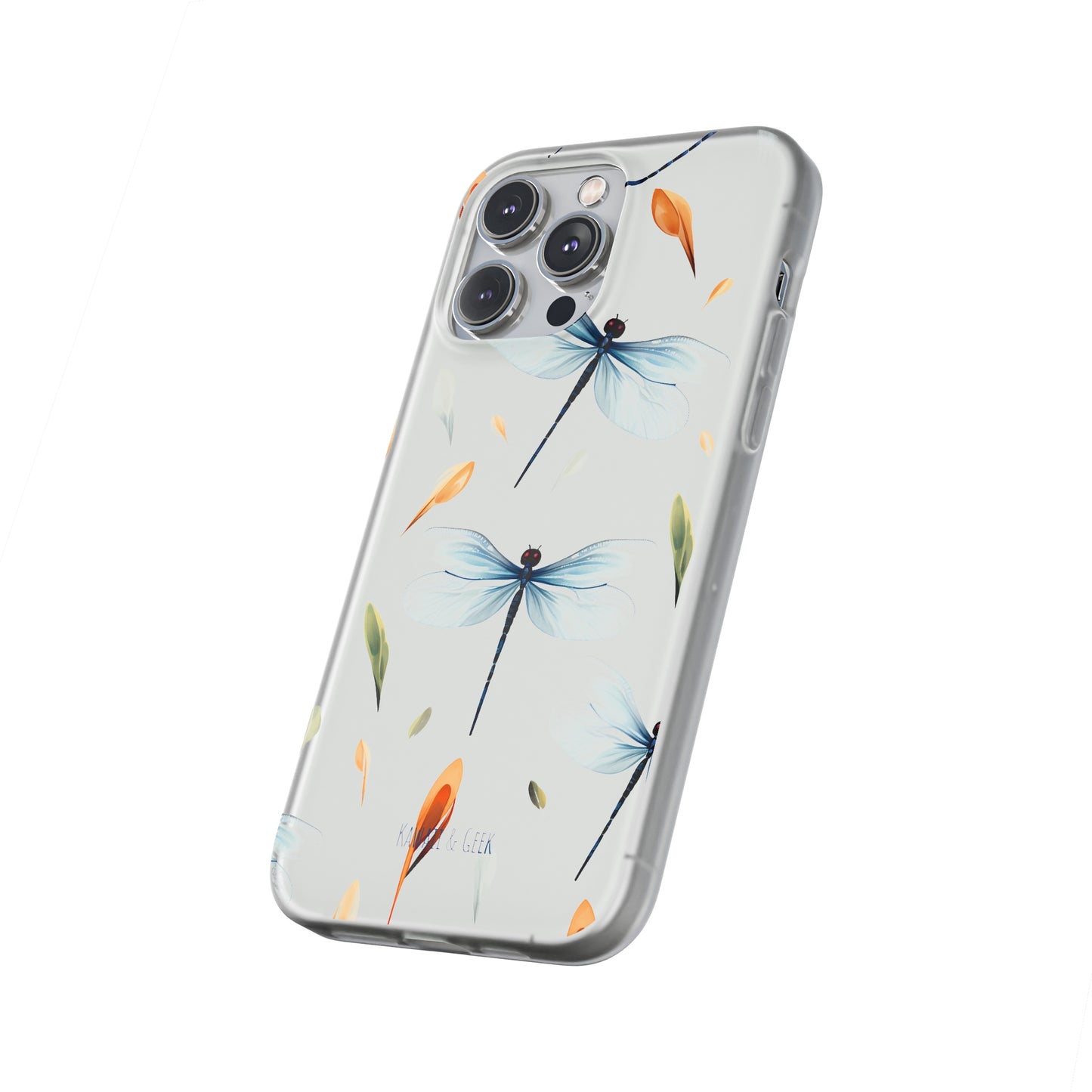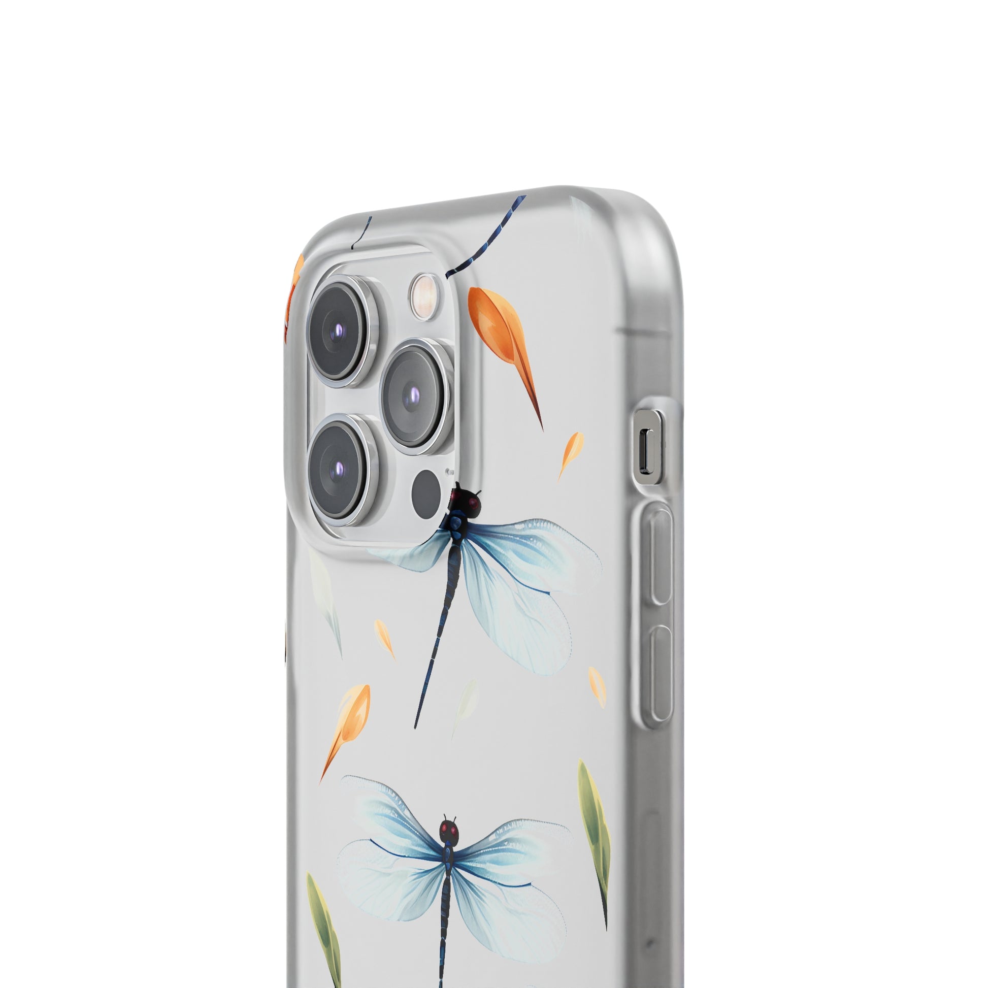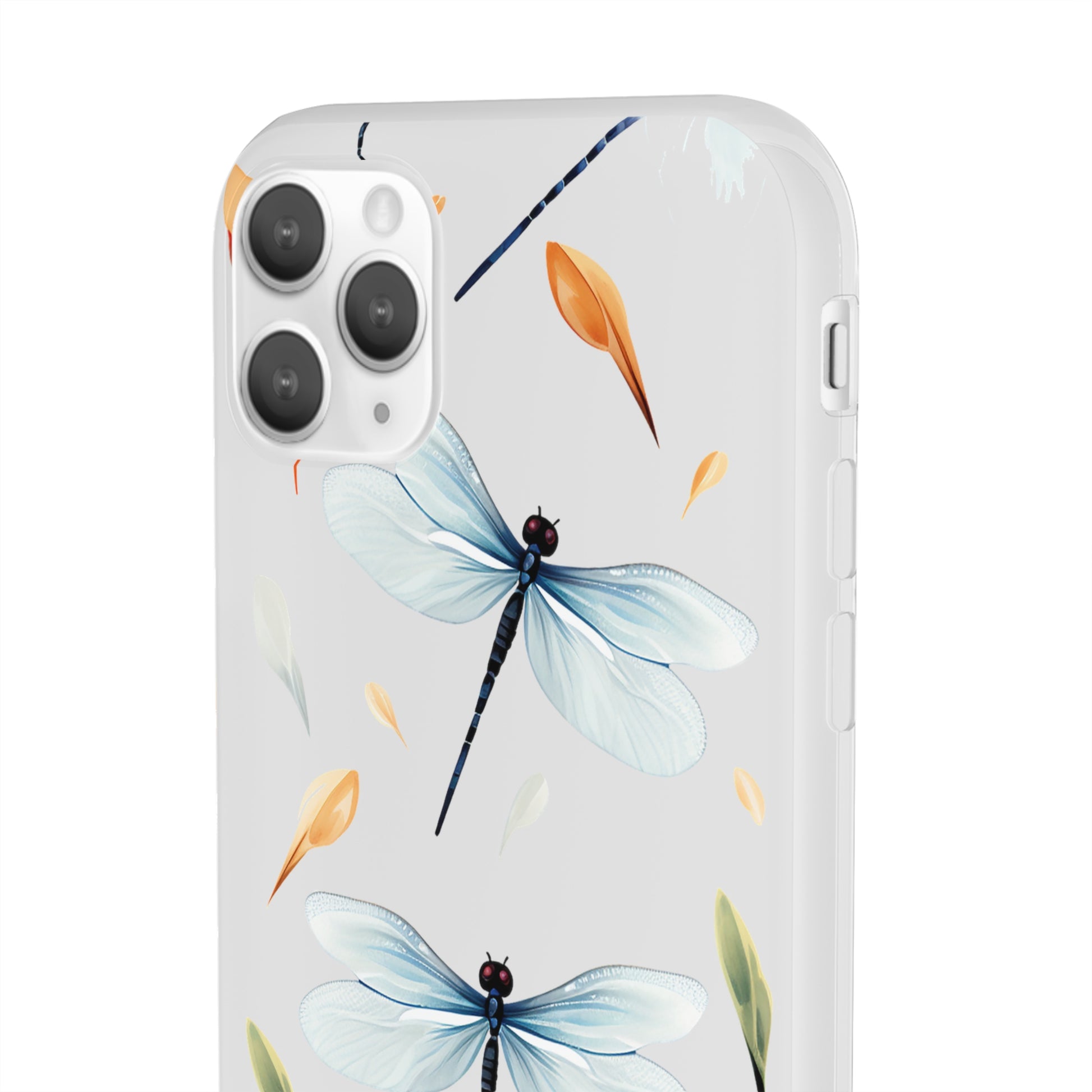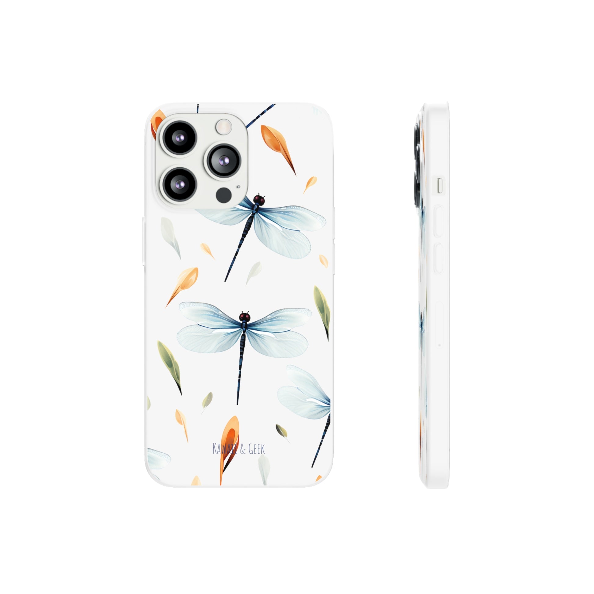 Keywords: Dragonfly design, Flexi case, Transparent cover, Ethereal style, Nature inspired, Lightweight case, Phone protection, Trendy design, Nature lover, Durable material, Minimalist style, Delicate print, Insect theme.