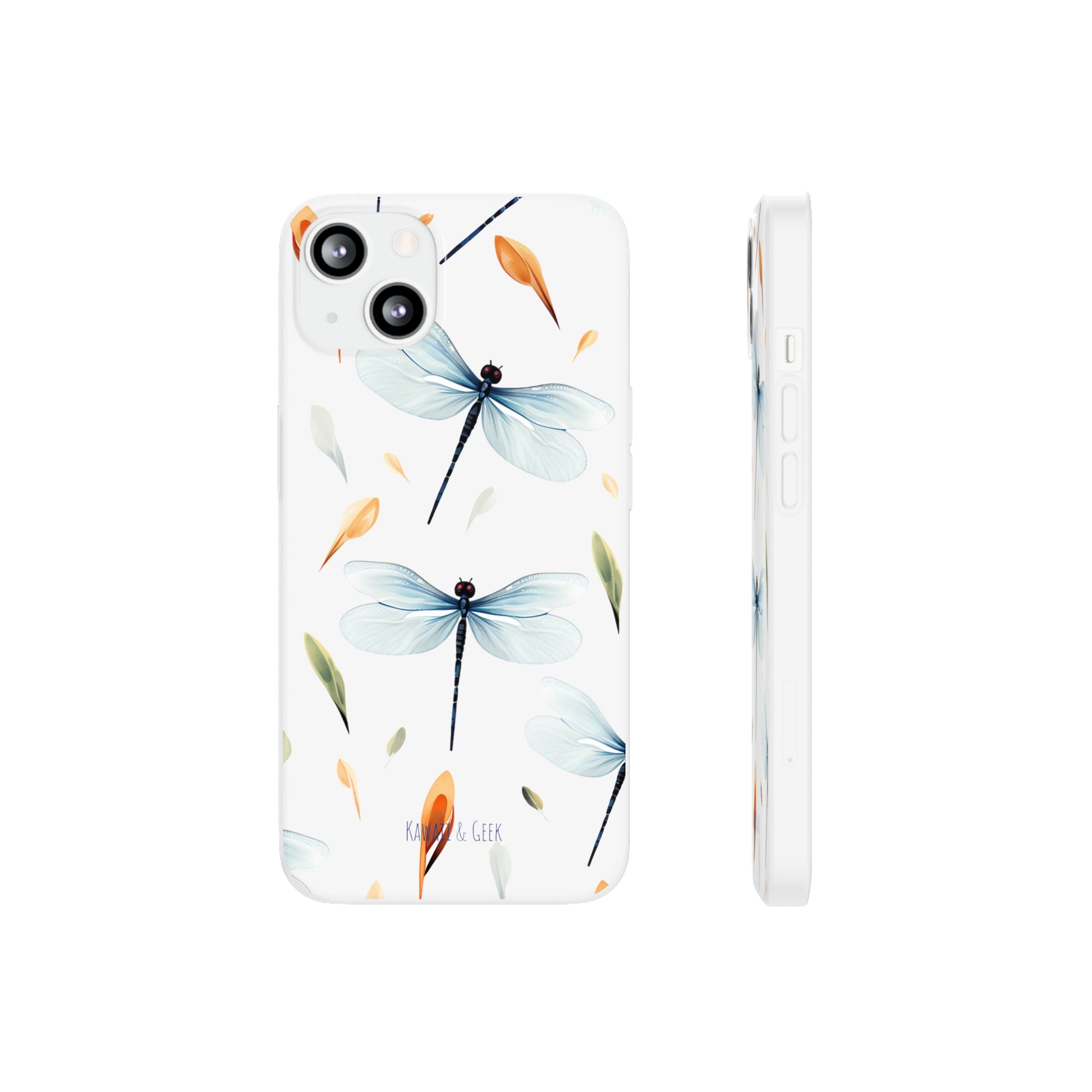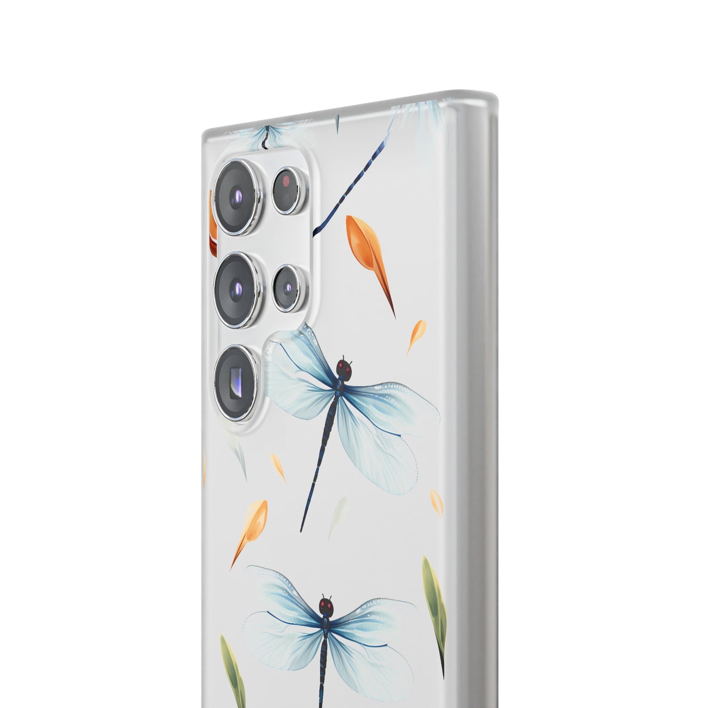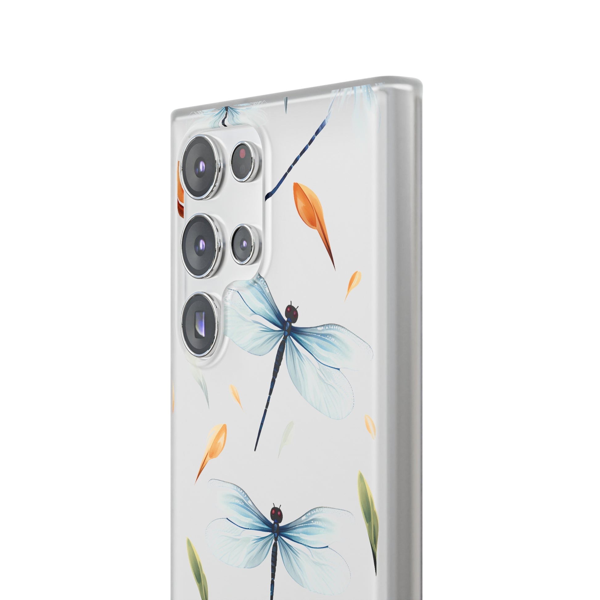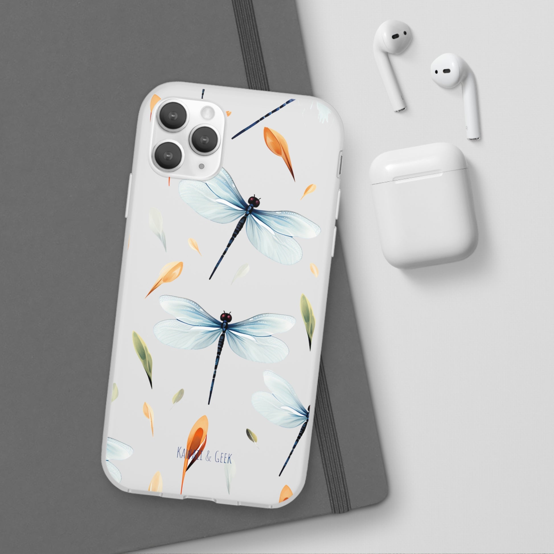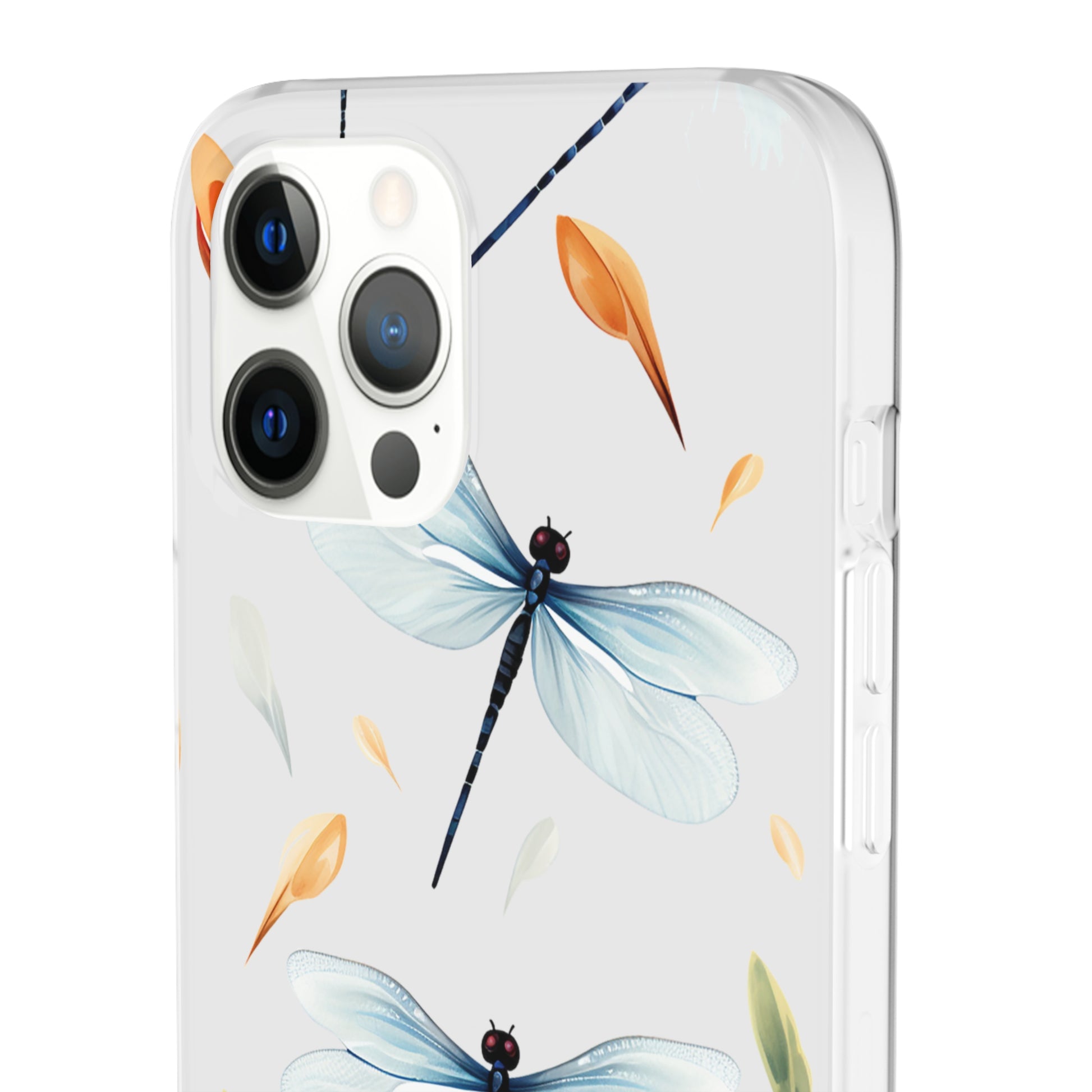Keywords: Dragonfly design, Flexi case, Transparent cover, Ethereal style, Nature inspired, Lightweight case, Phone protection, Trendy design, Nature lover, Durable material, Minimalist style, Delicate print, Insect theme.