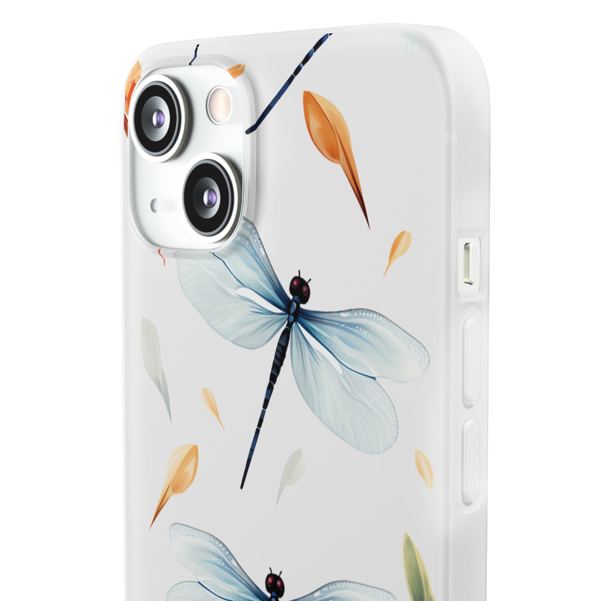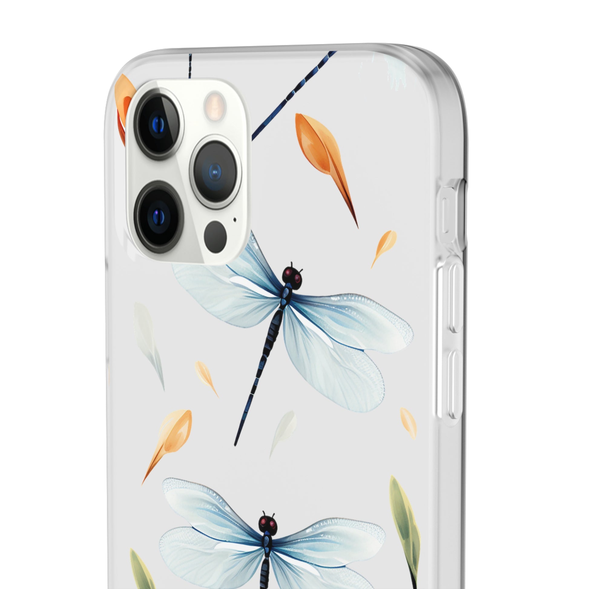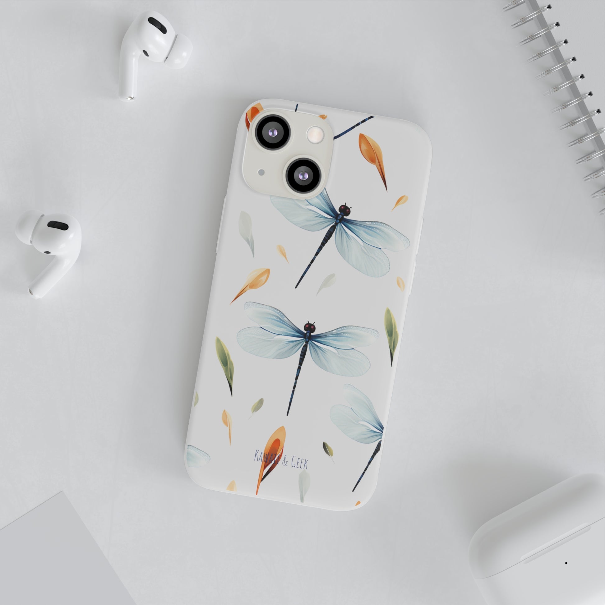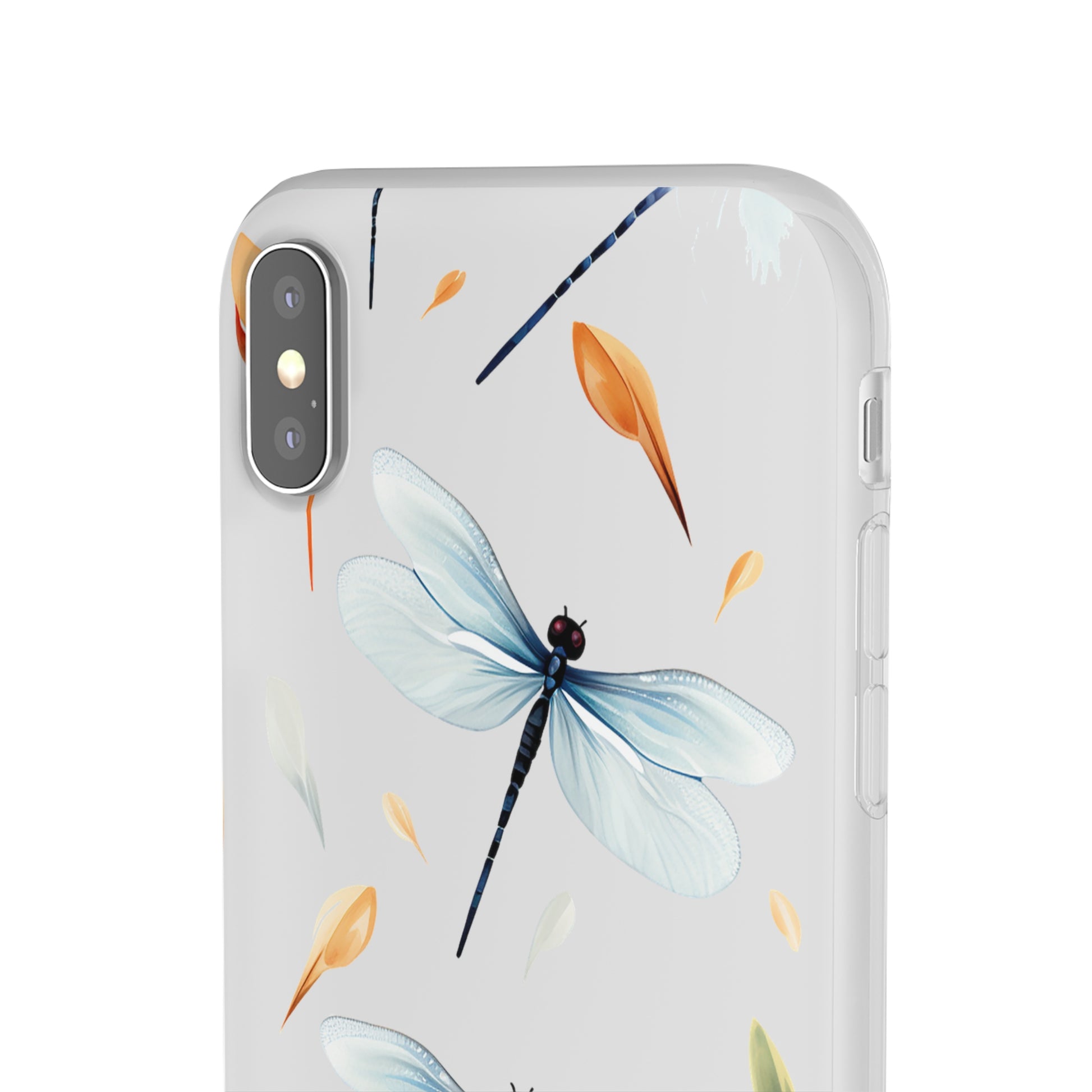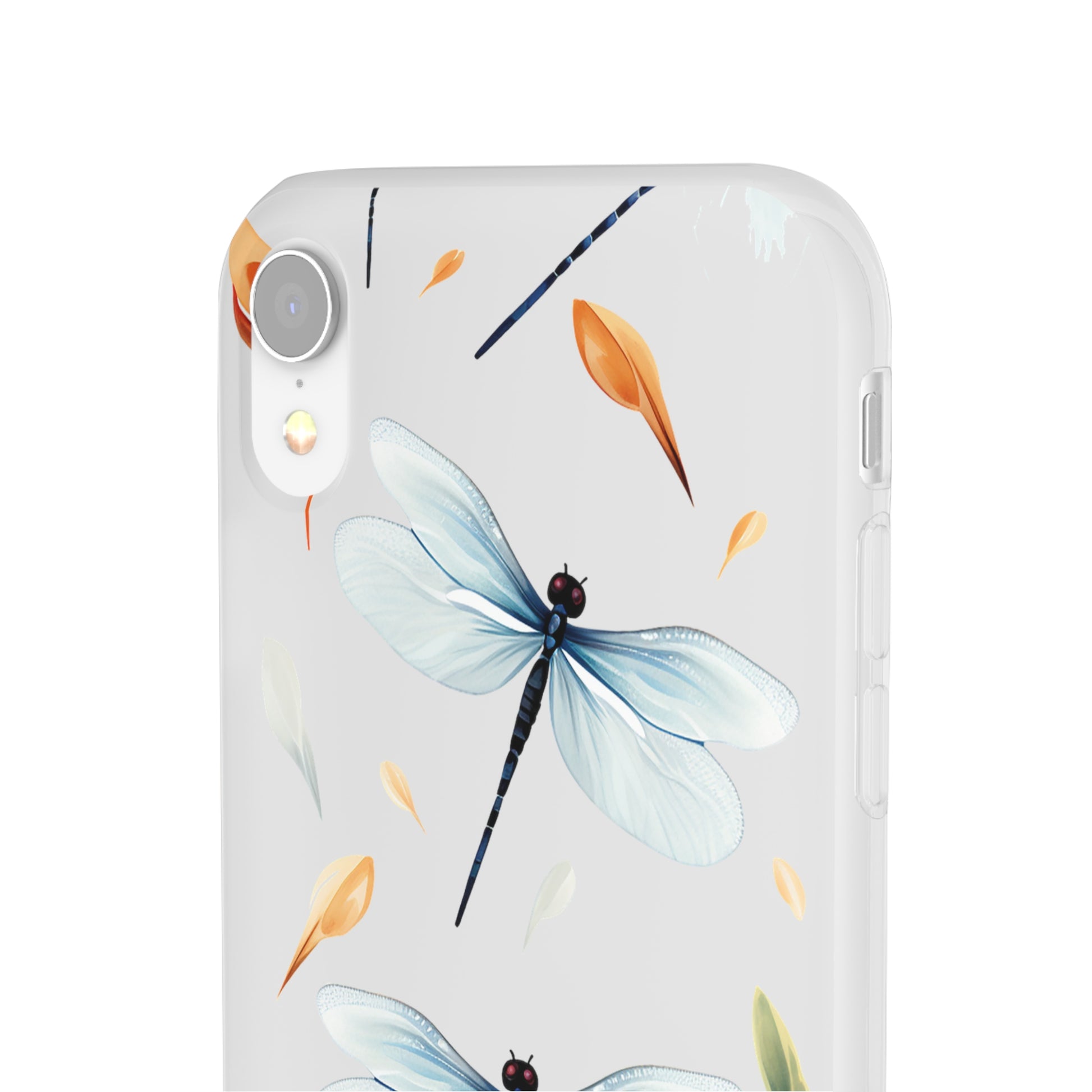 Keywords: Dragonfly design, Flexi case, Transparent cover, Ethereal style, Nature inspired, Lightweight case, Phone protection, Trendy design, Nature lover, Durable material, Minimalist style, Delicate print, Insect theme.