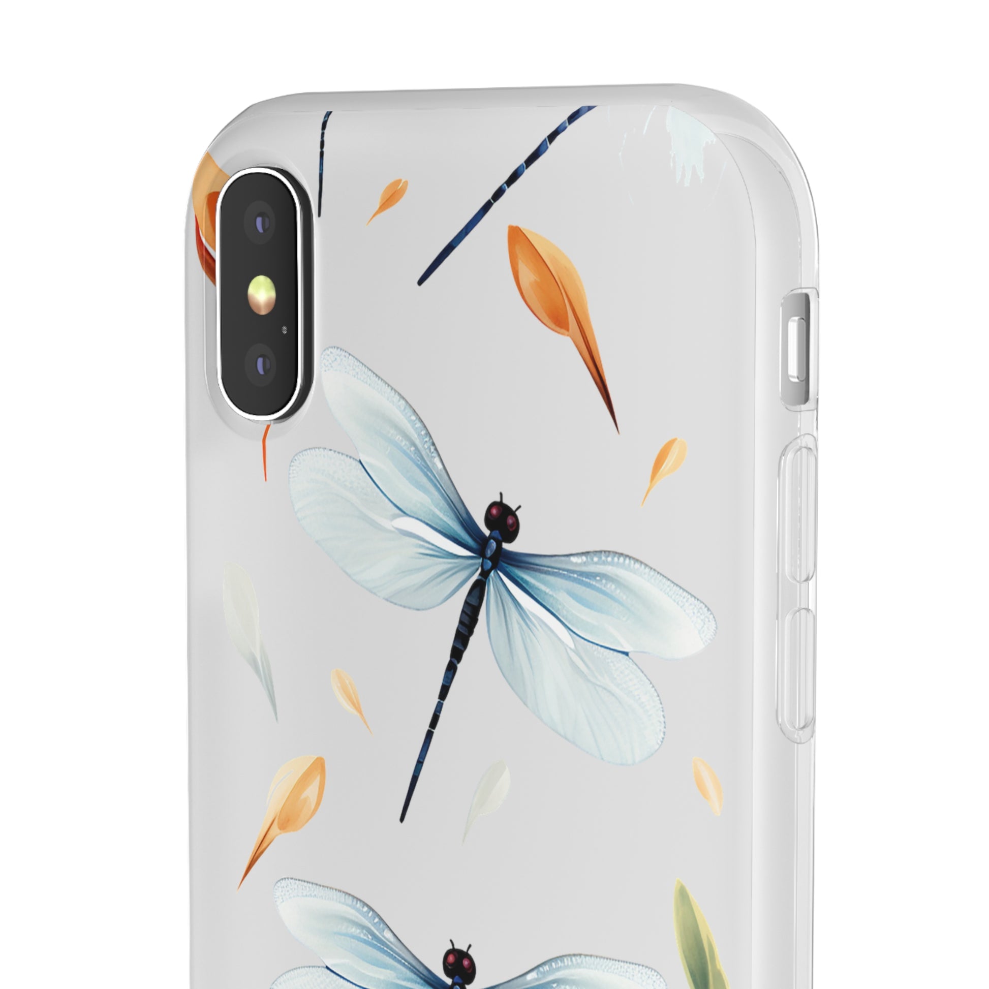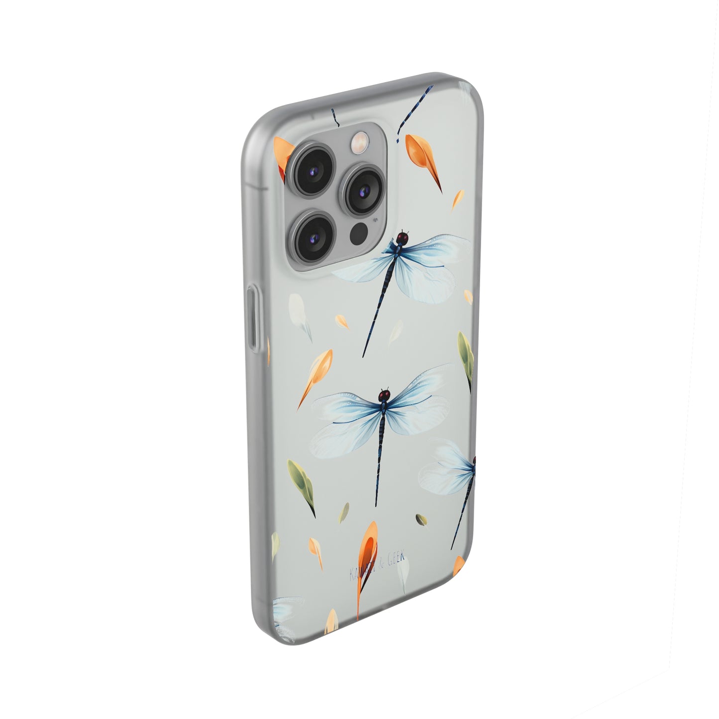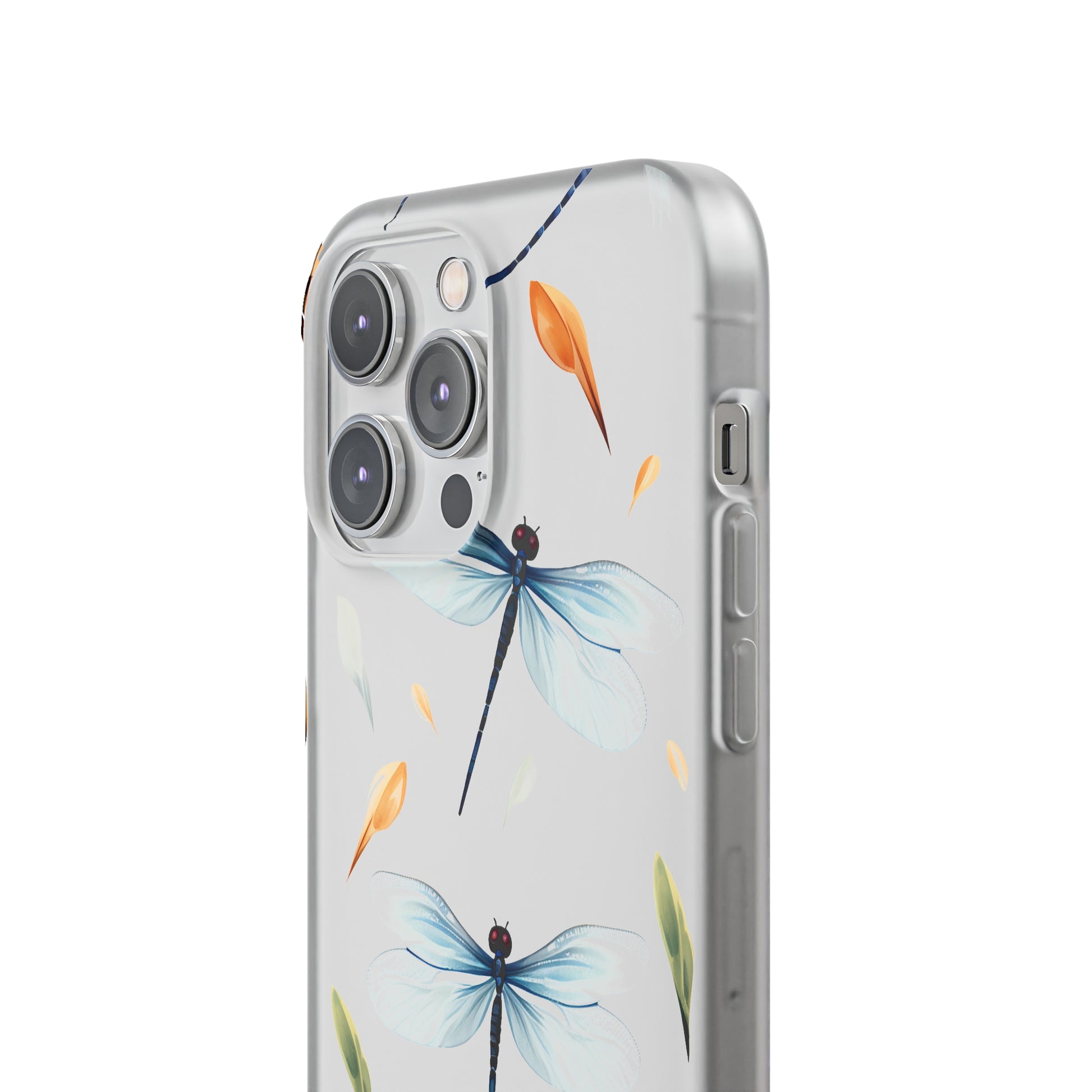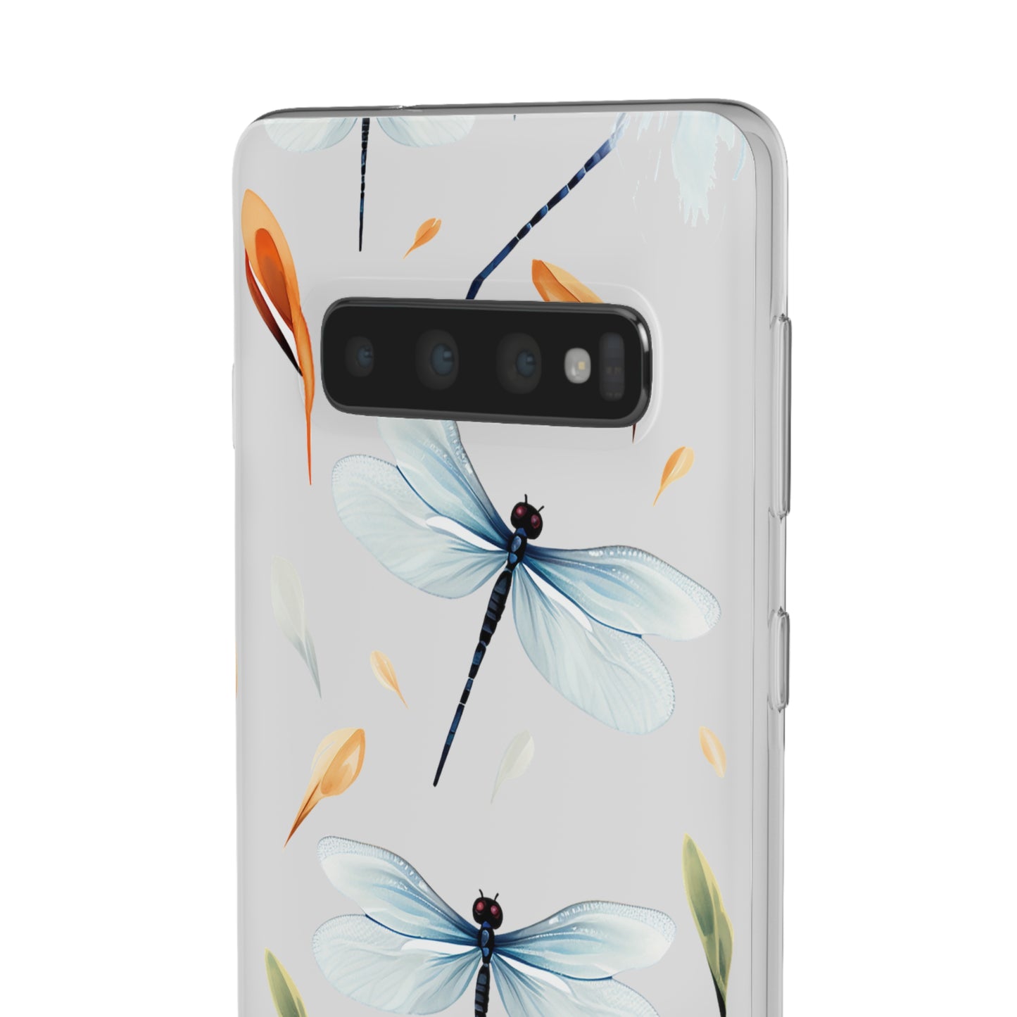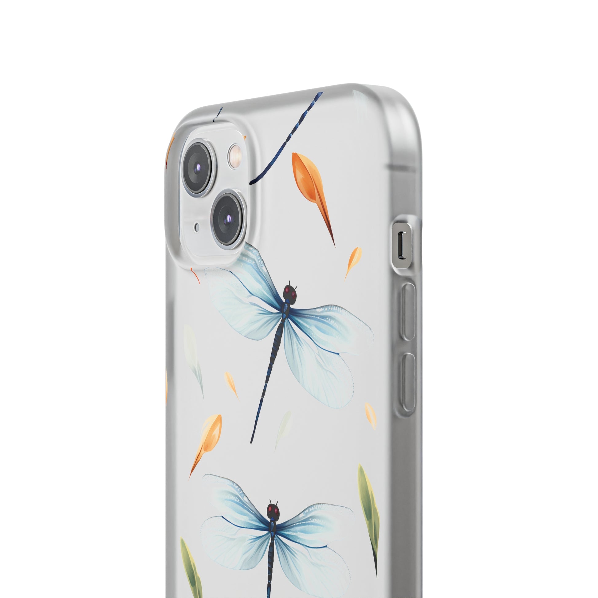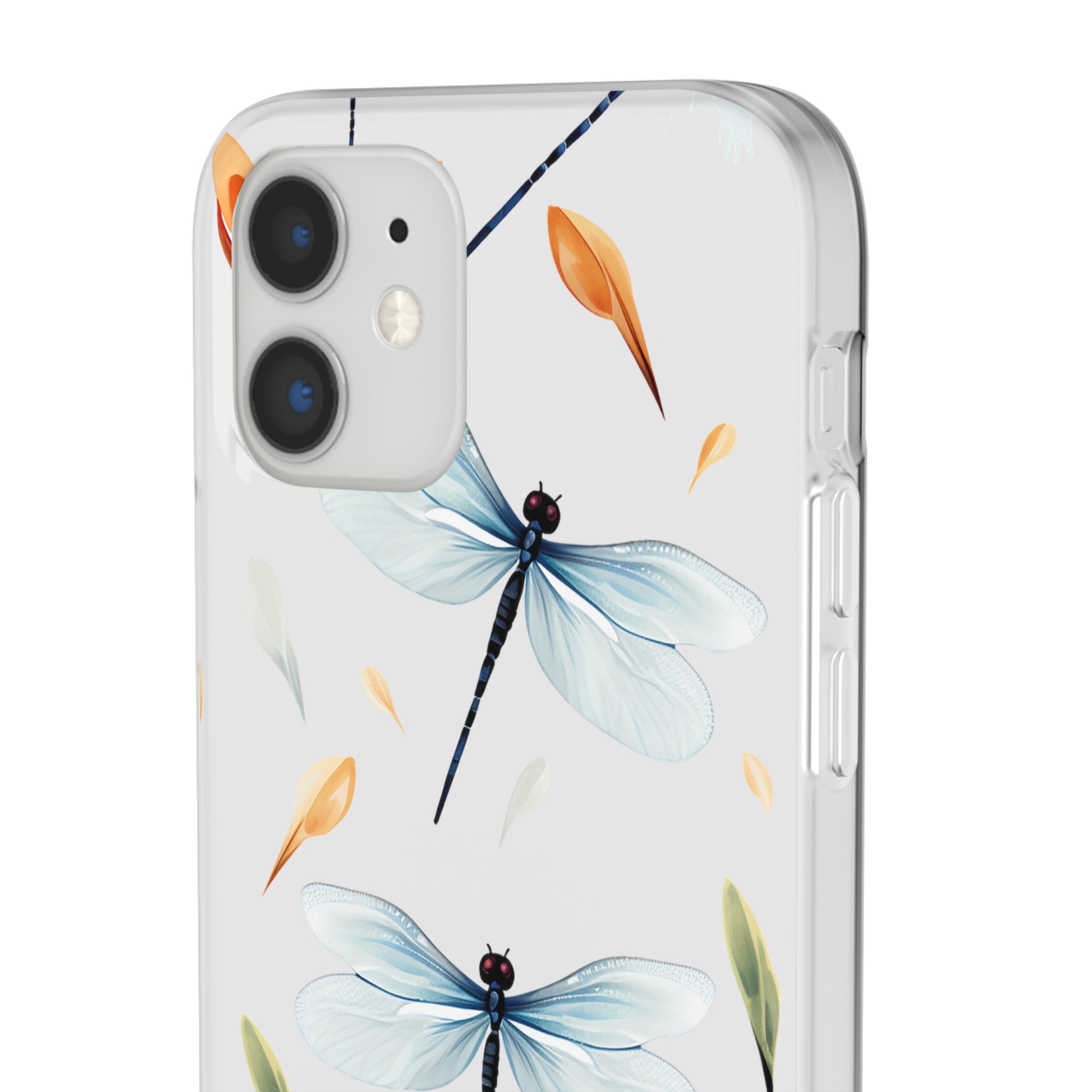 Keywords: Dragonfly design, Flexi case, Transparent cover, Ethereal style, Nature inspired, Lightweight case, Phone protection, Trendy design, Nature lover, Durable material, Minimalist style, Delicate print, Insect theme.