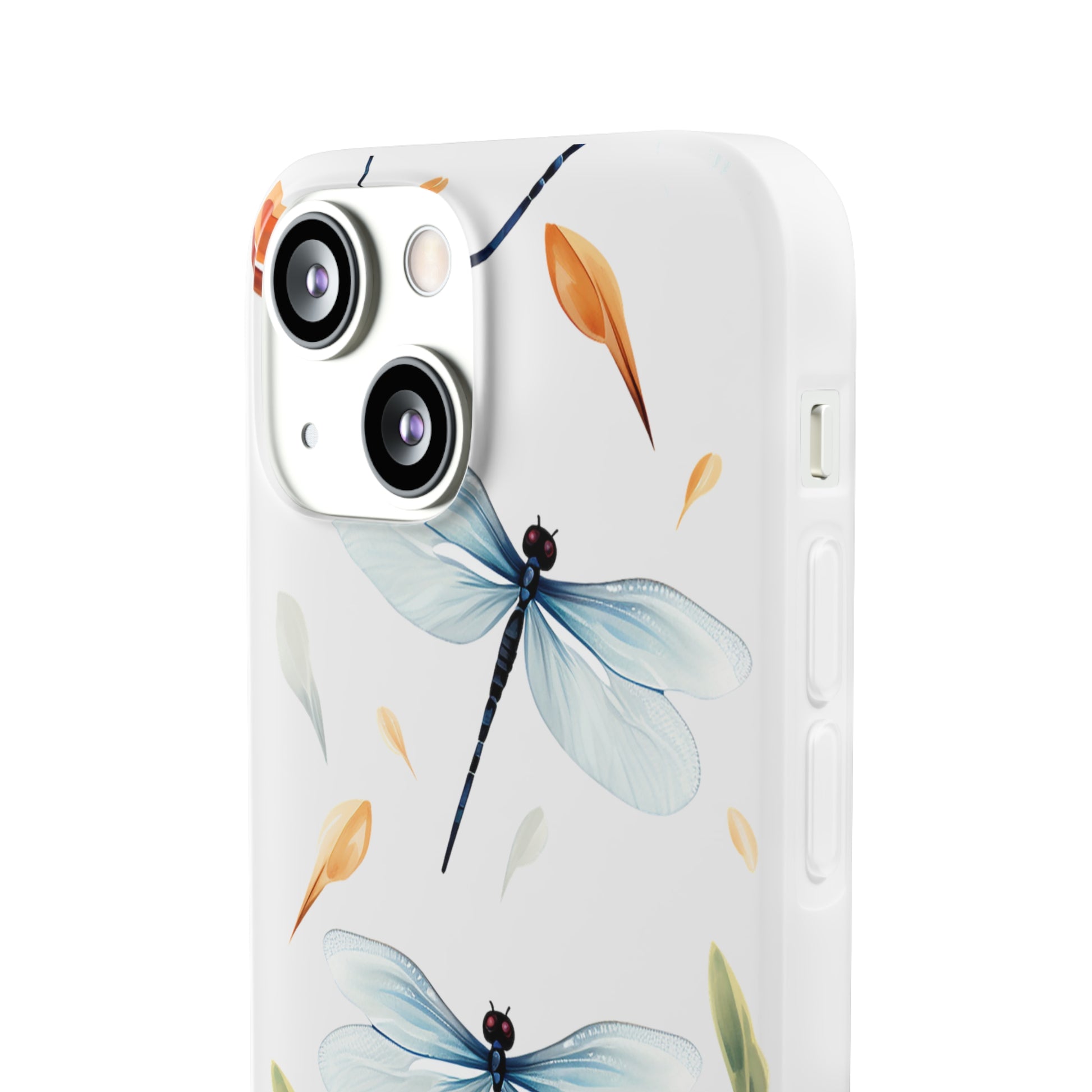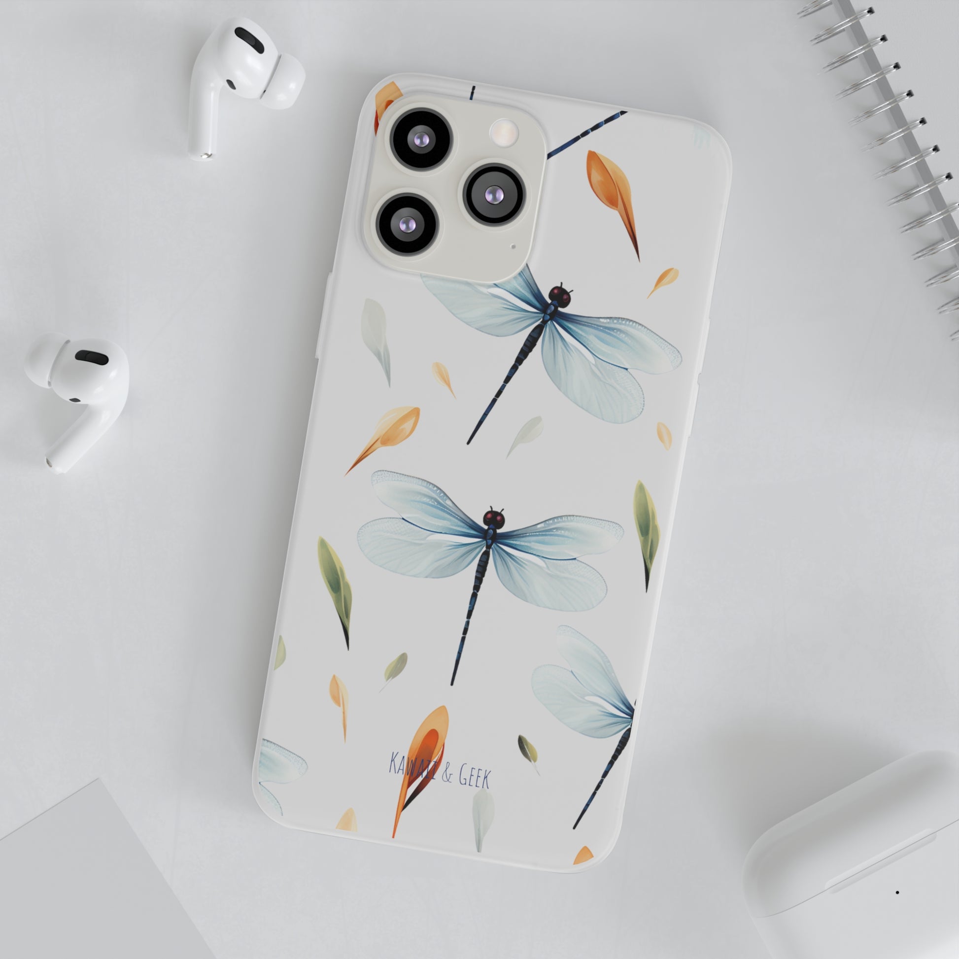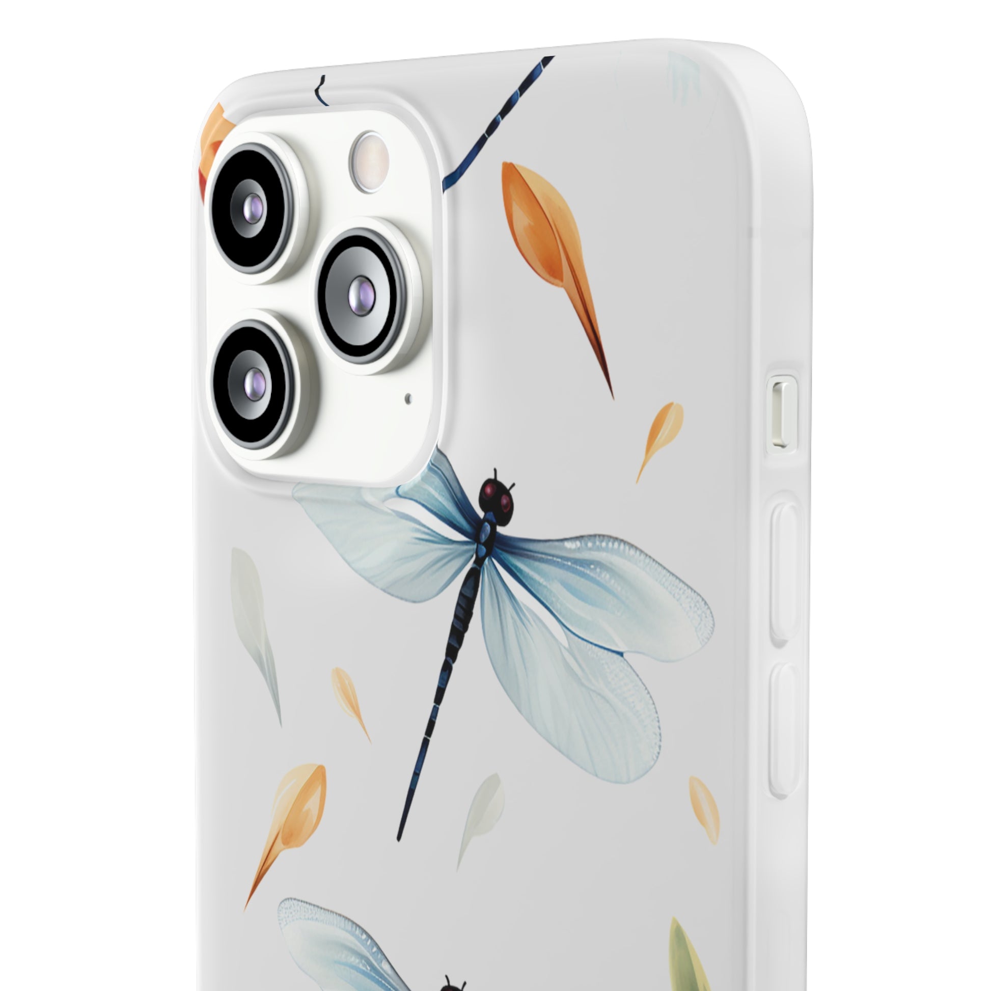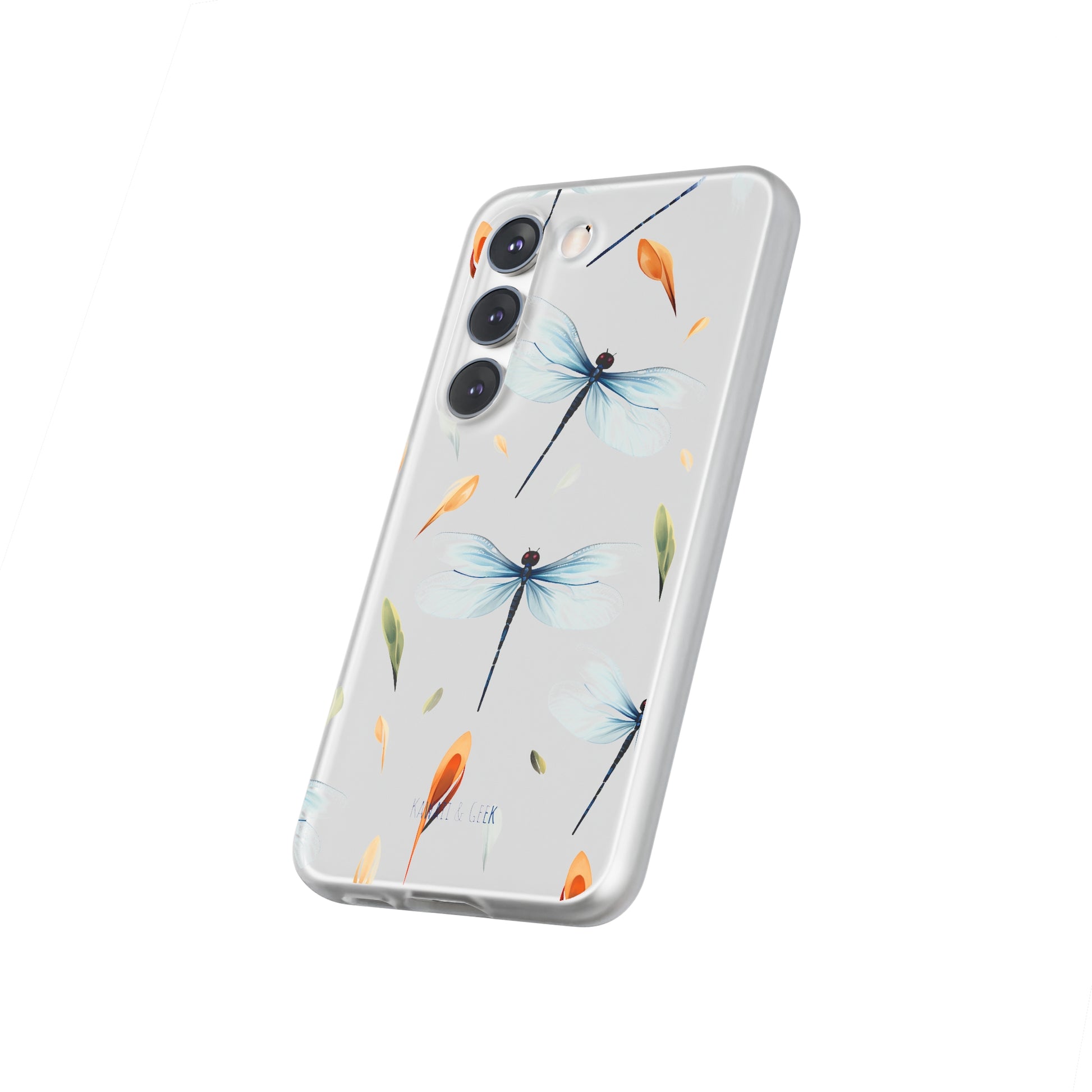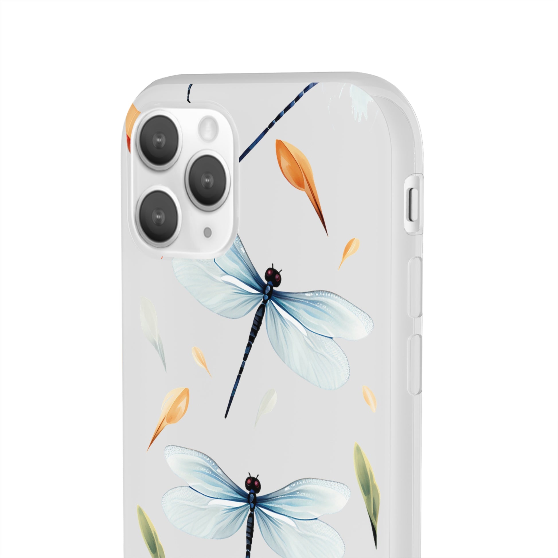 Keywords: Dragonfly design, Flexi case, Transparent cover, Ethereal style, Nature inspired, Lightweight case, Phone protection, Trendy design, Nature lover, Durable material, Minimalist style, Delicate print, Insect theme.