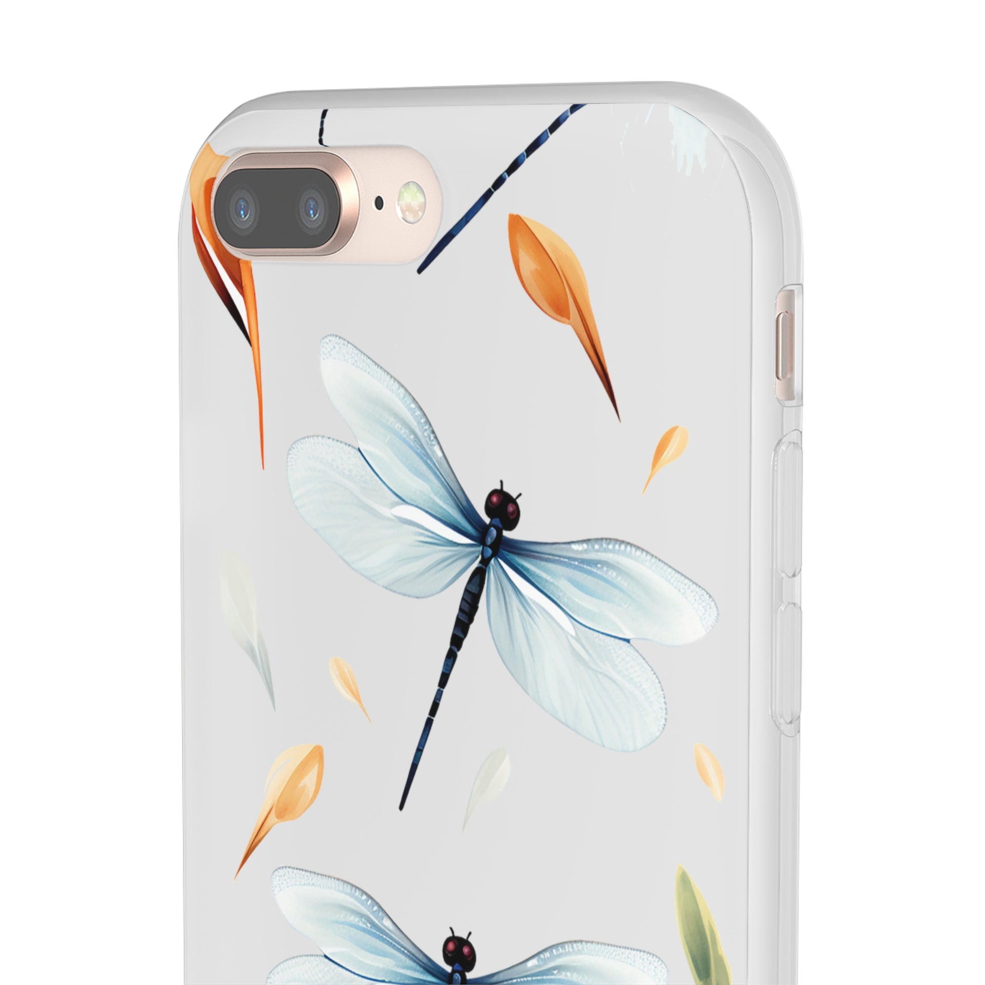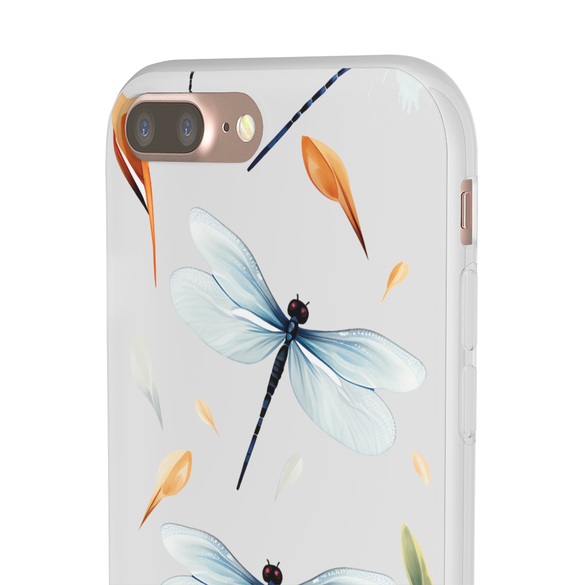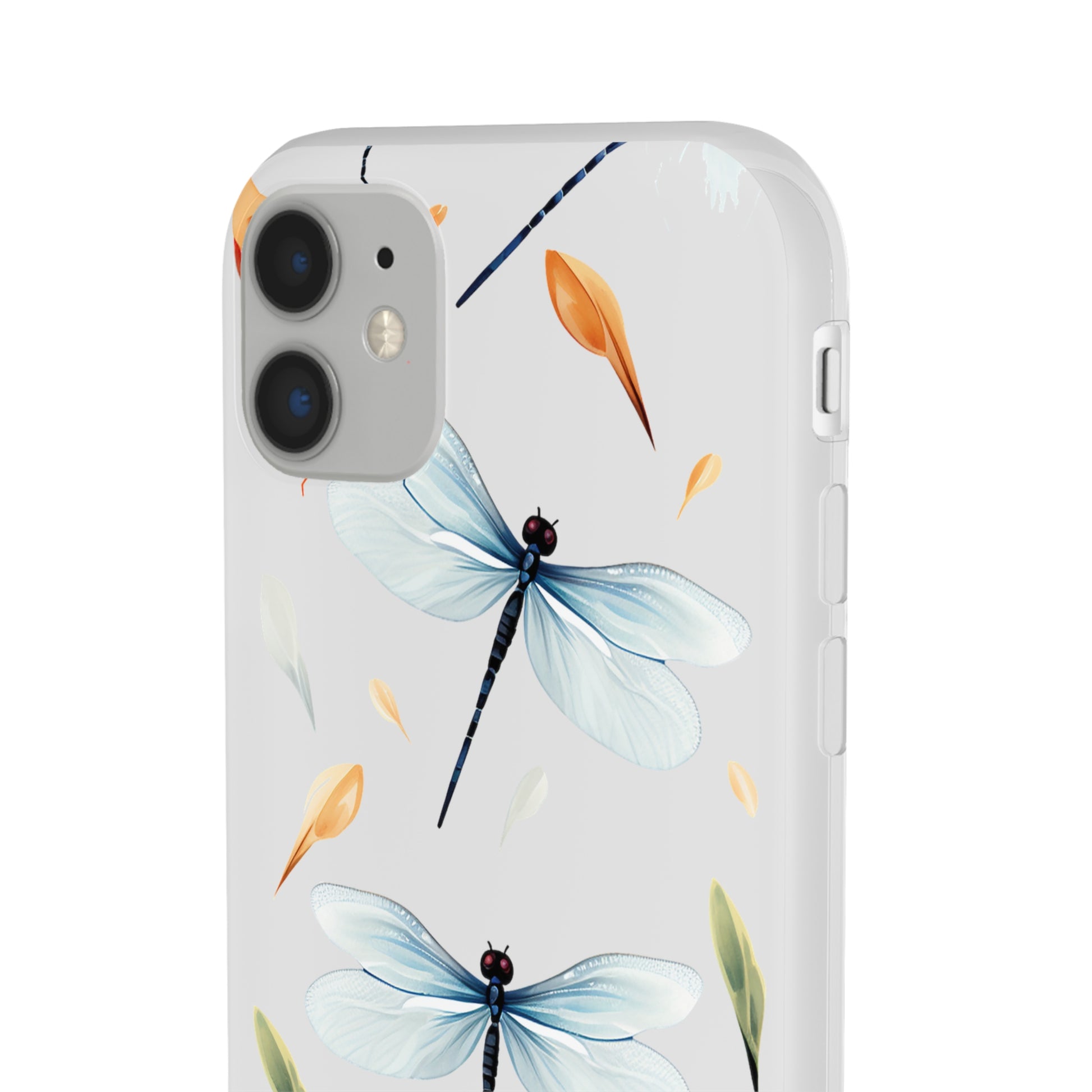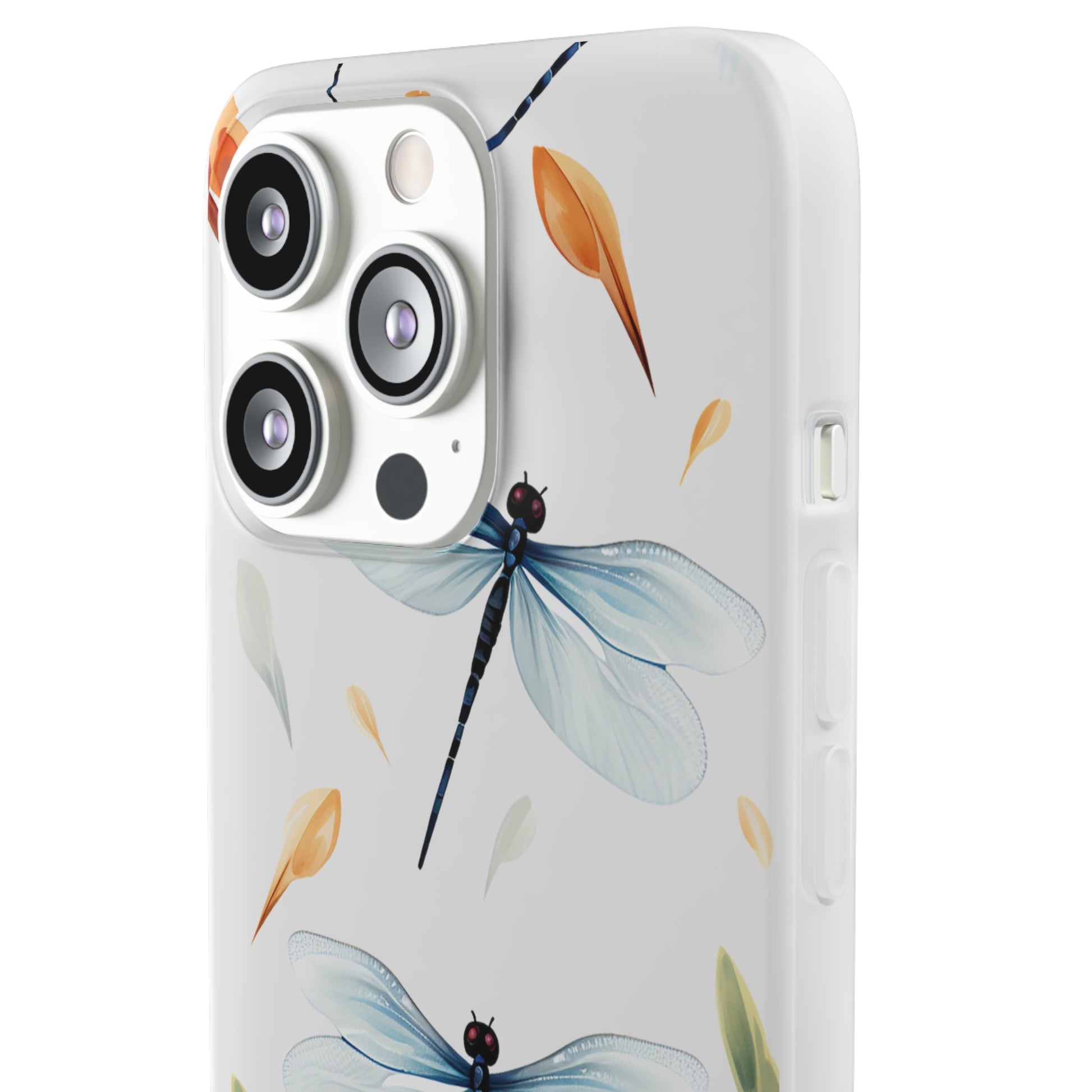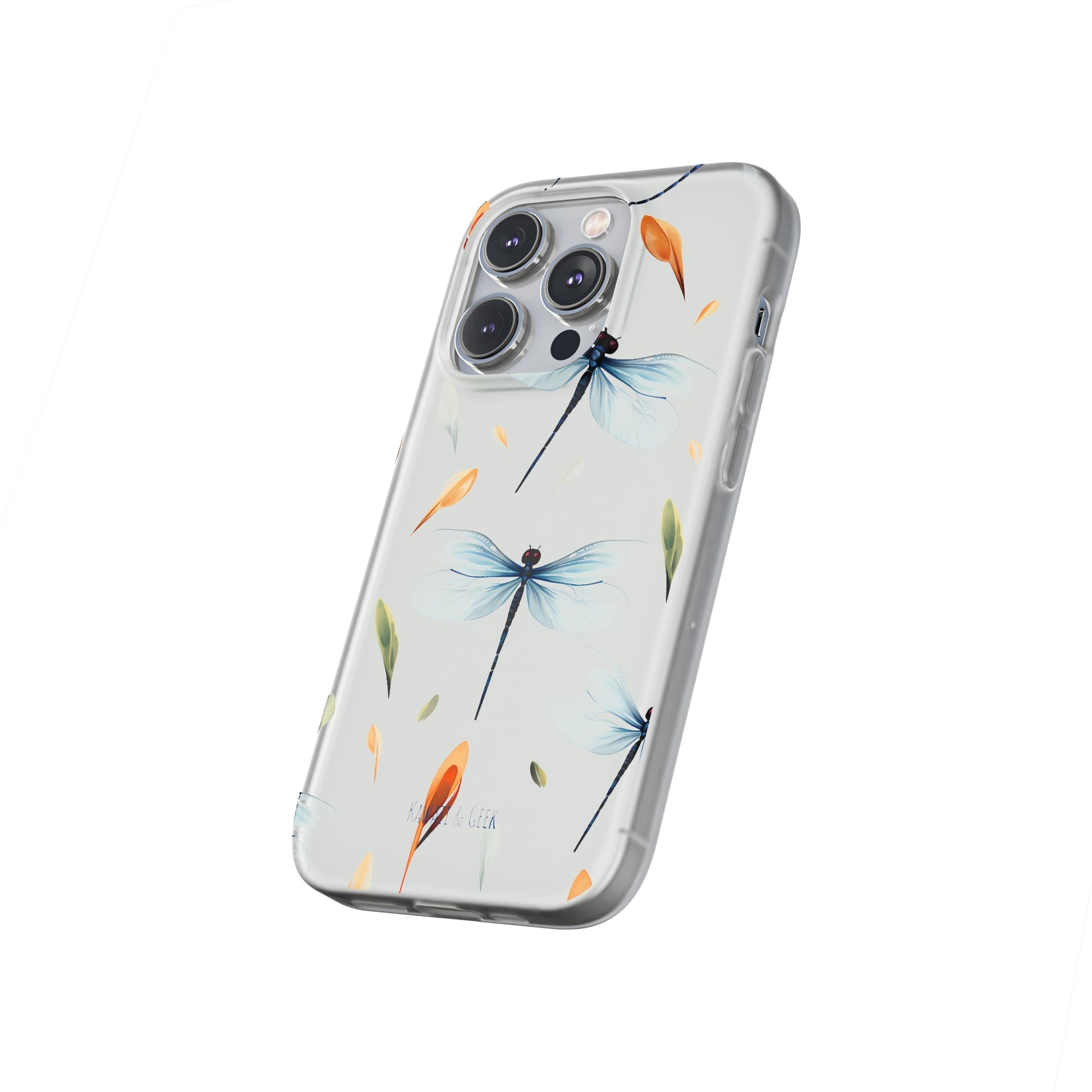 Keywords: Dragonfly design, Flexi case, Transparent cover, Ethereal style, Nature inspired, Lightweight case, Phone protection, Trendy design, Nature lover, Durable material, Minimalist style, Delicate print, Insect theme.