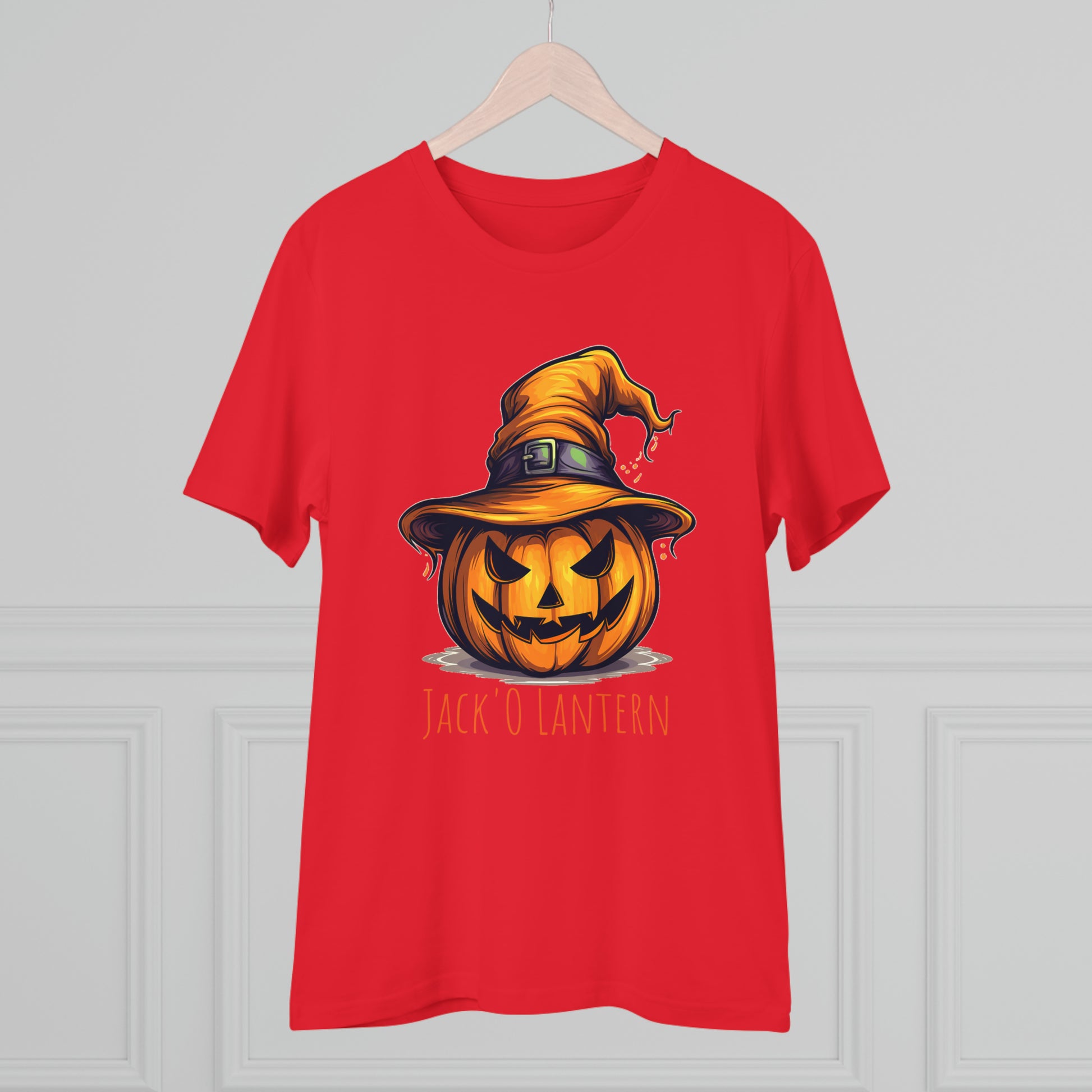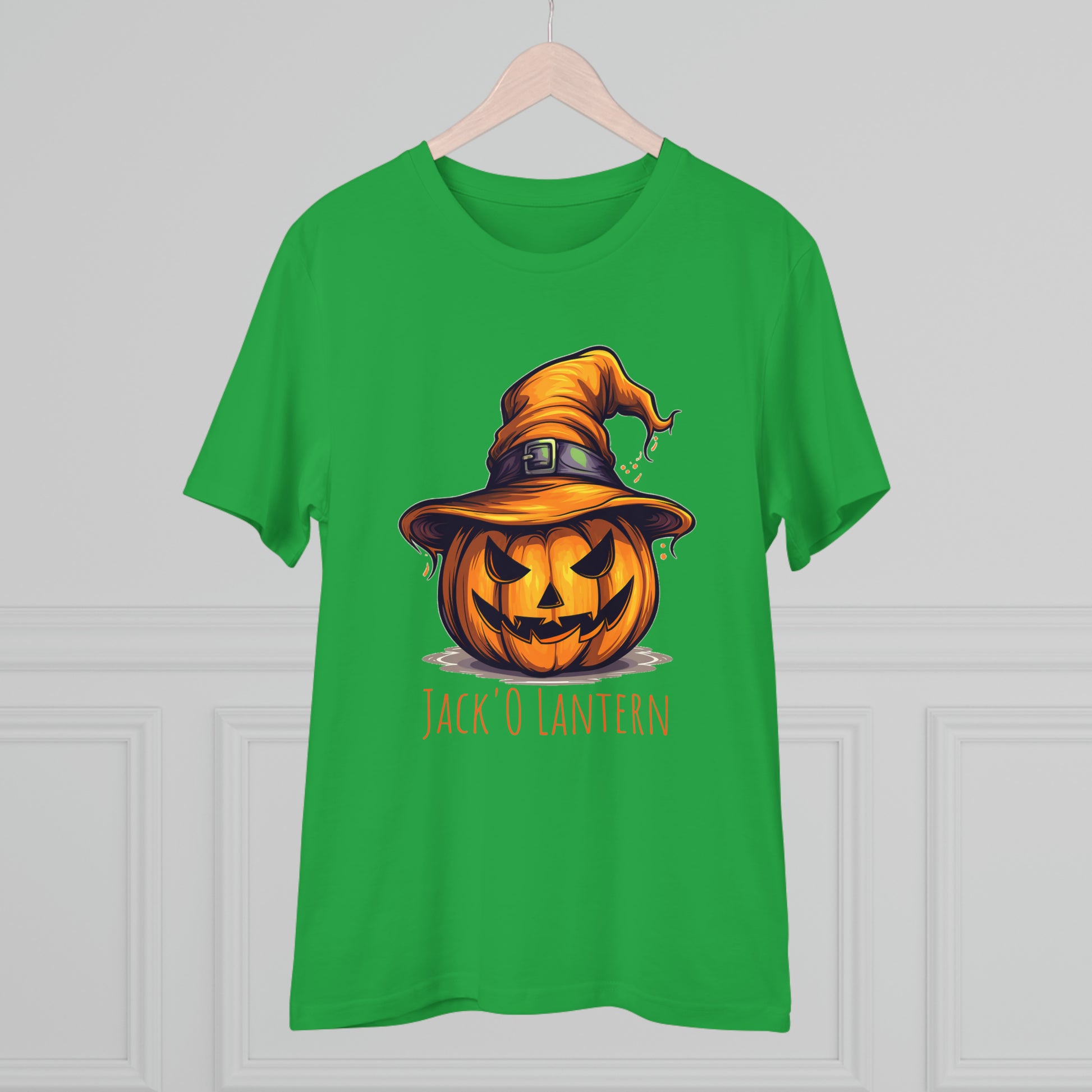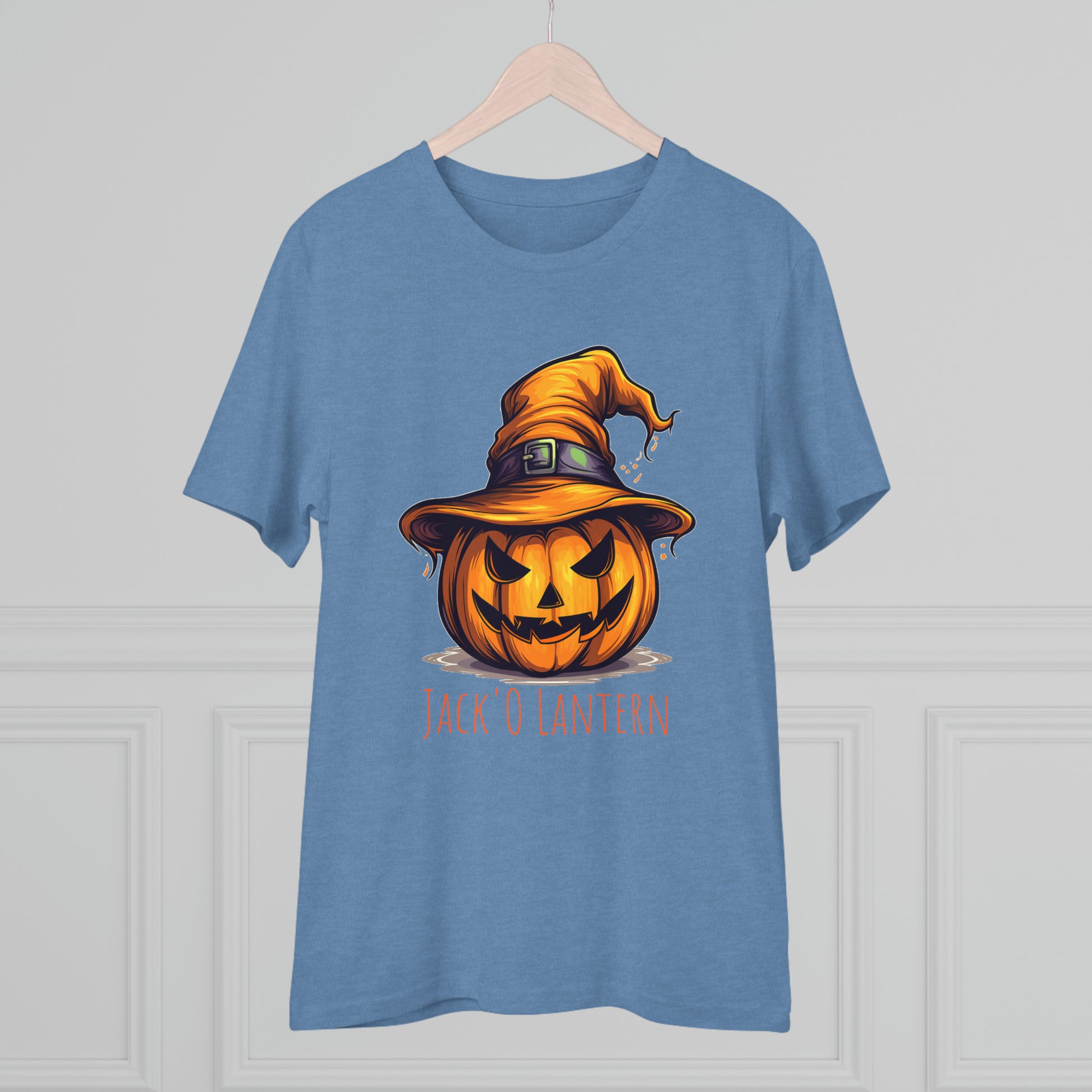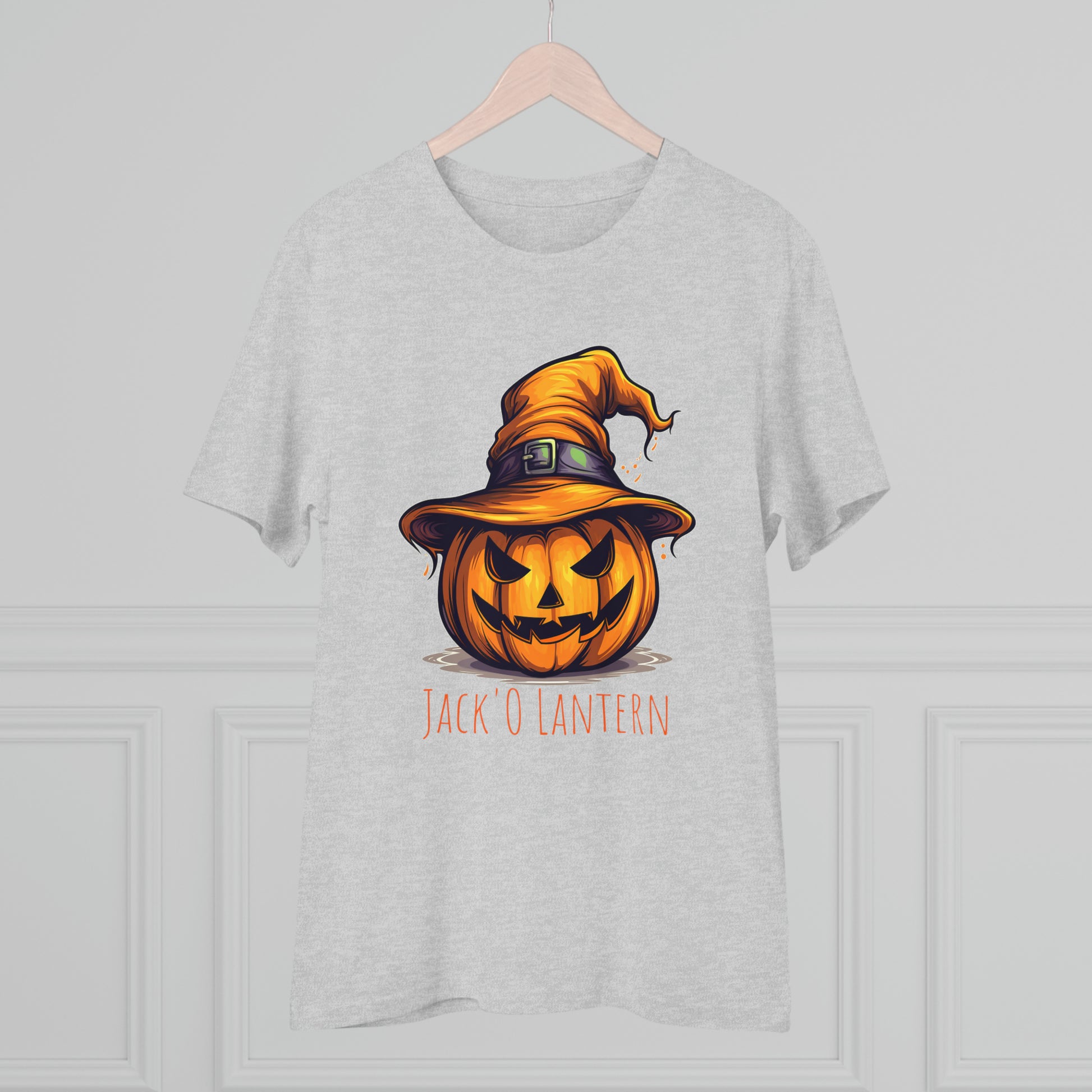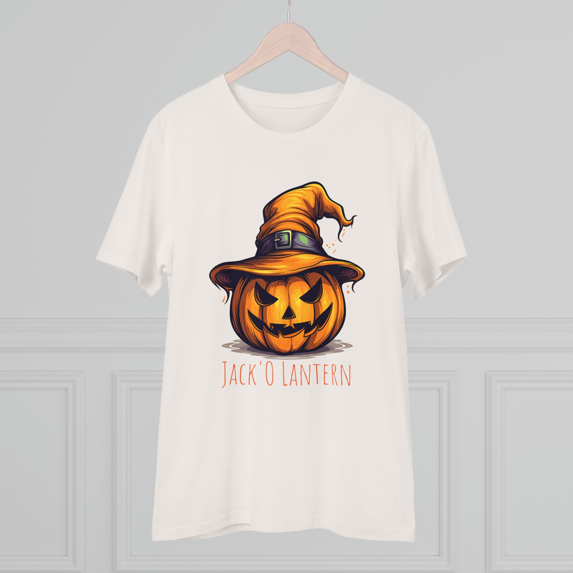 Keywords: "Eco-friendly tee", "Halloween shirt", "Jack O Lantern", "Pumpkin design", "Unisex t-shirt", "Sorcerer hat", "Funny Halloween", "Sustainable fashion", "Comical pumpkin", "October wear", "Eco tee", "Spooky style", "Halloween humor".
