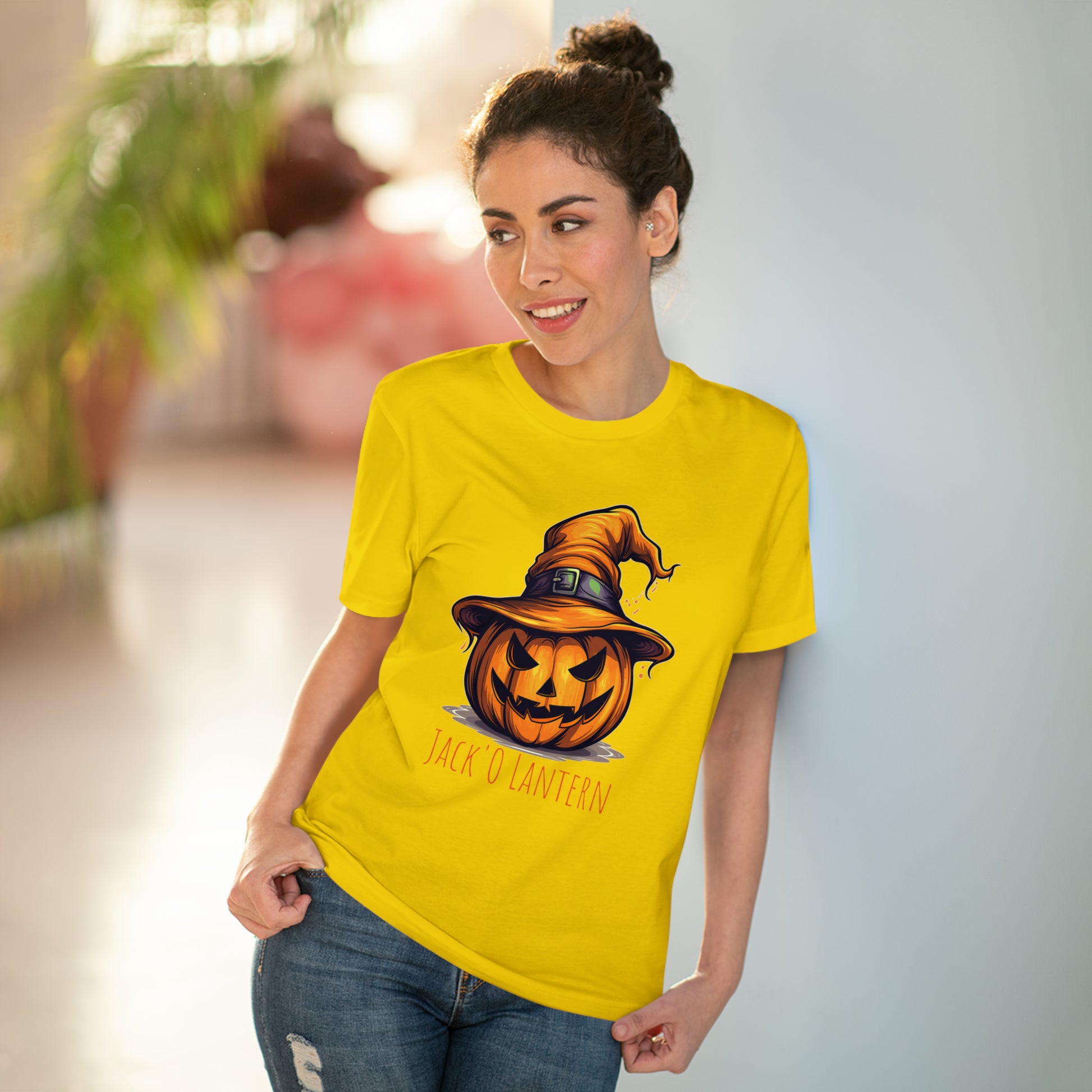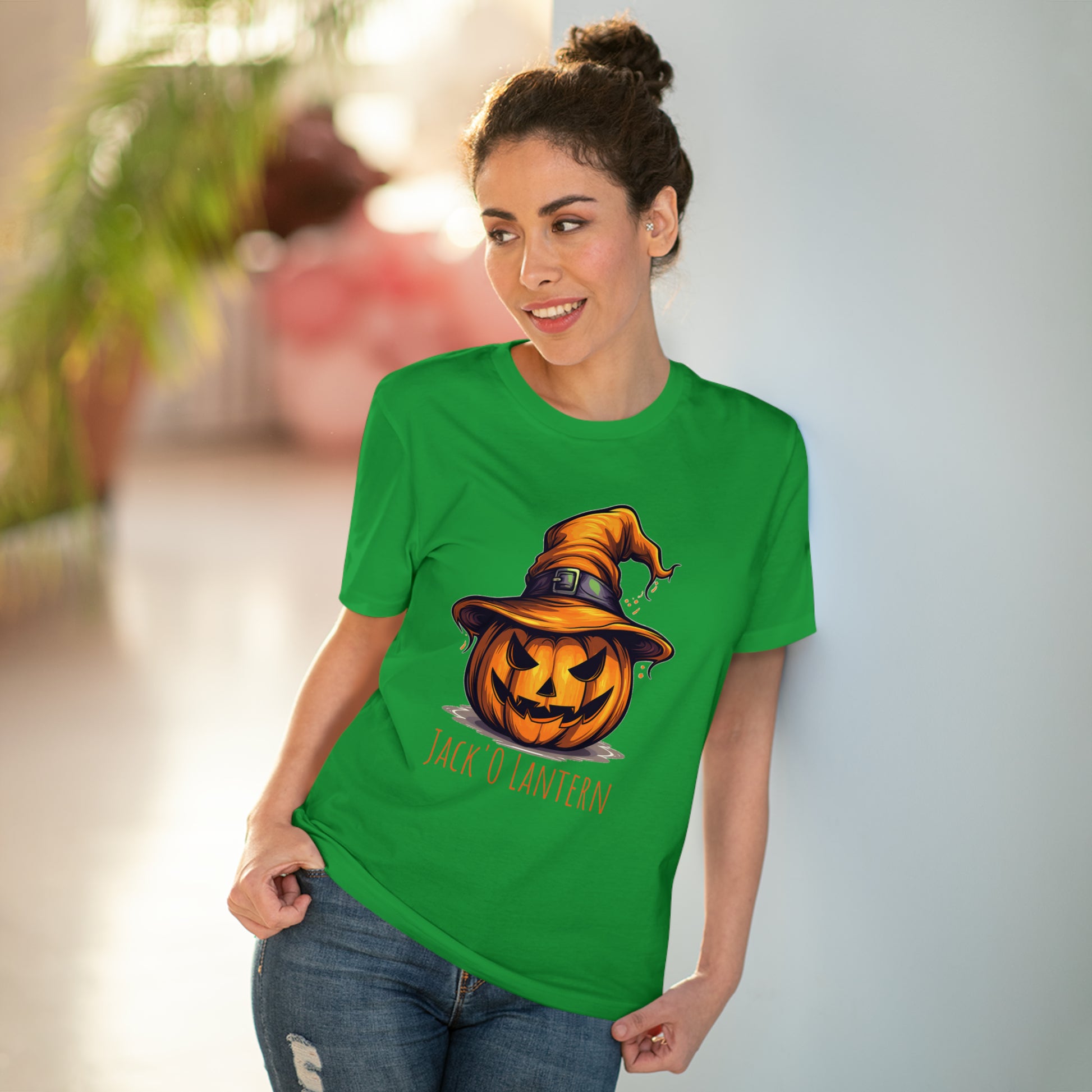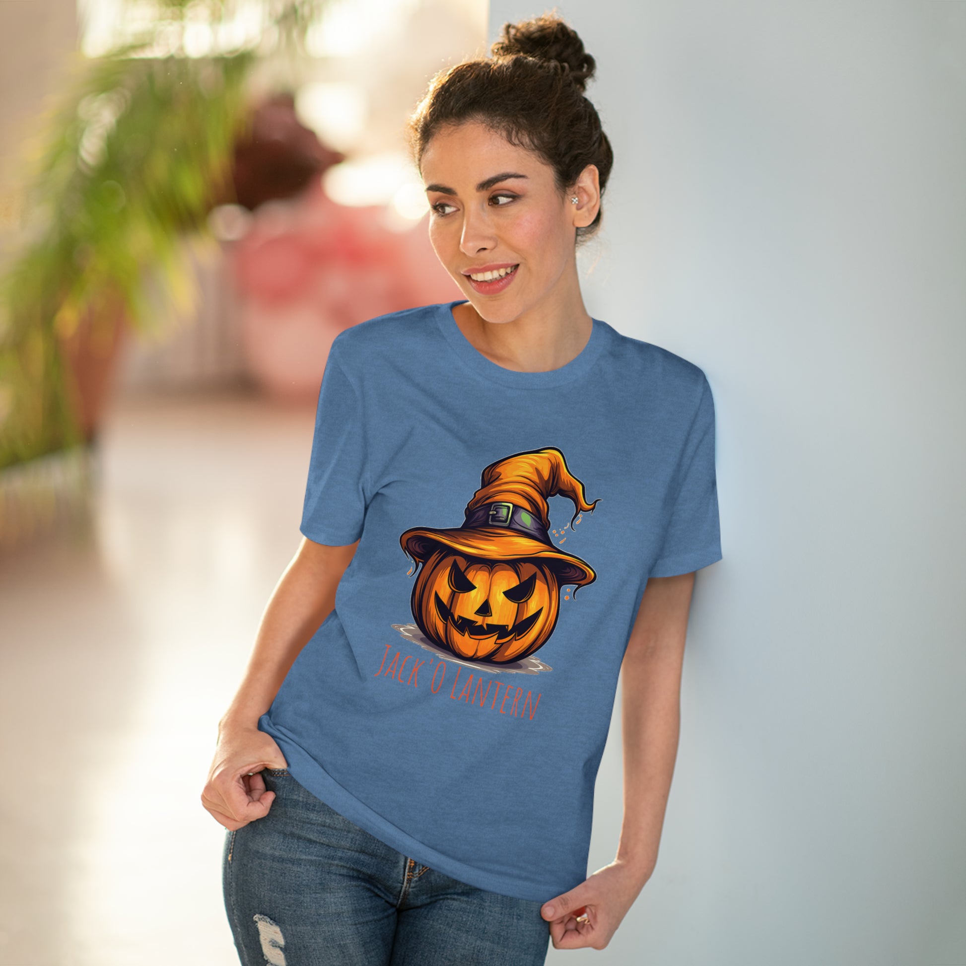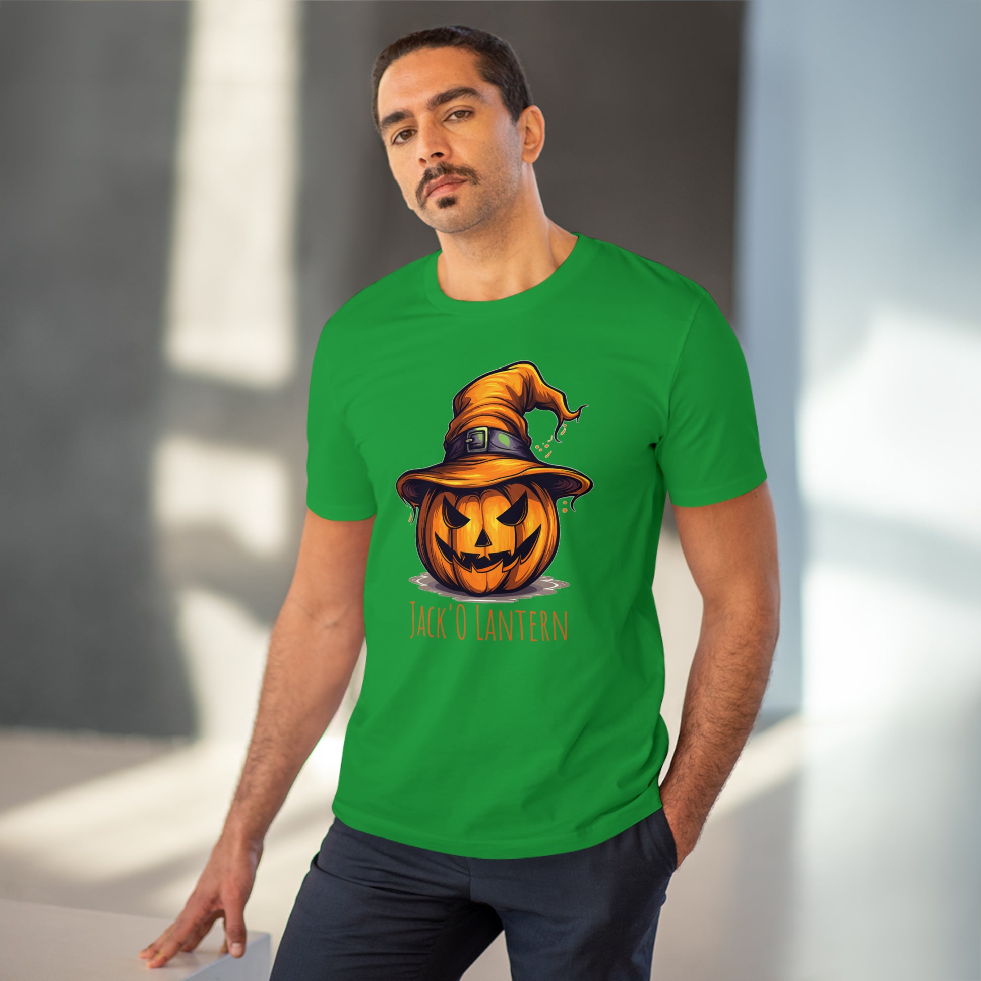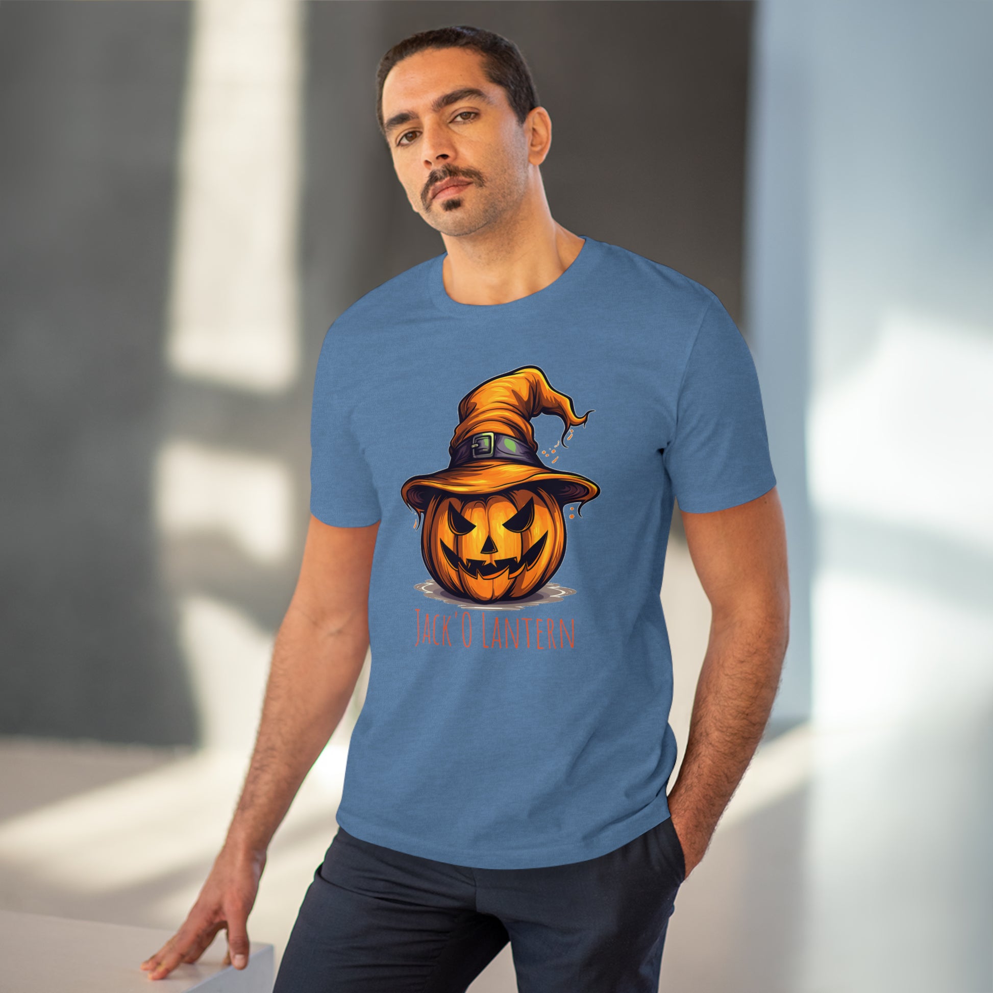 Keywords: "Eco-friendly tee", "Halloween shirt", "Jack O Lantern", "Pumpkin design", "Unisex t-shirt", "Sorcerer hat", "Funny Halloween", "Sustainable fashion", "Comical pumpkin", "October wear", "Eco tee", "Spooky style", "Halloween humor".
