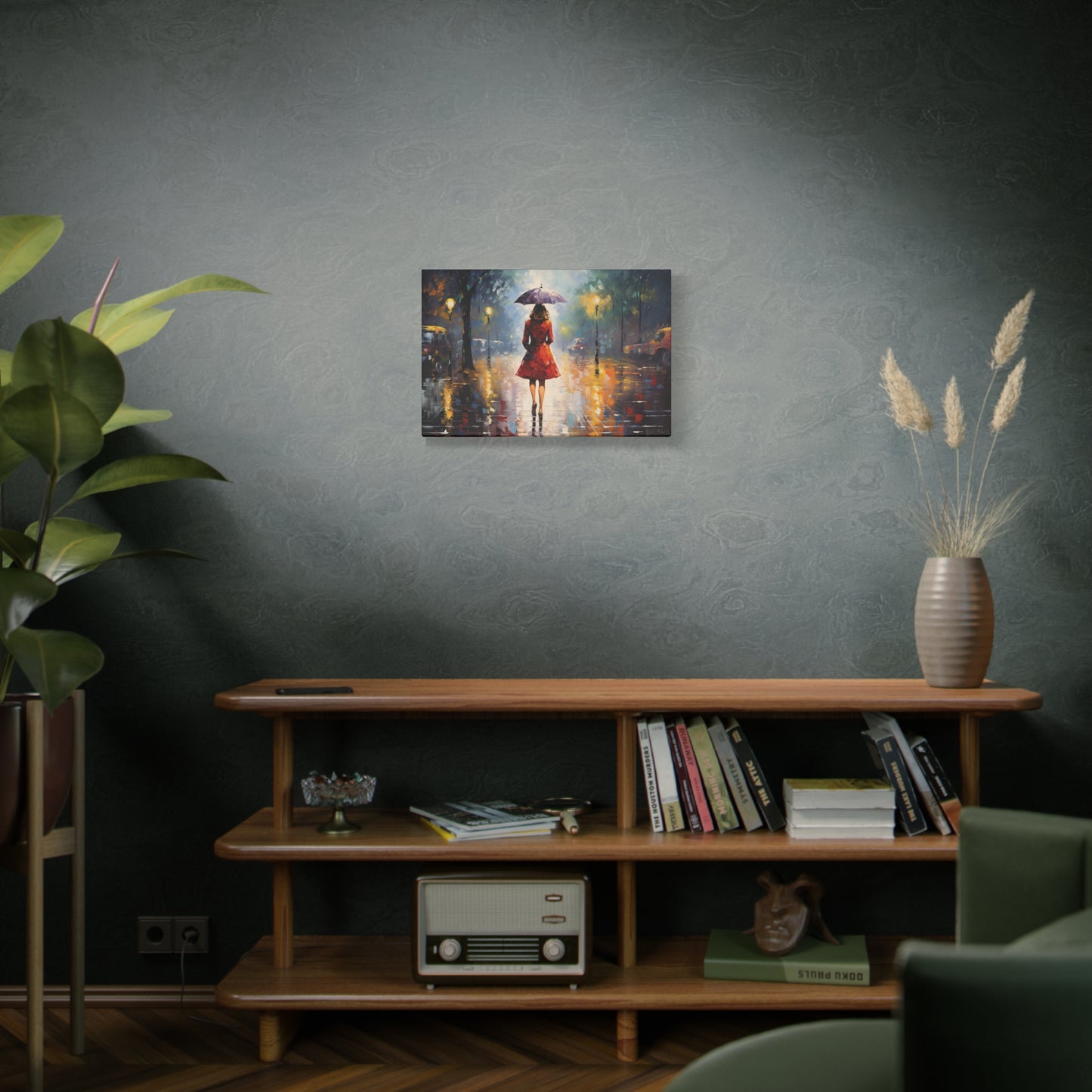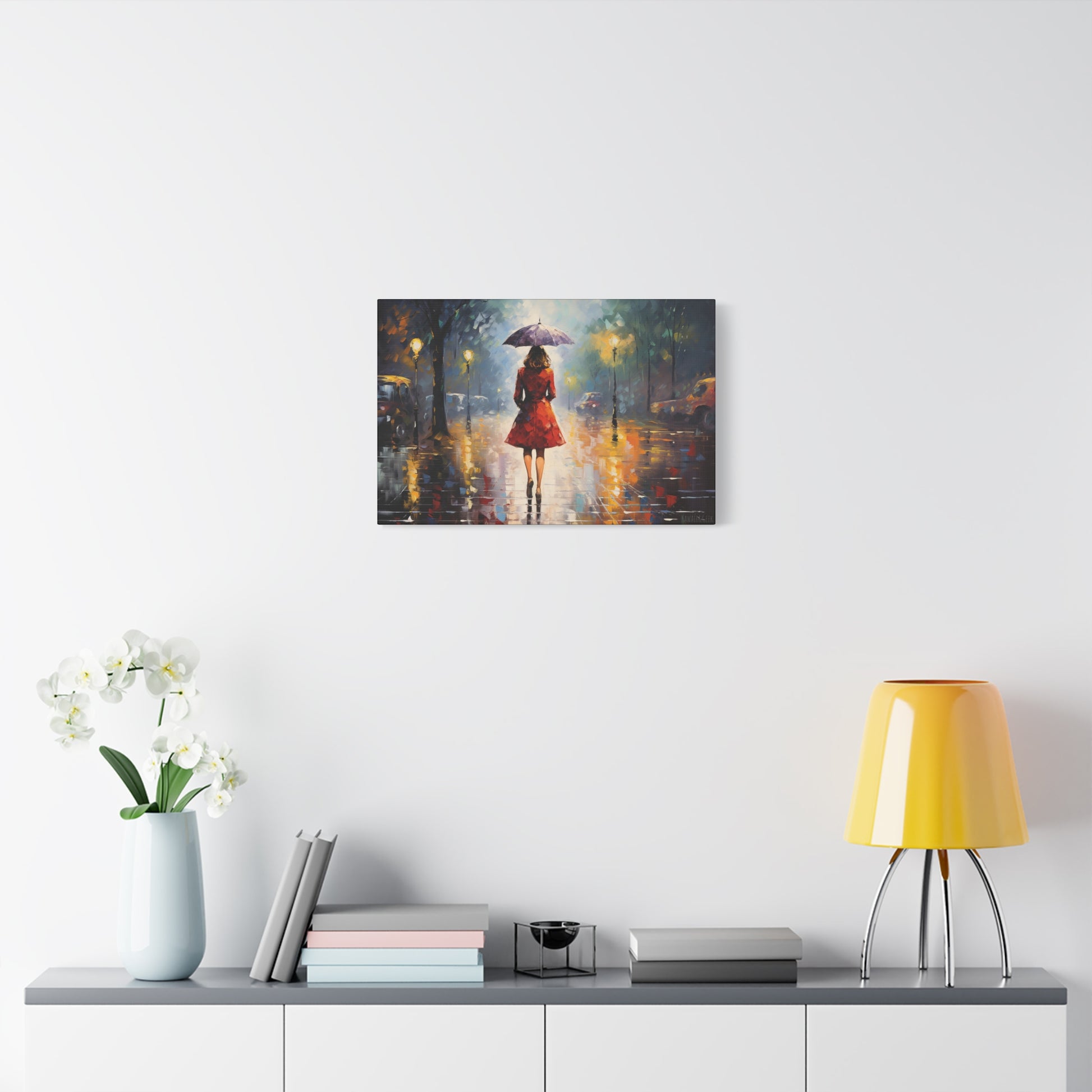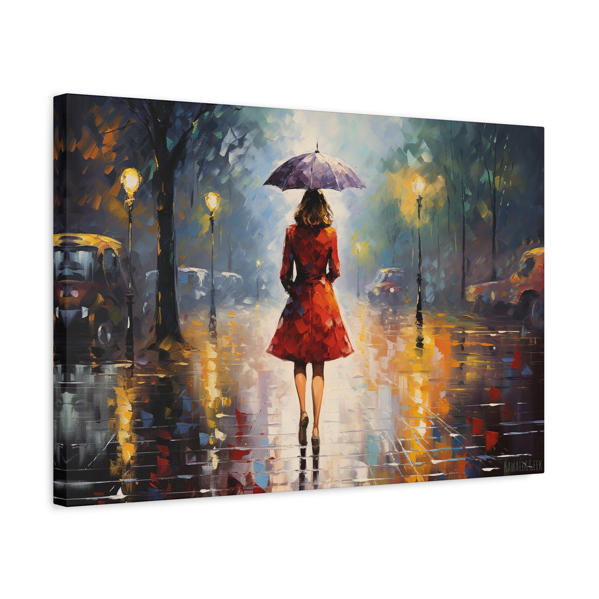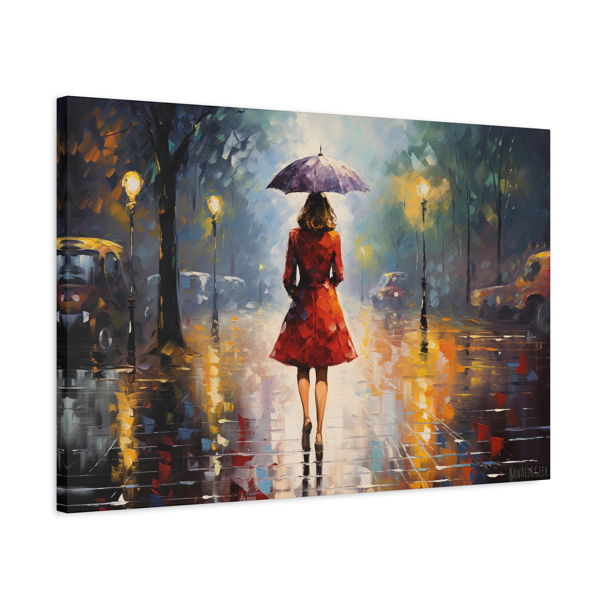 Presentation : Experience the romance of Paris through our premium cotton canvas, capturing an elegant woman gracefully walking under the city's gentle rain. This piece effortlessly brings the essence of Parisian charm into any space.