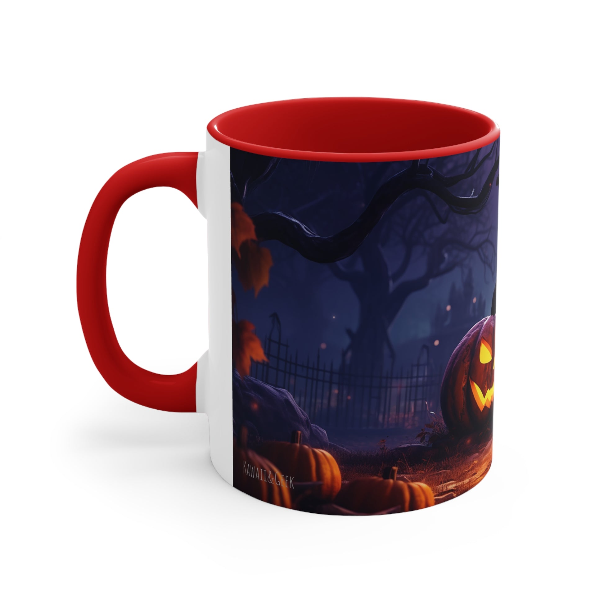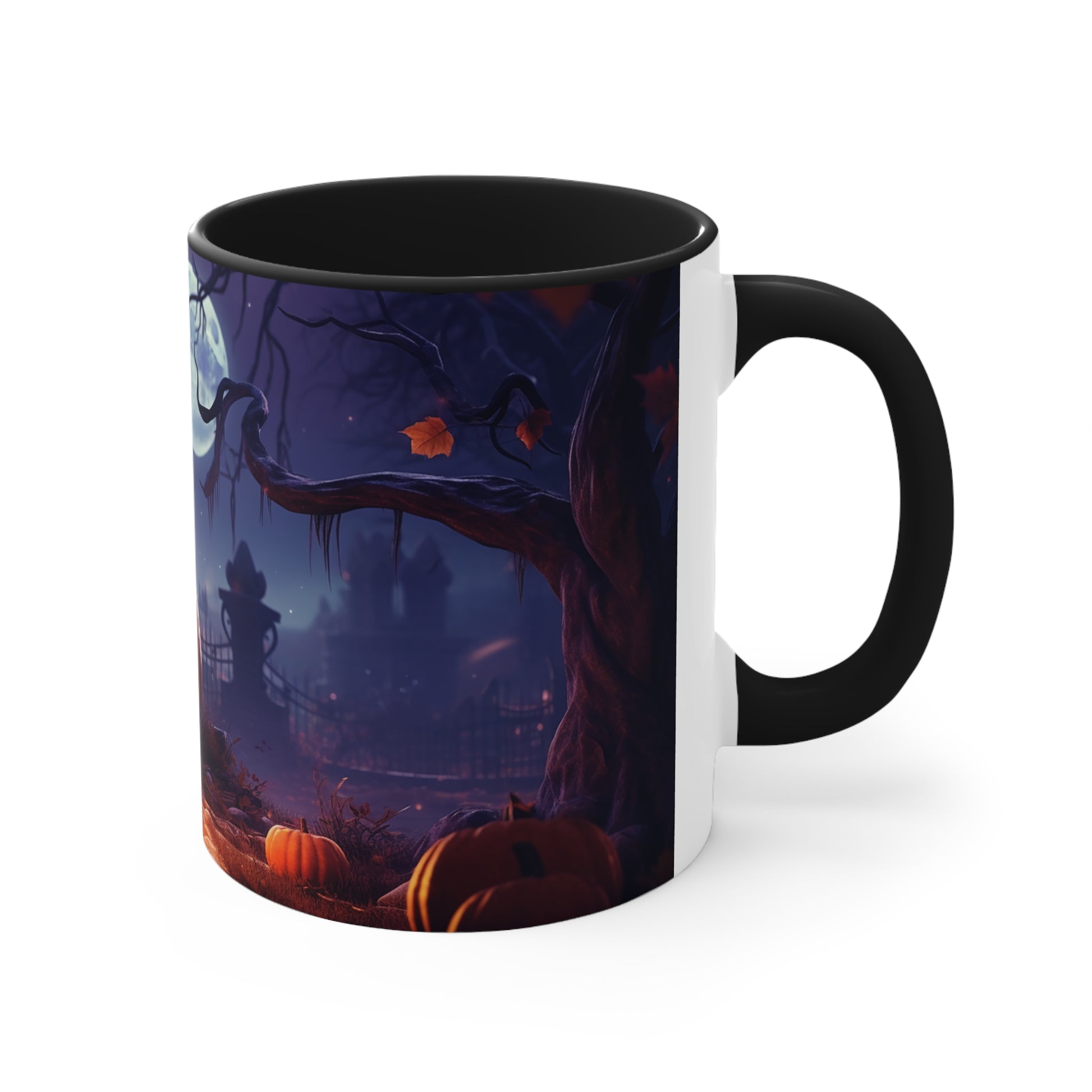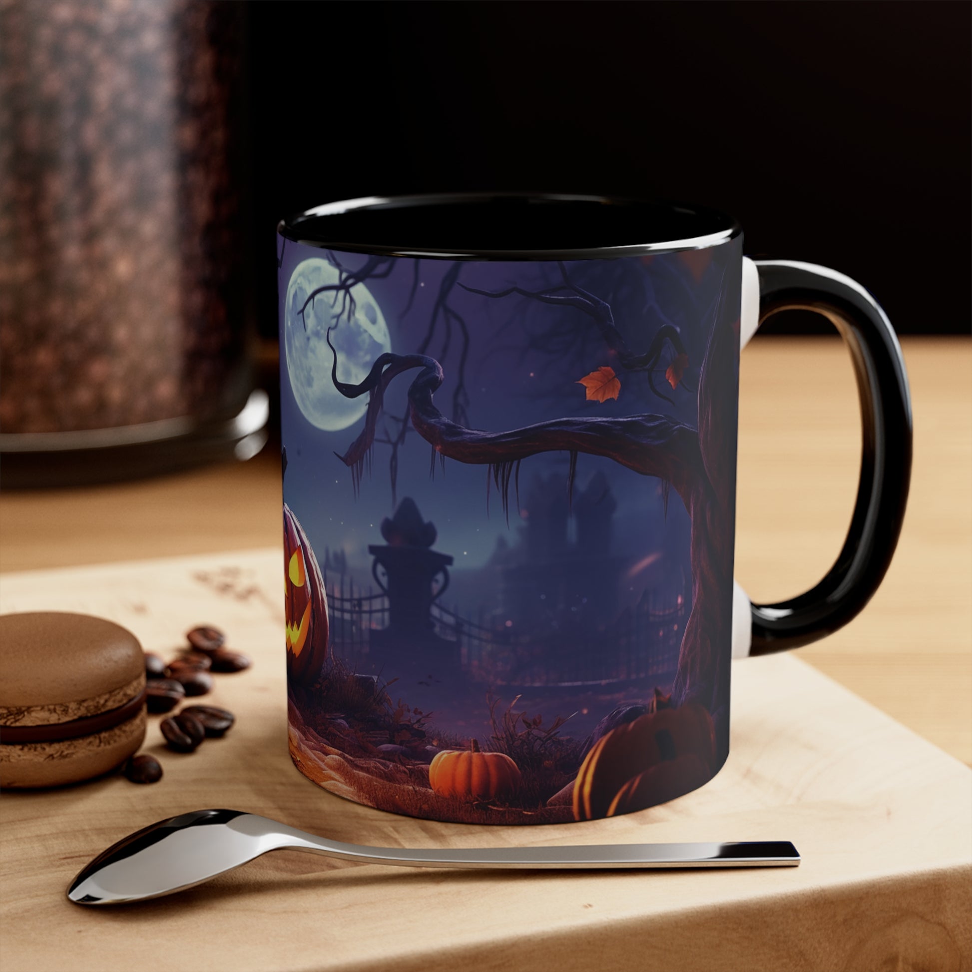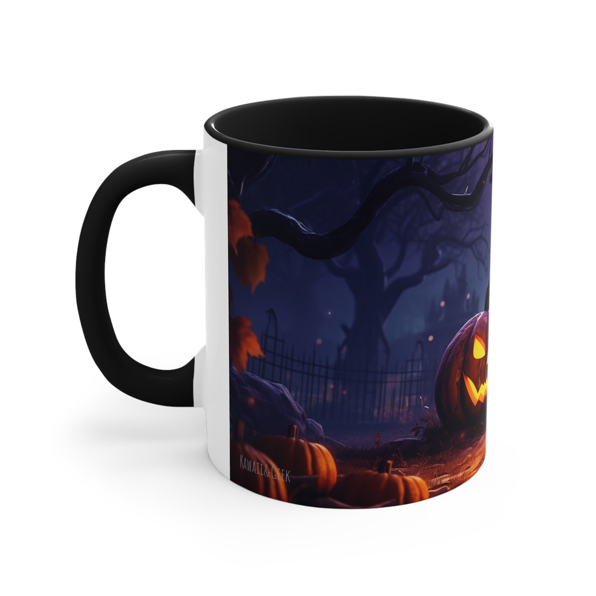 Elevate your Halloween spirit with our exclusive bicolor mug, showcasing the sinister glare of an evil Jack-o-lantern amidst the chilling vibes of a spooky cemetery. Perfect for sipping your favorite brew on those haunting October nights. Be bewitched by its captivating design from our special Halloween collection.