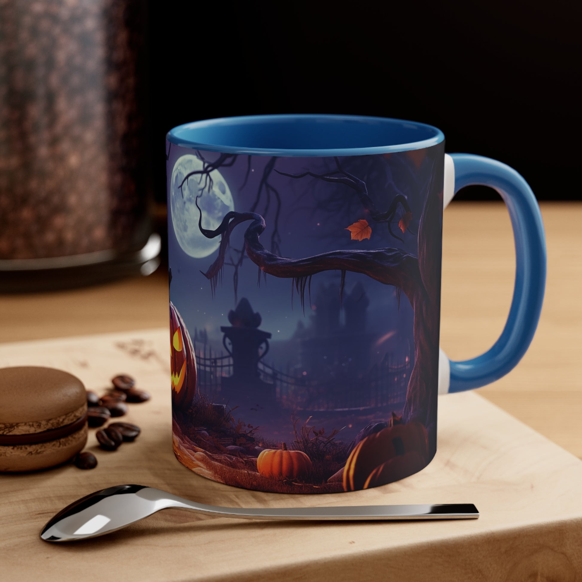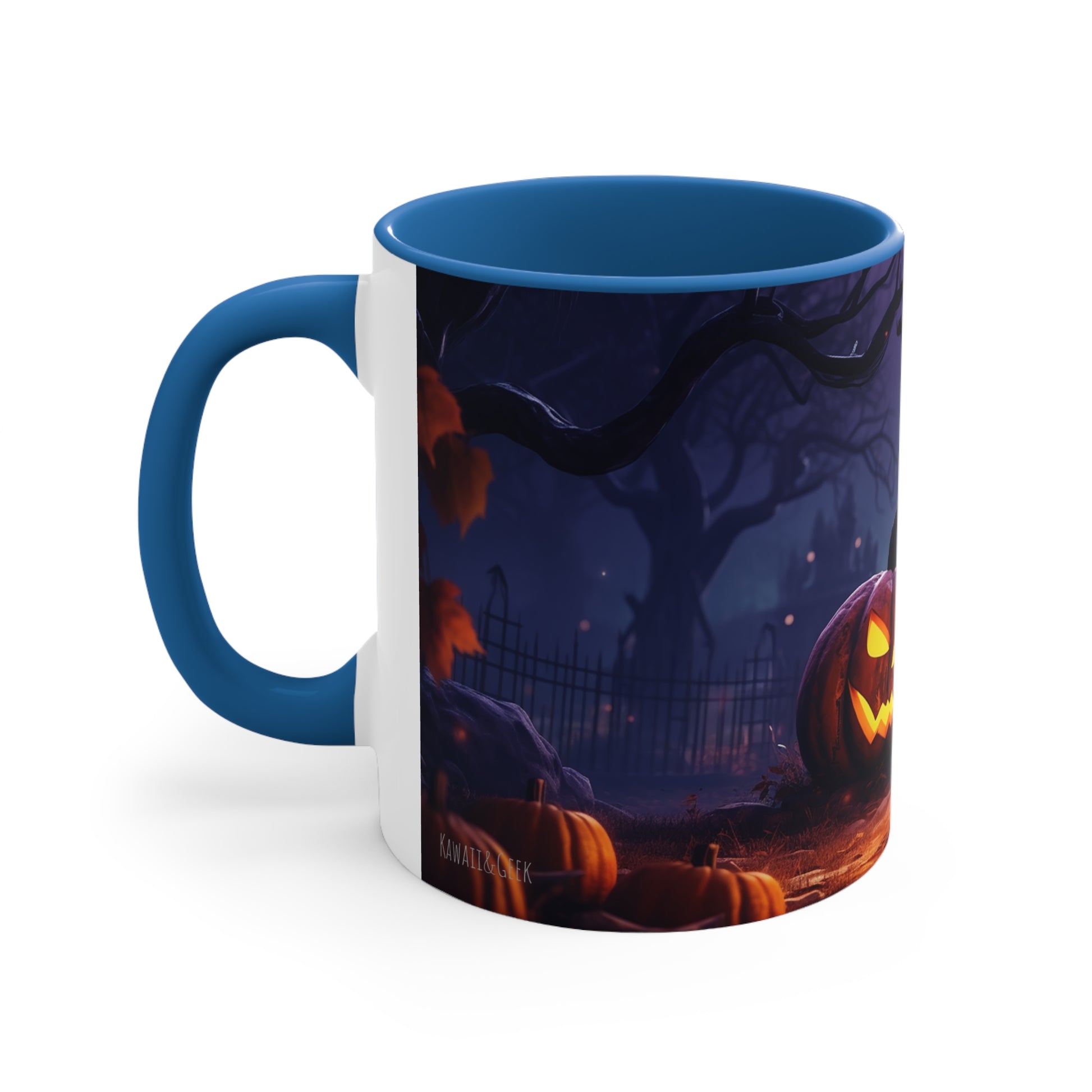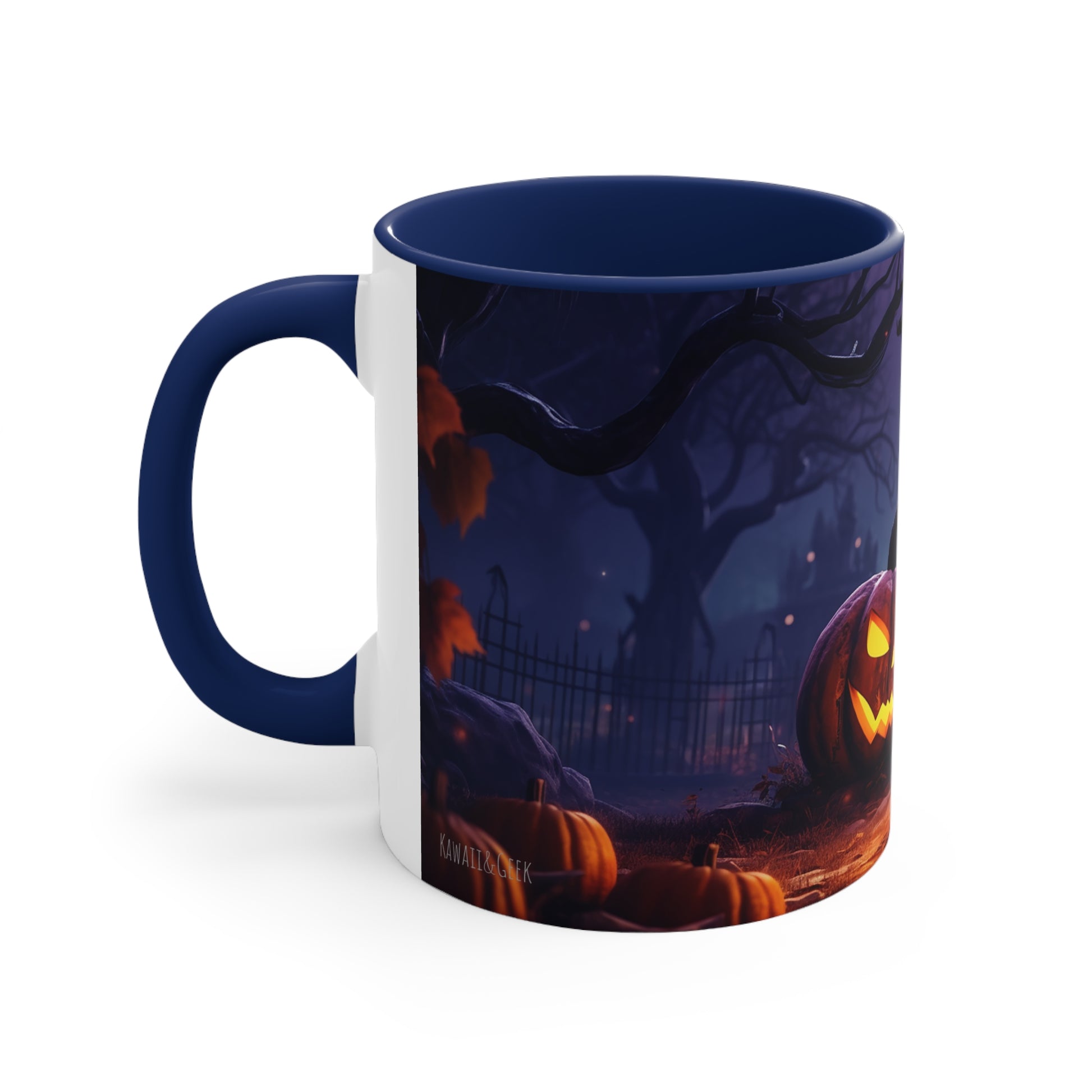 Elevate your Halloween spirit with our exclusive bicolor mug, showcasing the sinister glare of an evil Jack-o-lantern amidst the chilling vibes of a spooky cemetery. Perfect for sipping your favorite brew on those haunting October nights. Be bewitched by its captivating design from our special Halloween collection.