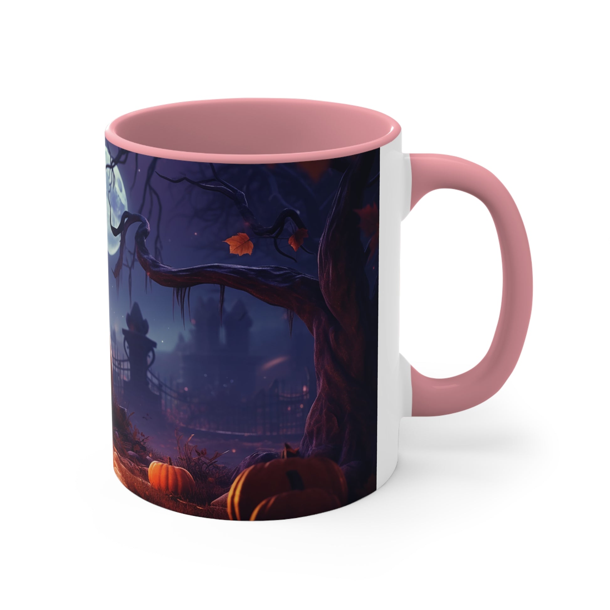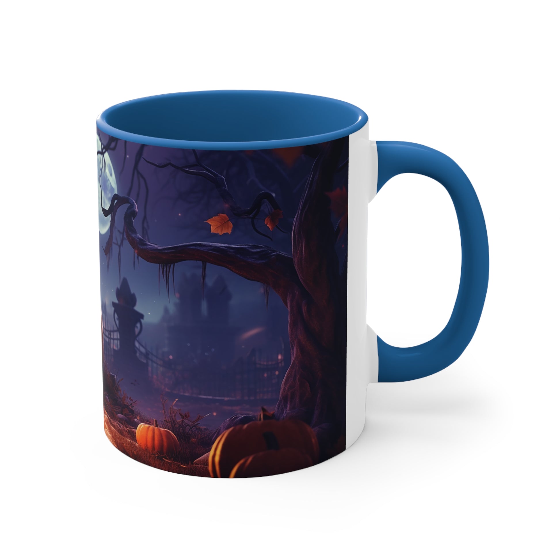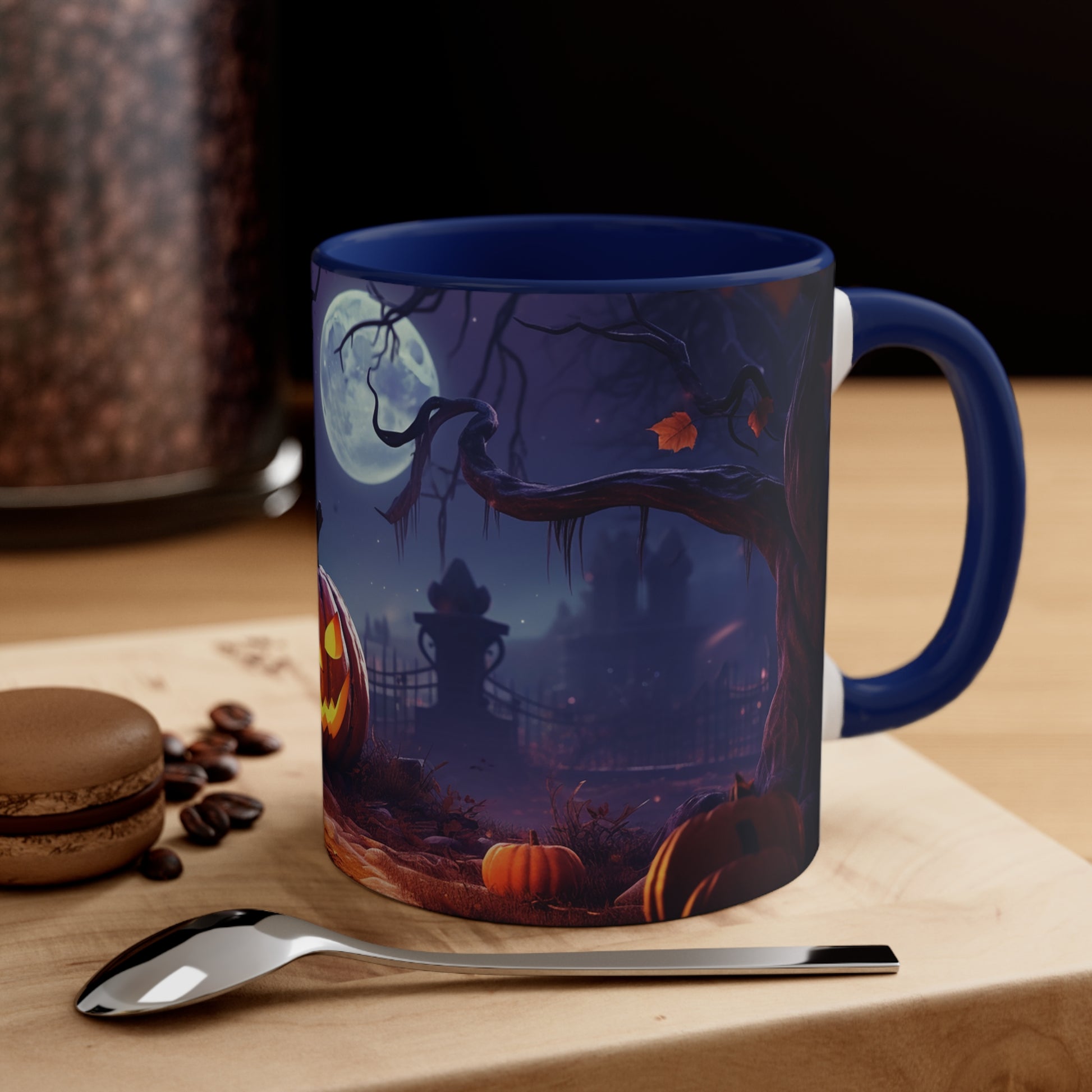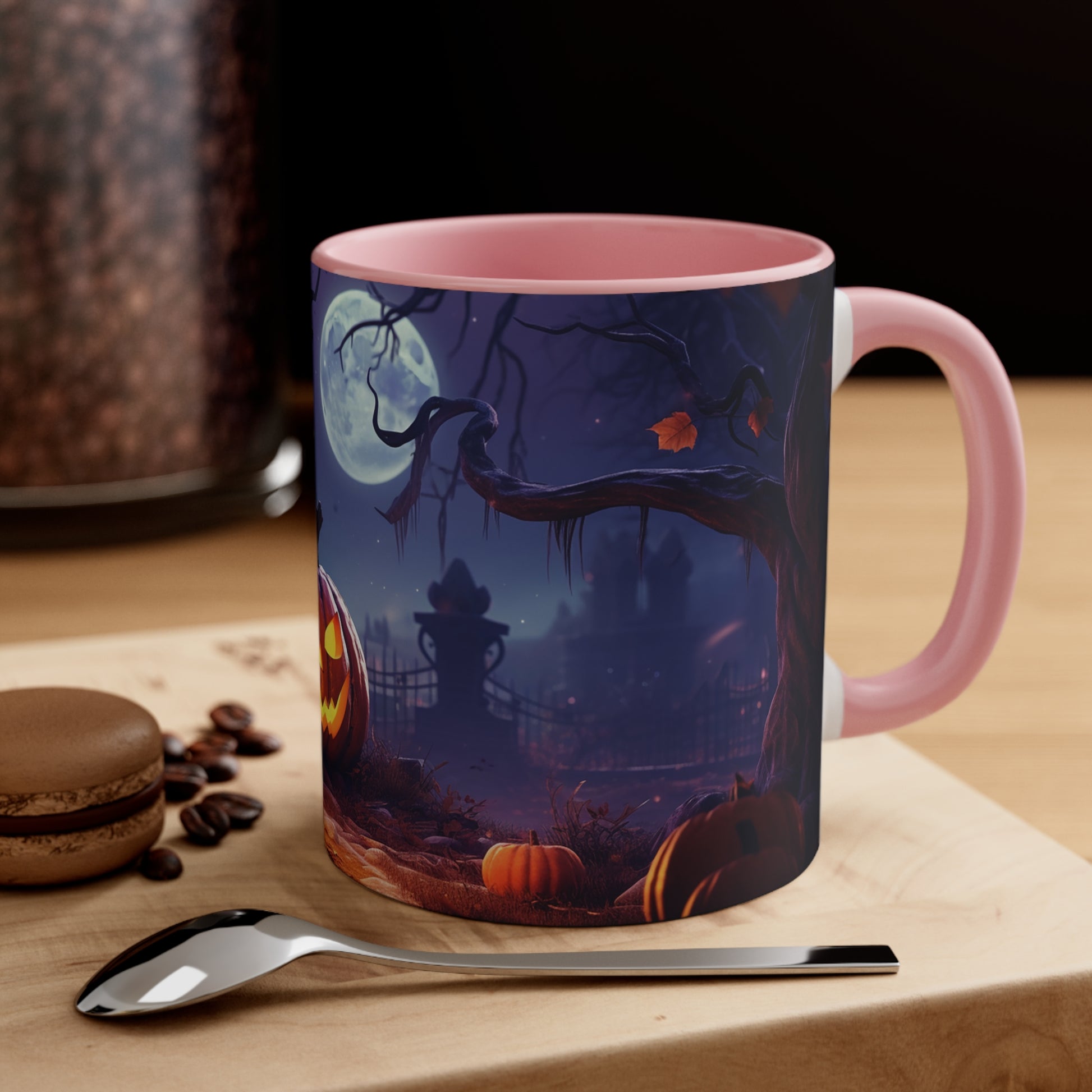 Elevate your Halloween spirit with our exclusive bicolor mug, showcasing the sinister glare of an evil Jack-o-lantern amidst the chilling vibes of a spooky cemetery. Perfect for sipping your favorite brew on those haunting October nights. Be bewitched by its captivating design from our special Halloween collection.