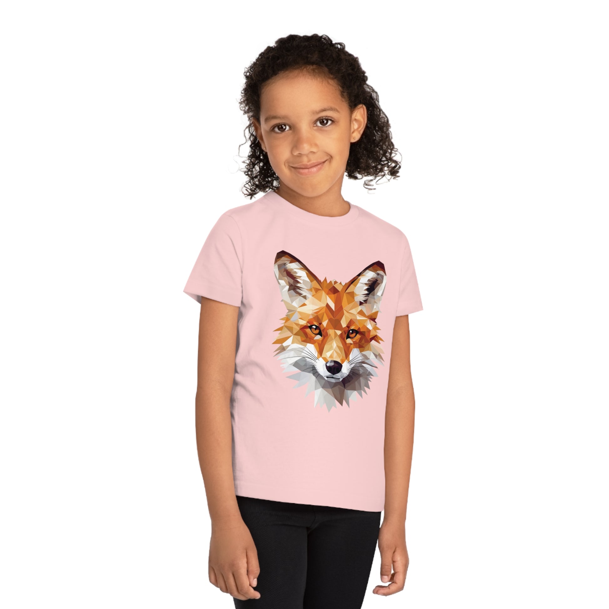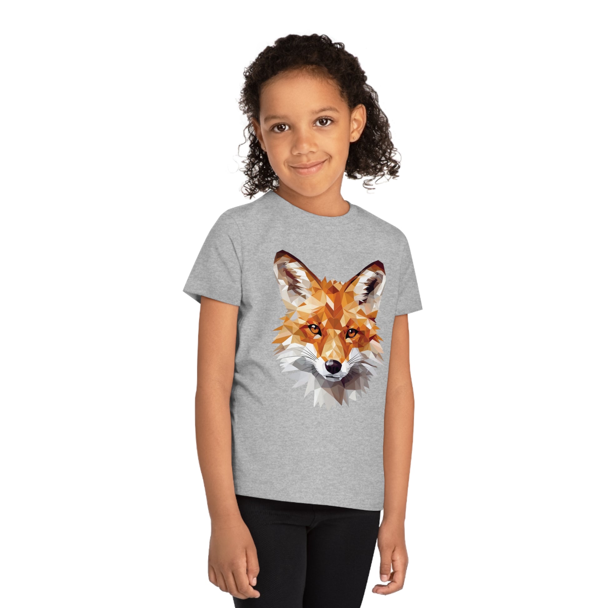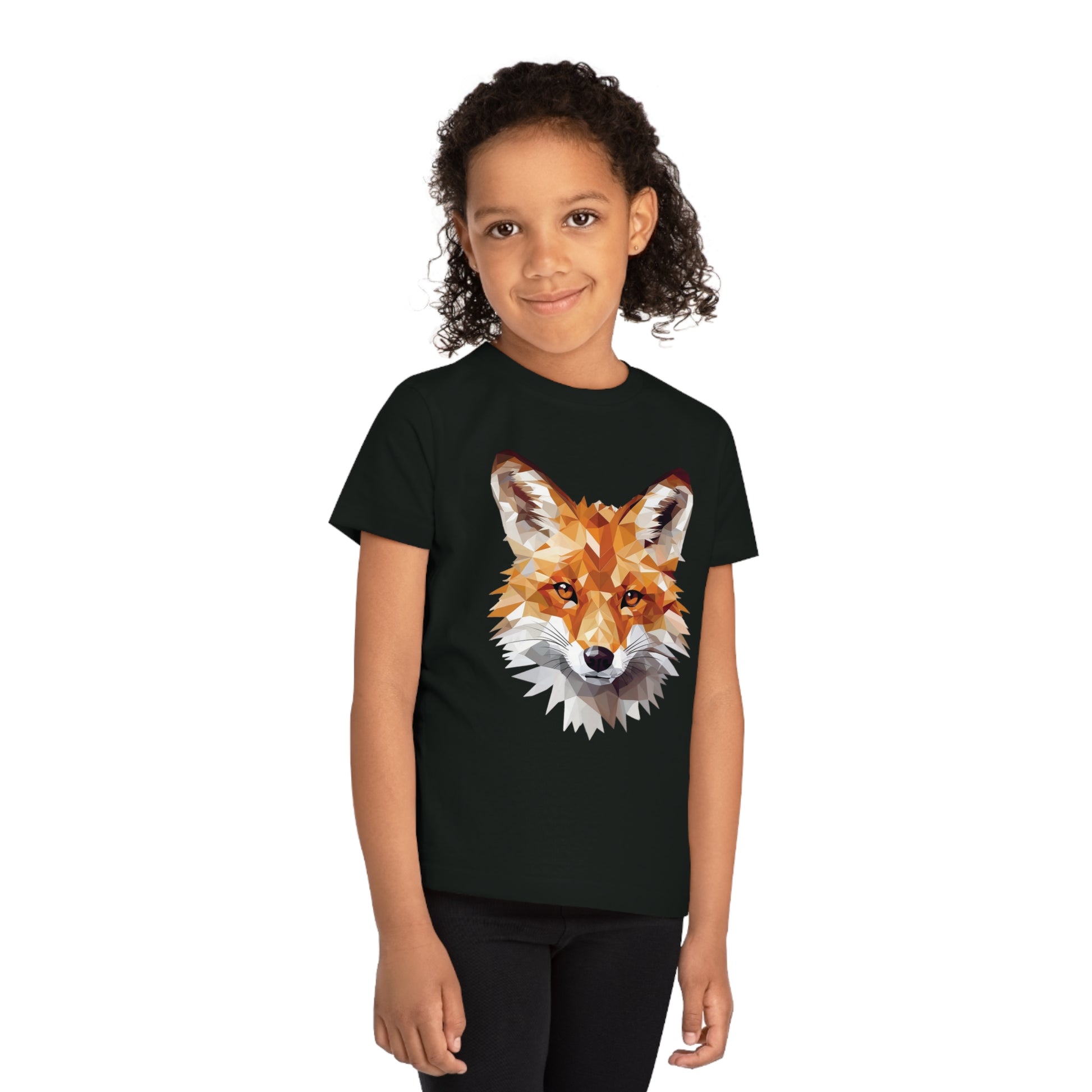 Keywords: Fox kids t-shirt, polygonal geometric style, eco-friendly materials, clever charm, playful design, unique style, animal lover, sustainable fashion.