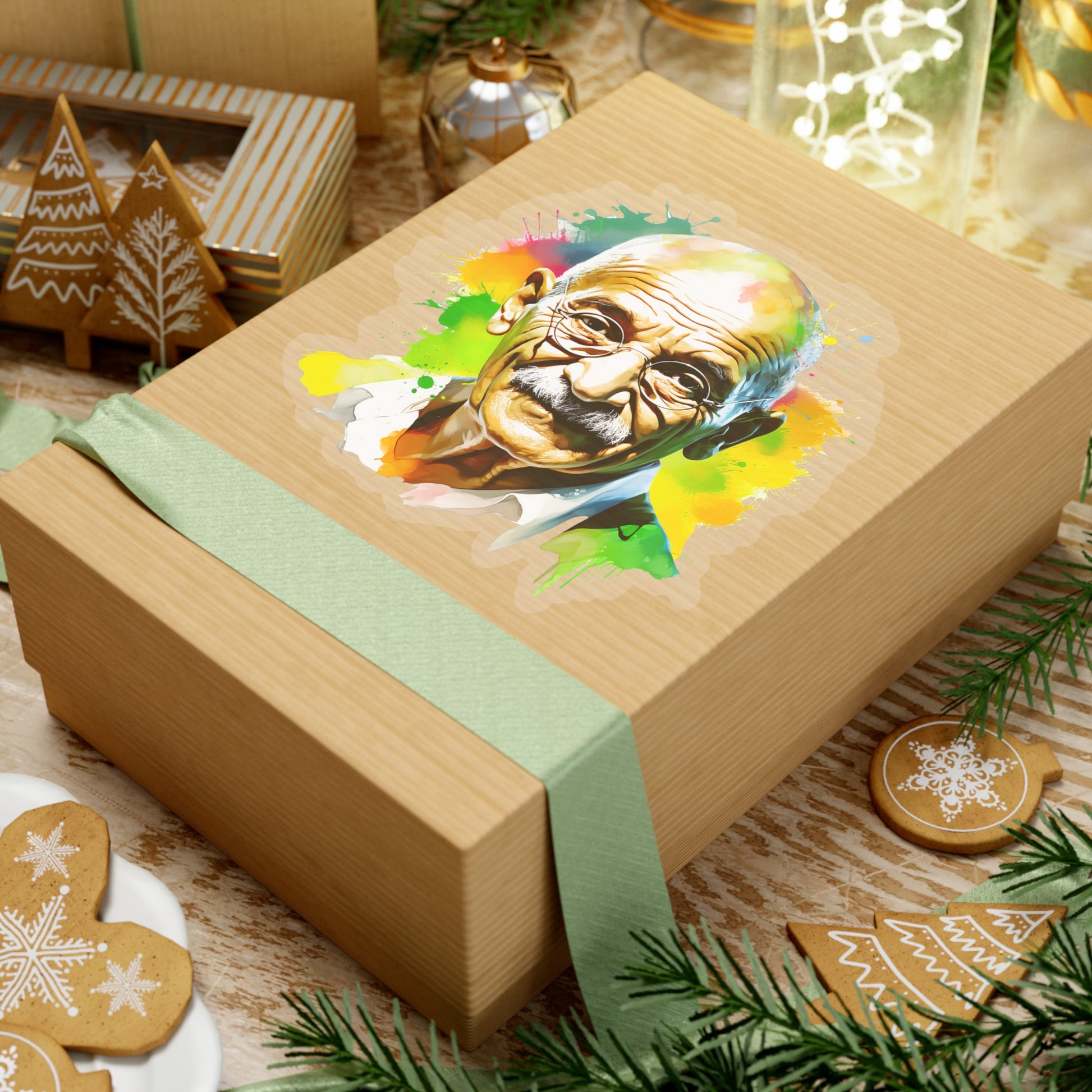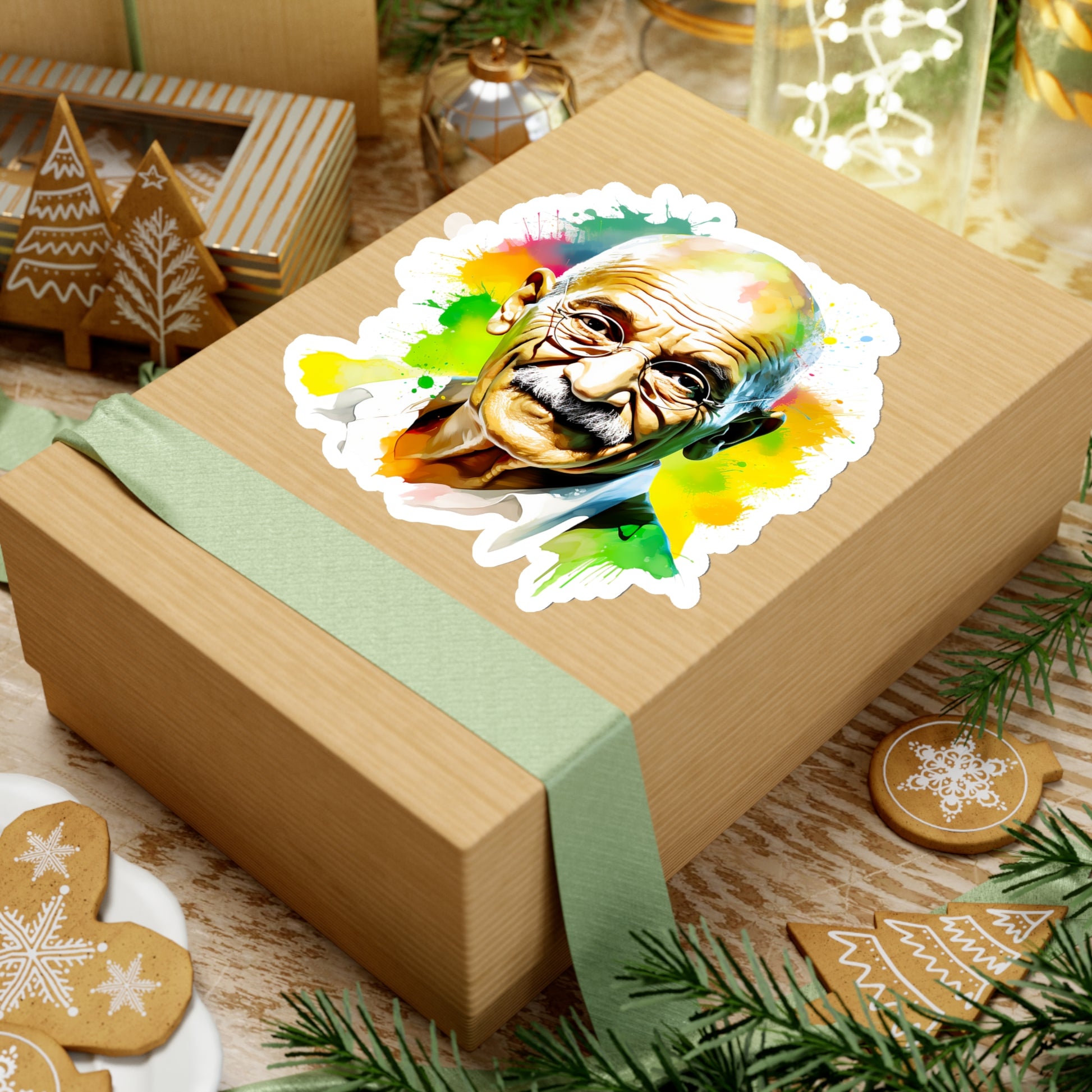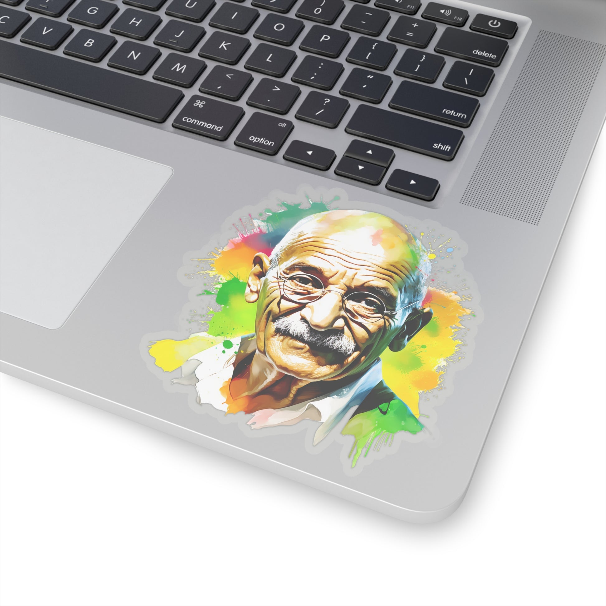 Keywords: Gandhi portrait, Mahatma sticker, Watercolor art, Peace symbol, Indian leader, Non-violence decal, Freedom icon, Salt March, British Raj resist, Indian history, Satyagraha spirit, Independence tribute, National pride.