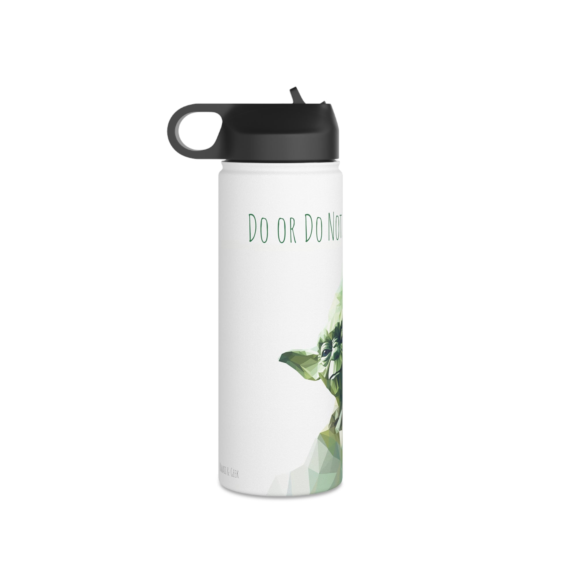 Channel the profound wisdom of the Jedi Master with our geometric Yoda-inspired stainless steel water bottle. Adorned with the legendary silhouette of Master Yoda in a sleek, modern design and paired with his timeless quote, "Do or Do Not. There is No Try," this bottle is a beacon of motivation for Star Wars aficionados and beyond. Crafted for endurance and style, ensure your drinks stay at the right temperature as you embark on life's many quests.
