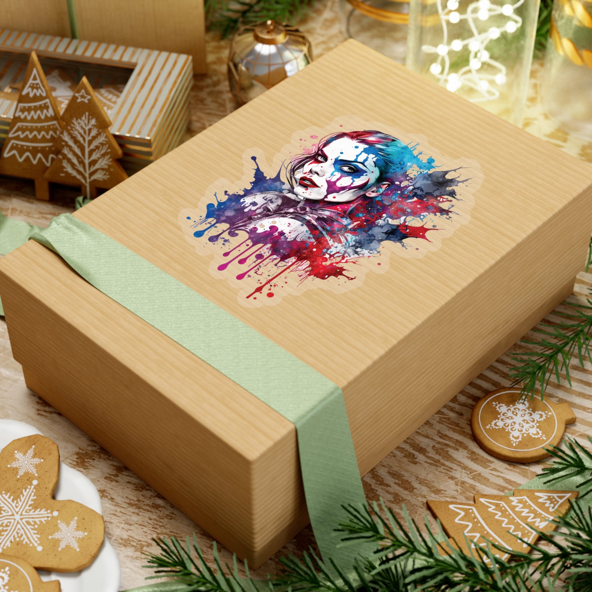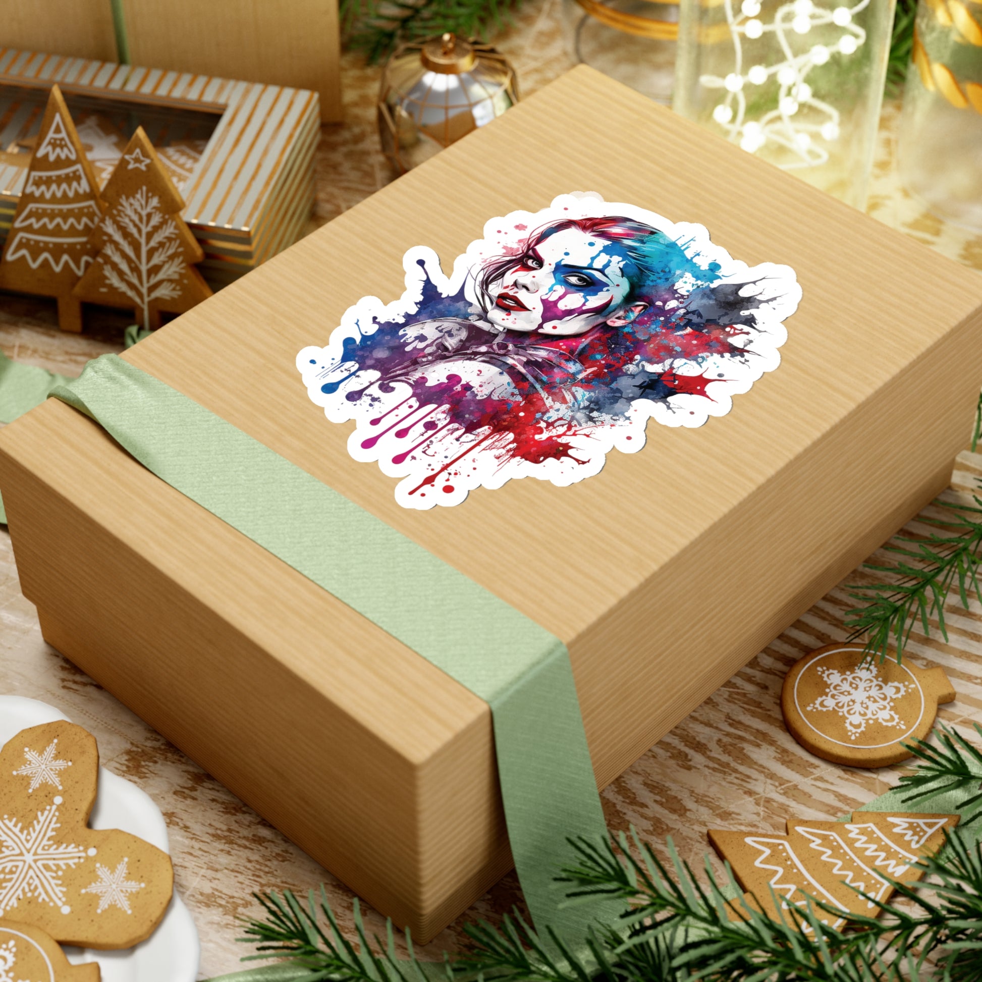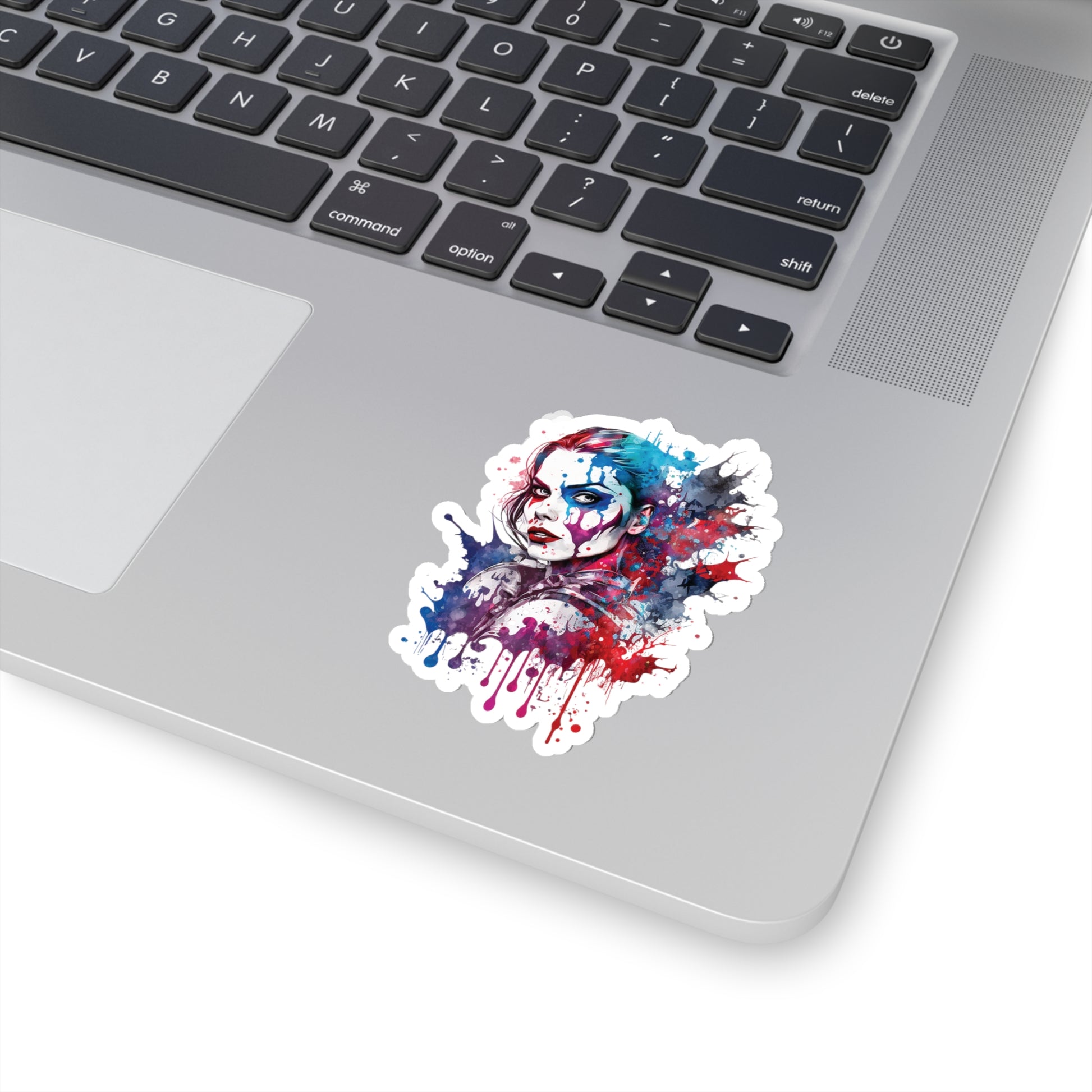 Keywords: Harley Quinn sticker, pop-art style sticker, watercolor style sticker, Macbook sticker, smartphone sticker, colorful sticker, unique sticker, Batman.
