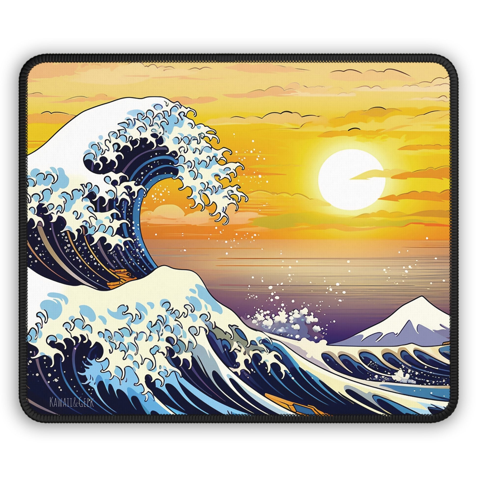 Elevate your workspace with this exquisite mouse pad featuring a magnificent Hokusai-inspired big wave design and a breathtaking sunset. Embrace the beauty of nature while enjoying smooth mouse movement and precise tracking.