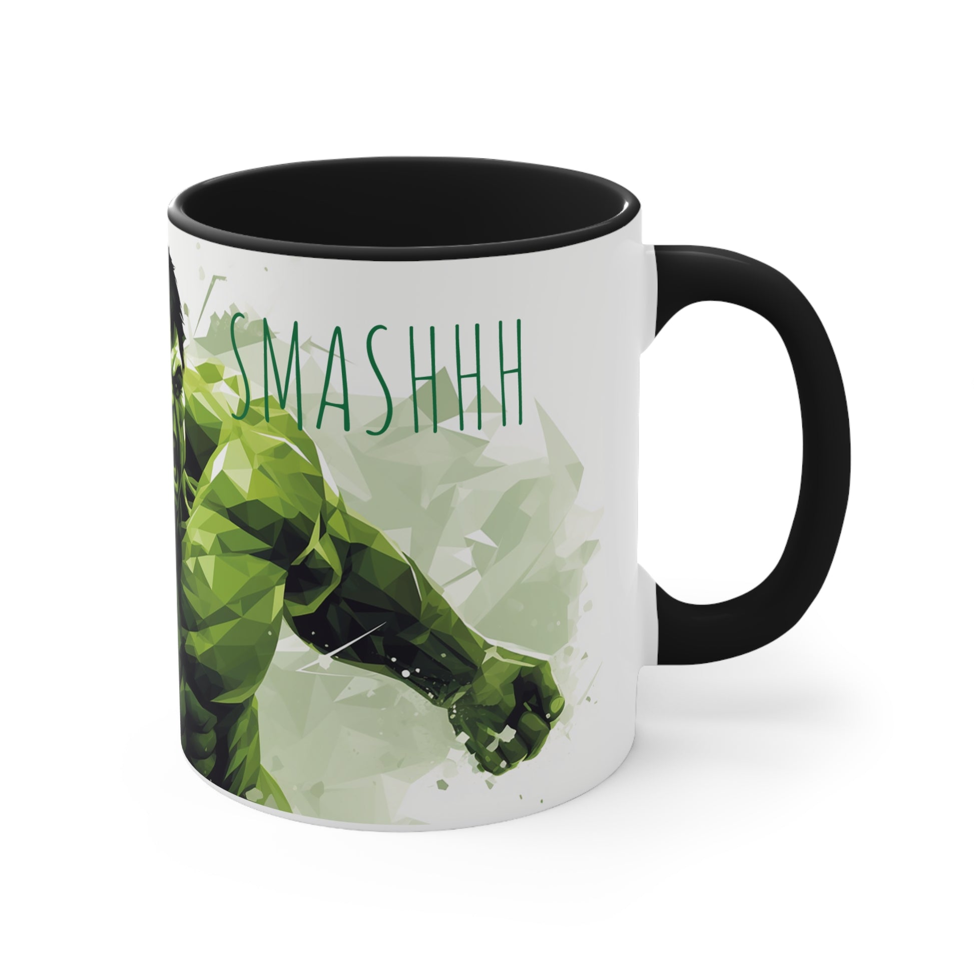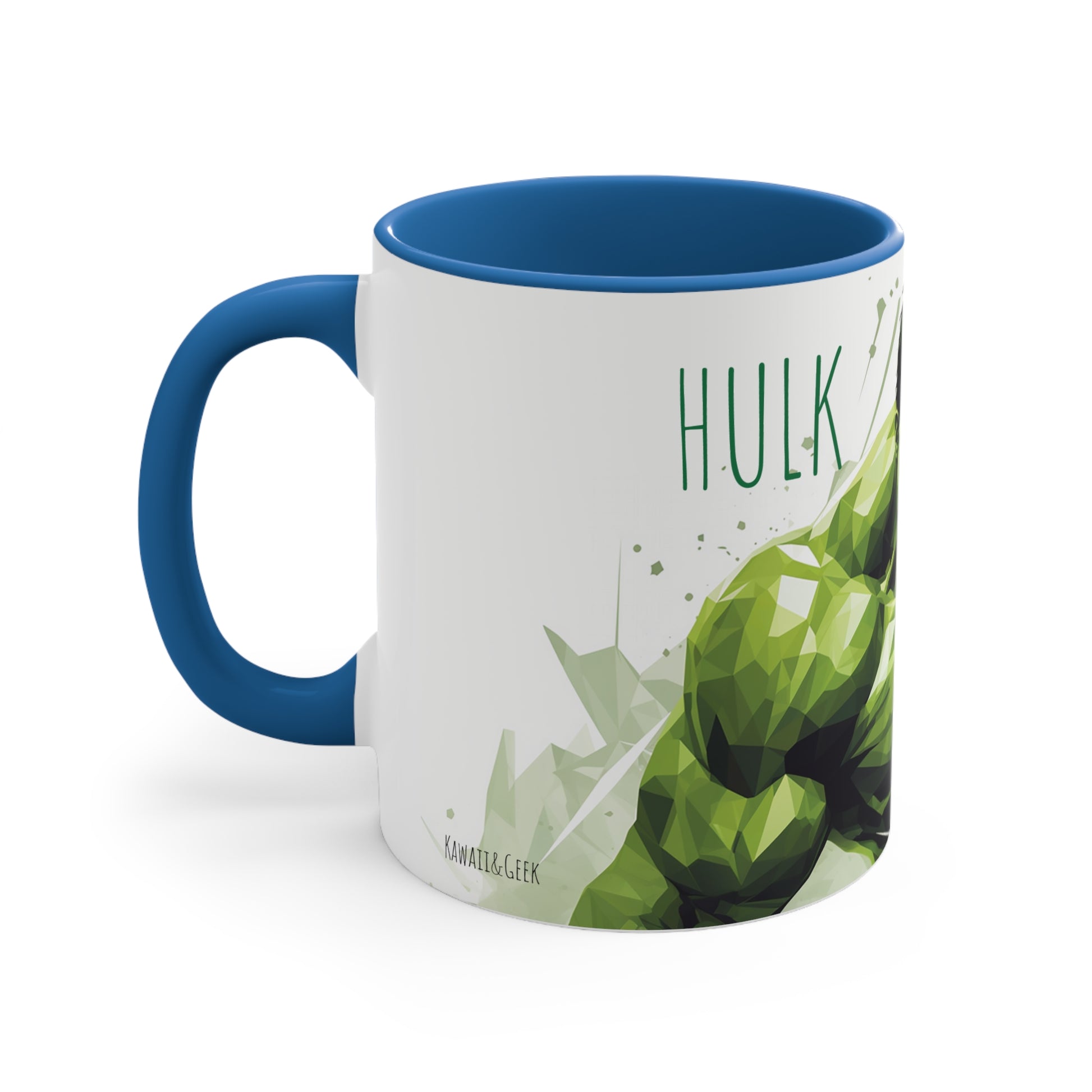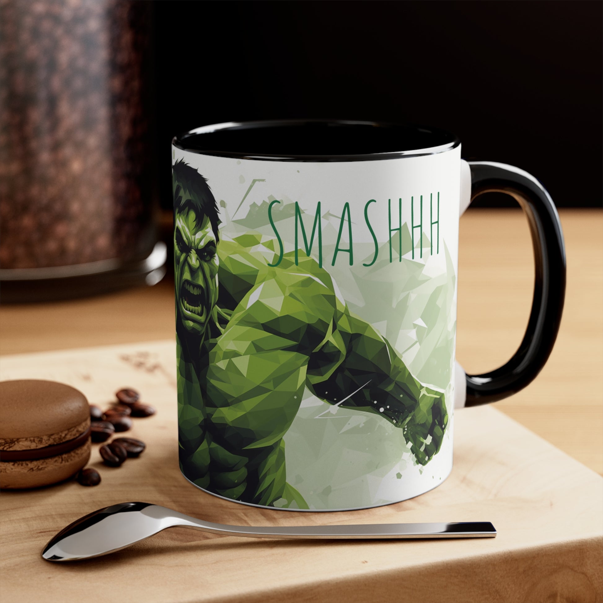 Keywords: Hulk mug, Geometric style, Bicolor design, Hulk Smash, Unstoppable force, coffee mug, Modern and edgy, avengers, Marvel, Superhero might, Coffee or tea, Drinkware collectible, Superhero vibes.