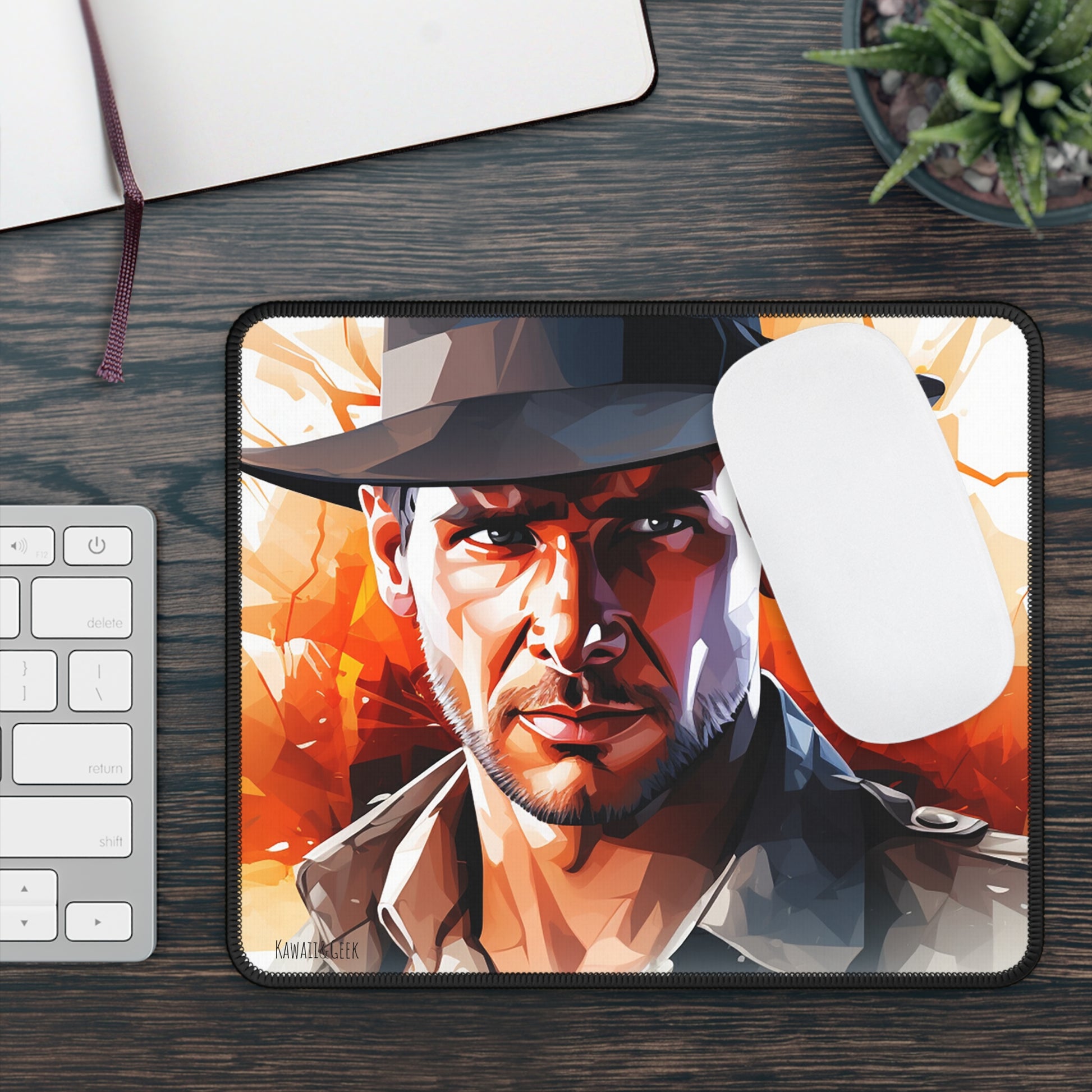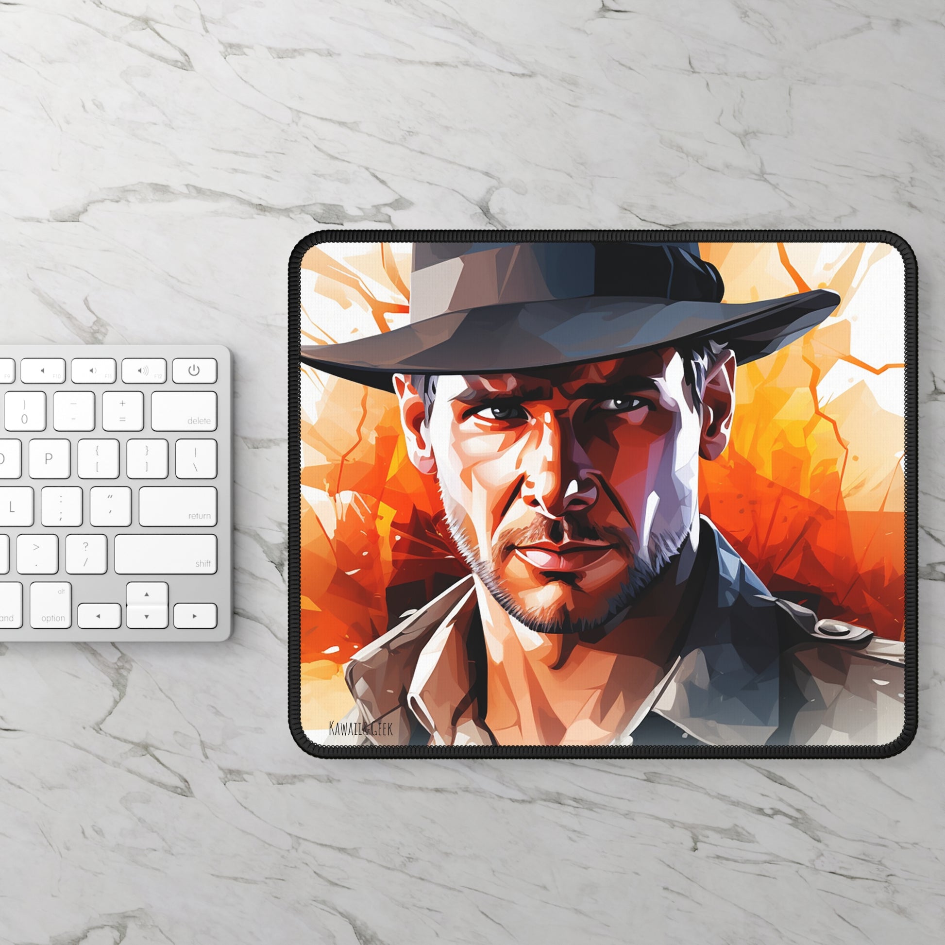 Keywords: gaming mouse pad, Indiana Jones, geometric style, adventurous spirit, thrilling, elegant design, high-quality surface, precise tracking, smooth gliding, gaming quest, hidden treasures, durable construction, captivating artwork, immersive experience.